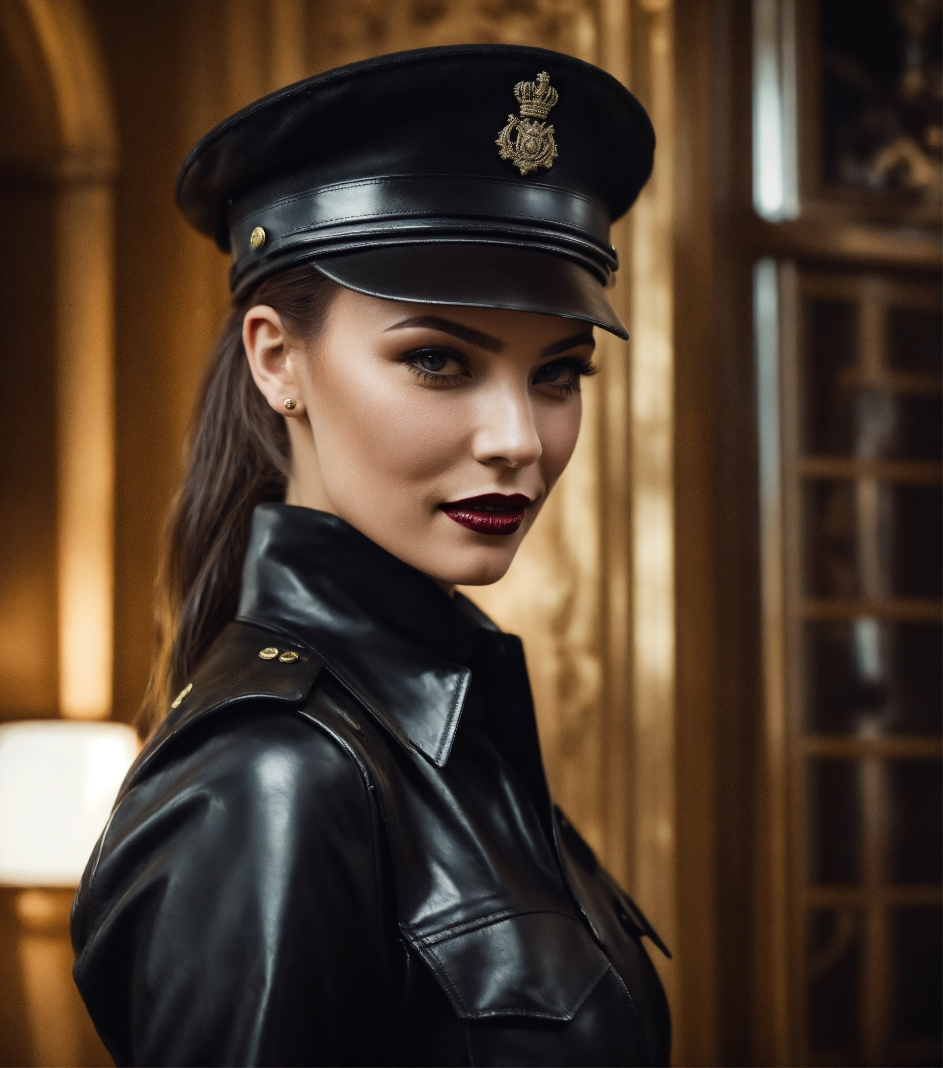 Cinematic style, three stunning dominant seductress french women model, evil smile, straight high ponytail hair, strict military black leather uniform shirt, black leather pencil skirt, black leather military cap, mansion room
