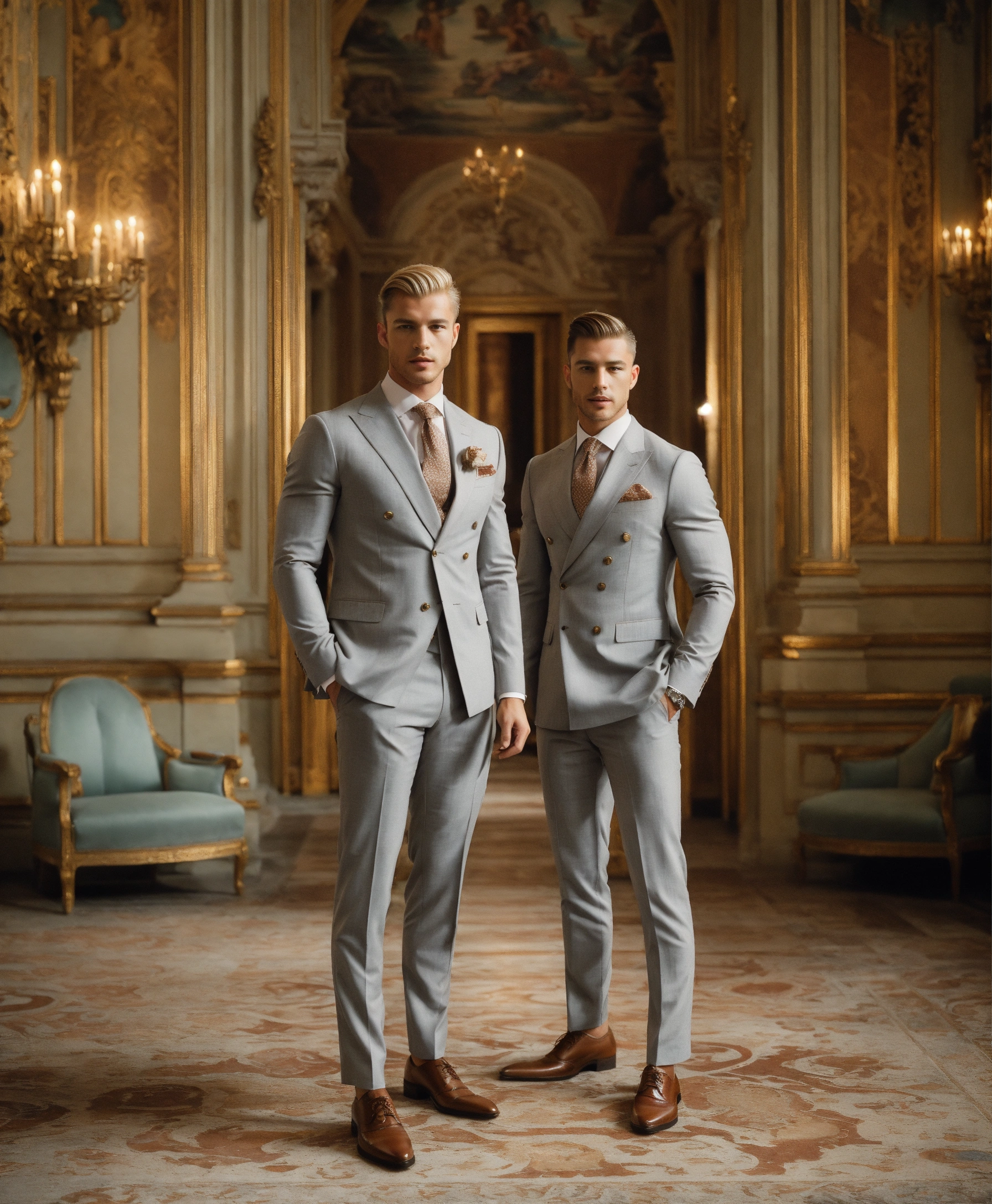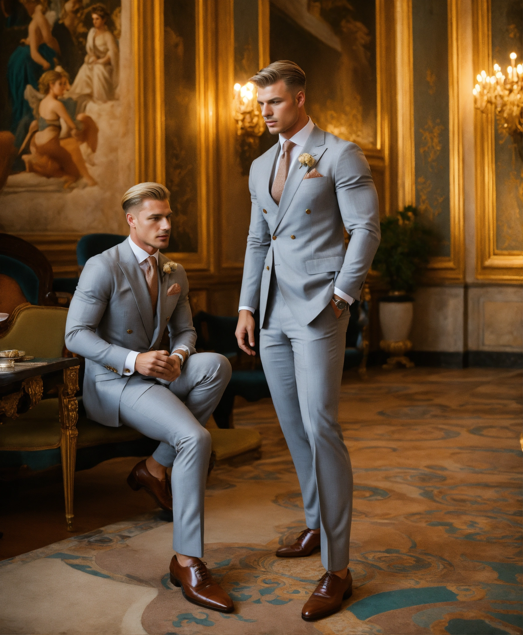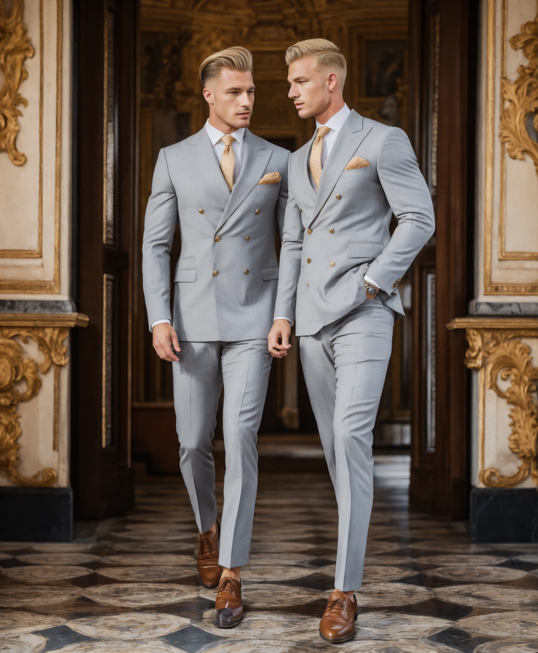Two blonde muscled gentlemen, pompadour haircut, in light grey double breasted suit, club tie, light brown shoes, meeting in a venetian palace
