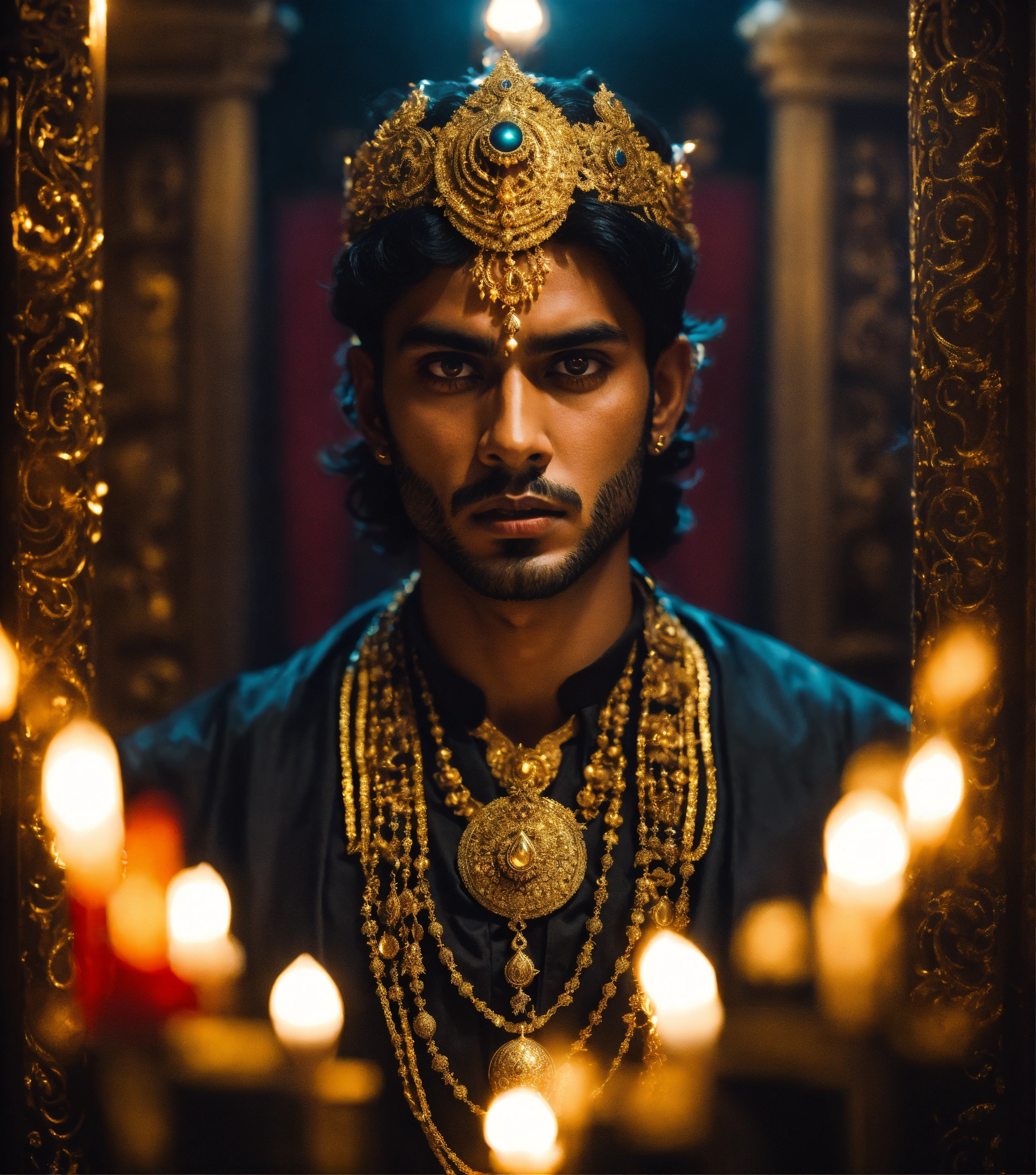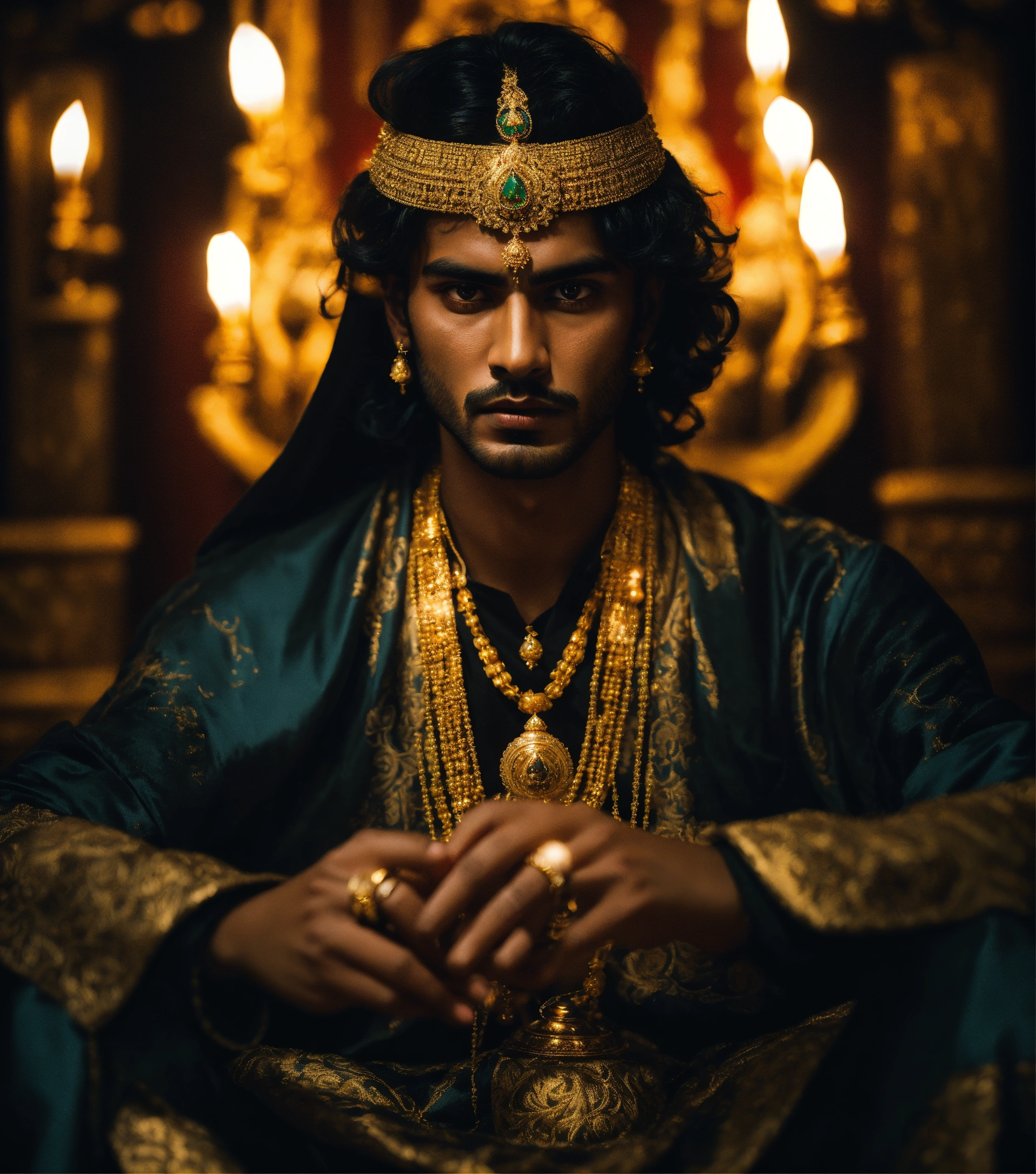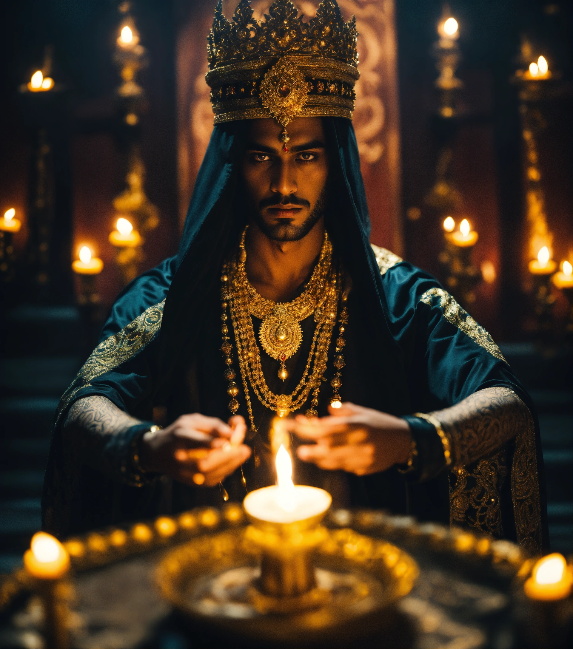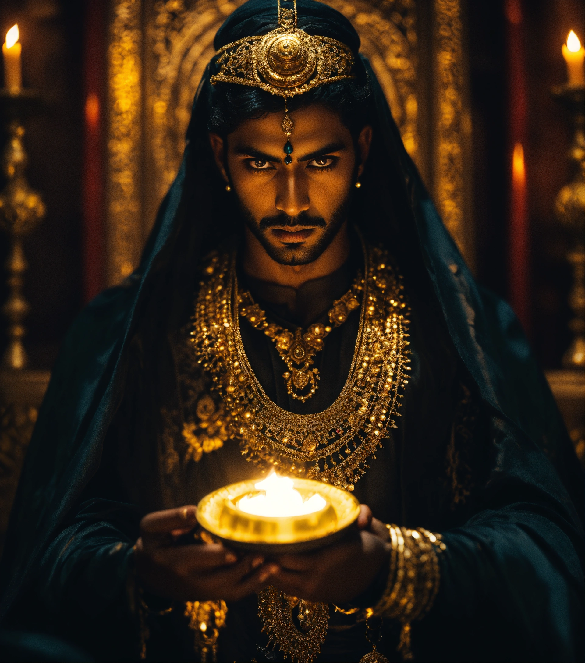 Dark, mysterious and dramatic prtrait of a young handsome south asian sinister sorcerer with glowing hypnotic eyes wearing dark elaborate robes and ornate gold jewellery performing a ritual in a sinister dimly lit occult temple