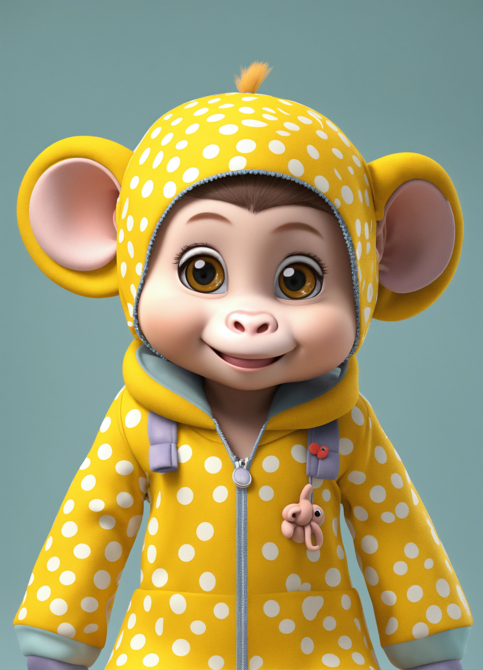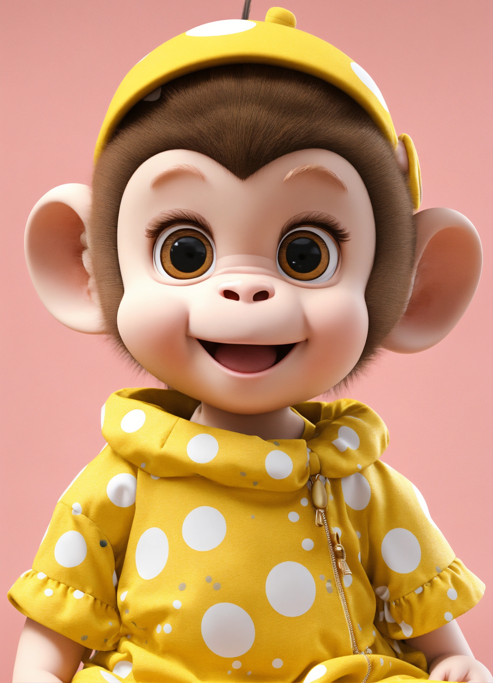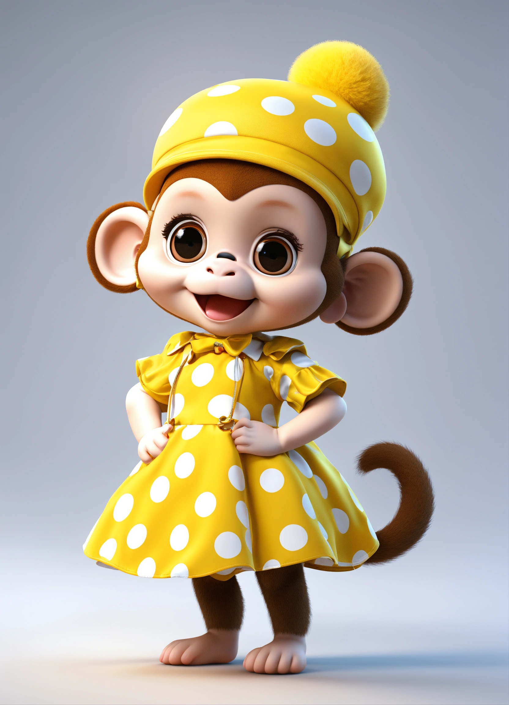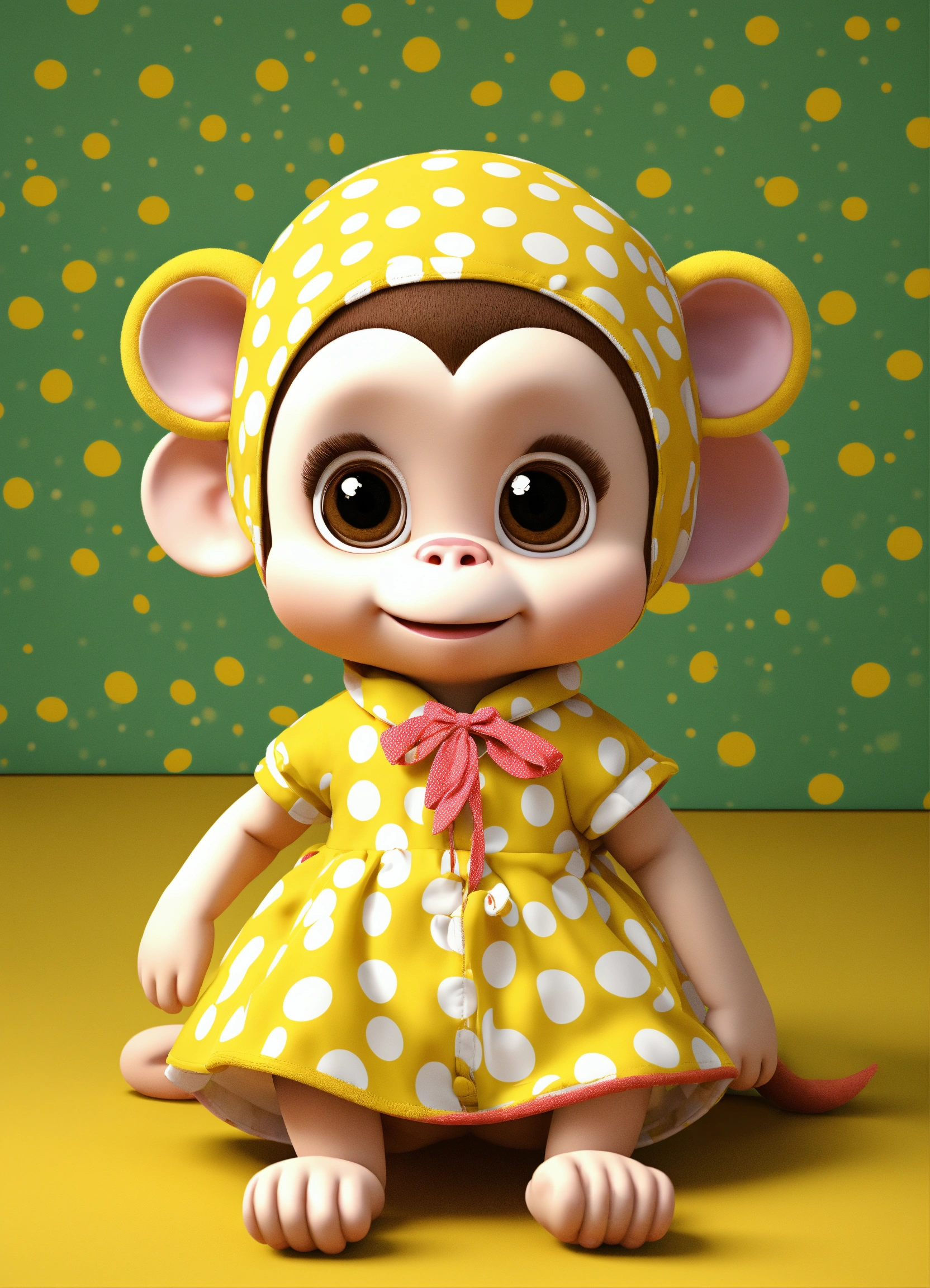 A cute happy 3d model baby girl monkey character wearing polka dots yellow dress, big eyes, charming, attractive, adorable, luxurious, fluffy, hyperrealistic, high resolution