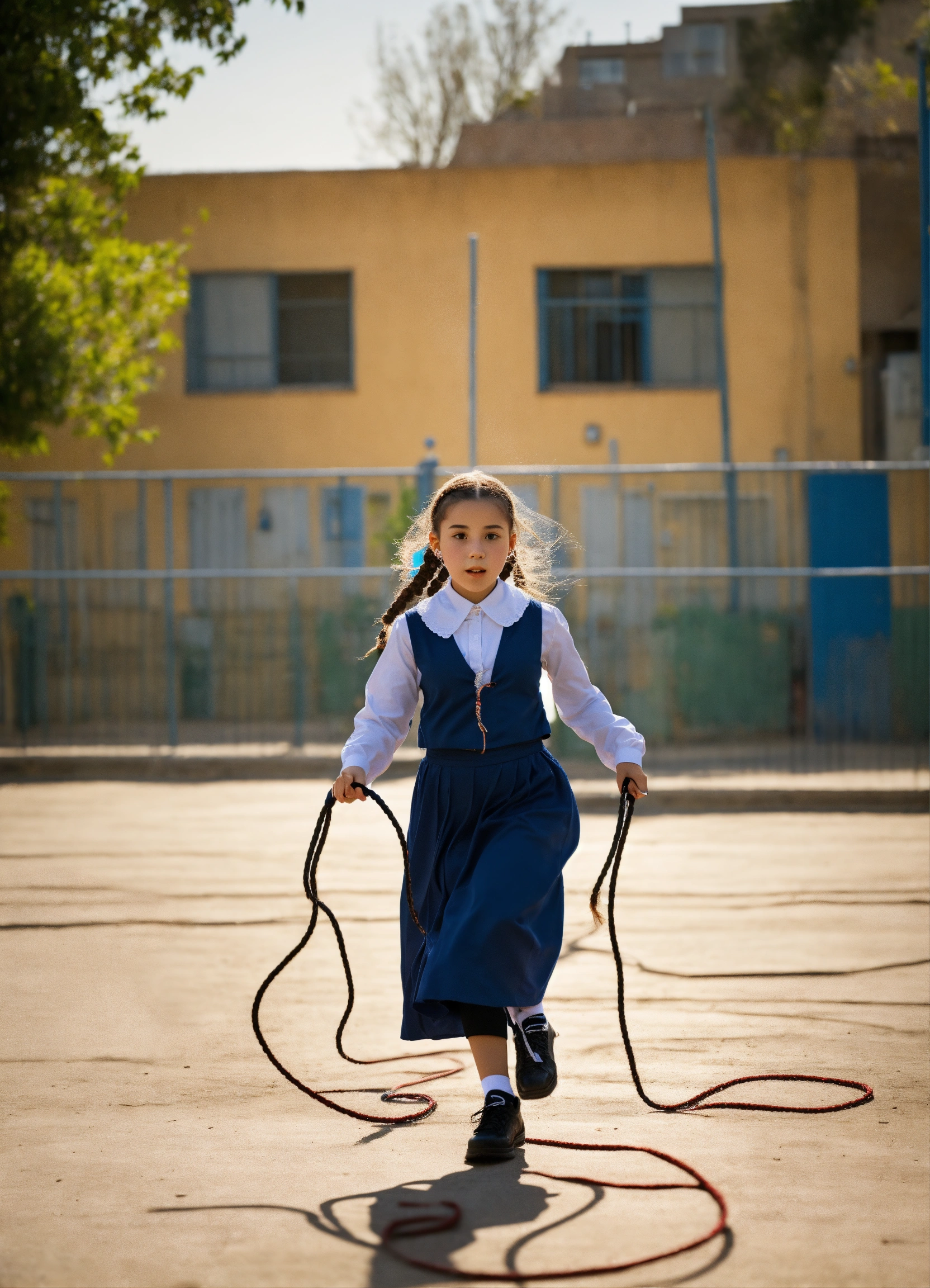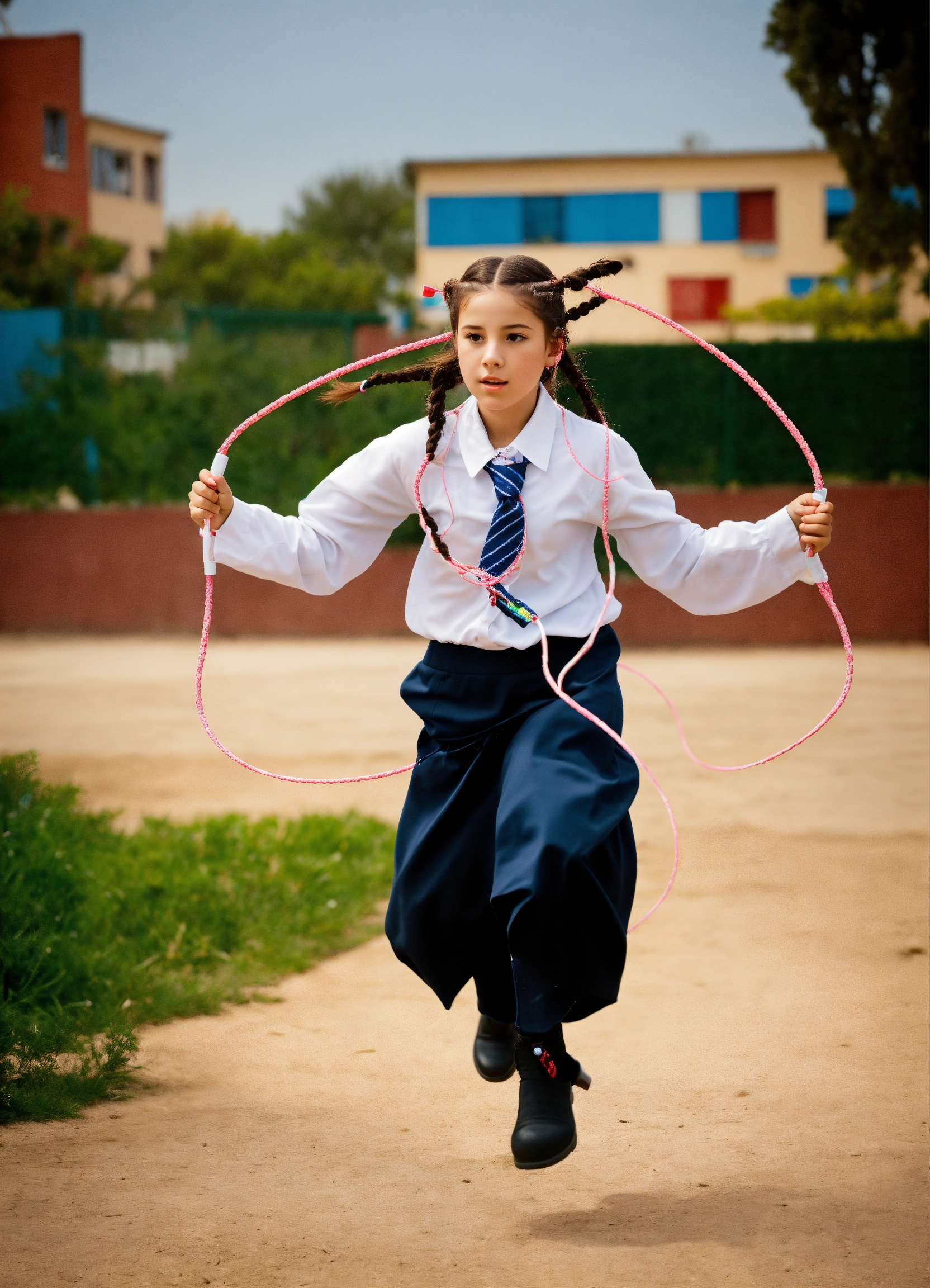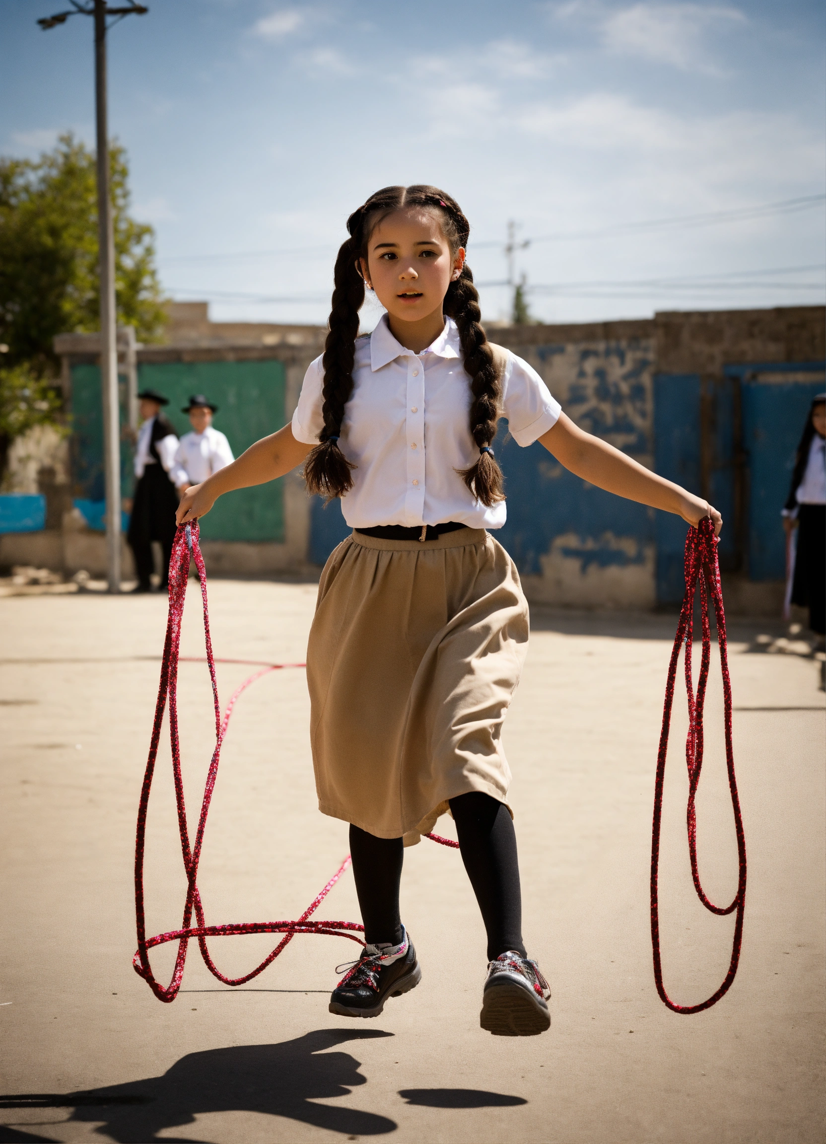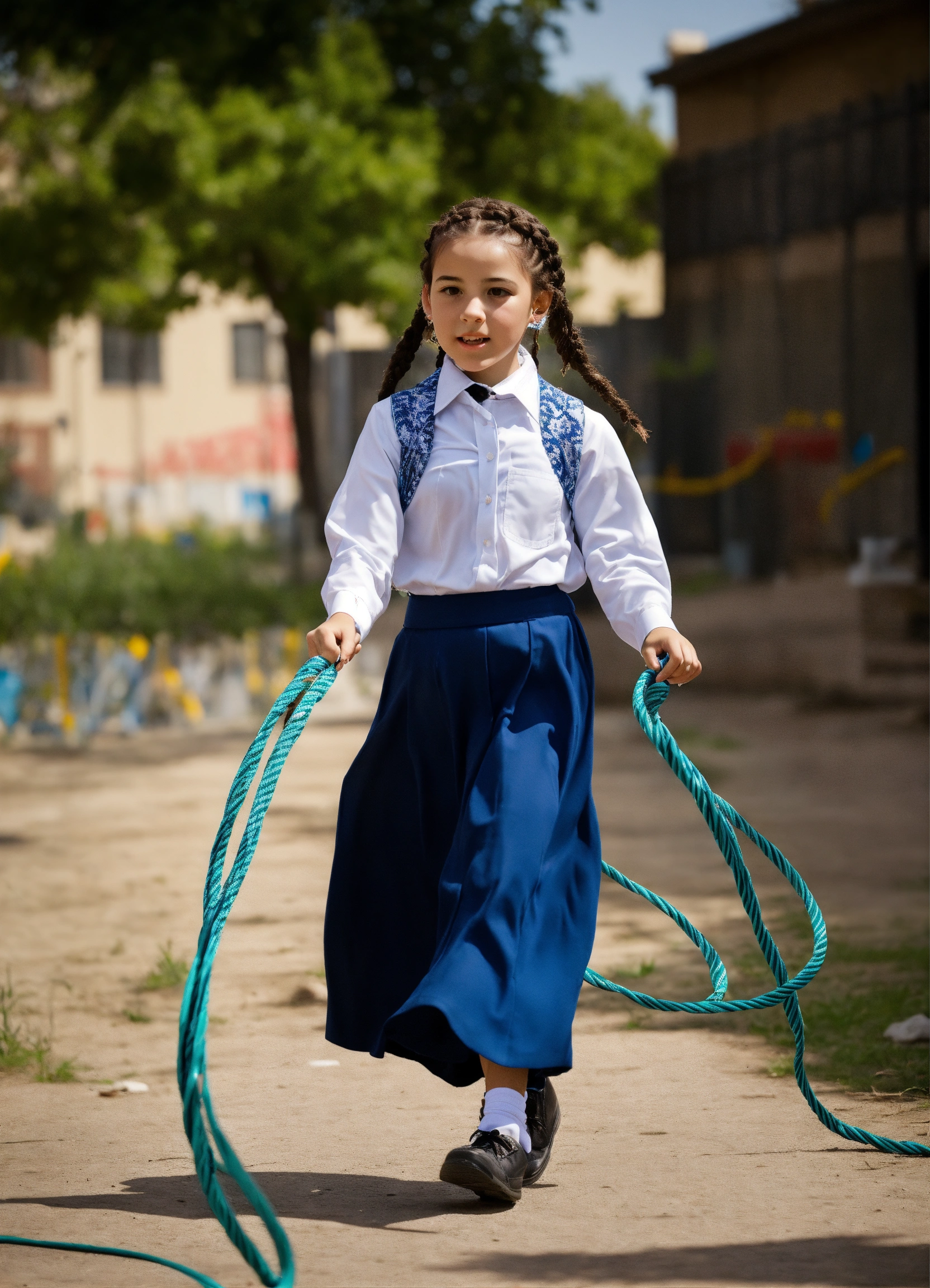 Ultra orthodox girl with braids skipping rope in a schoolyard