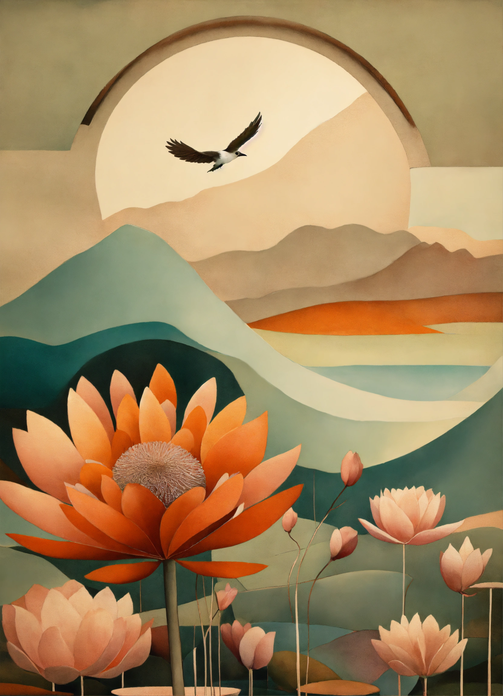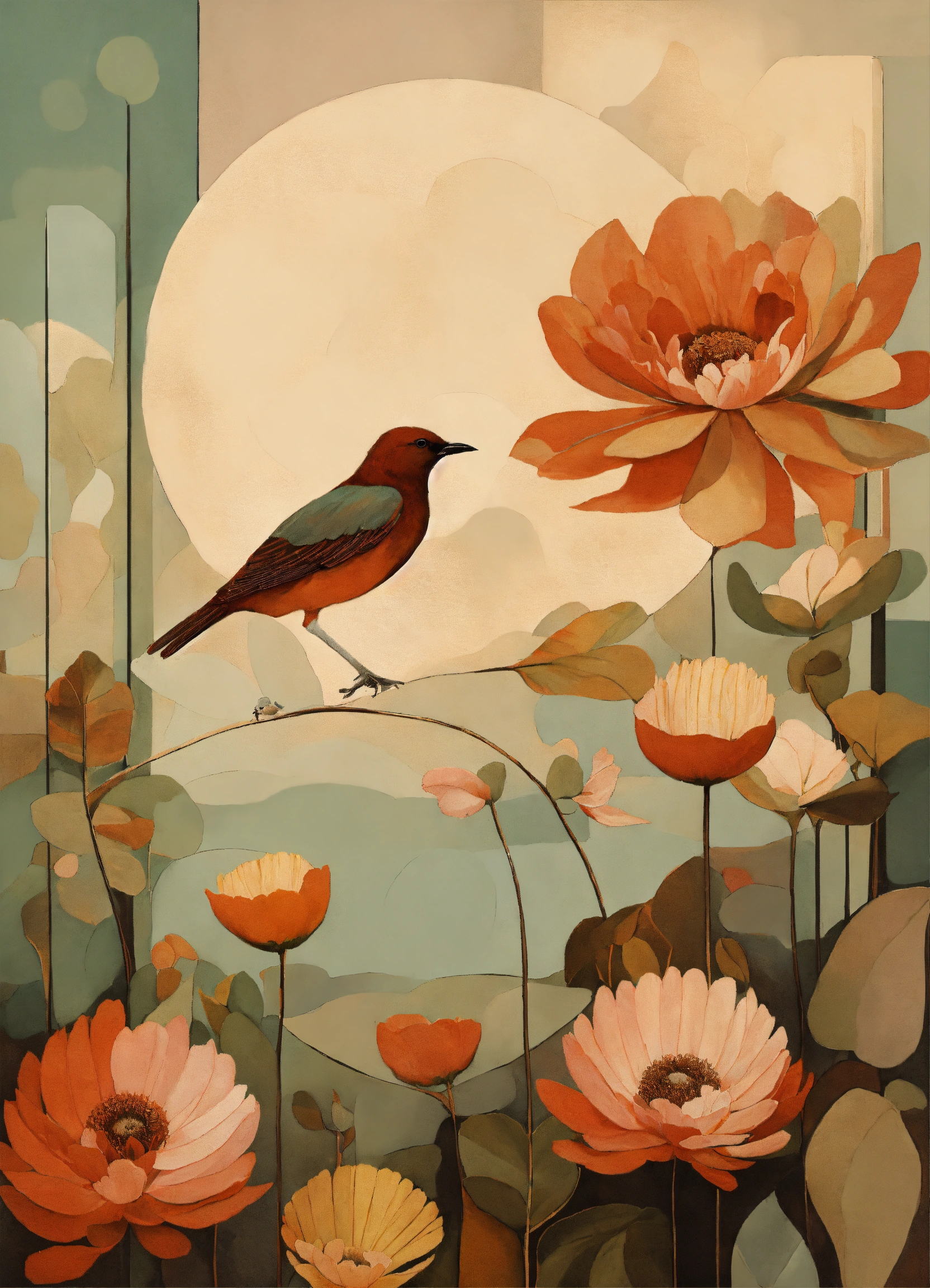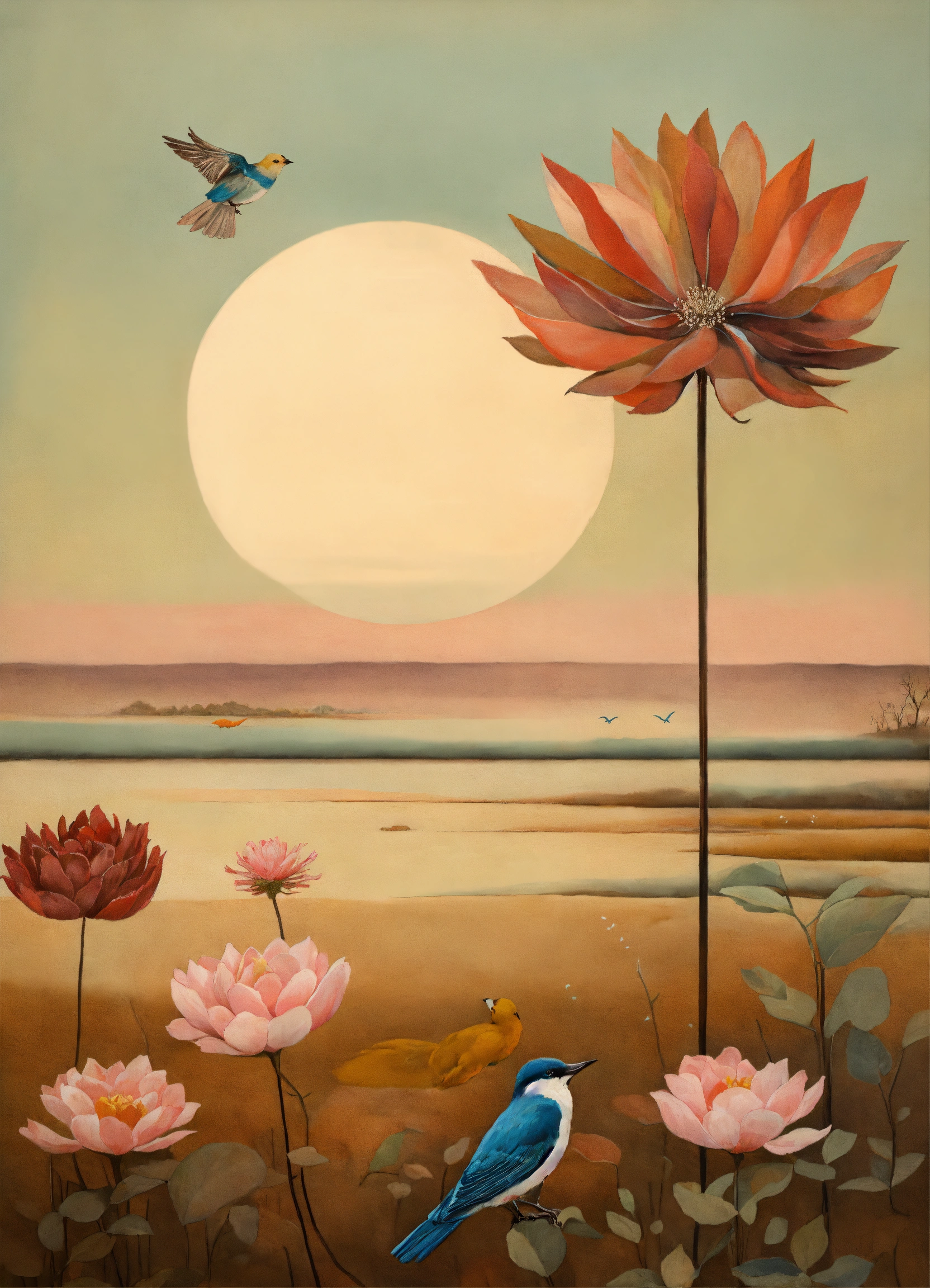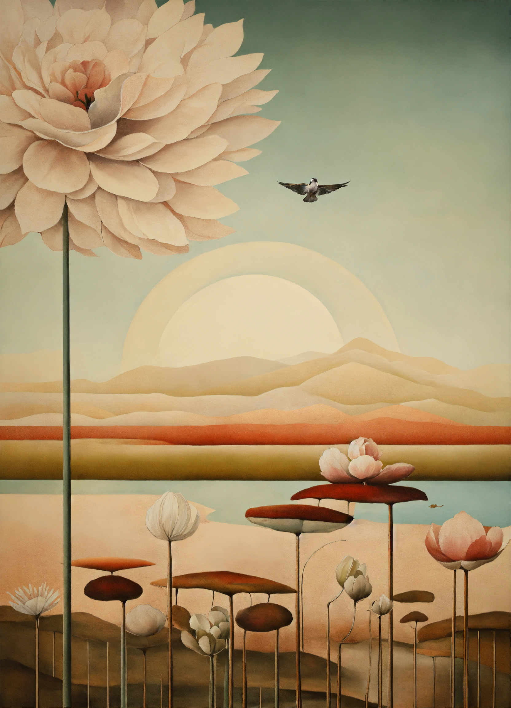 Muted tones colors surreal combination into empty canvas, evoking a sense of serenity, mid-century modern style, oneness of being, add birds and giant flower