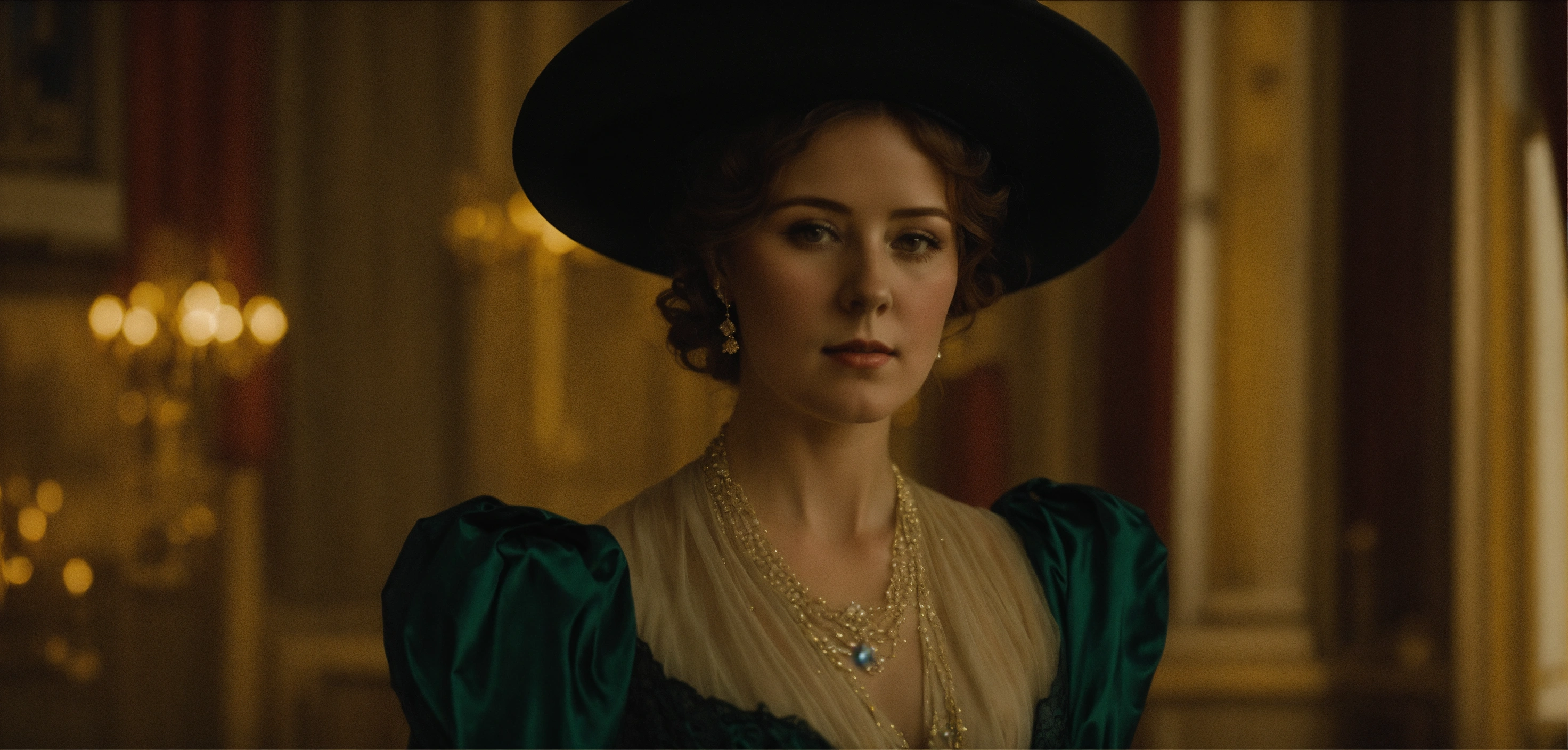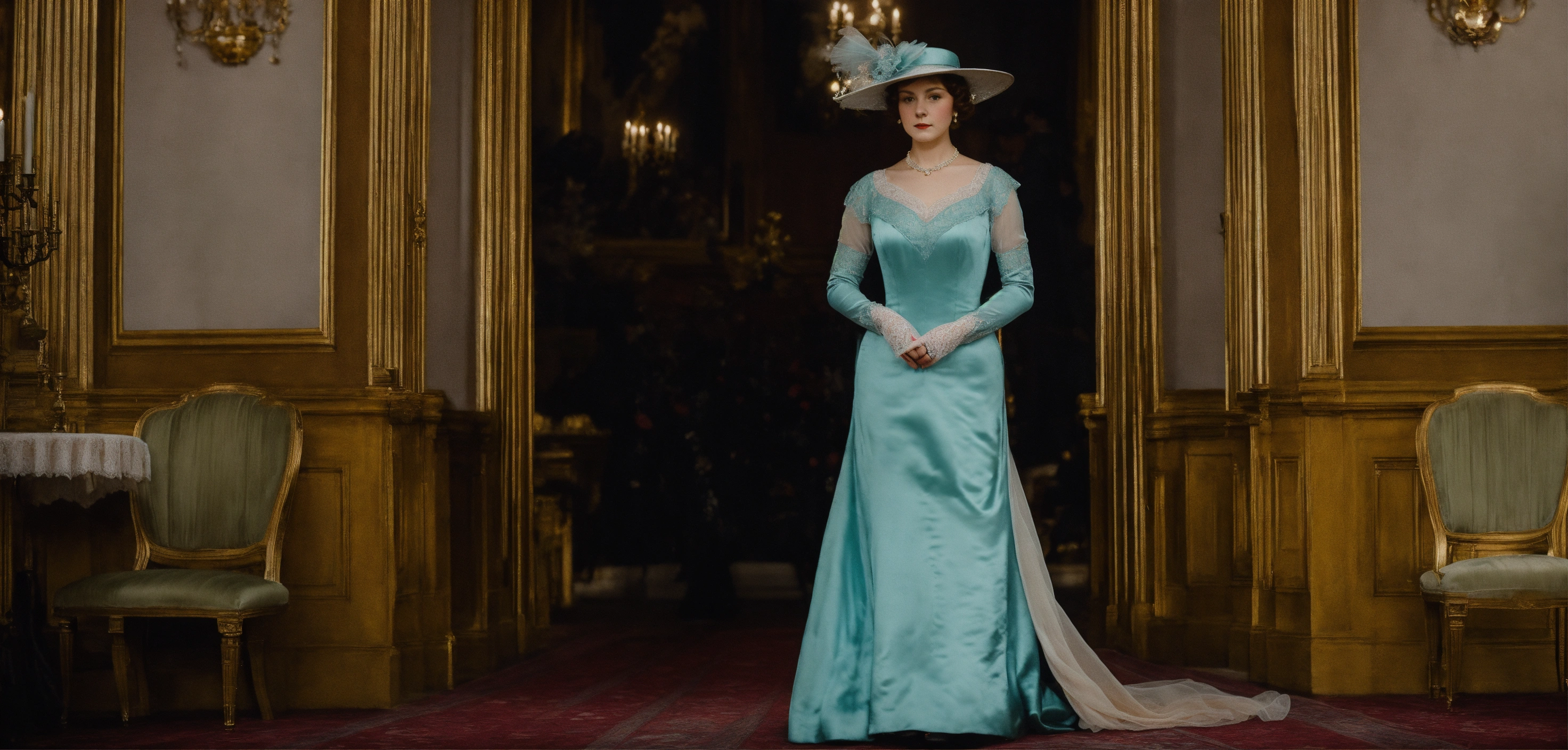 Edwardian lady full size picture standing in a ballroom, wearing a flowing gown, hidden identity with hat.