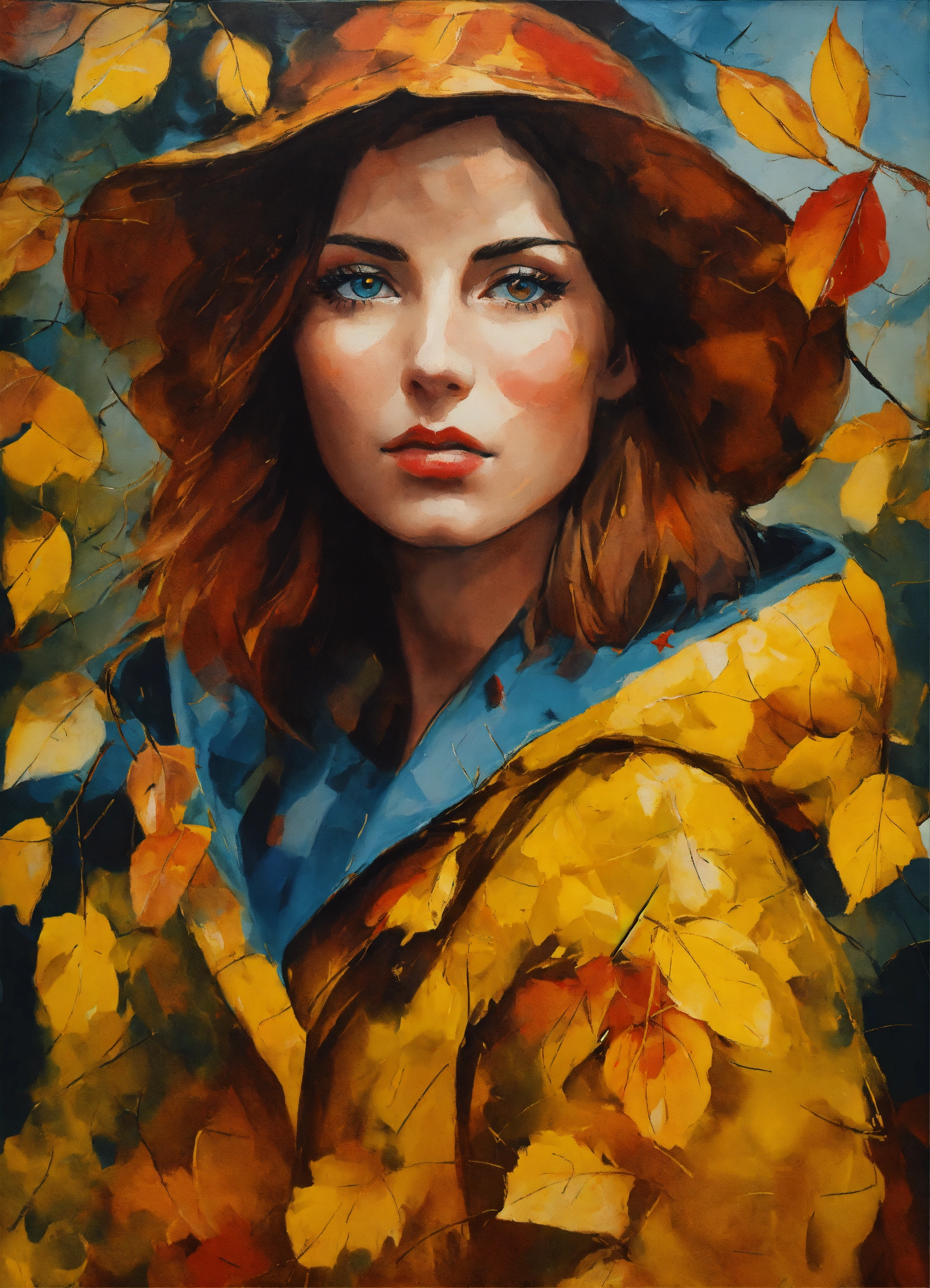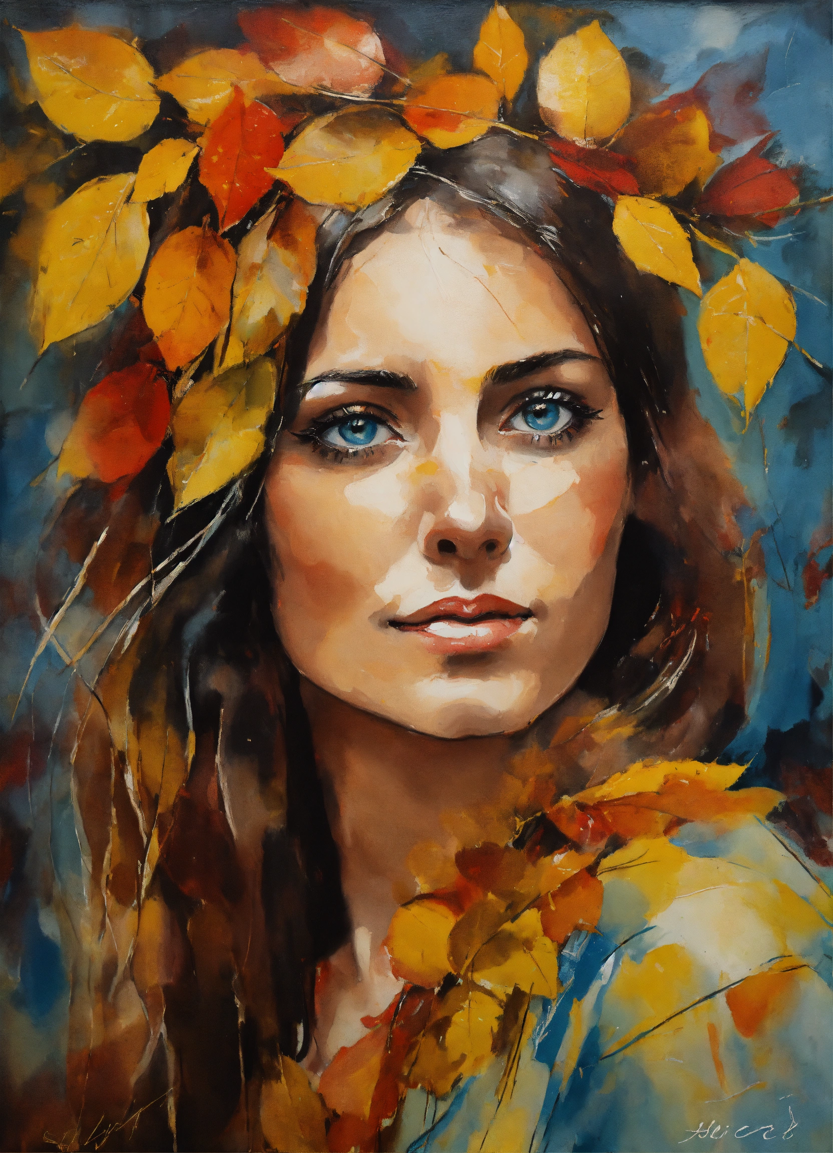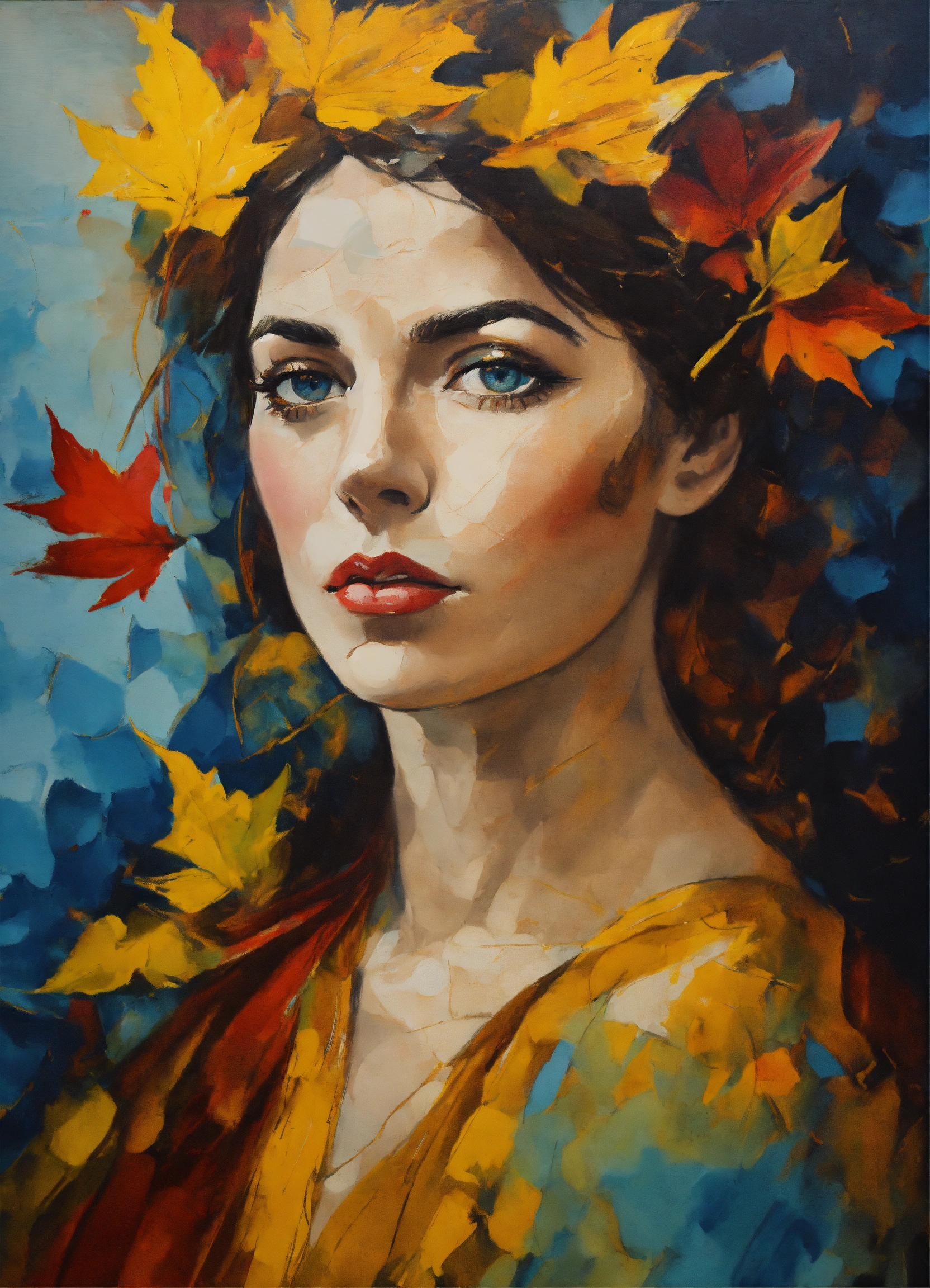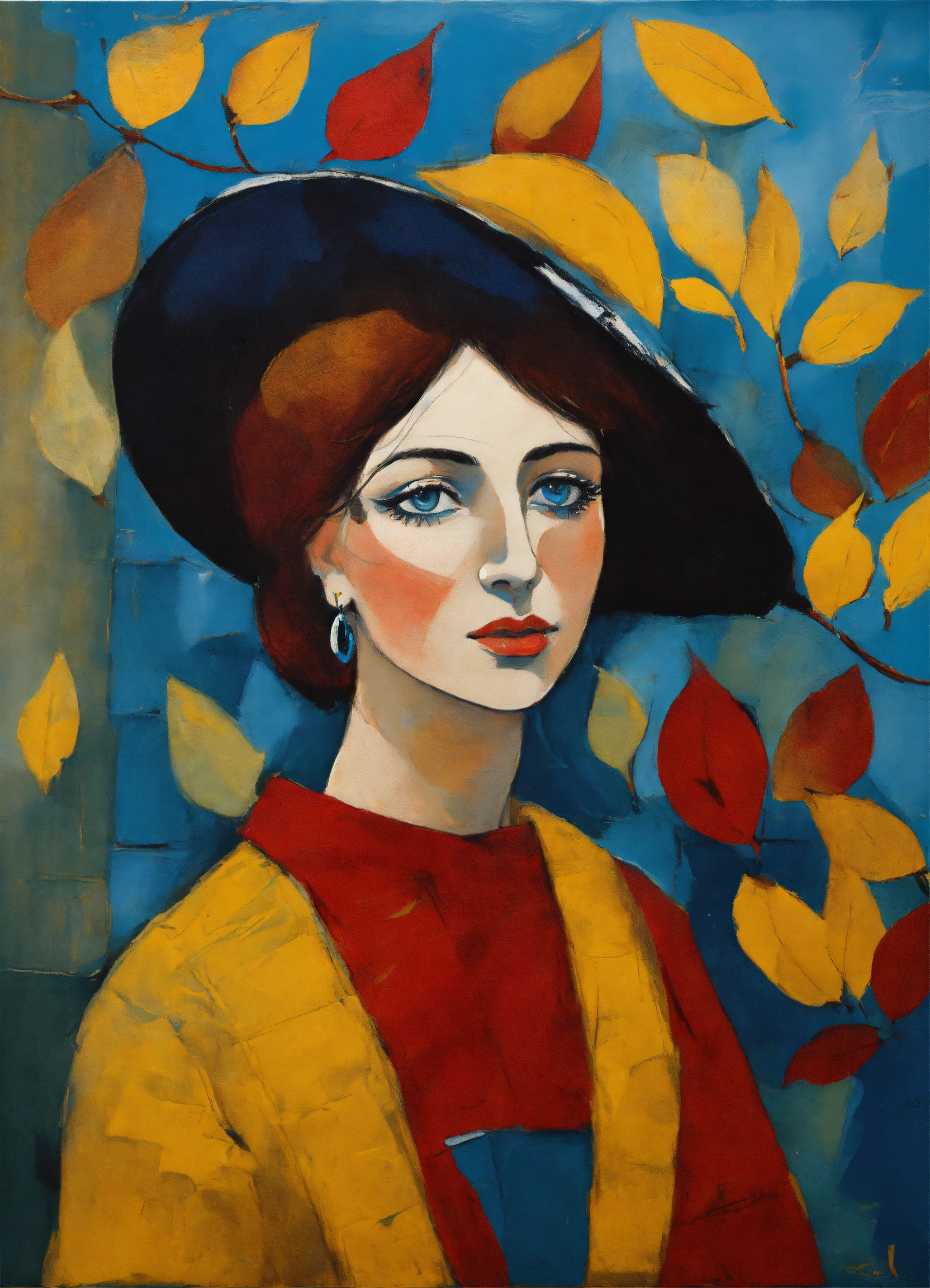 Oli painting stile picasso donna di 50 anni con grandi occhi azzurri in primo piano in autunno con foglie gialle e rosse, esprime felicità.