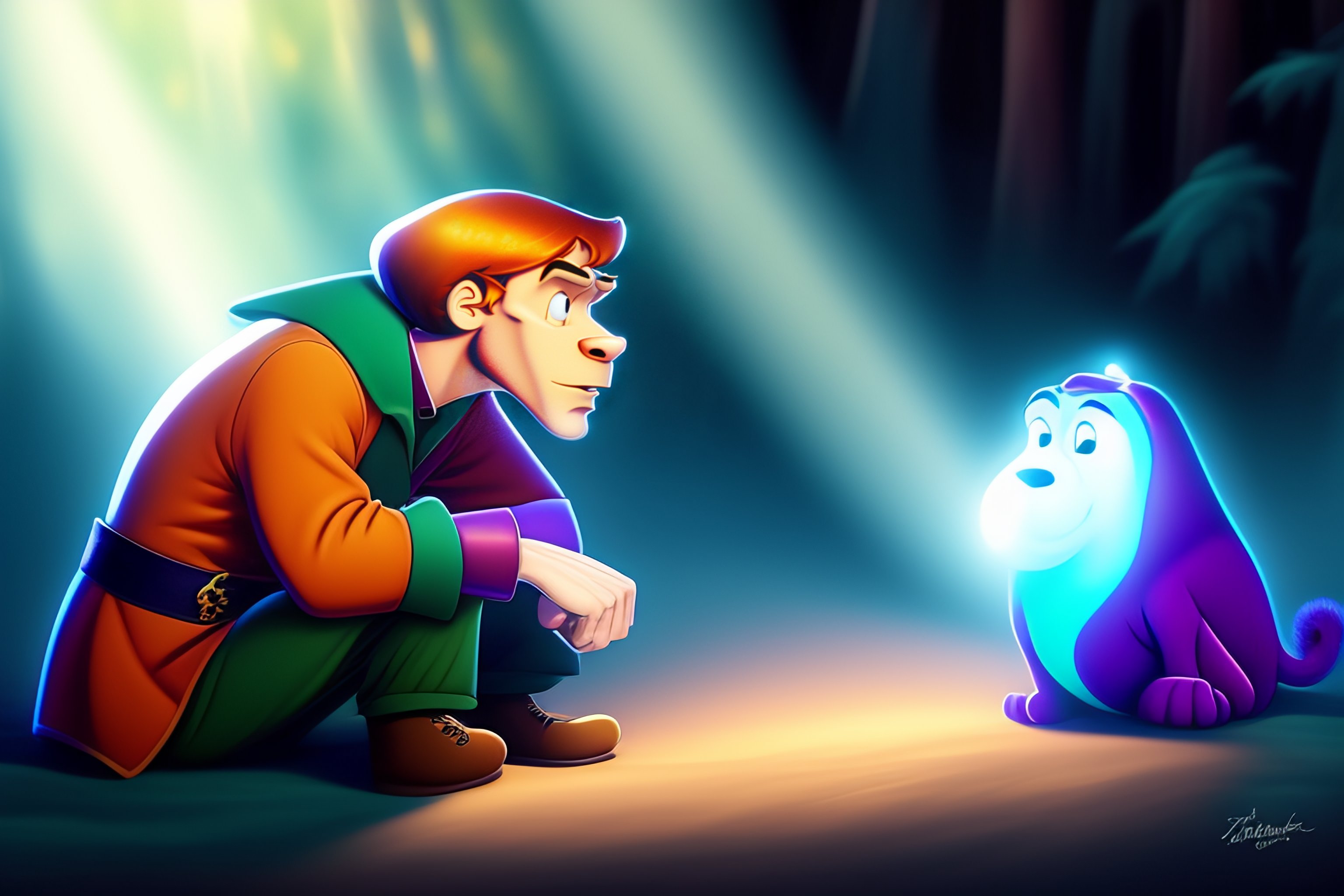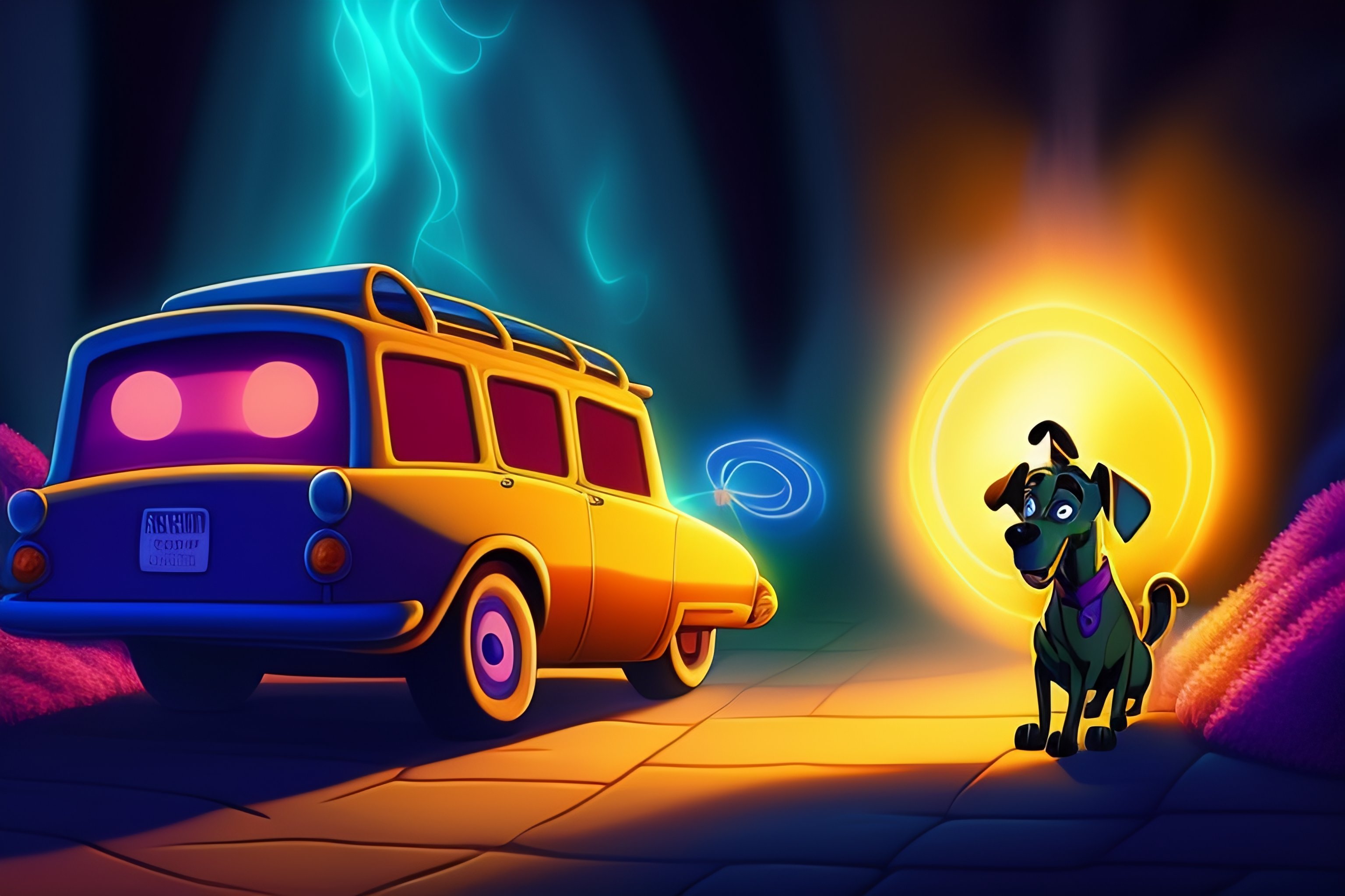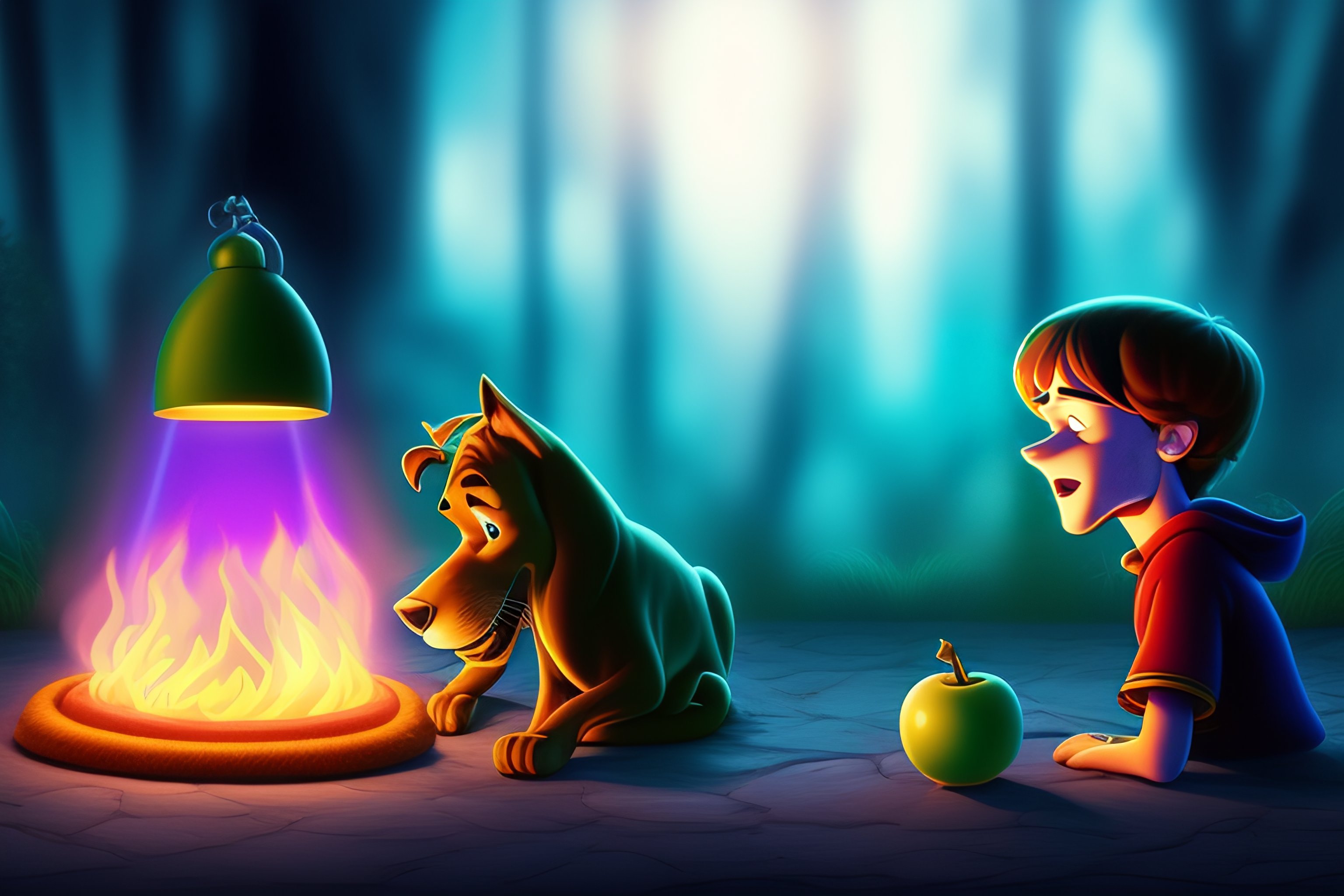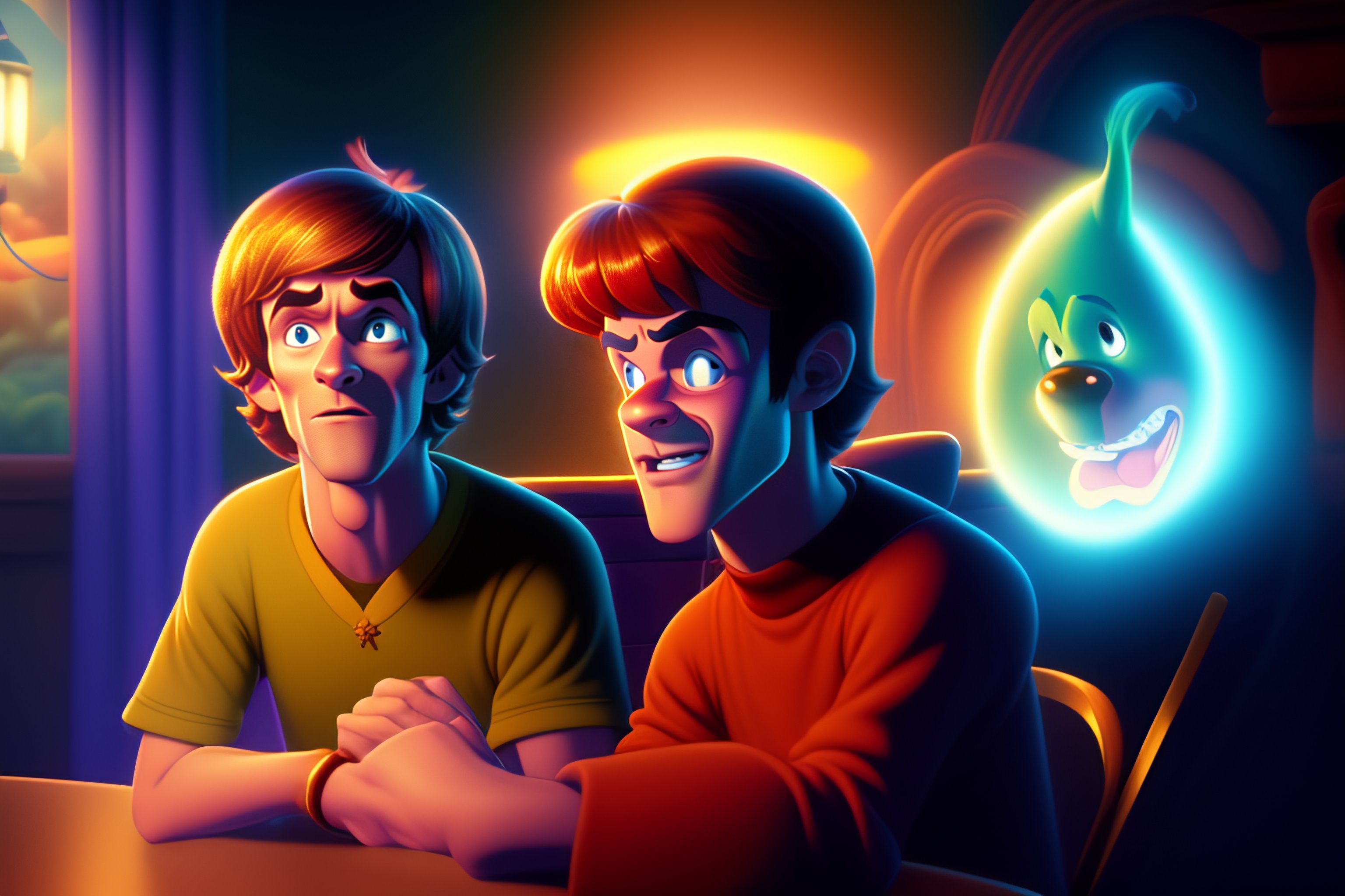 A beautiful photo of scooby-doo and shaggy being scared by a ghost