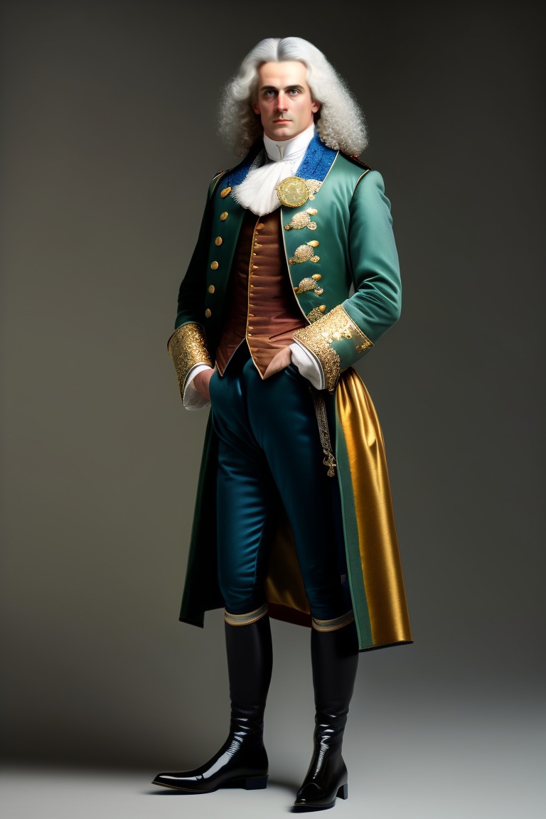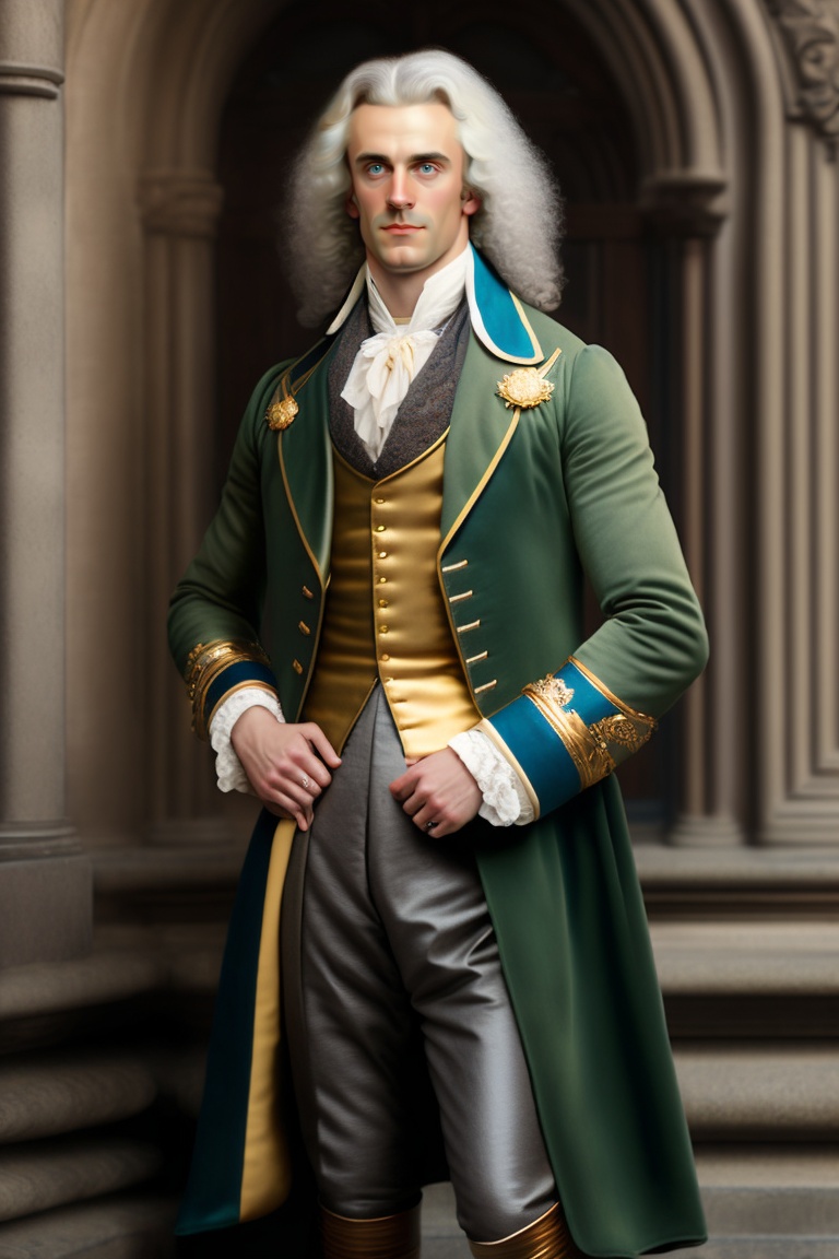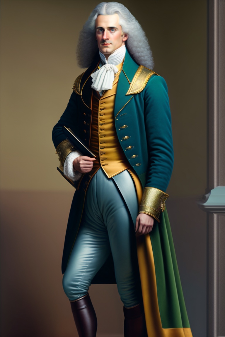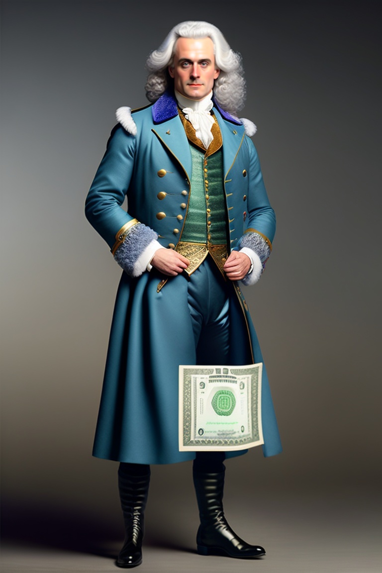 Extremely detailed full-length color photo of isaac newton, with his hands in front of him holding a dollar bill