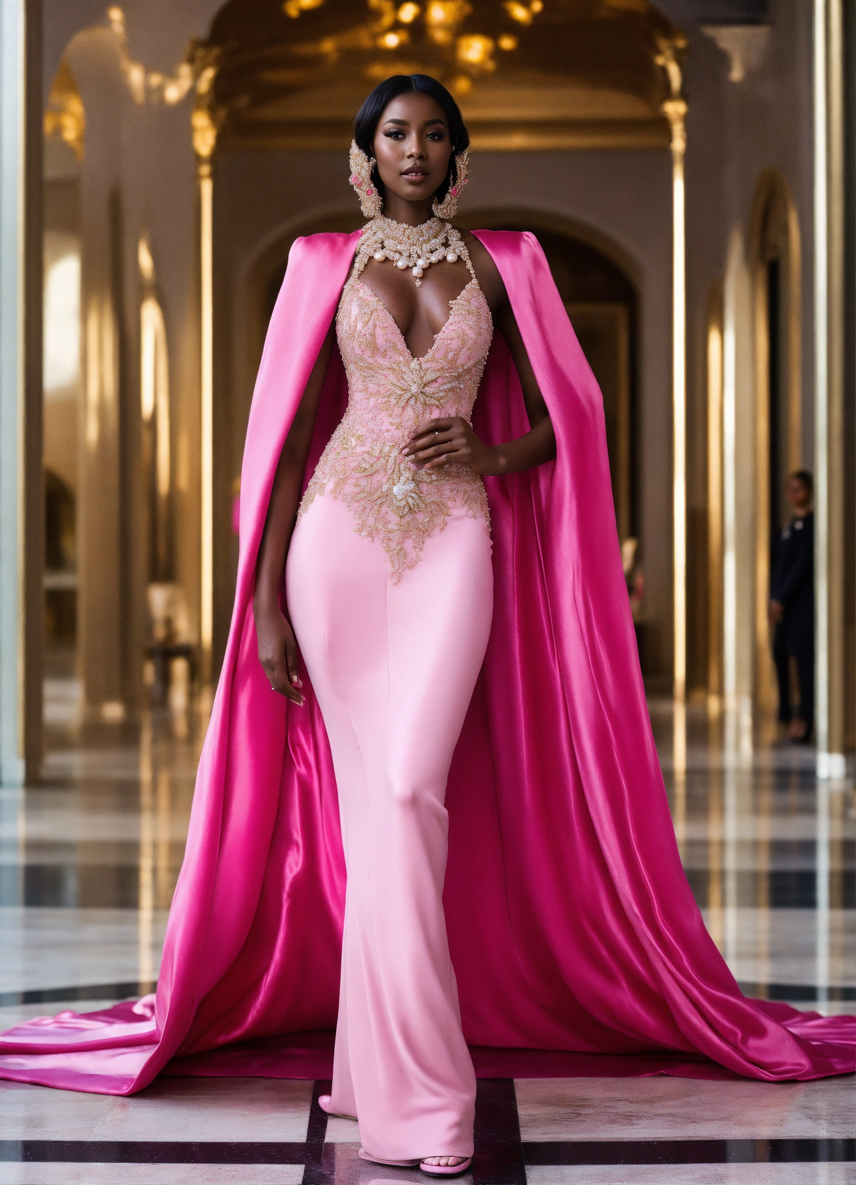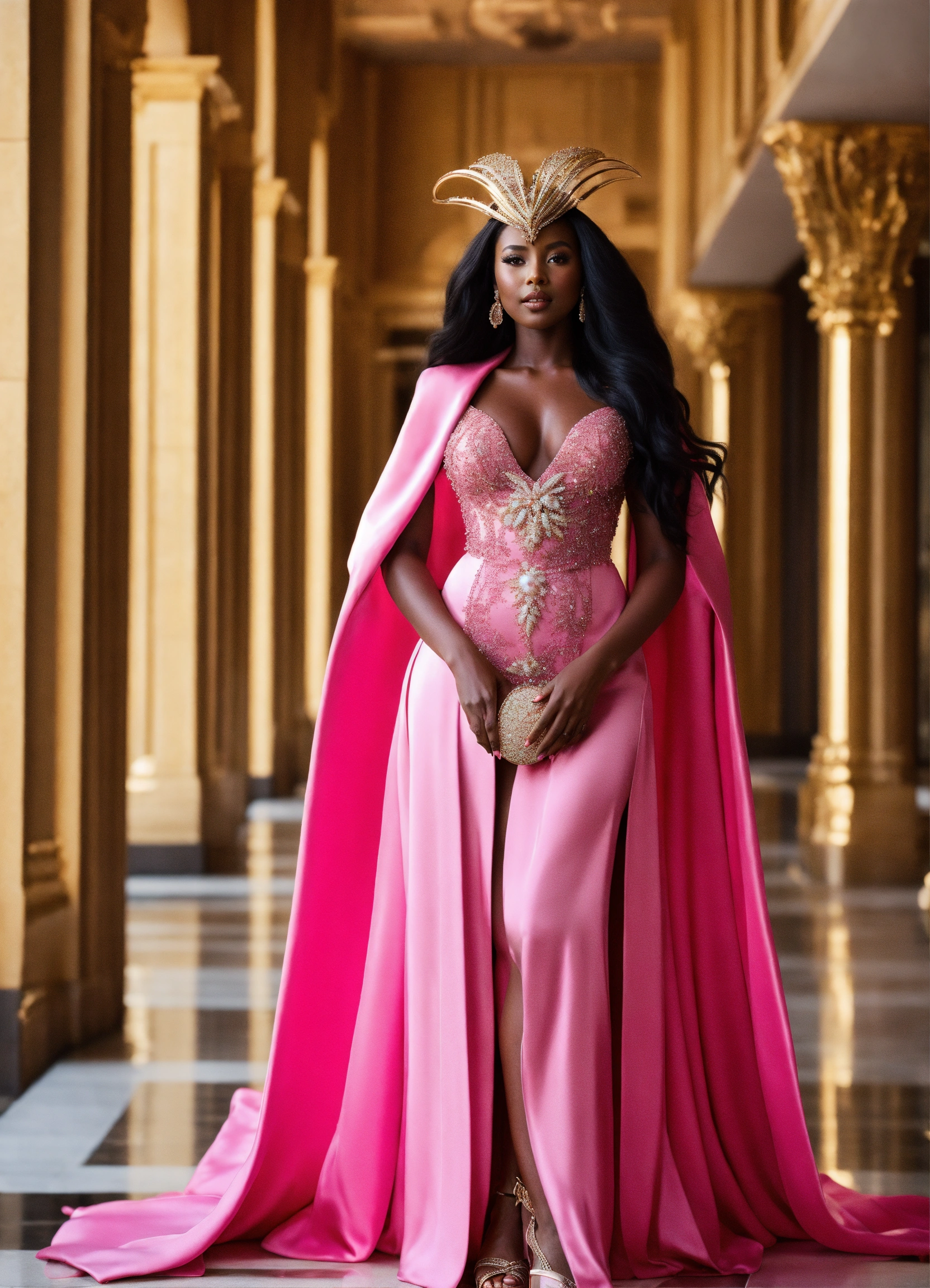 Alien queen, dark skin, long dark hair. pearl-embellished head-peice, wide hips. dressed in pink haute couture dress and robe, open toe heels, standing in a luxurious atrium during daylight. outgoing persona.