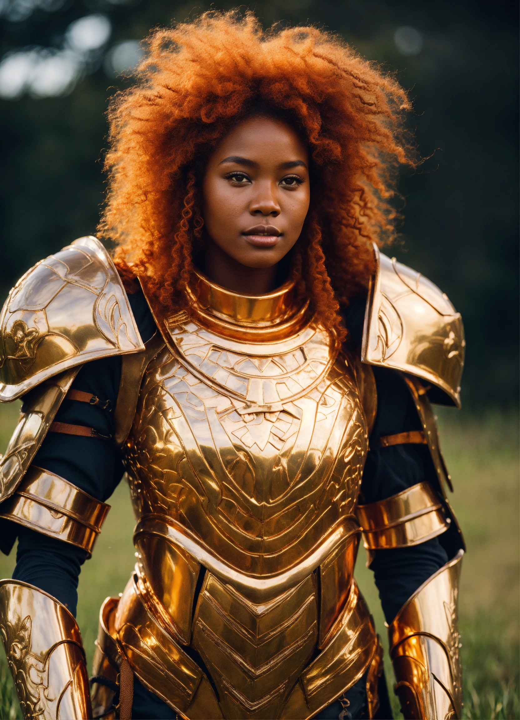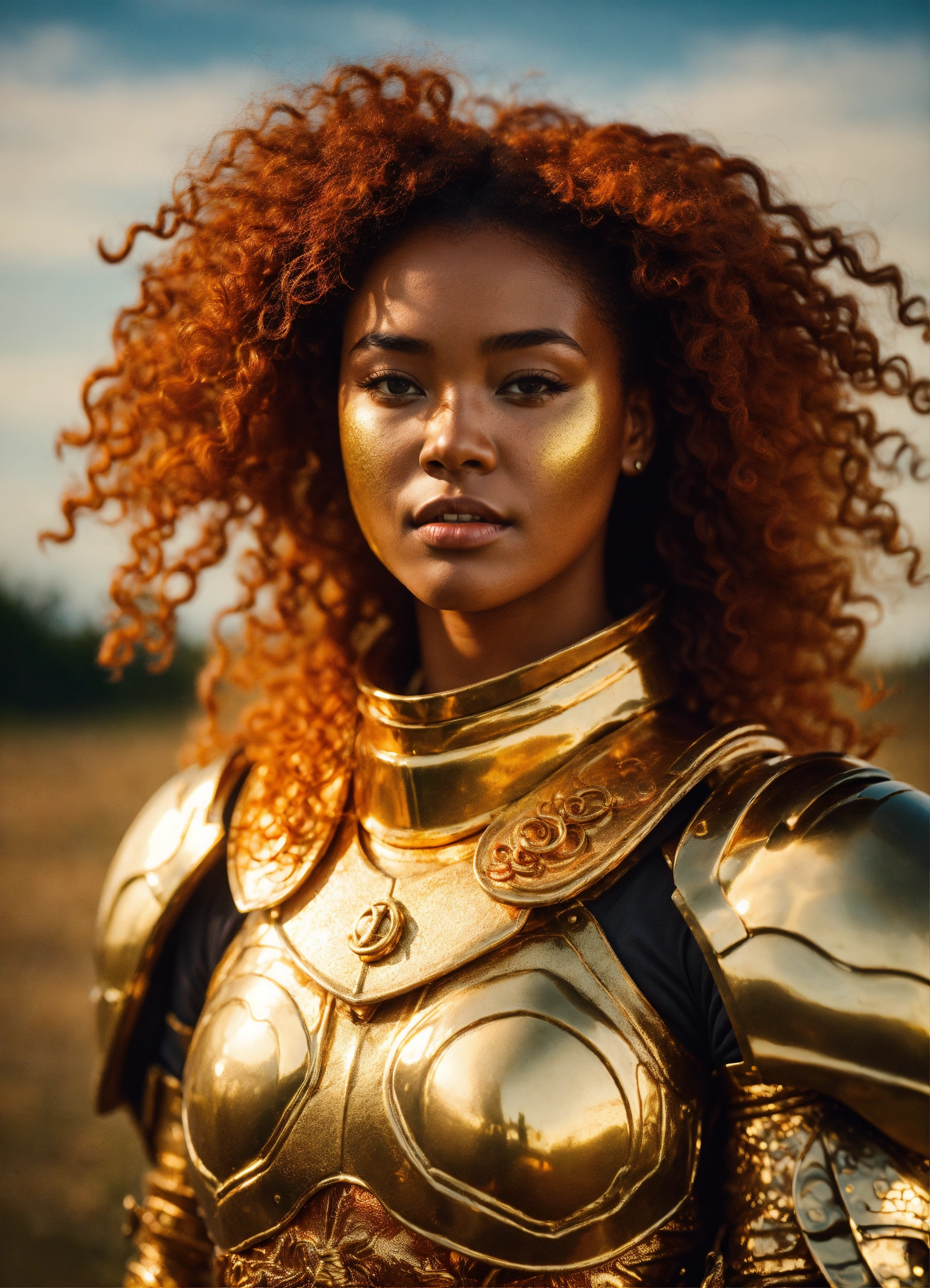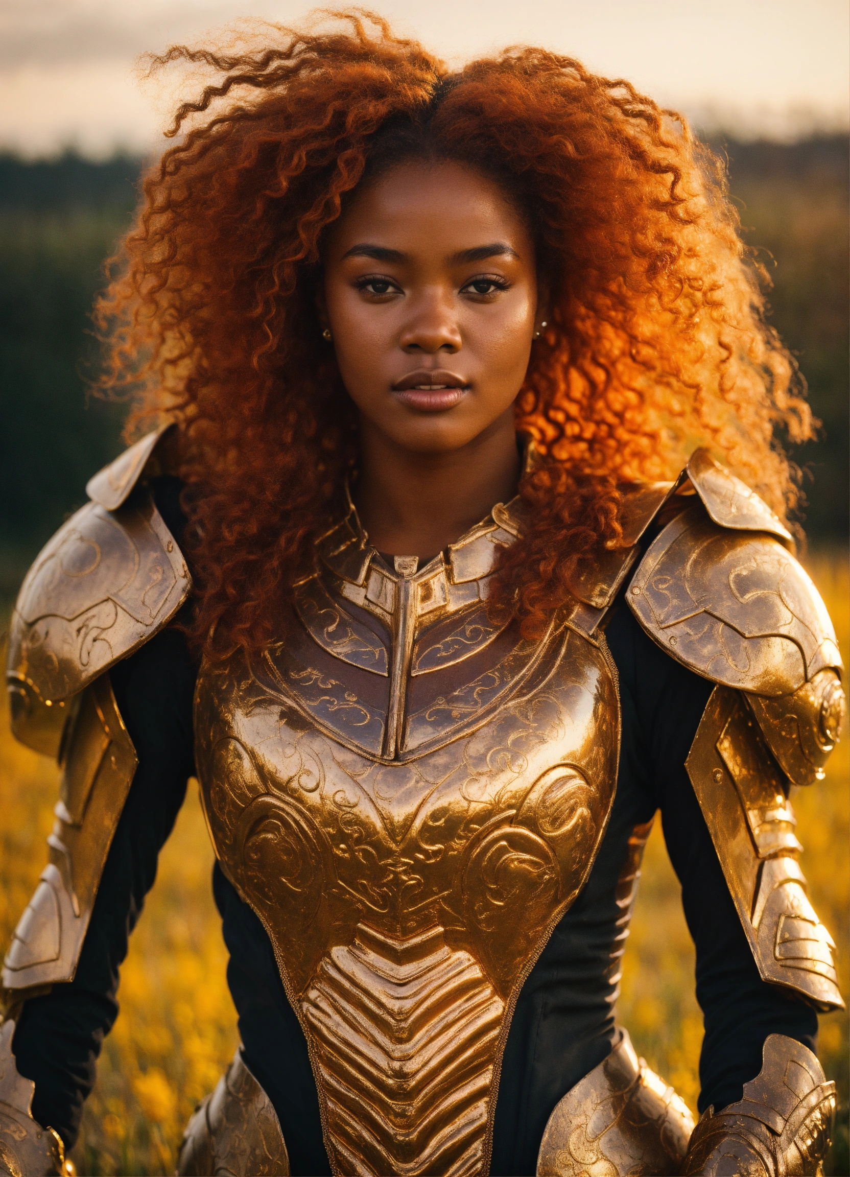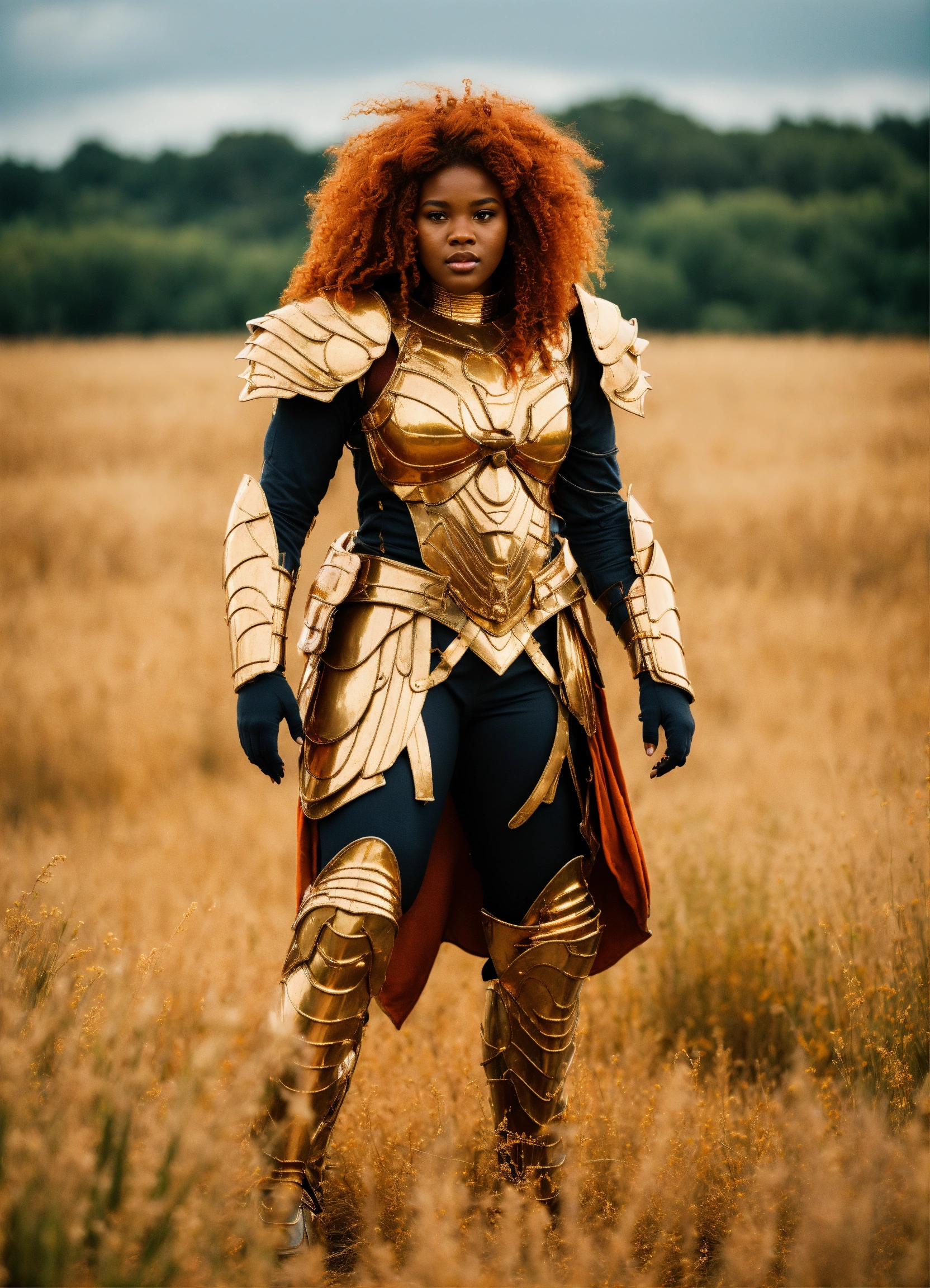 Pretty human looking alien with dark orange skin, big reddish orange curly hair, african features, plus size model, dressed in gold armor. in field