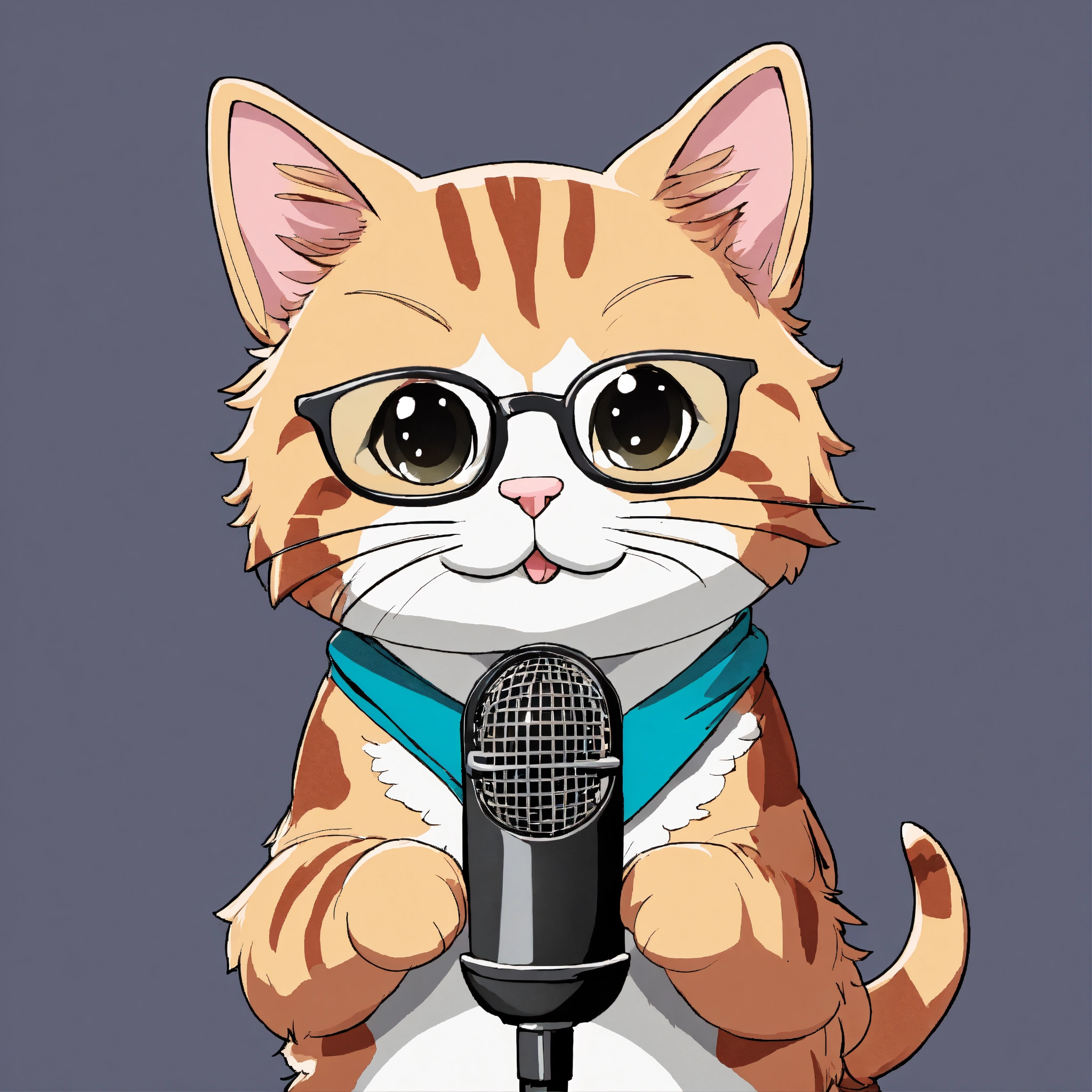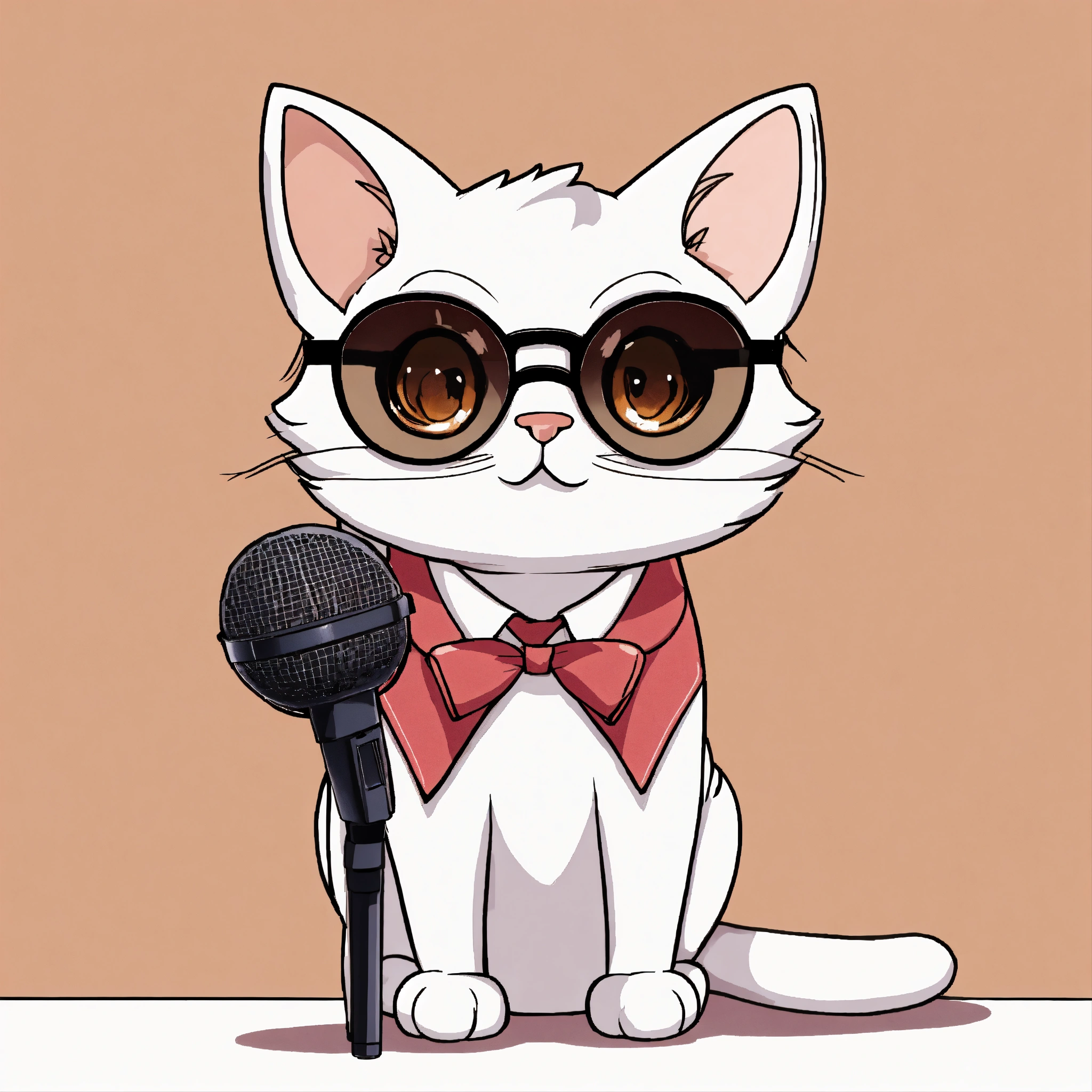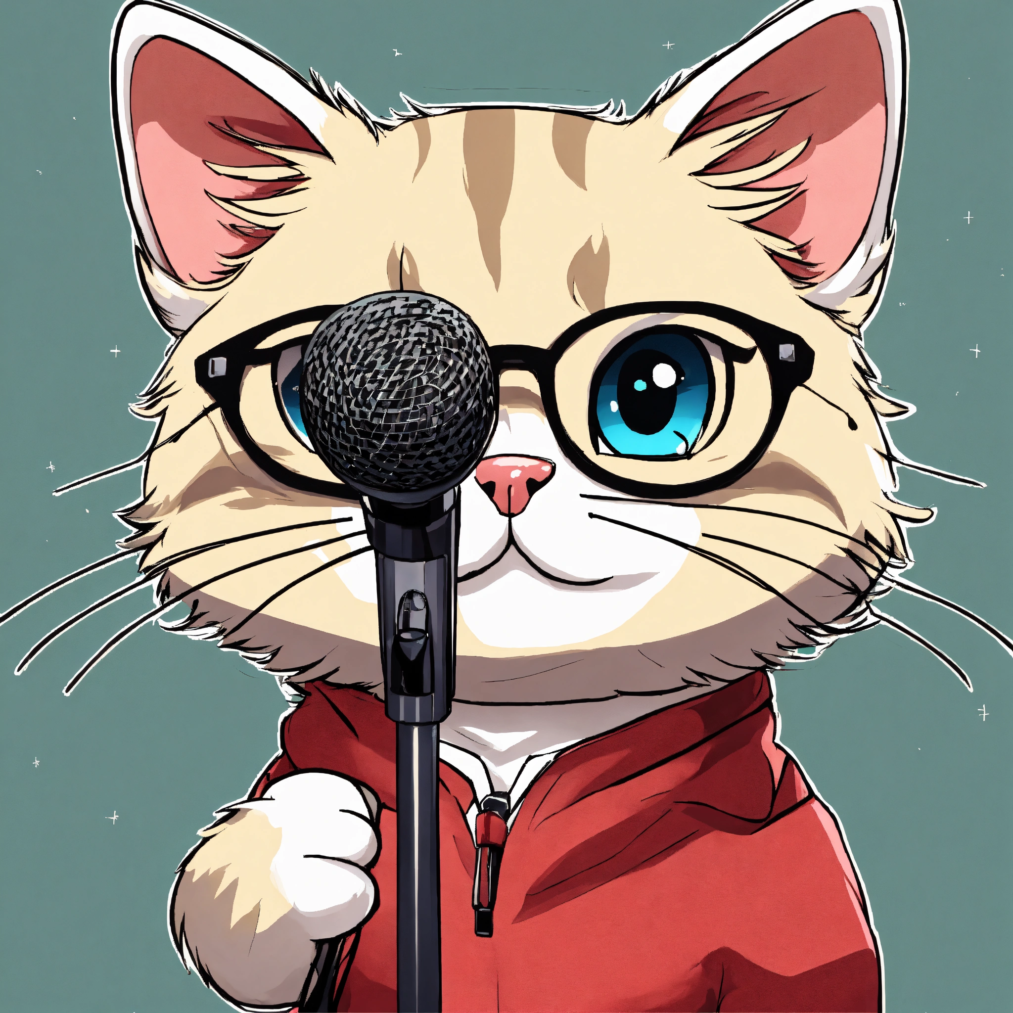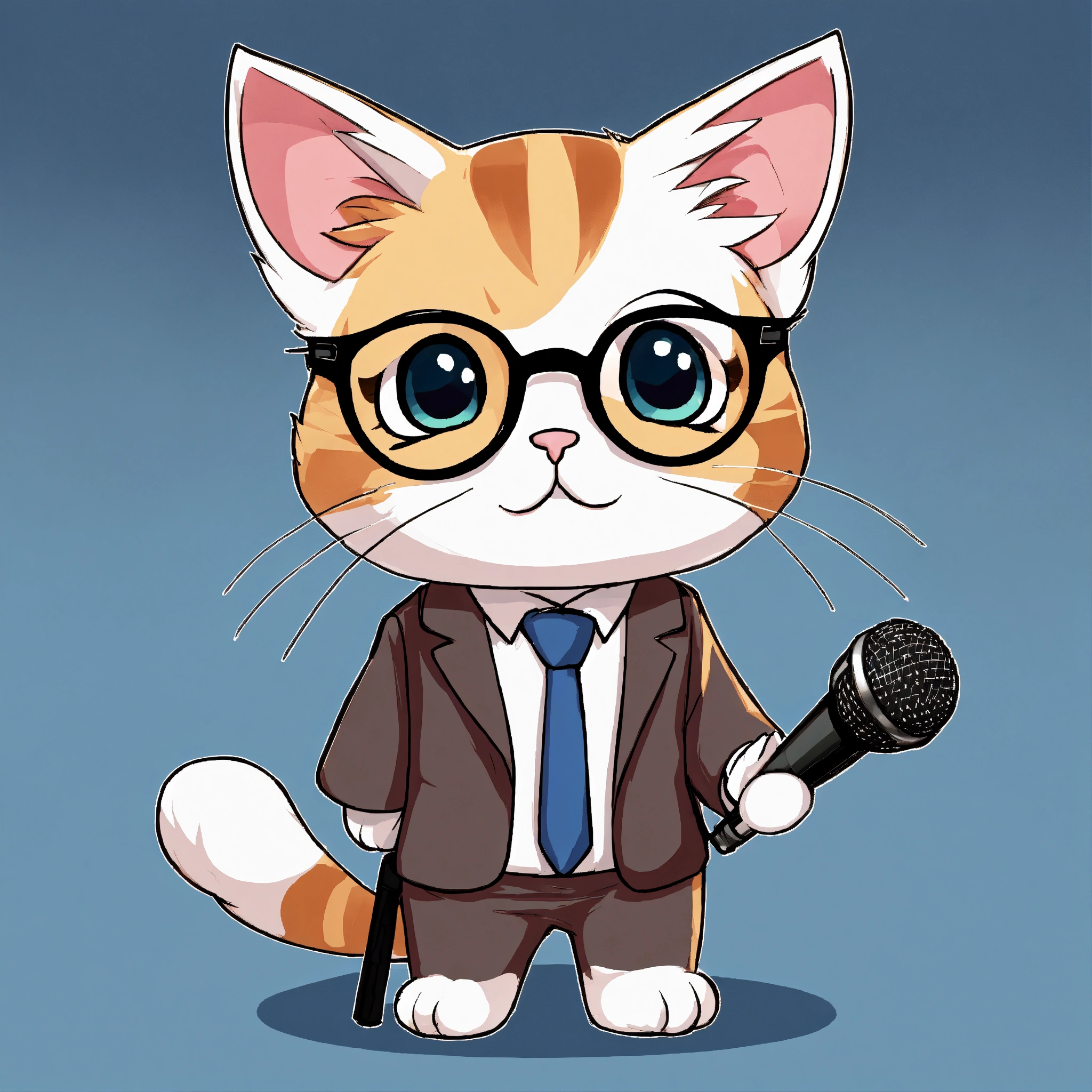 Cute anime cat standing with glasses holding a interview microphone, high quality, cartoon, blank background