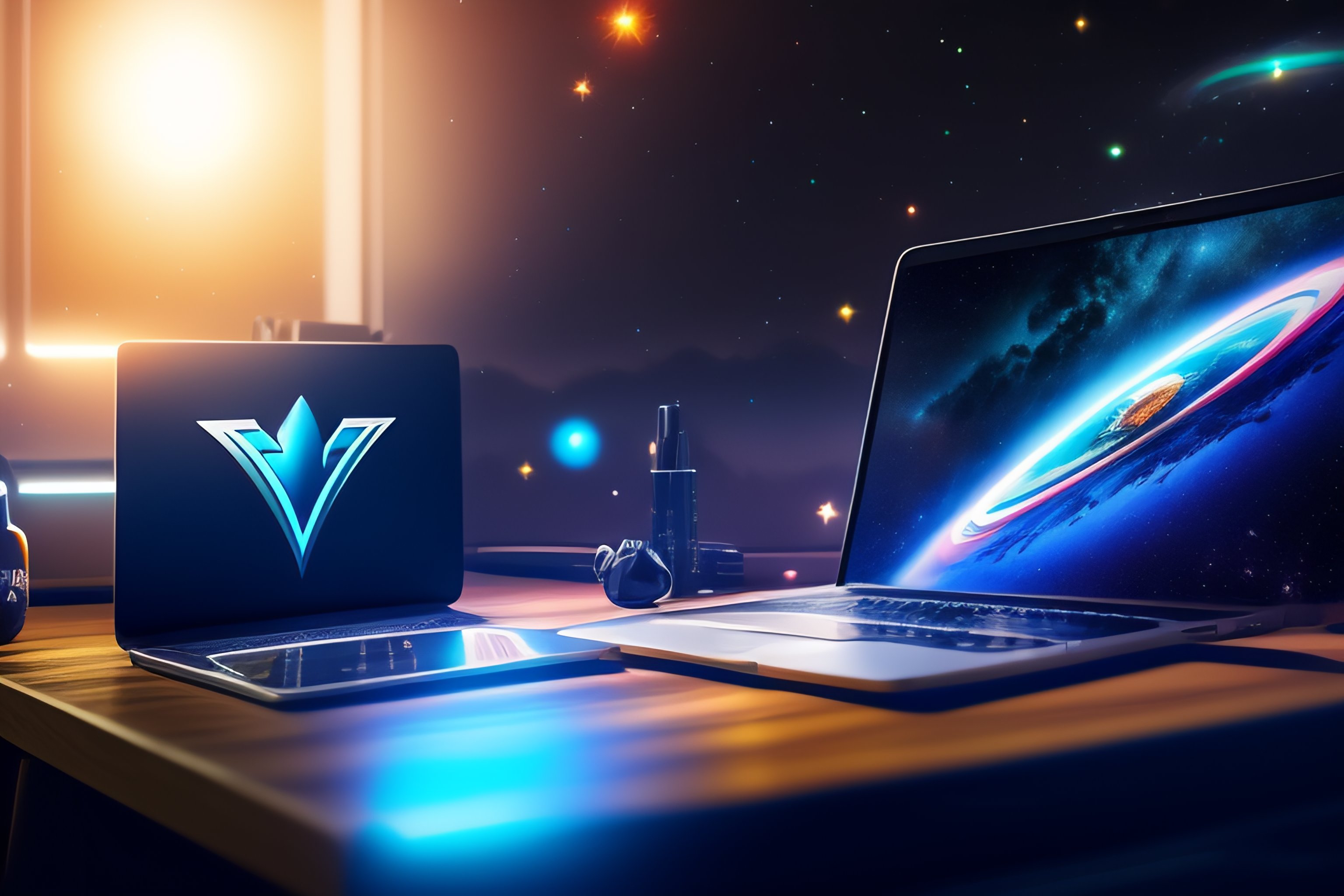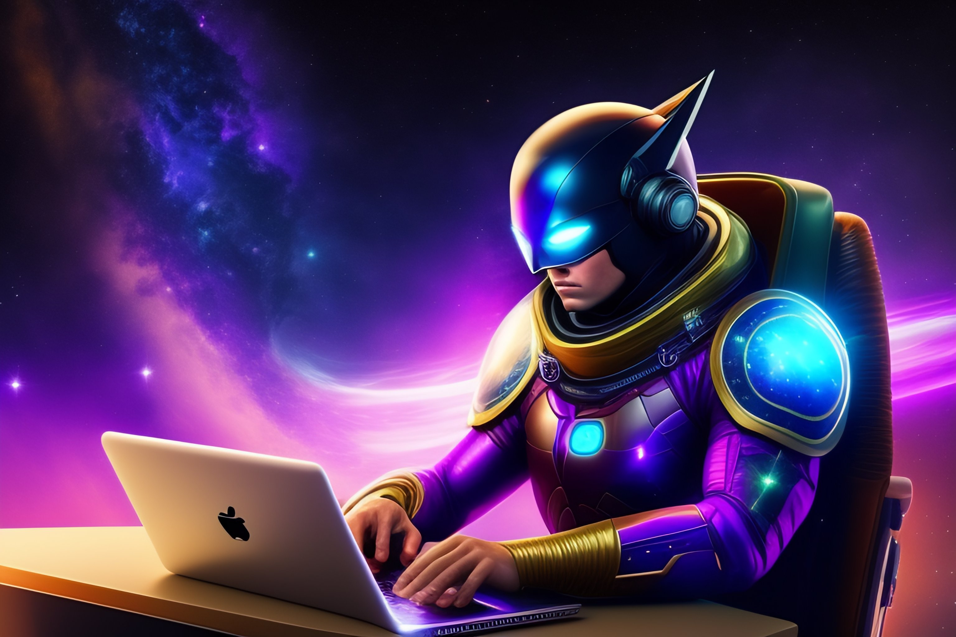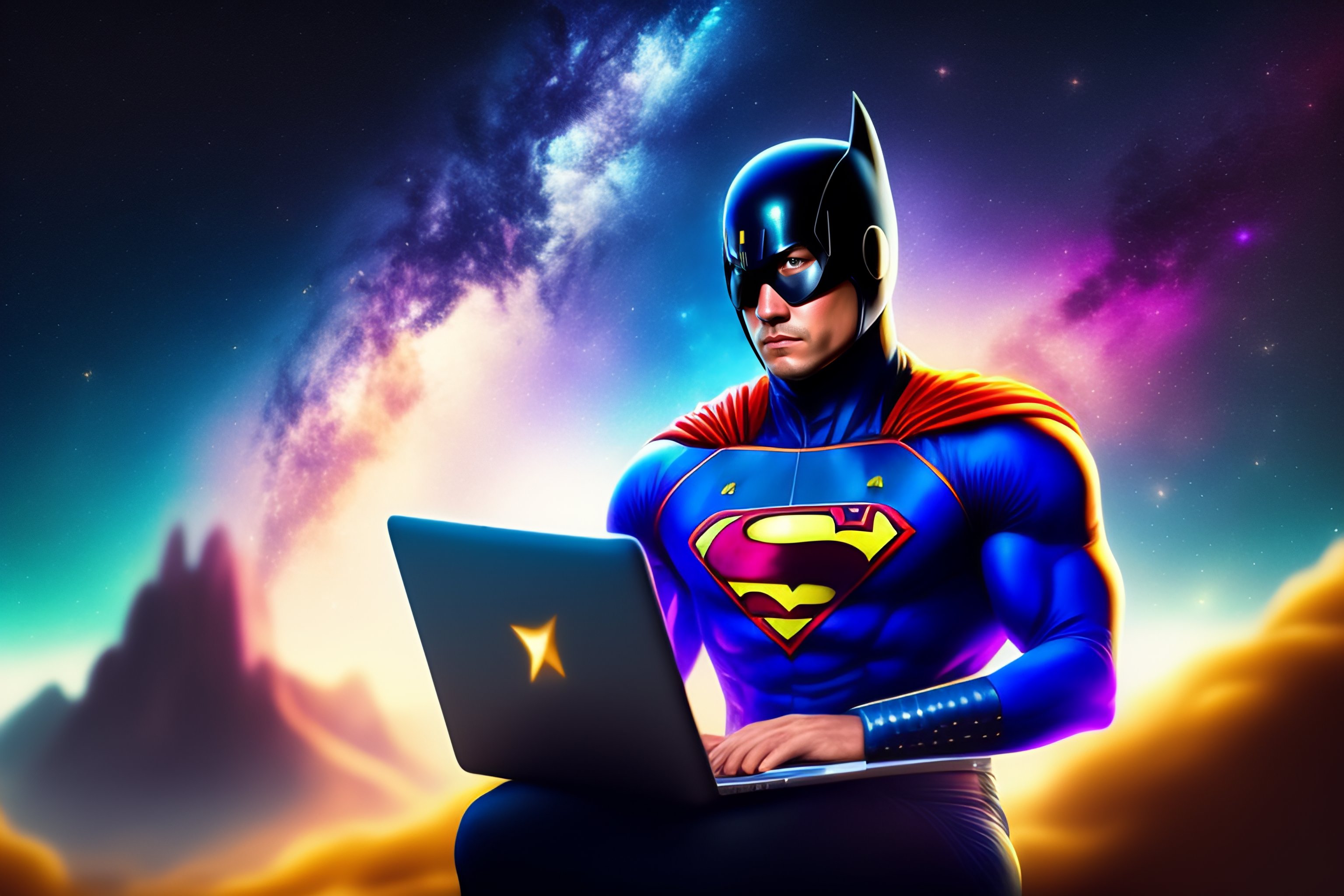 A superhero flying and coding a laptop in the galaxy around millions of stars