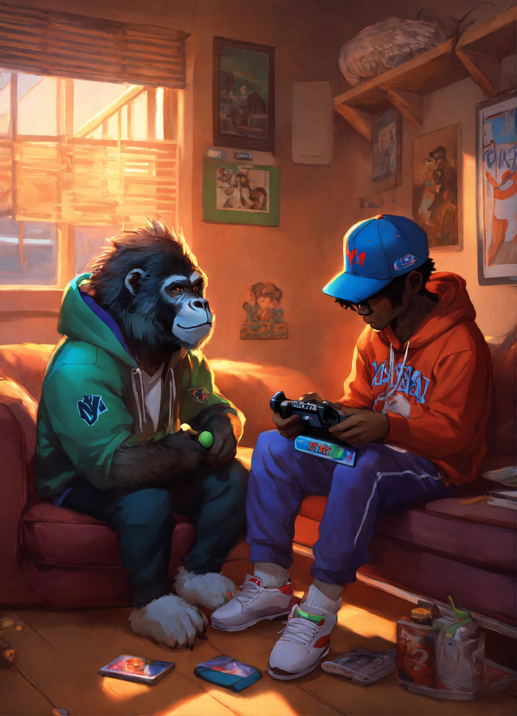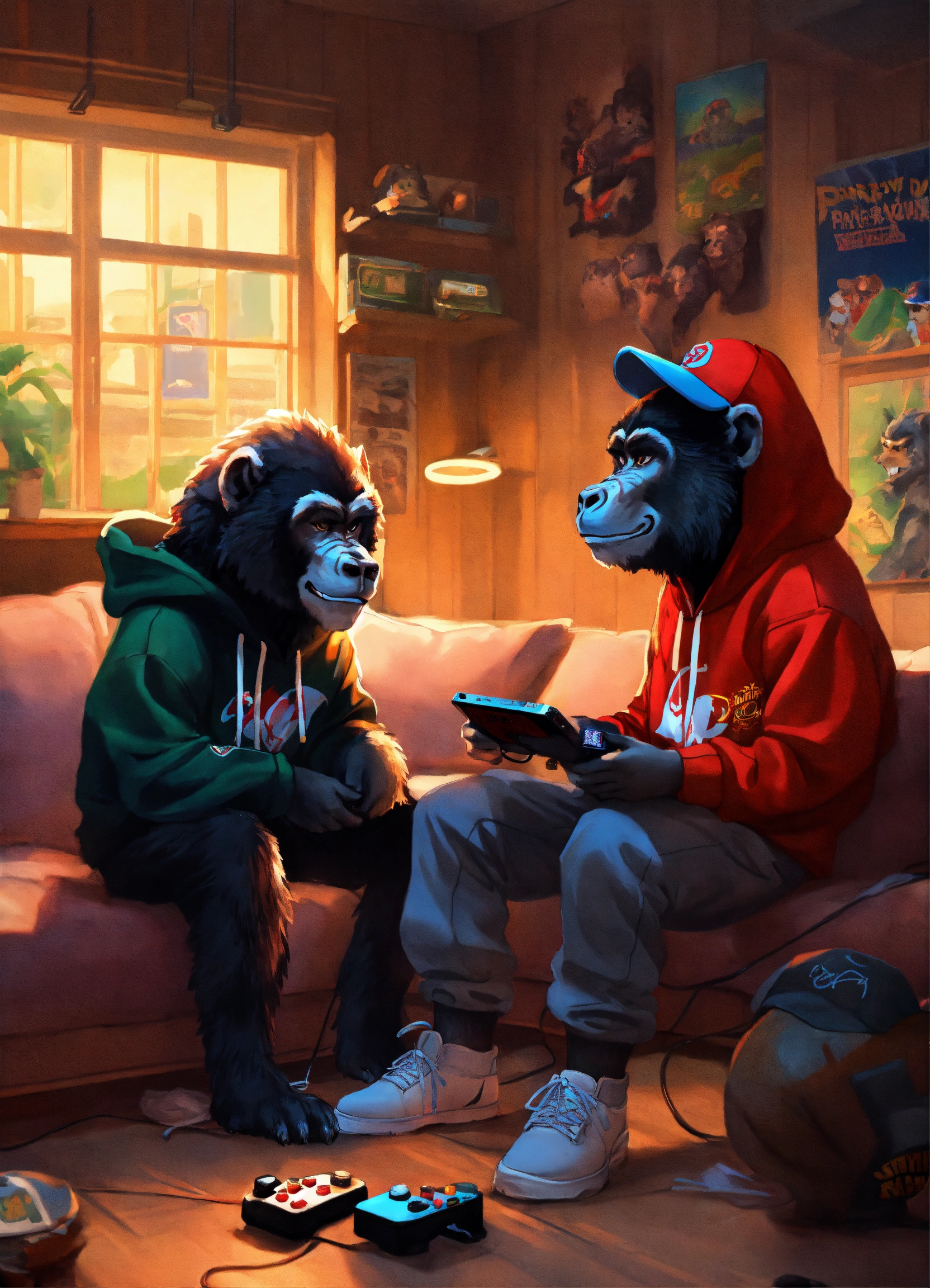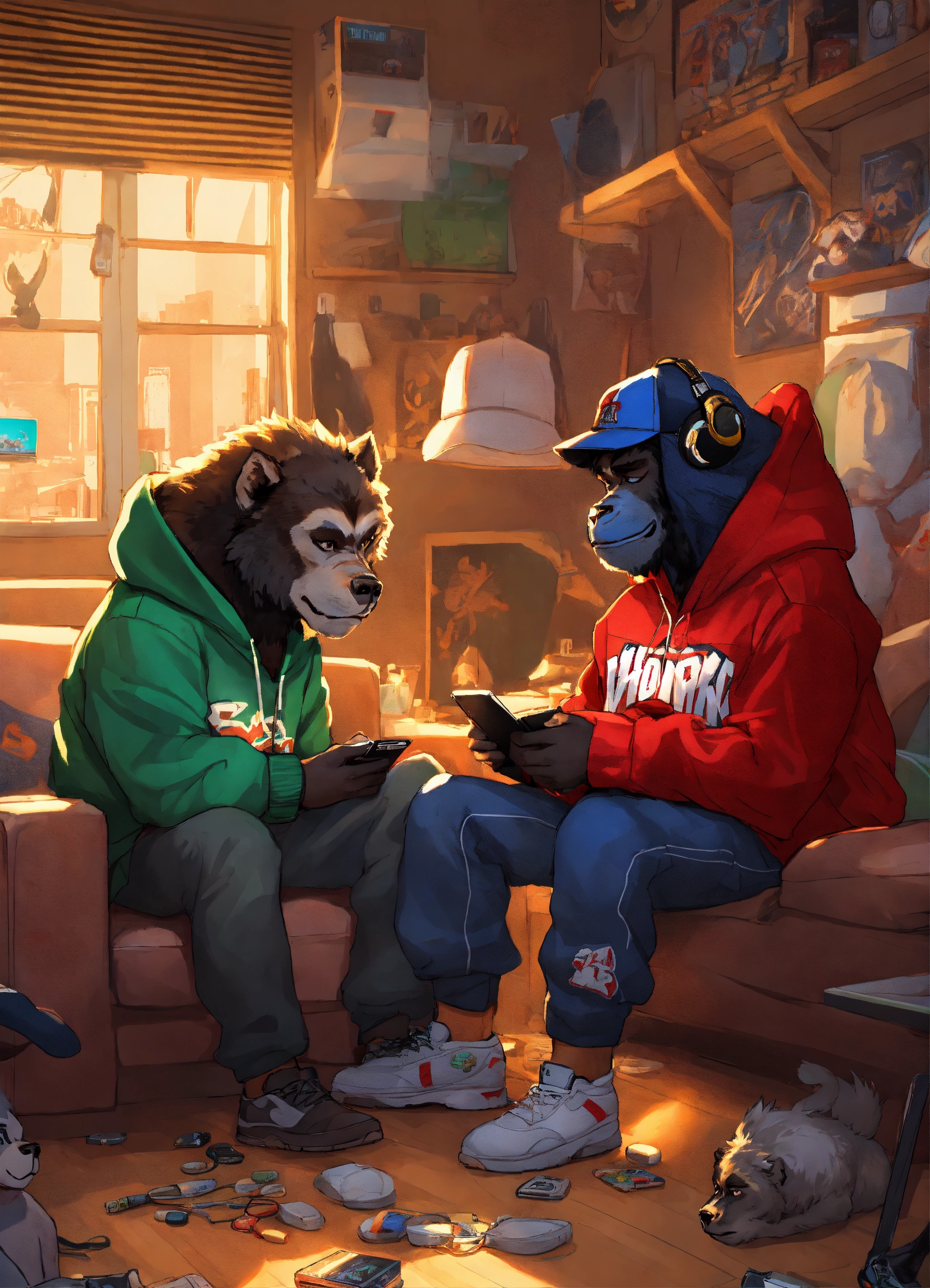 Young wolf and young gorilla wearing hoodies and baseball caps playing a video game