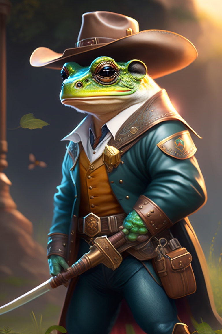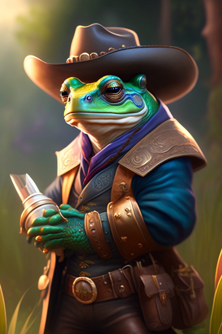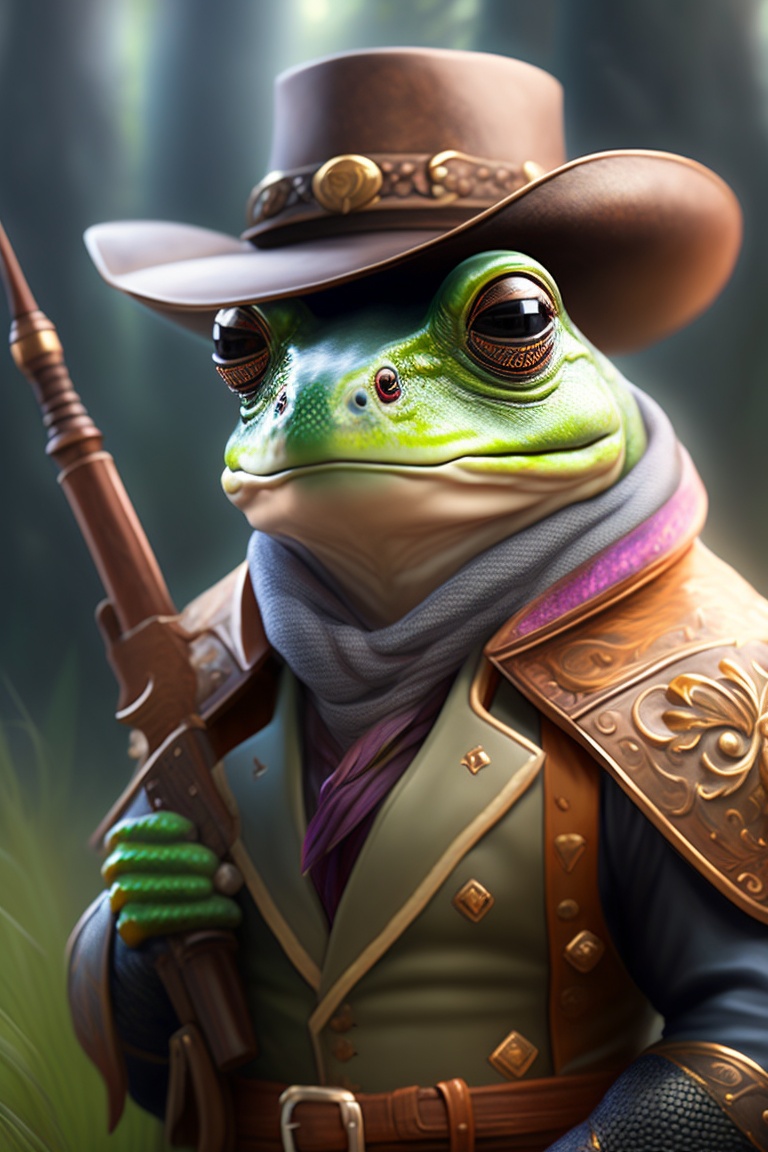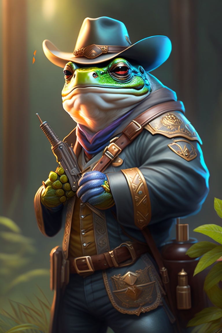 A frog cowboy with revolver. d&d, fantasy, intricate, elegant, highly detailed, digital painting, artstation, concept art, matte, sharp focus, illustration, matte painting, trending artstation, 8k, poison dart frog