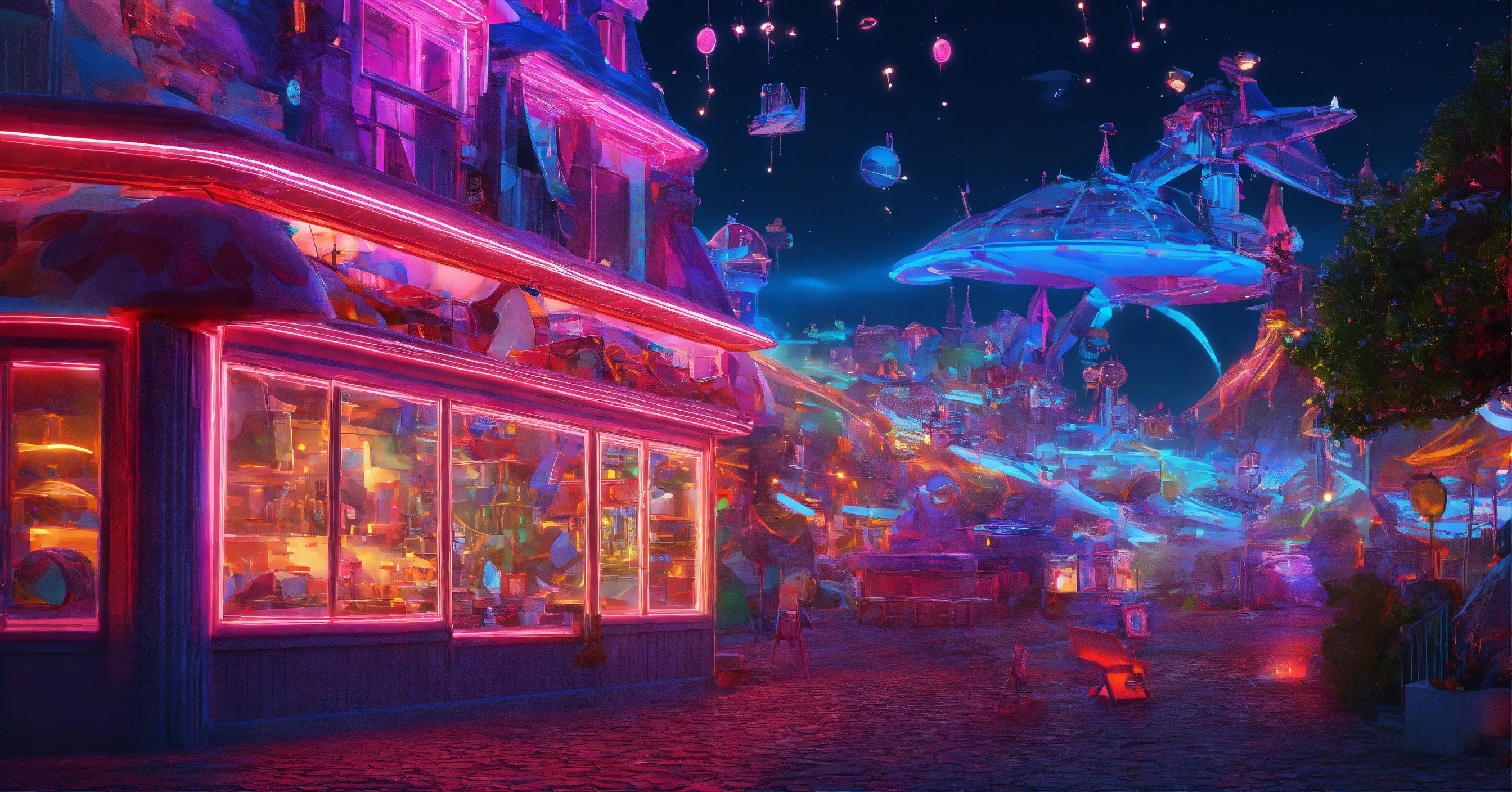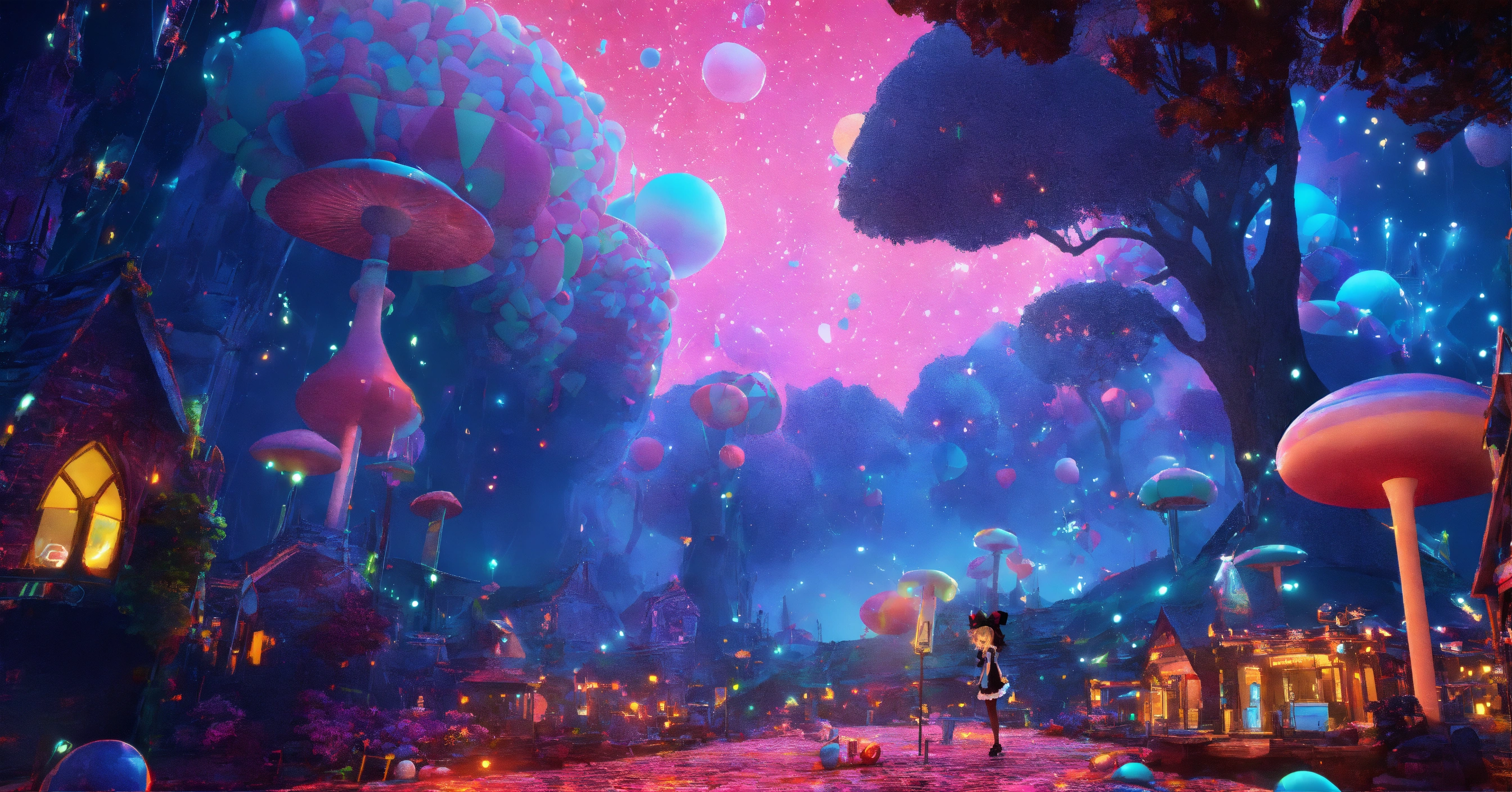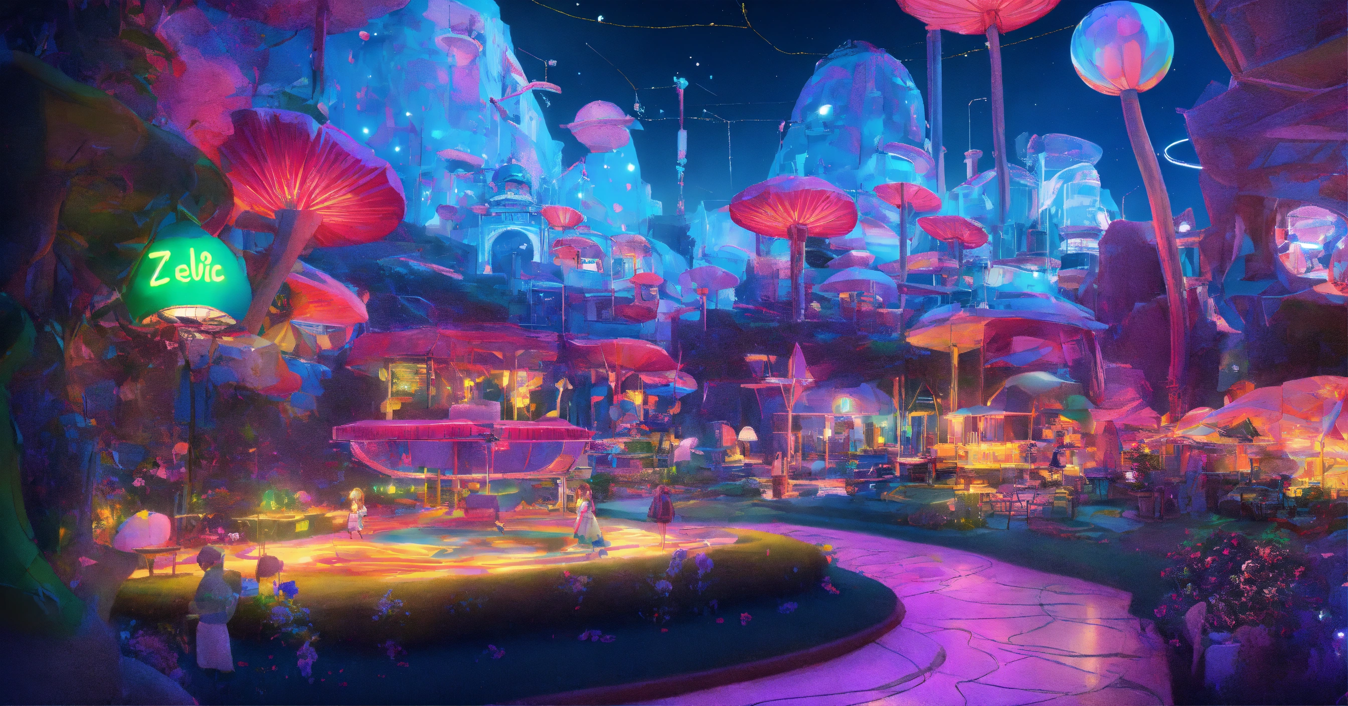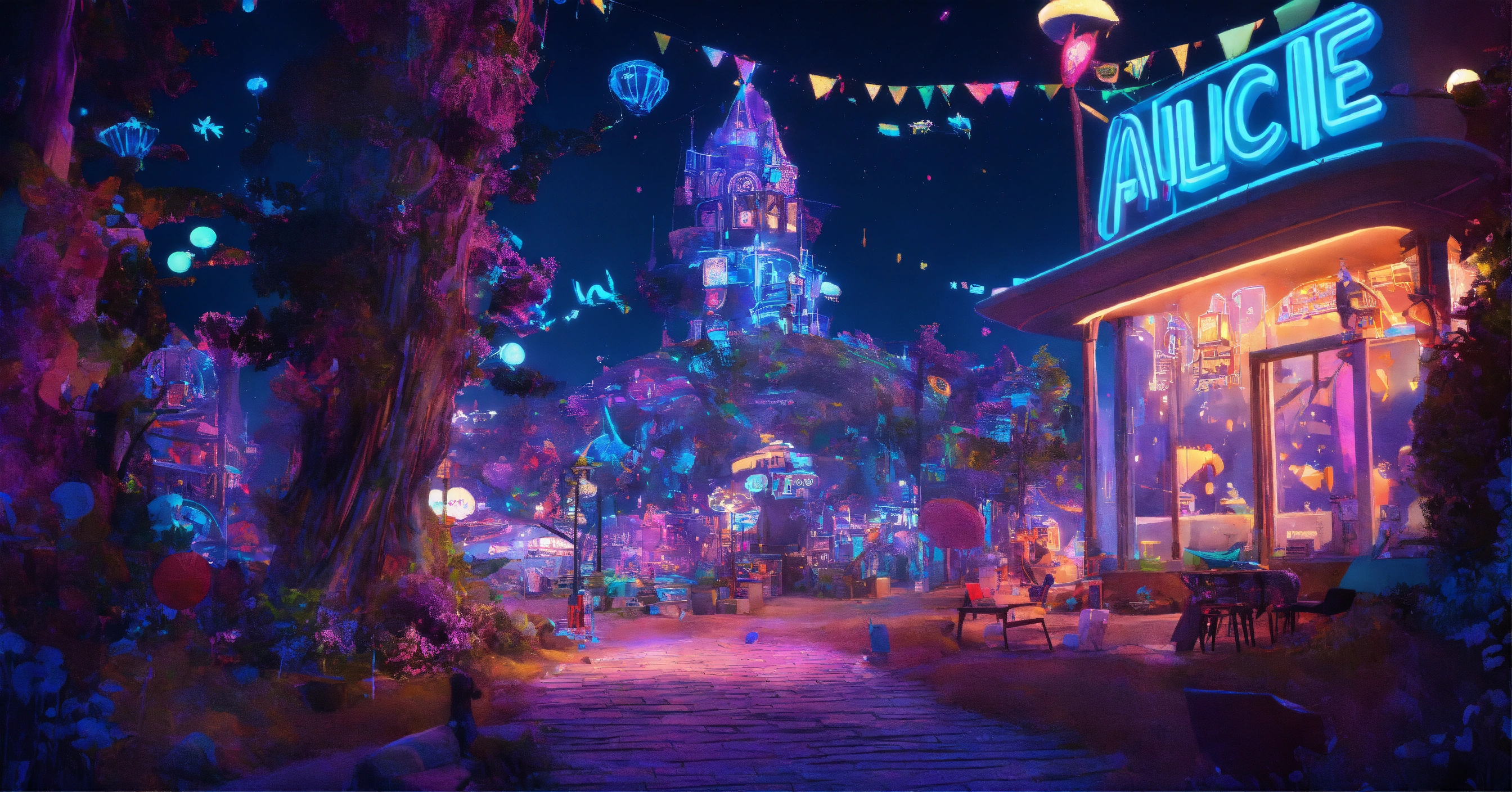 Alice im wunderland, nacht, gitter, neon outlines, milky war, zeichnung, 3d perspektive, tiefenschärfe, einfarbig