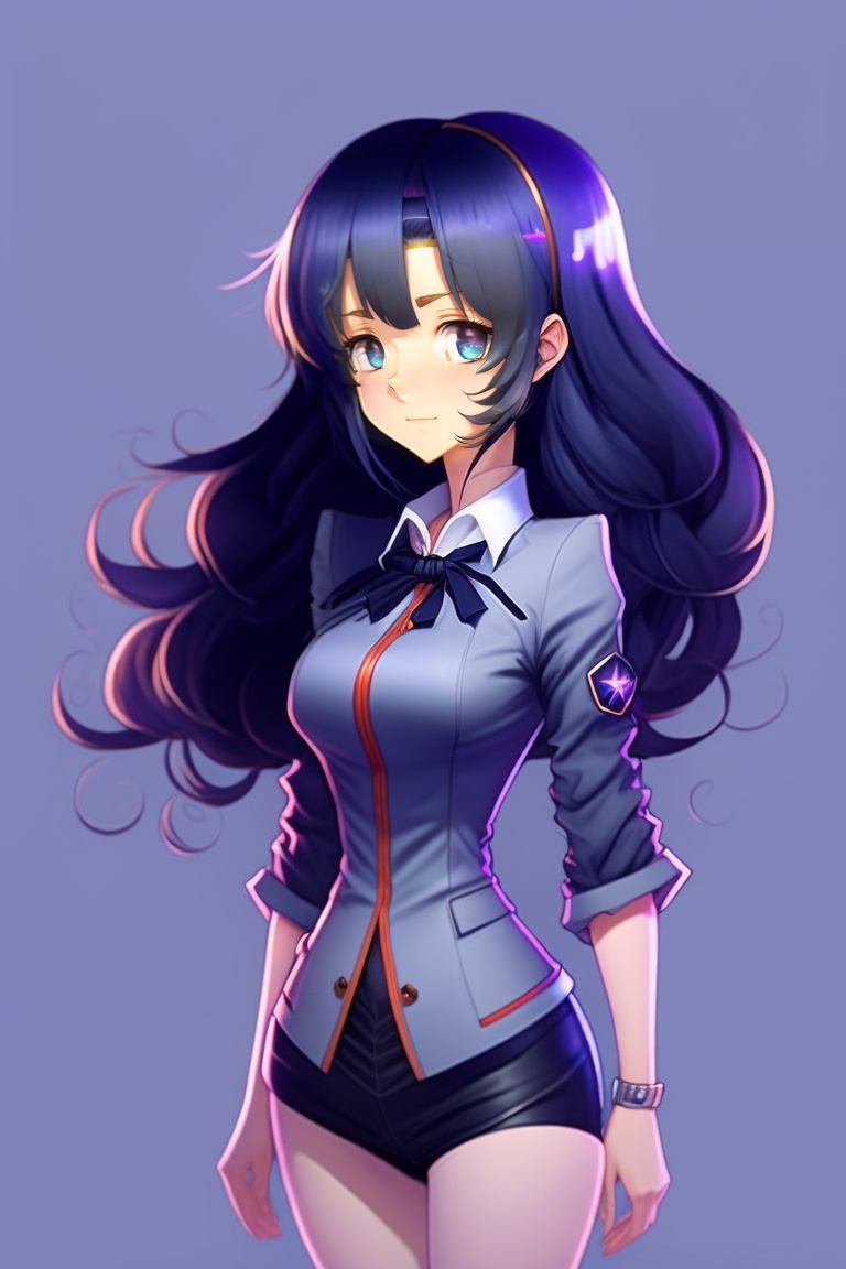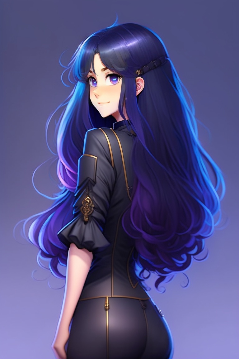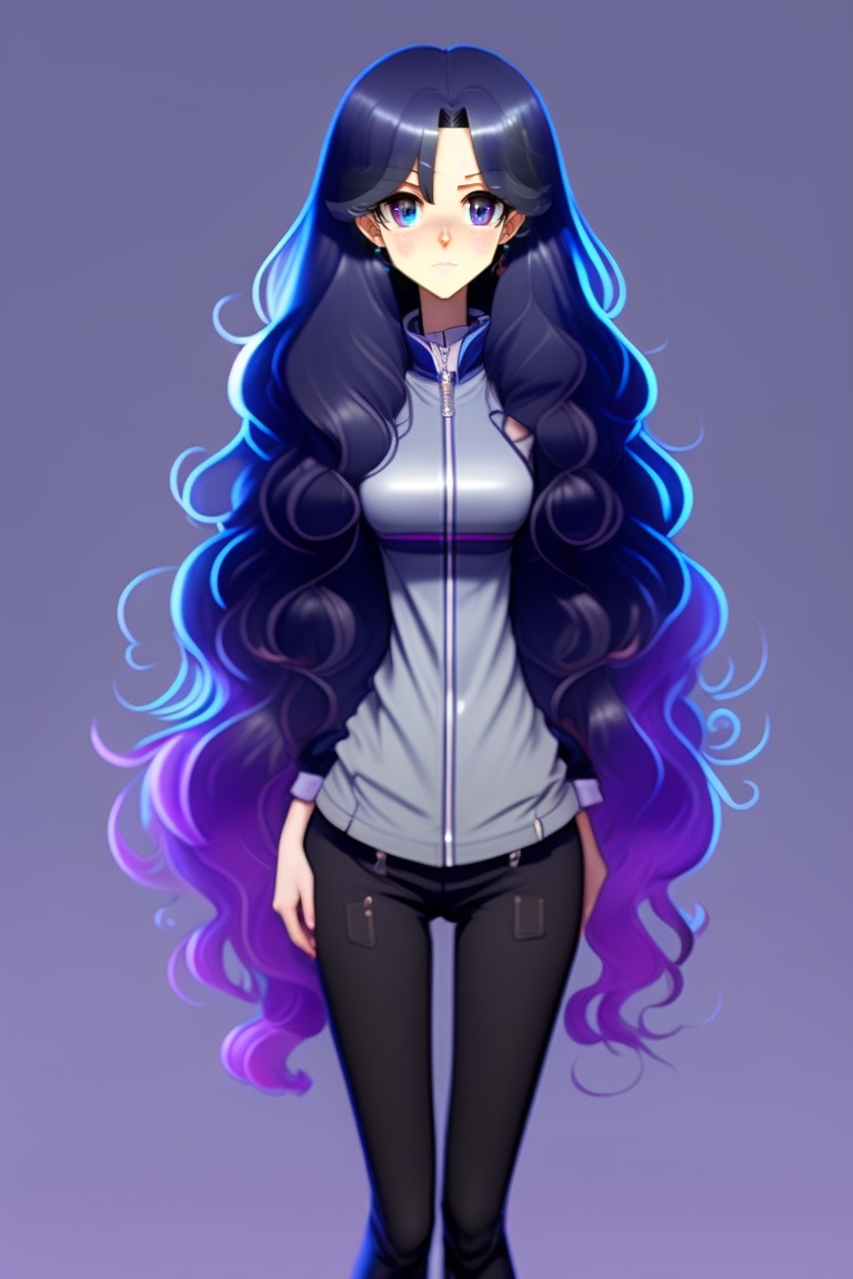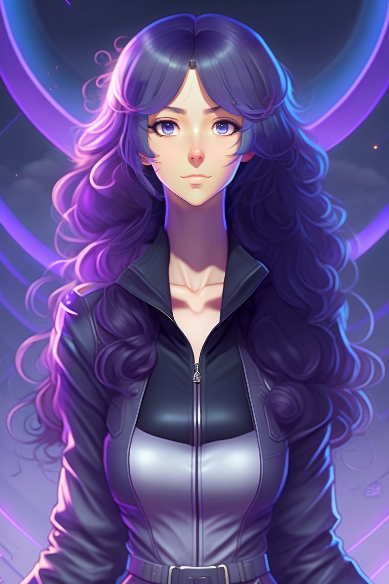 A female cartoon character with long curly dark blue-black hair, she is tall and slim, around age 25, oval face, slender sharp cold eyes, has grey-purple pupils, has an air of isolation, she is a scientist. in the style of anime. looks more like a real human being