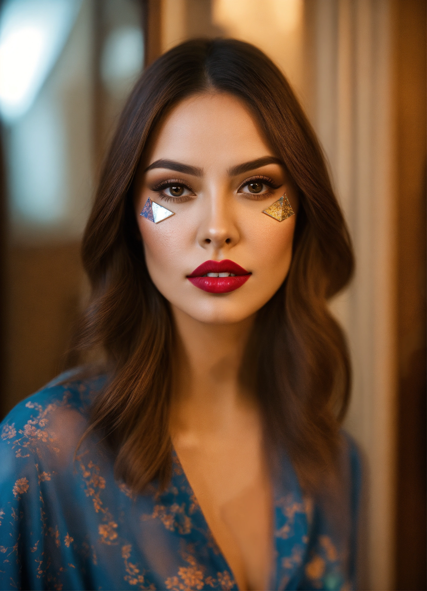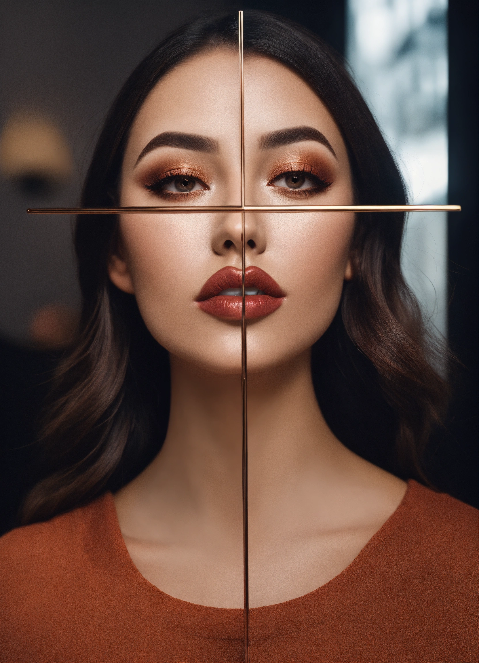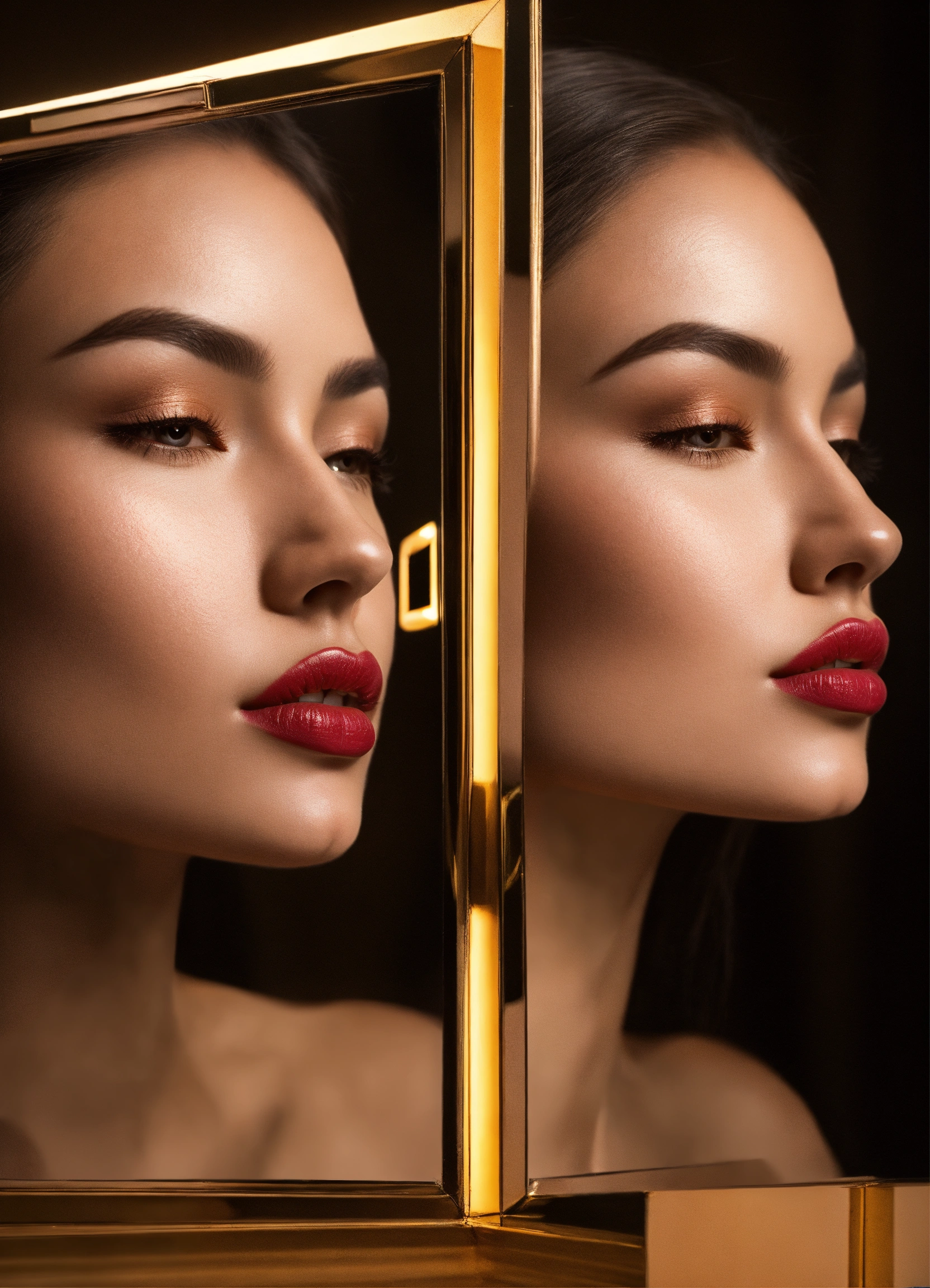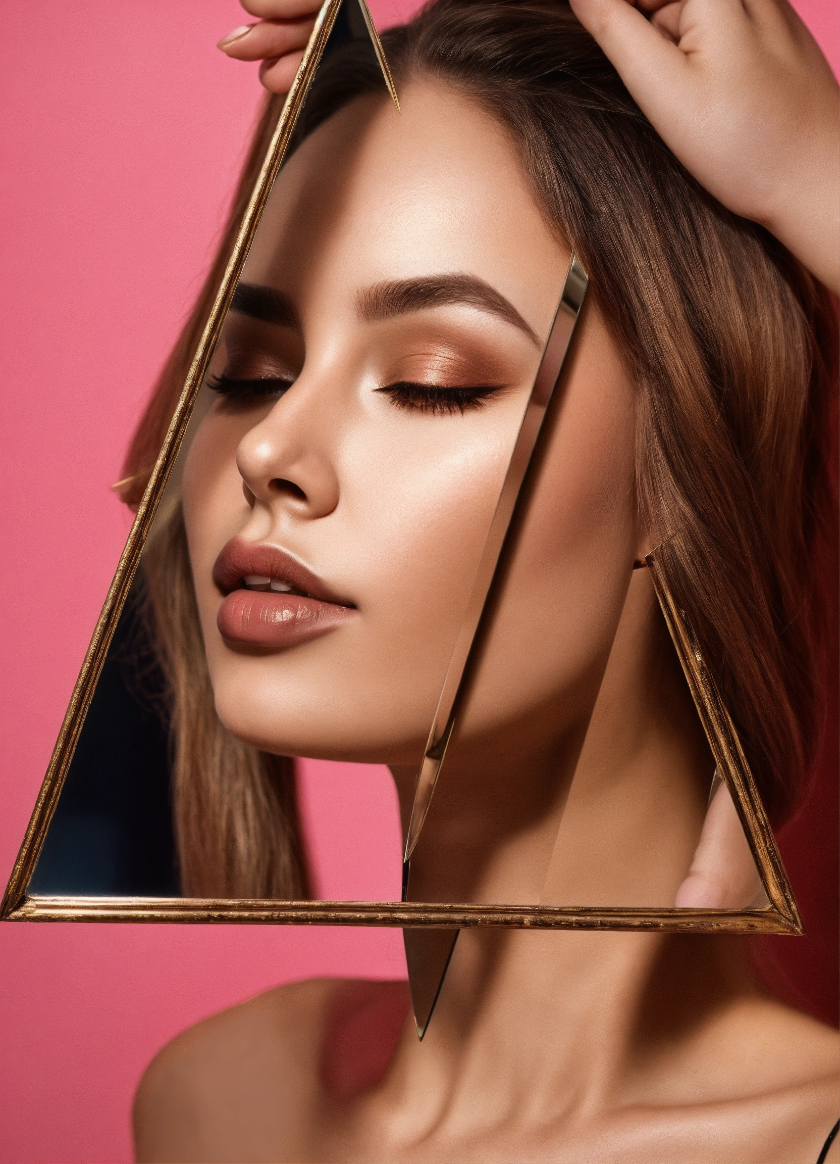 Down point triangle shaped mirror with lips makeup of a beautiful woman with large forefront and thin chin looking in a mirror in a shape of a point down triangle with base on the top of the face image and point at the bottom of the face image