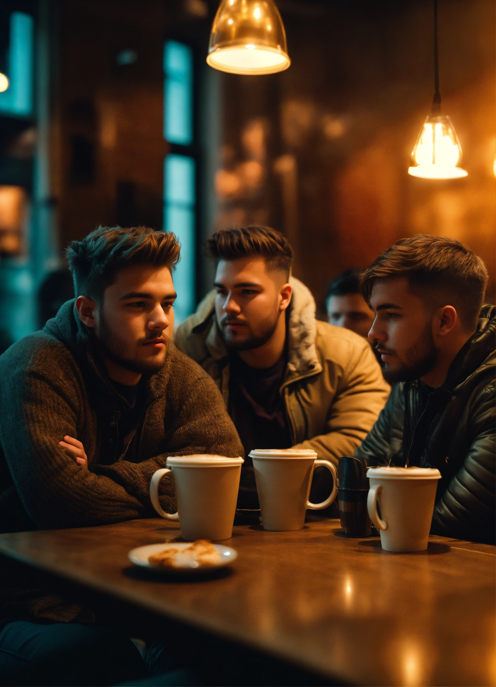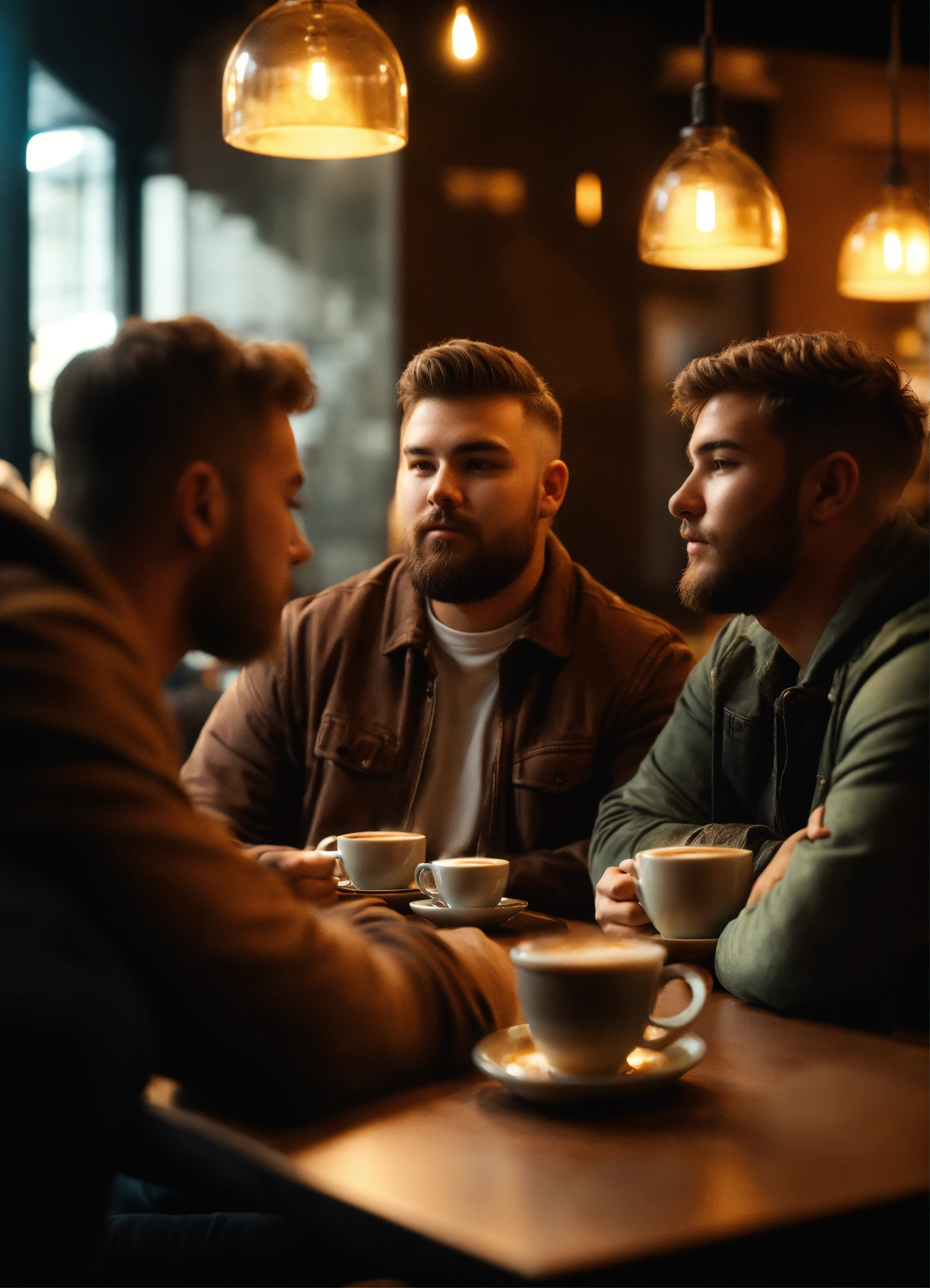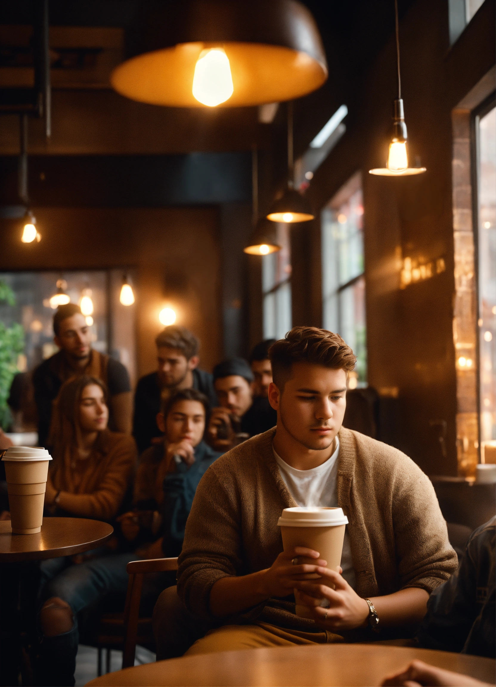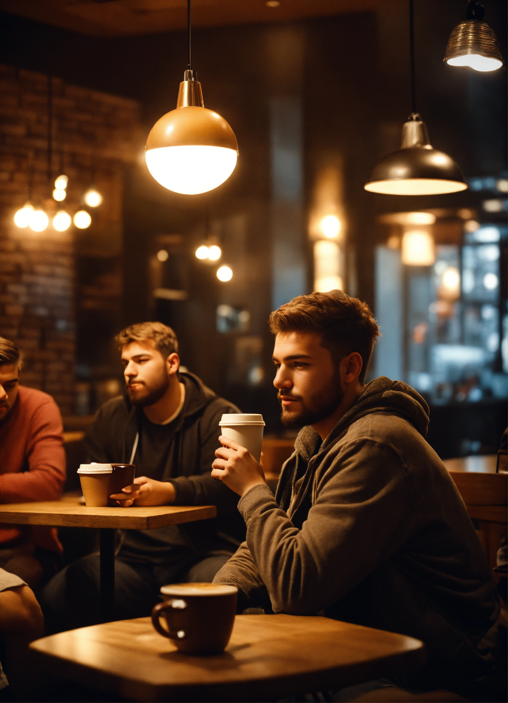 Group of plump young people seating on a coffee shop indoors with cinematic lighting, dramatic light, close up of the guy with a cup off coffee, hyperrealistic, textures, photorealistic, 8k