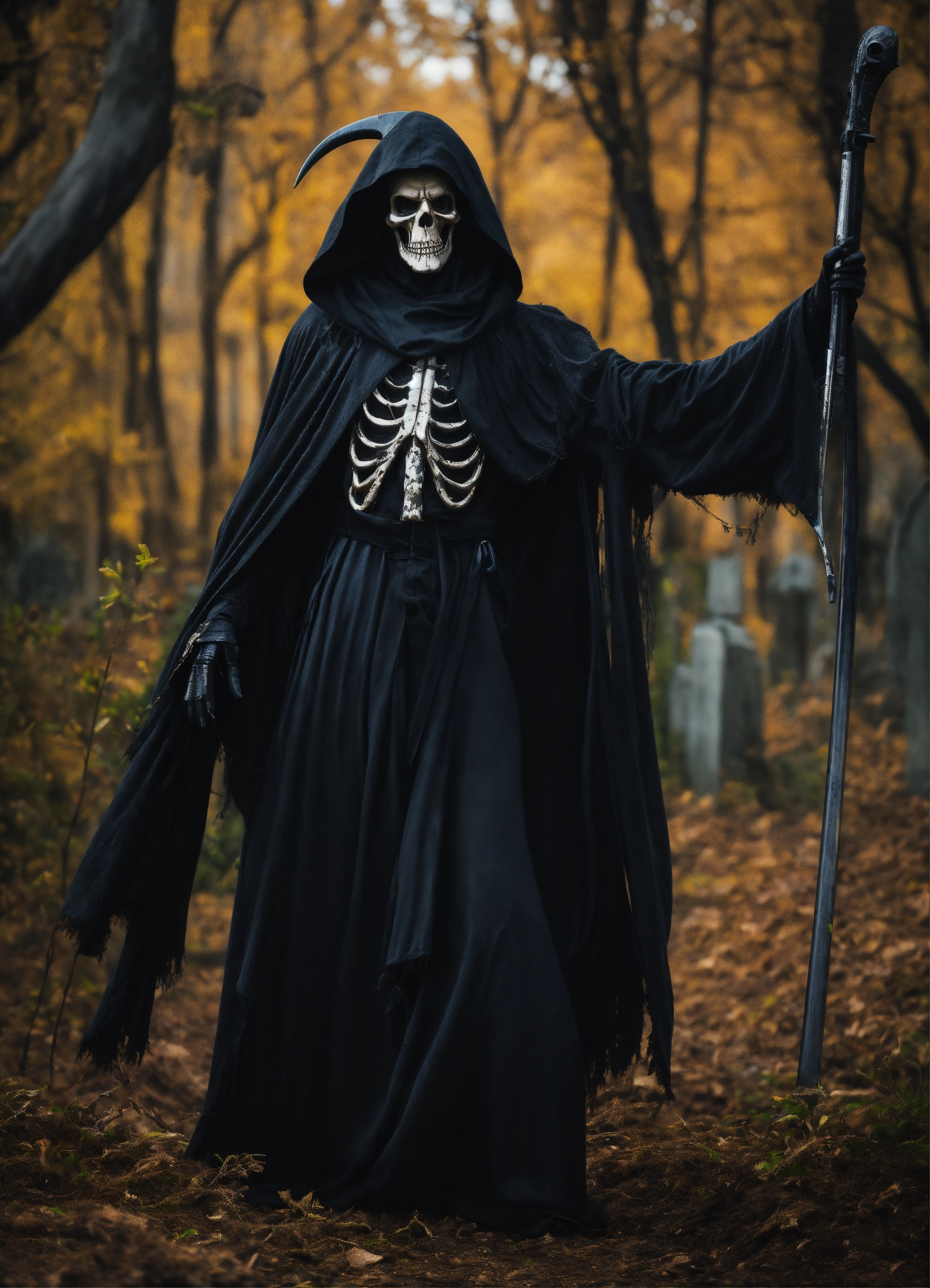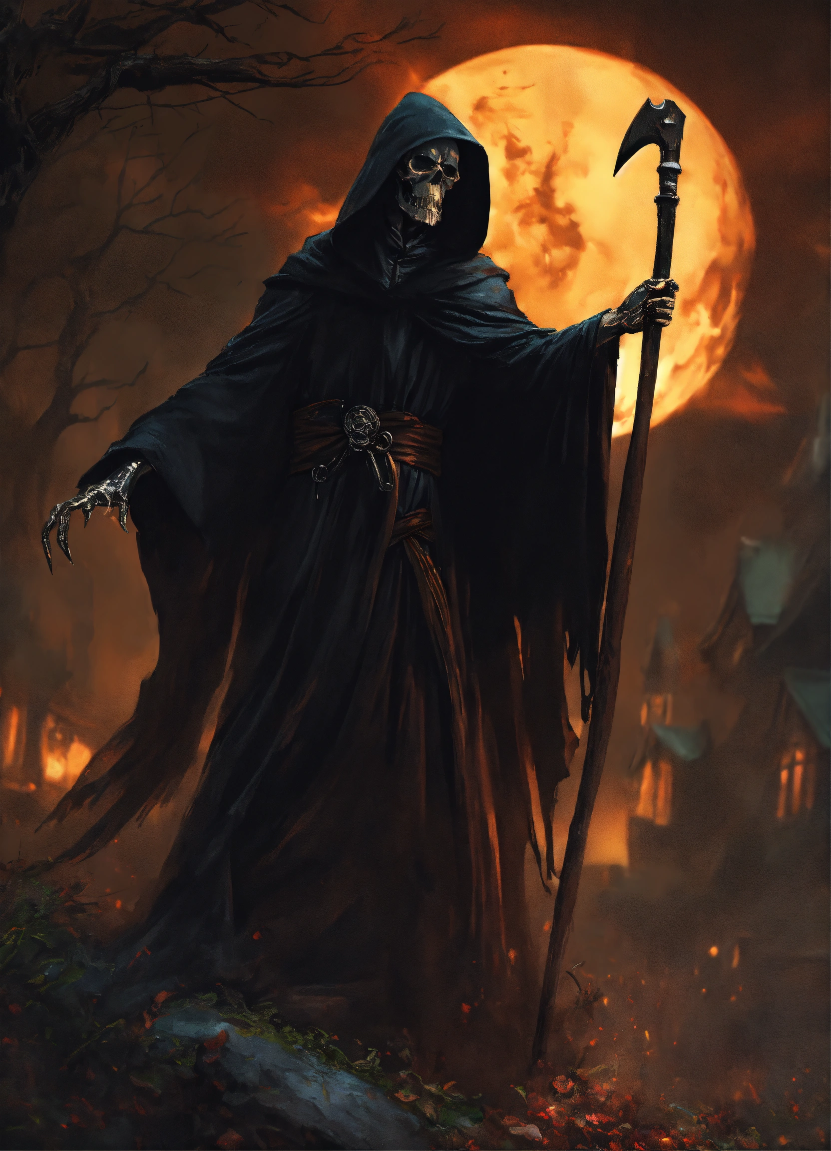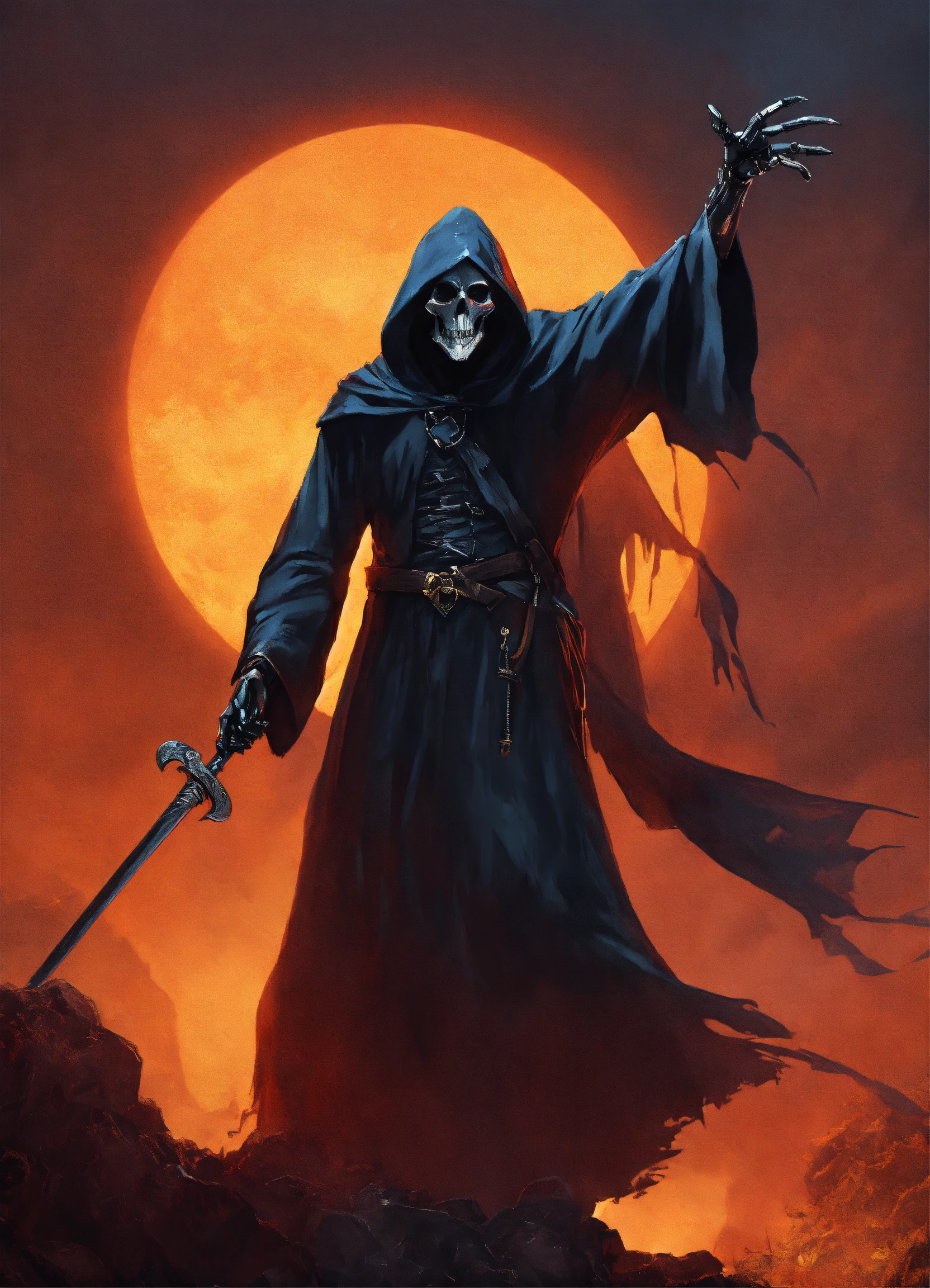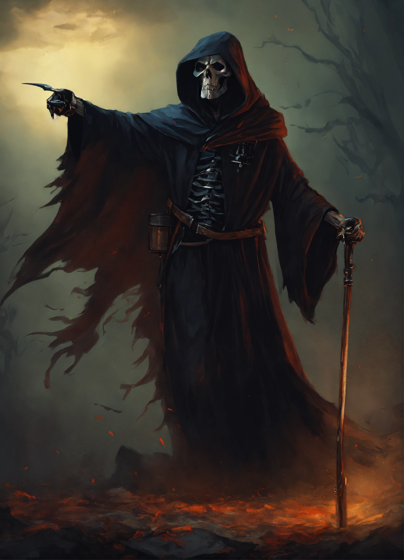 A grim reaper with his arm outstretched and pointing to the right