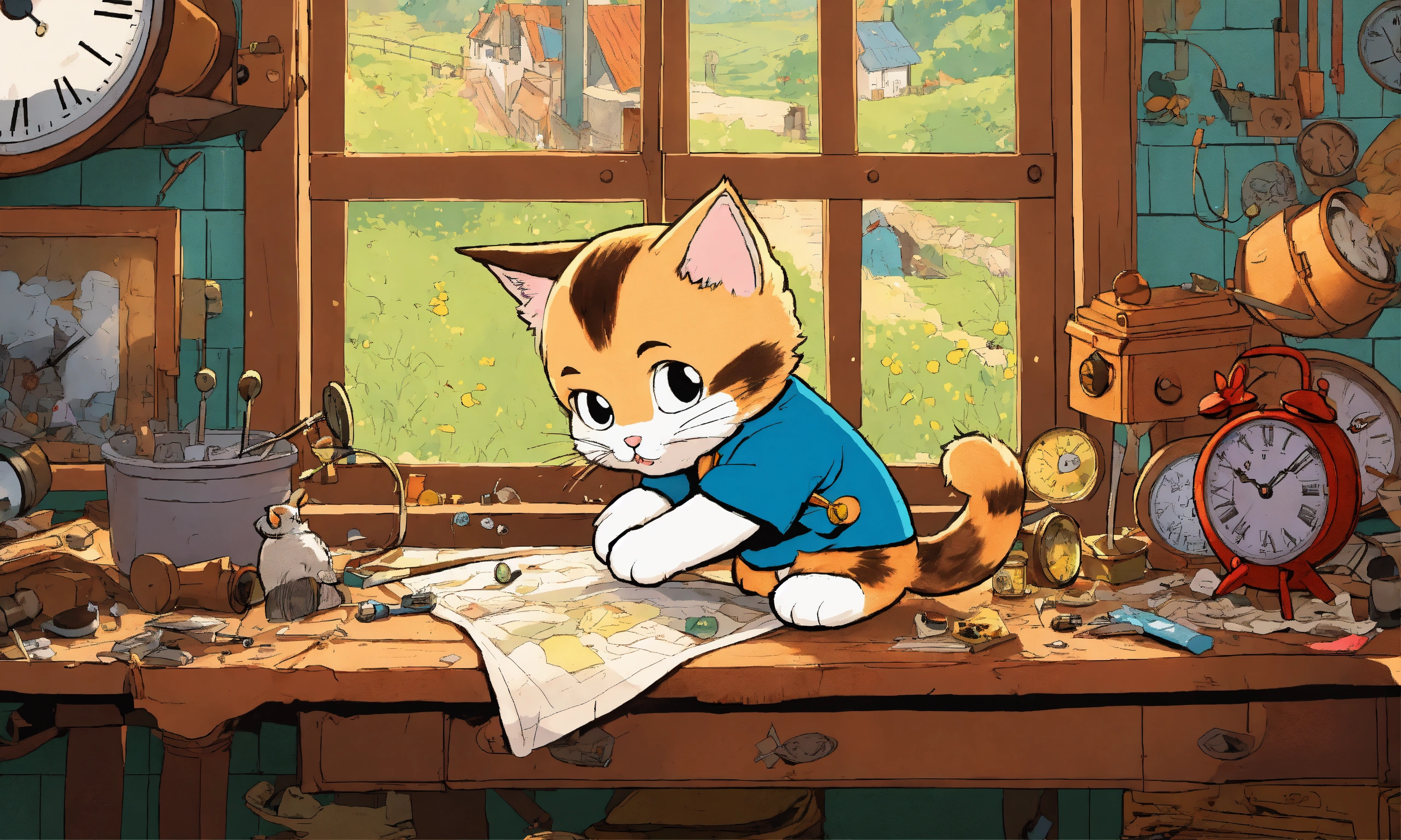 Digital art of cartoonish comic style, a cute kitten repairs a broken clock, on the messy desk at its clock shop, with nostalgic taste of 50's american country house, hilarious and innocent, illustration by hergé, hayao miyazaki, perfect coloring, 8k.