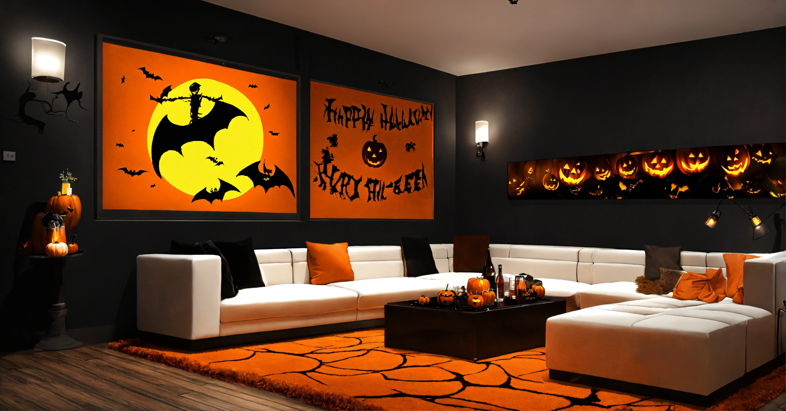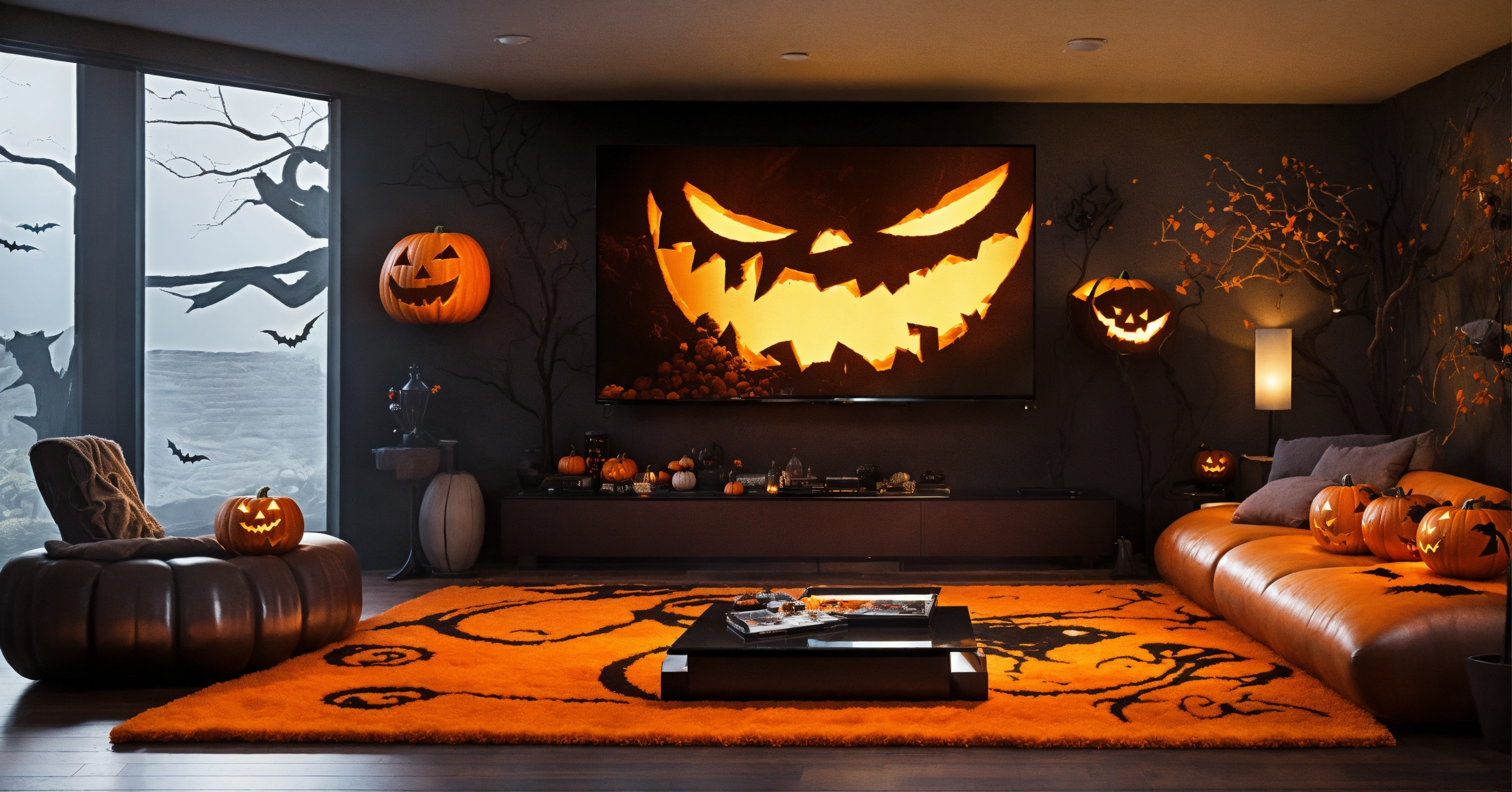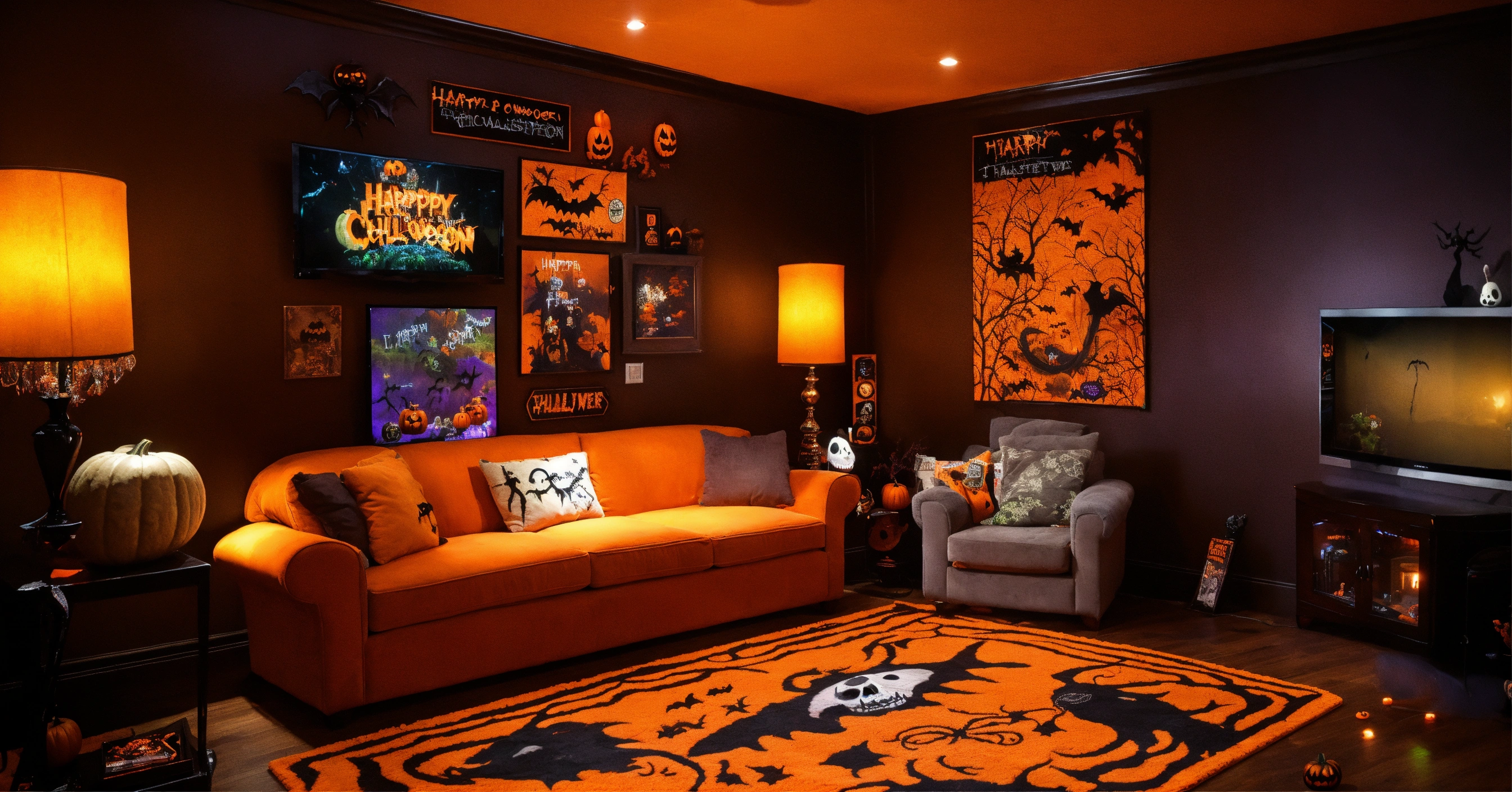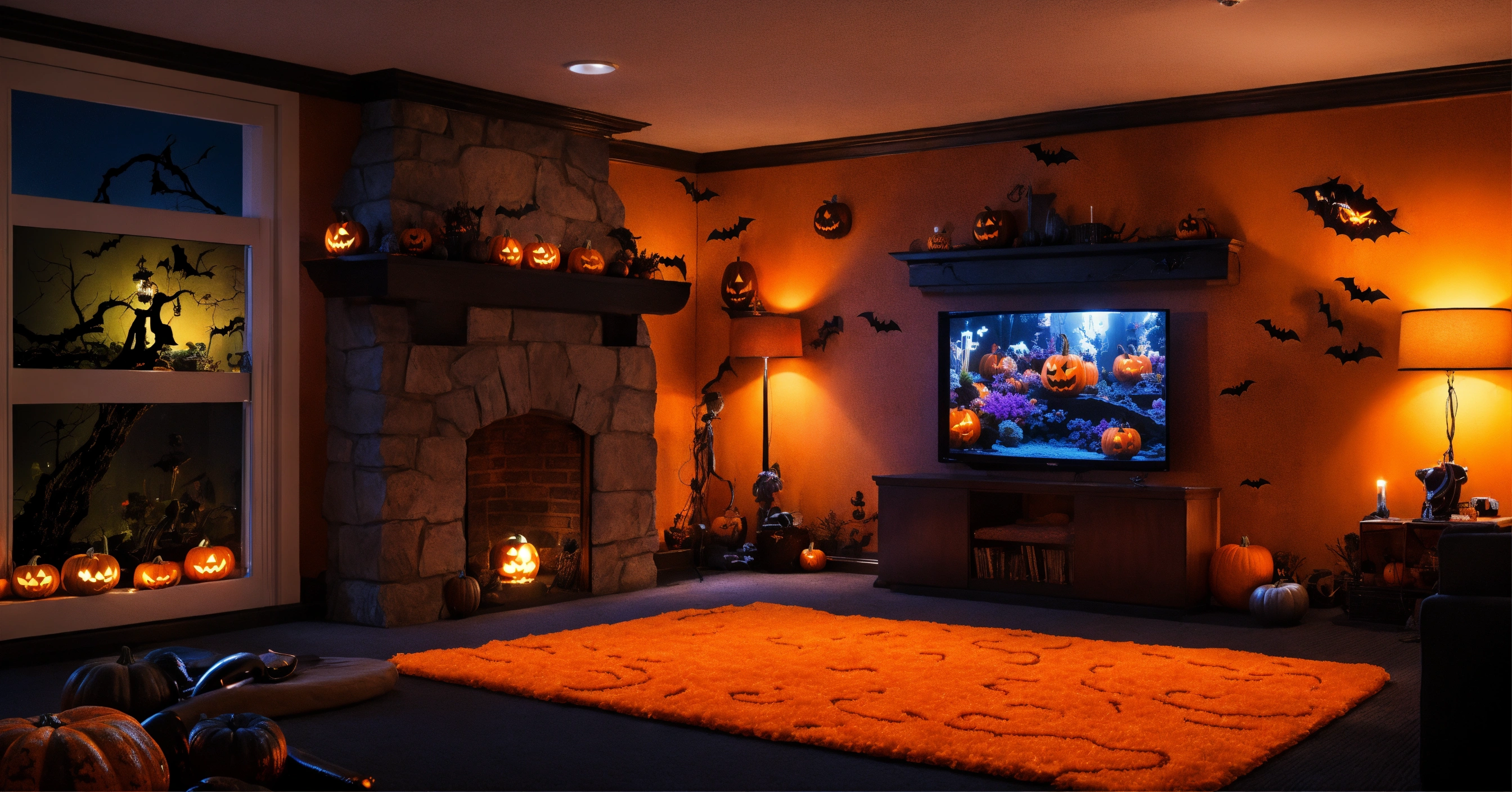 Living room, halloween theme, dark wood, orange fluffy halloween rug, wall mount tv, nightmare before christmas, halloween grafitti, night time dark, dark walls, night ceiling, orange black, creepy fish tank