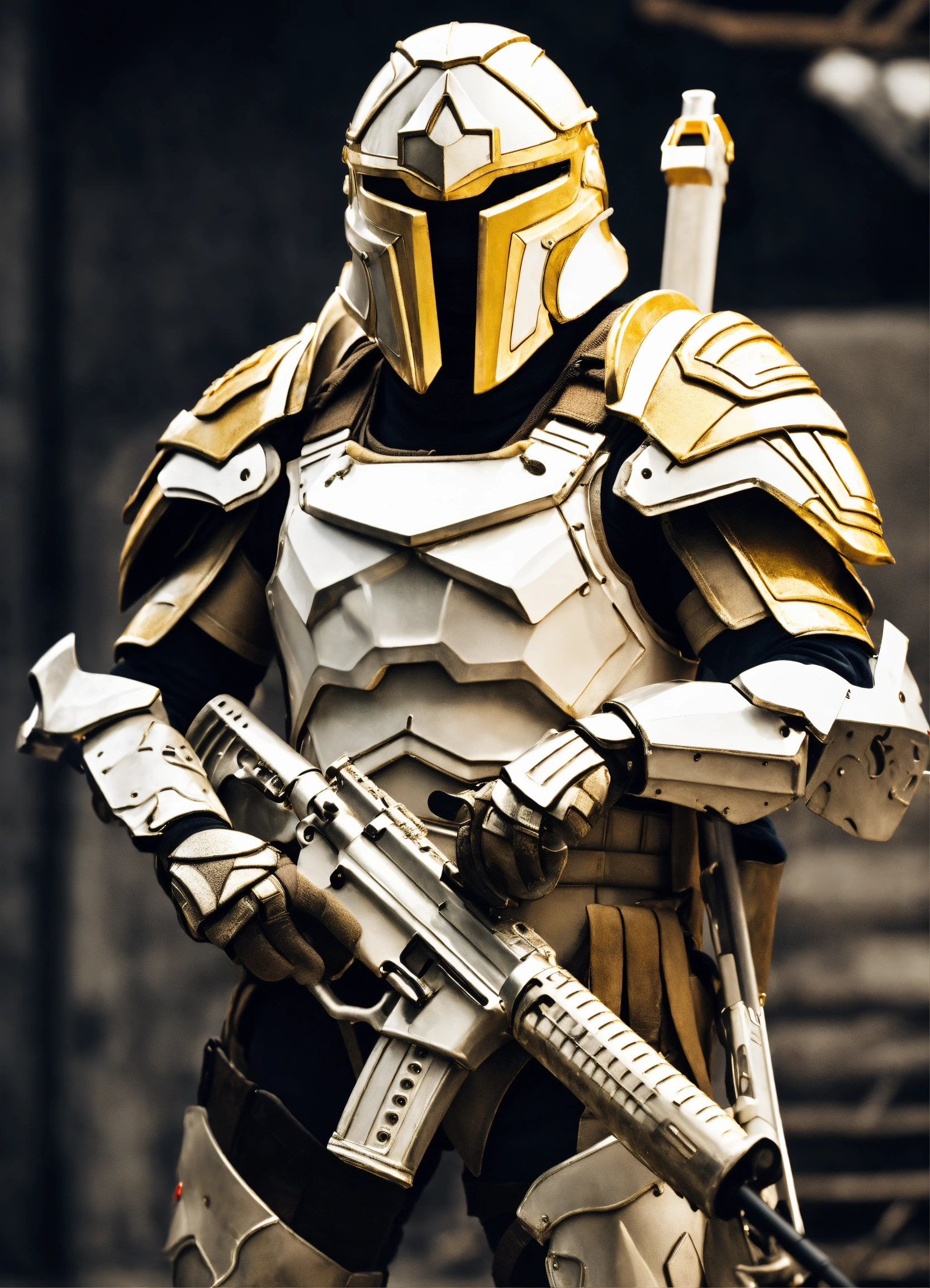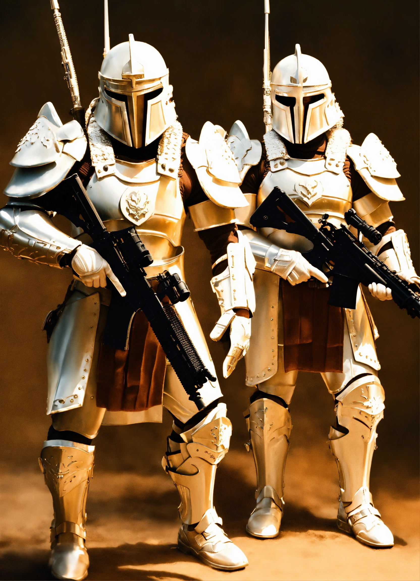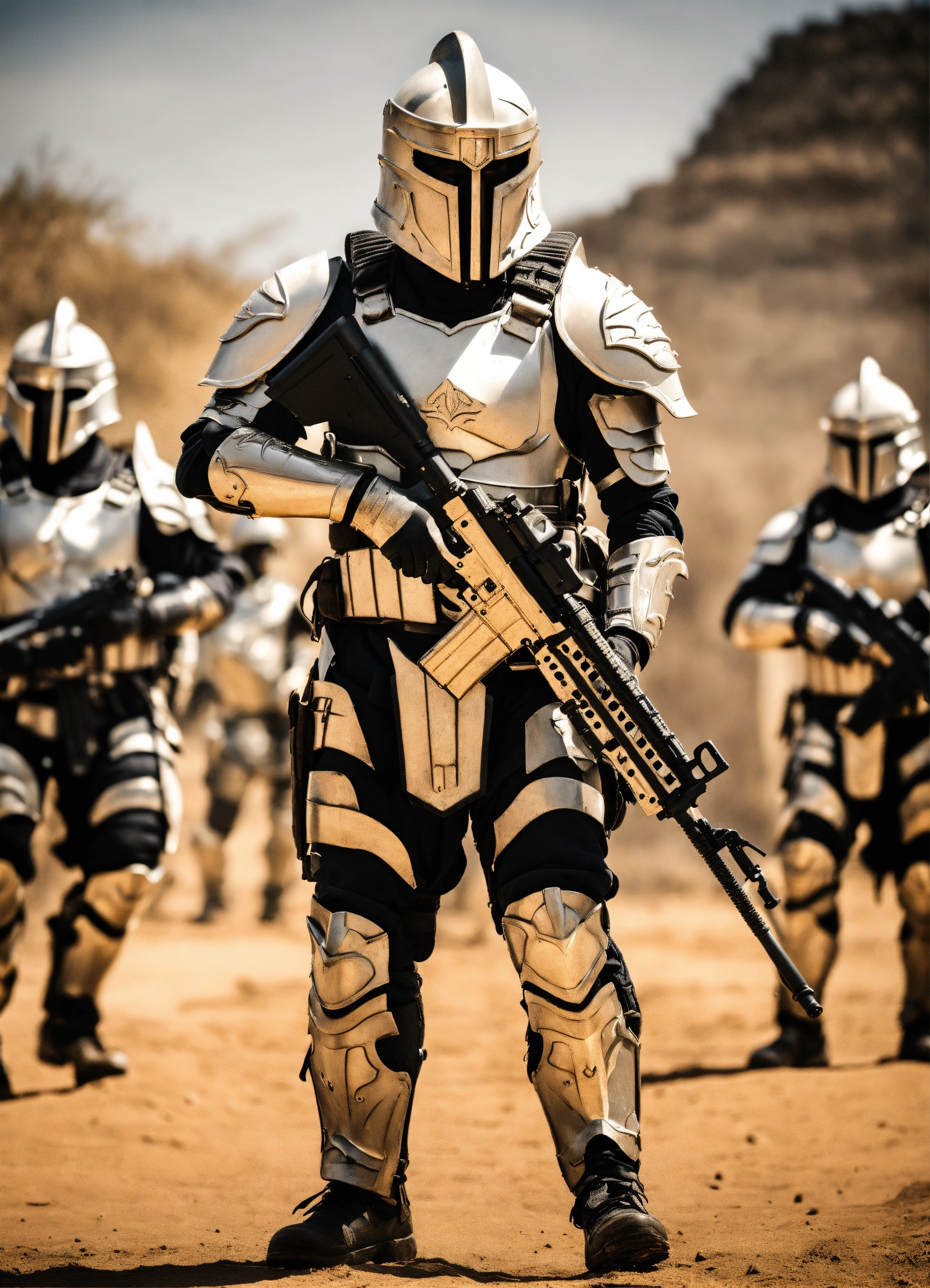 Post modern ancient spartan soldiers carrying assault rifles in white and armor
