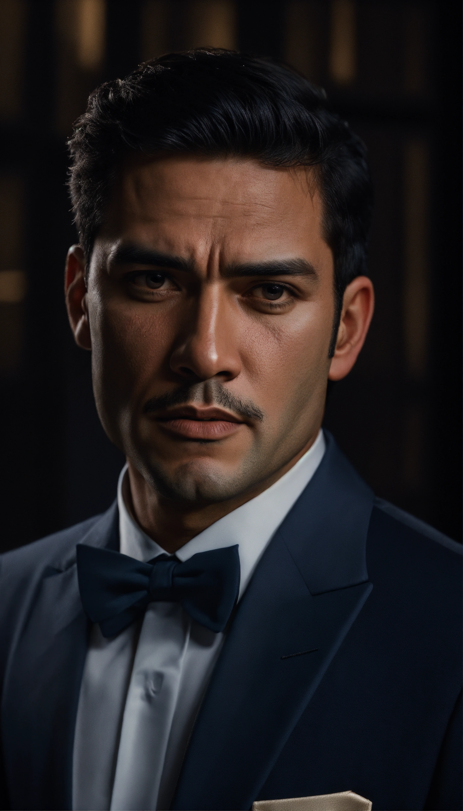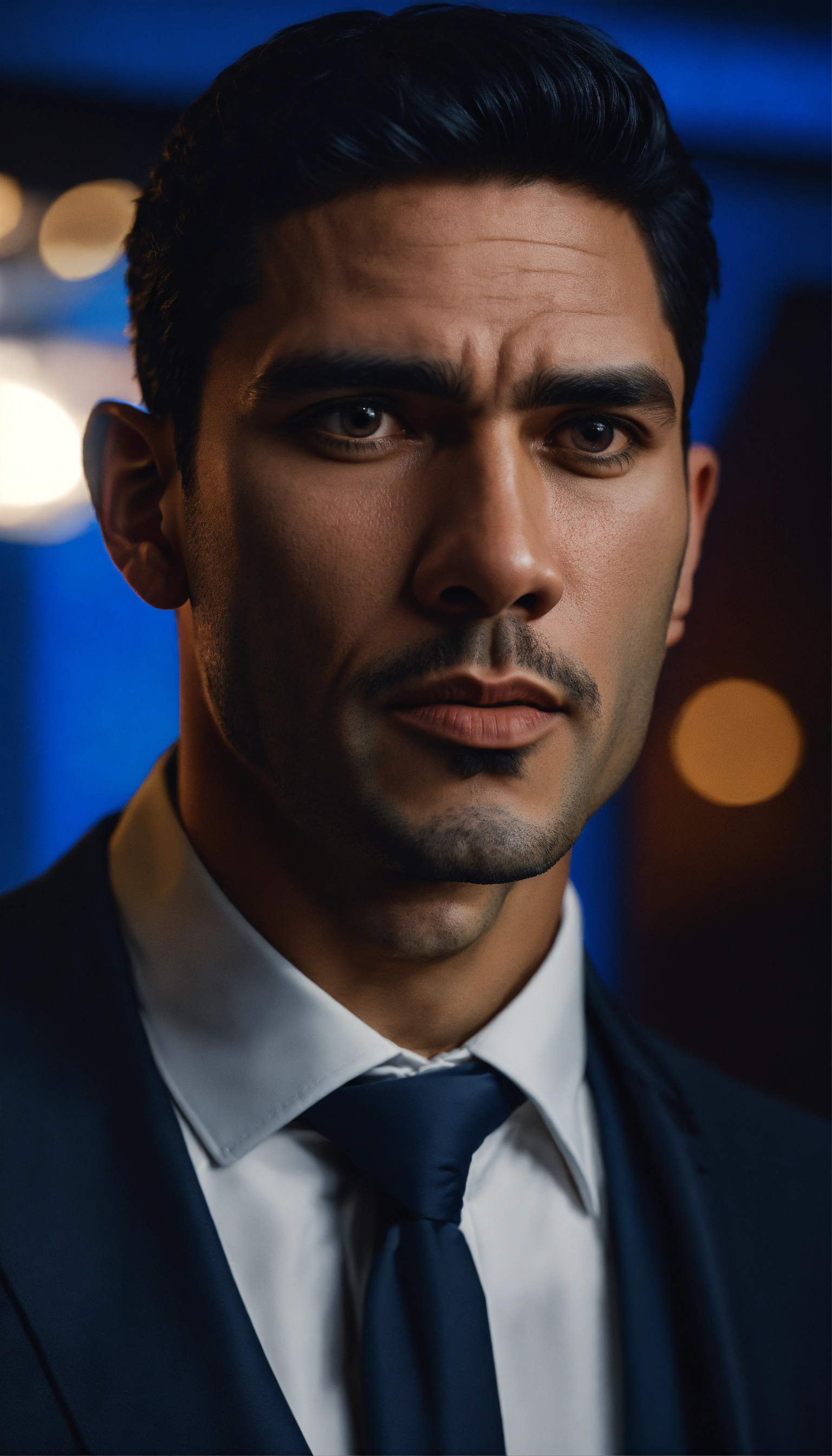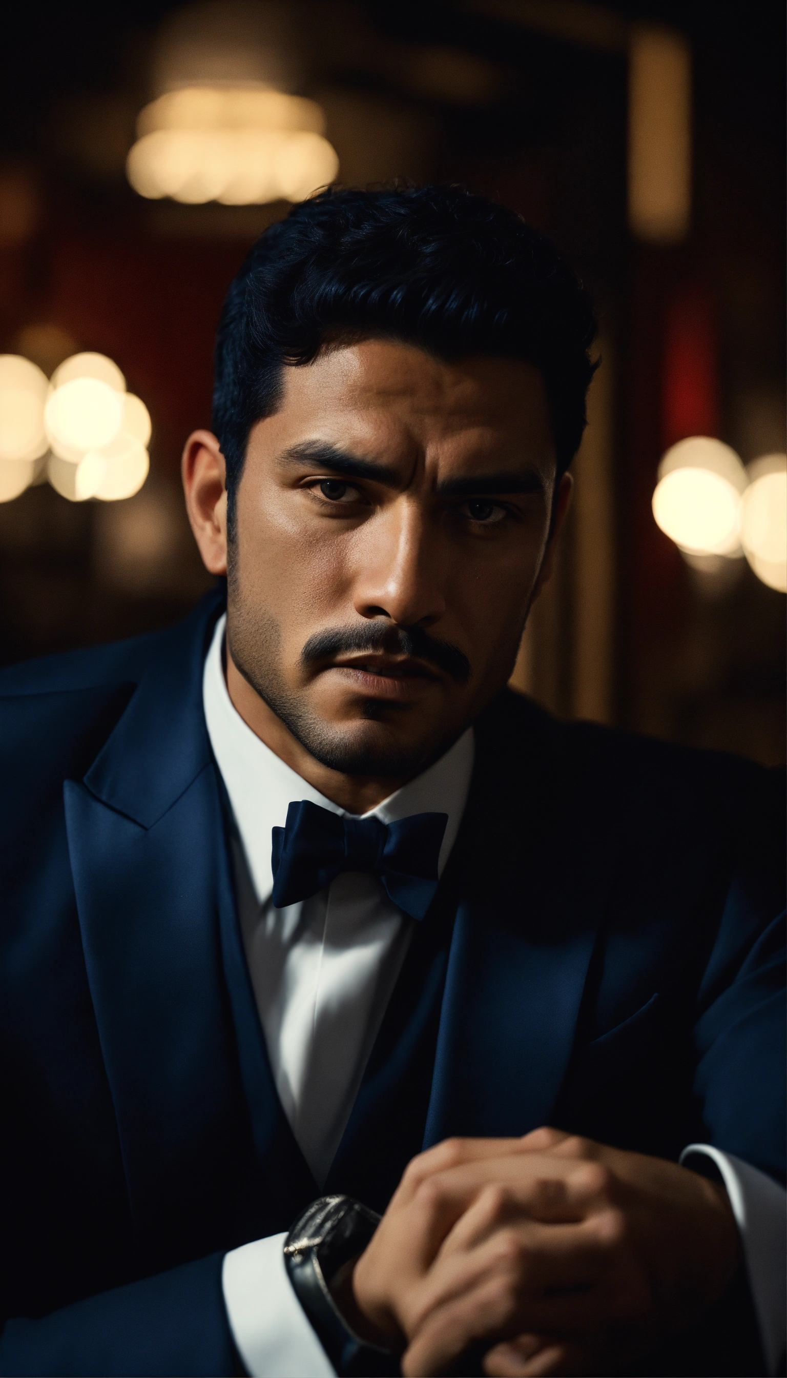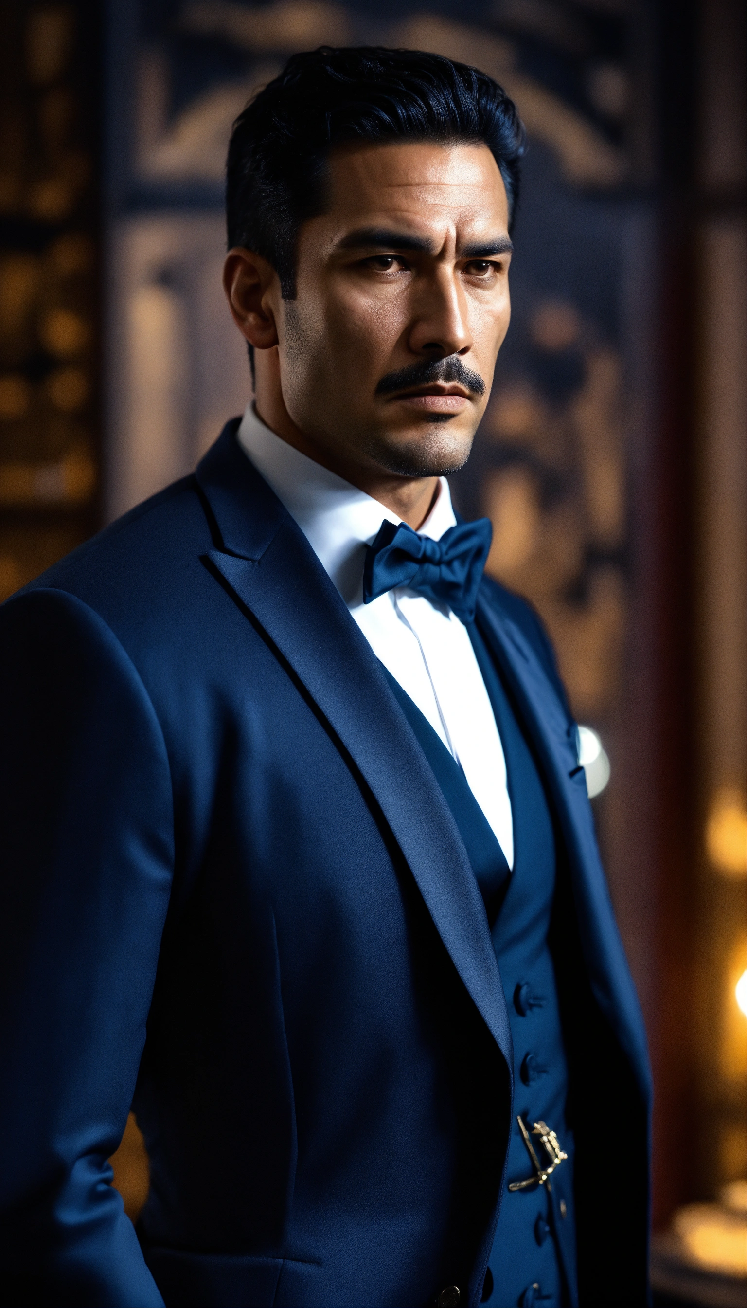 A detailed photograph of a solemn looking latino looking directly at the camera, standing straight, hands relaxed, square jaws, masculine face, wrinkles, buff looking, wearing a navy blue tuxedo, realistic skin texture, black background, sharp focus, front view, waist up shot, high contrast, strong backlighting, action film dark color lut, cinematic luts, 8k