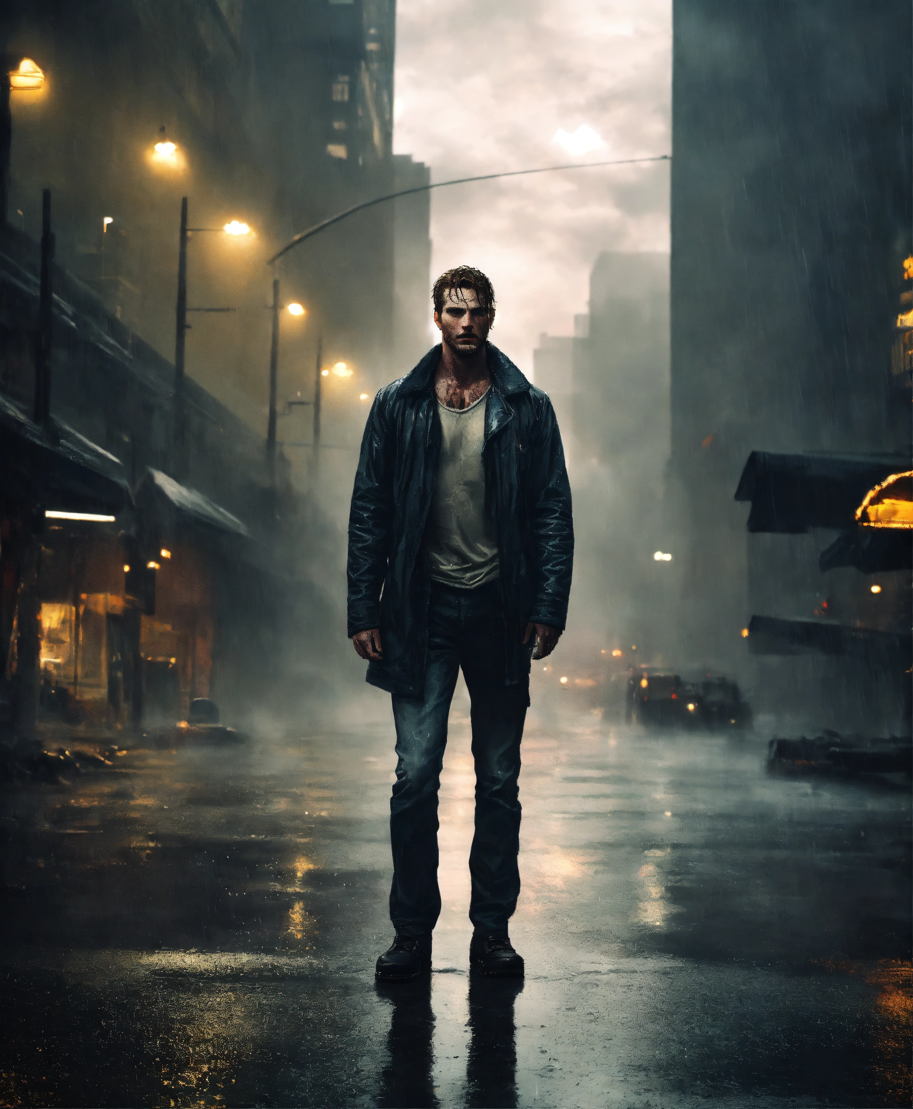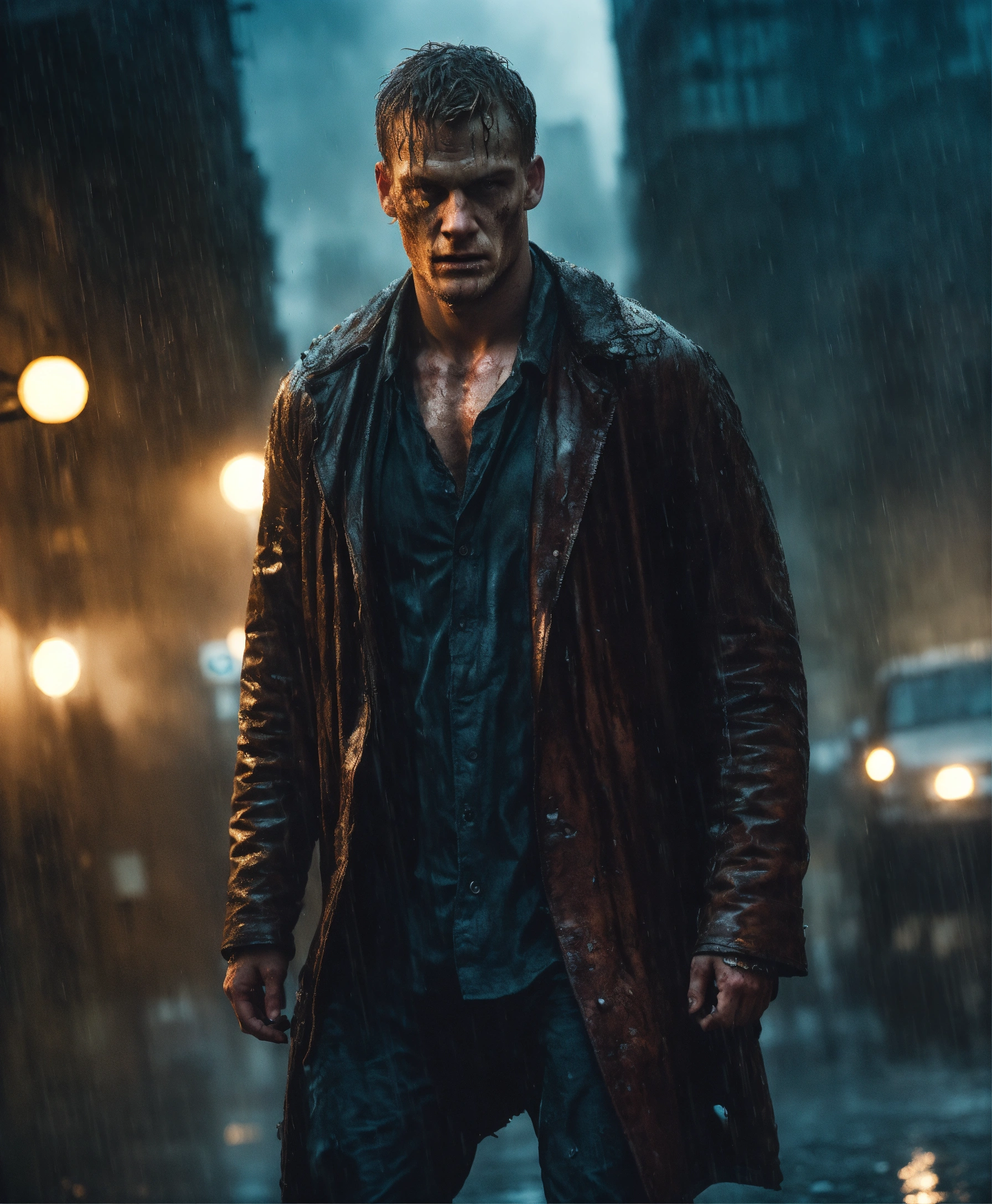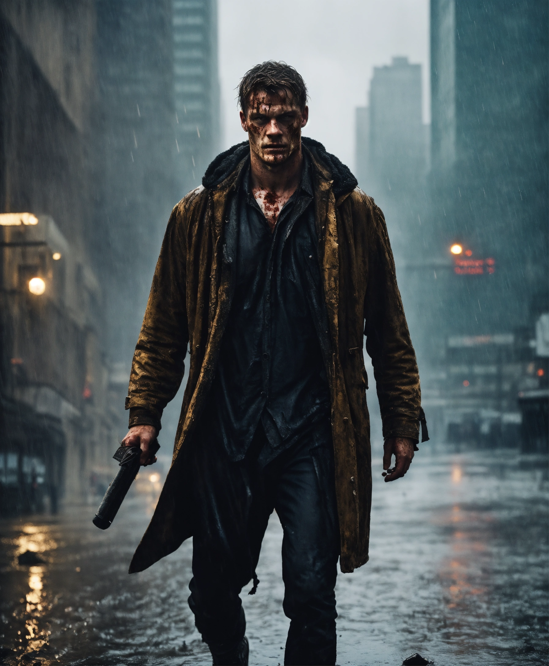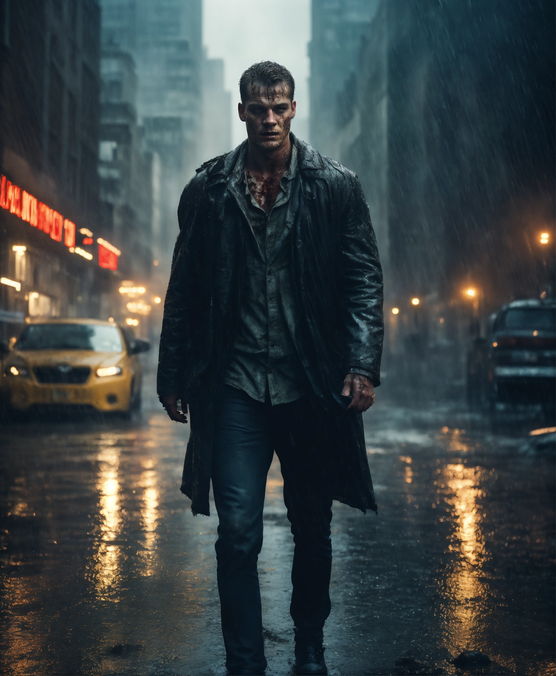 Beautiful tall strong man, kinnaman, apocalypse, dark, walk, city, white, light, cinematic, epic, rain, detailed, zombie, realistic photo face