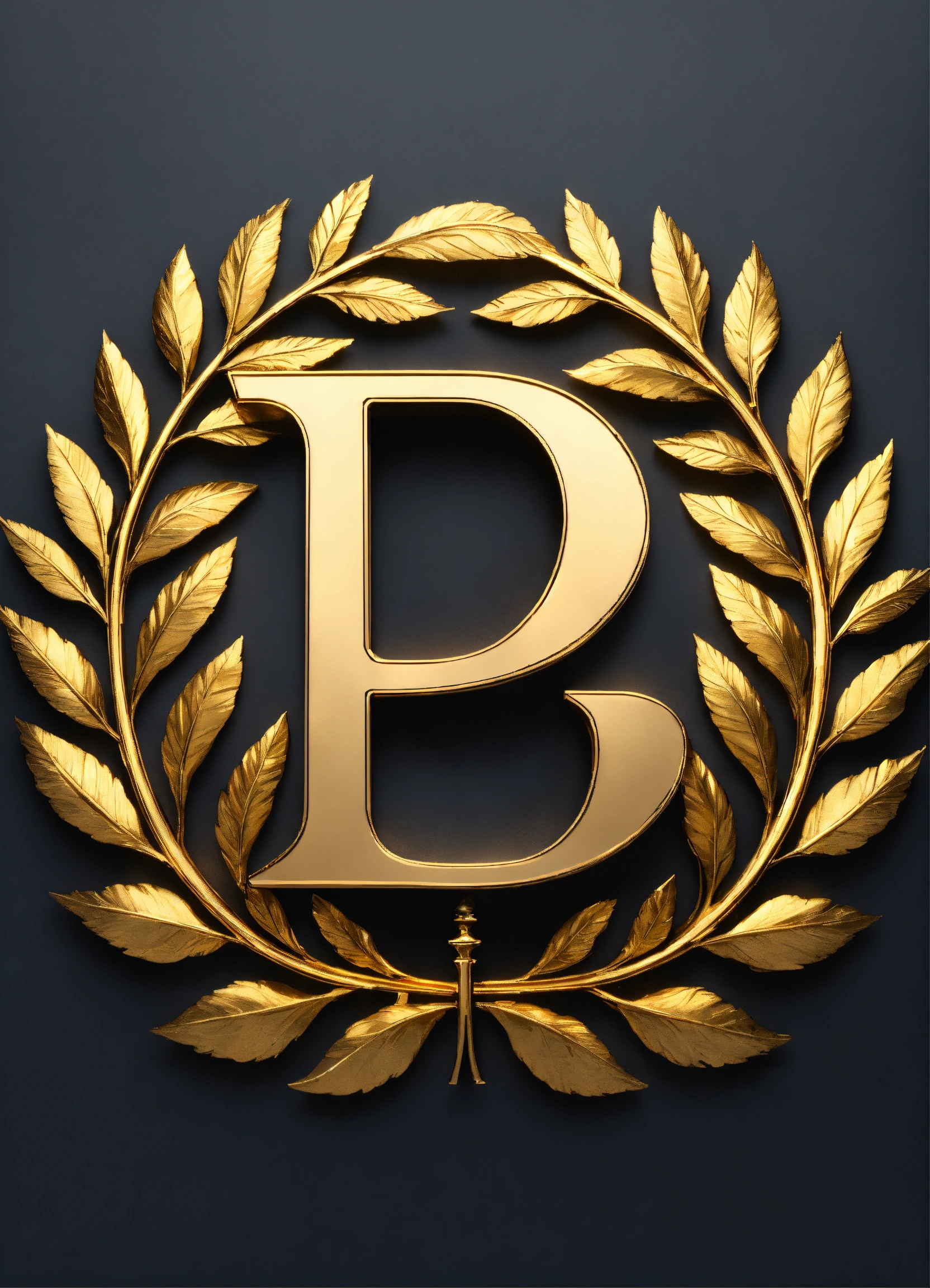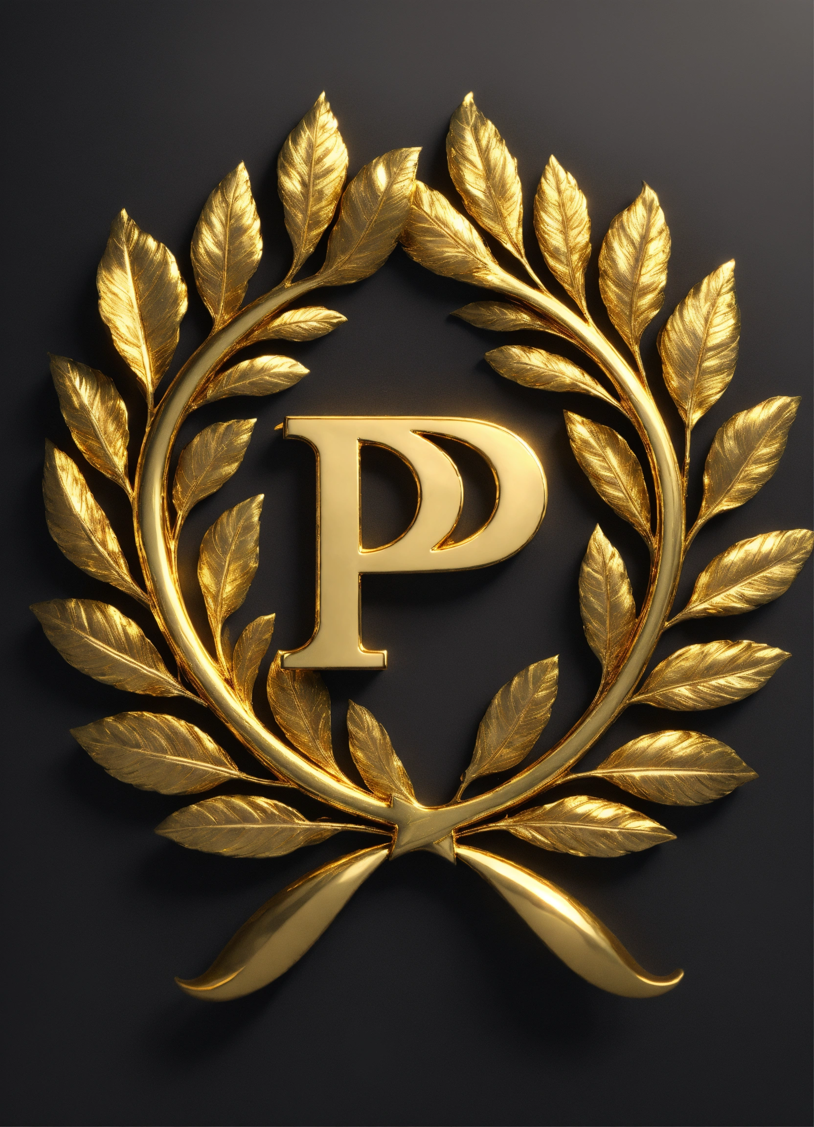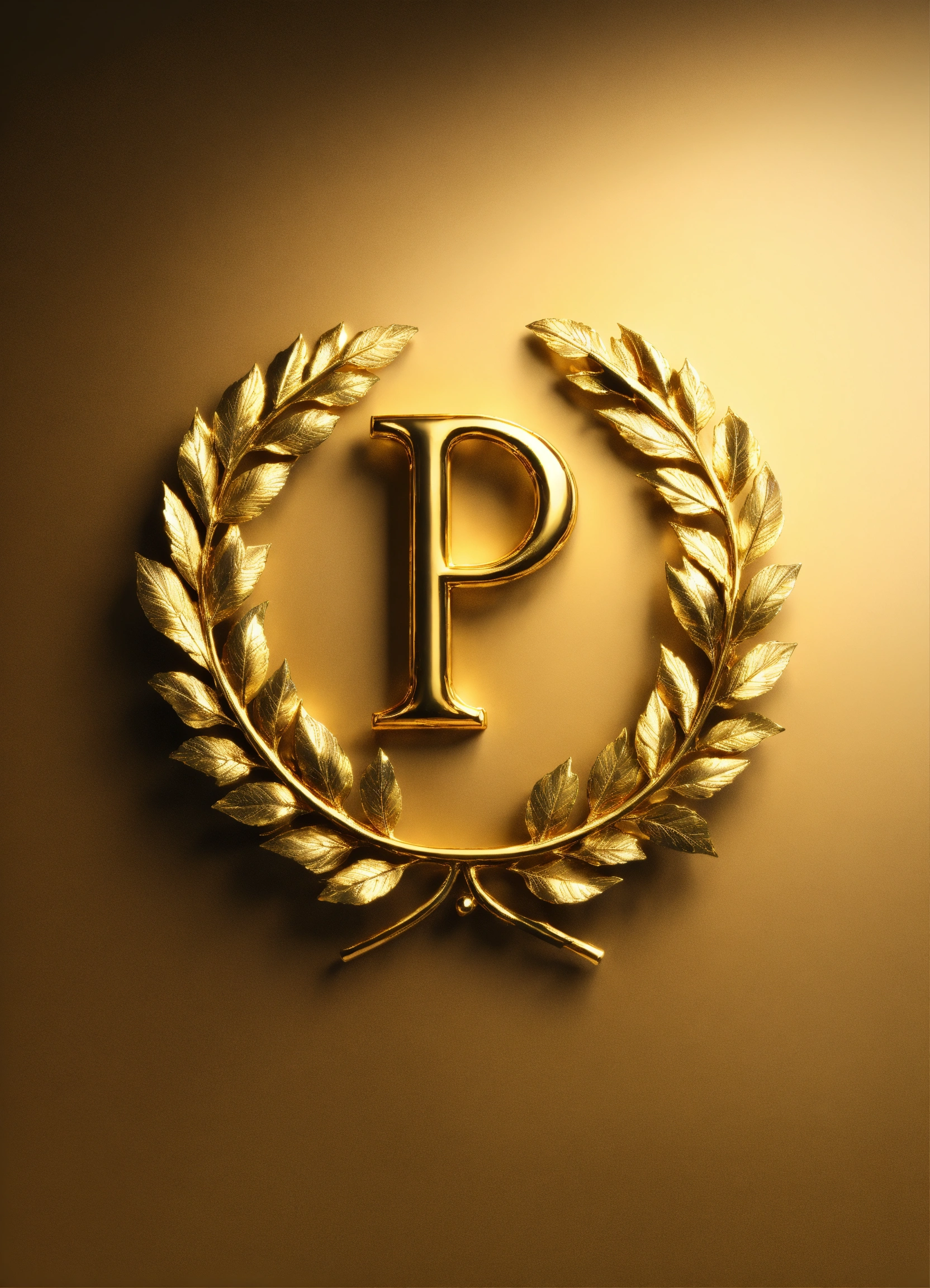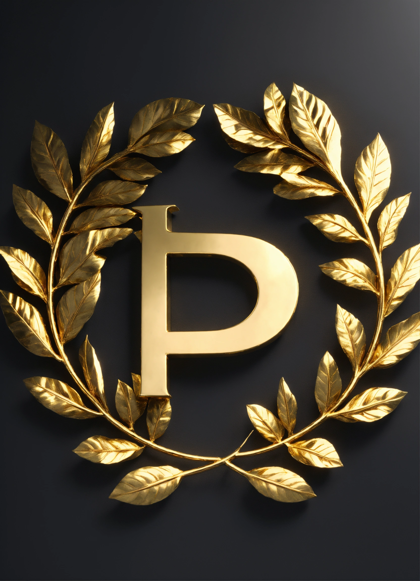 A simple symmetrical double crescent golden metal laurel wreath as a logo, lush laurel leaves, with a metallic gold letter p in the centre, full shot, 3d photo realistic, plain black background, unreal engine render, 8k