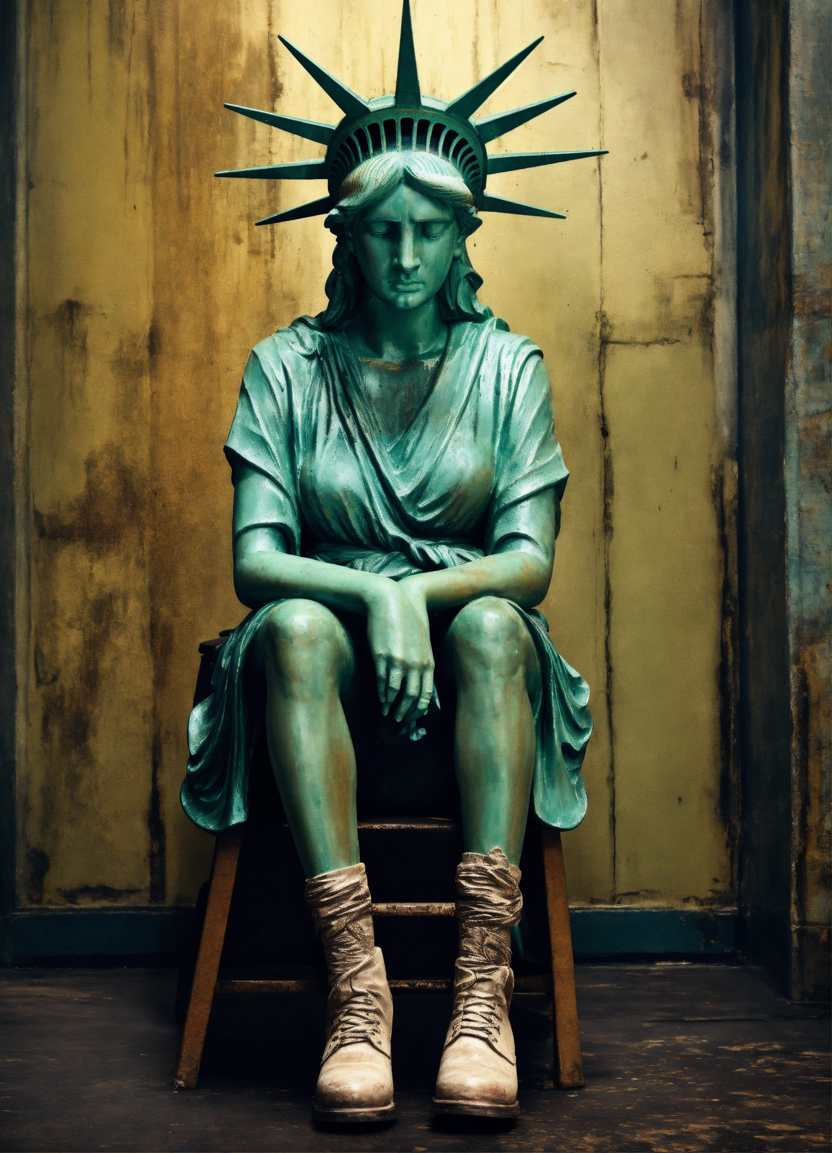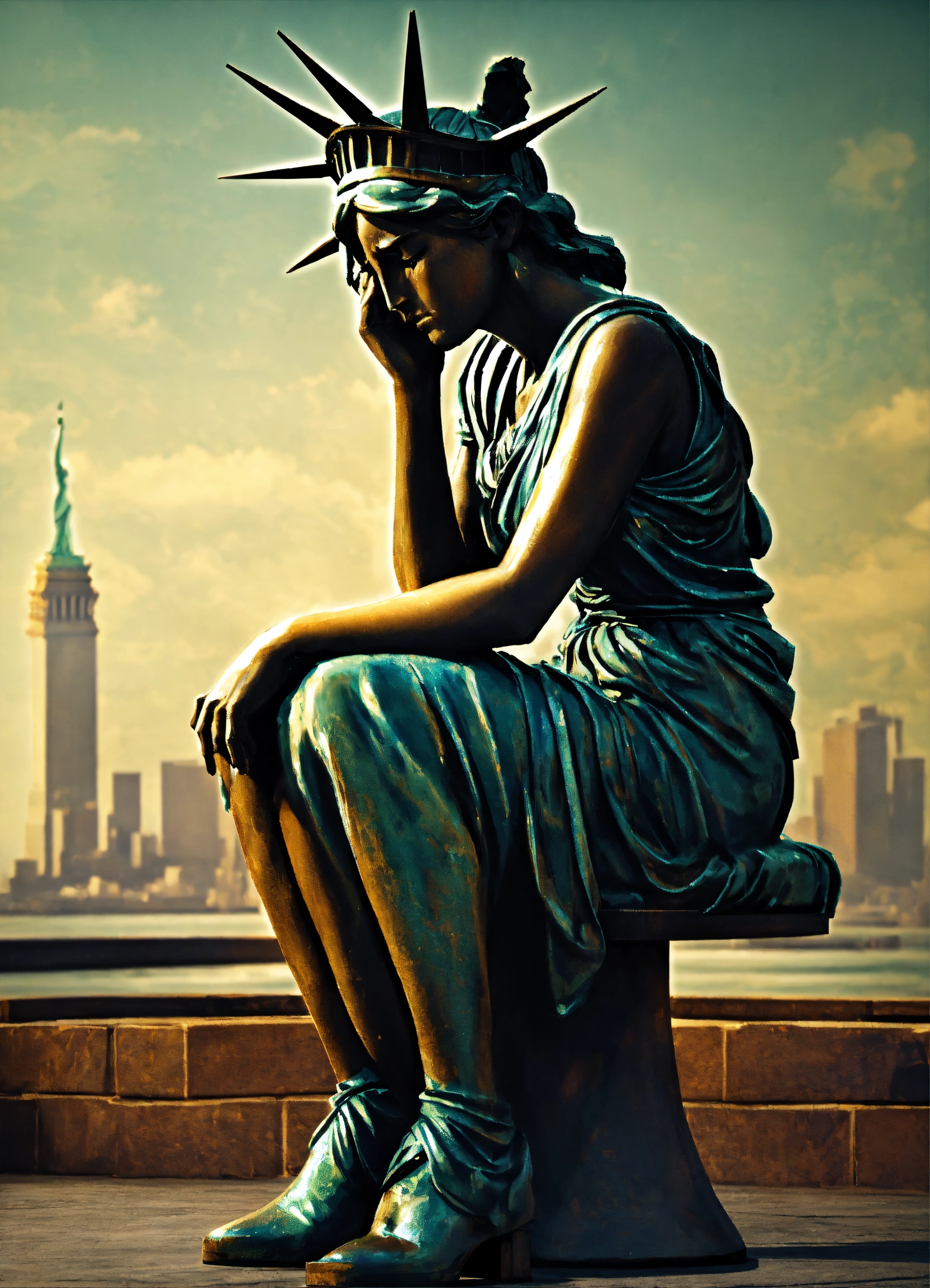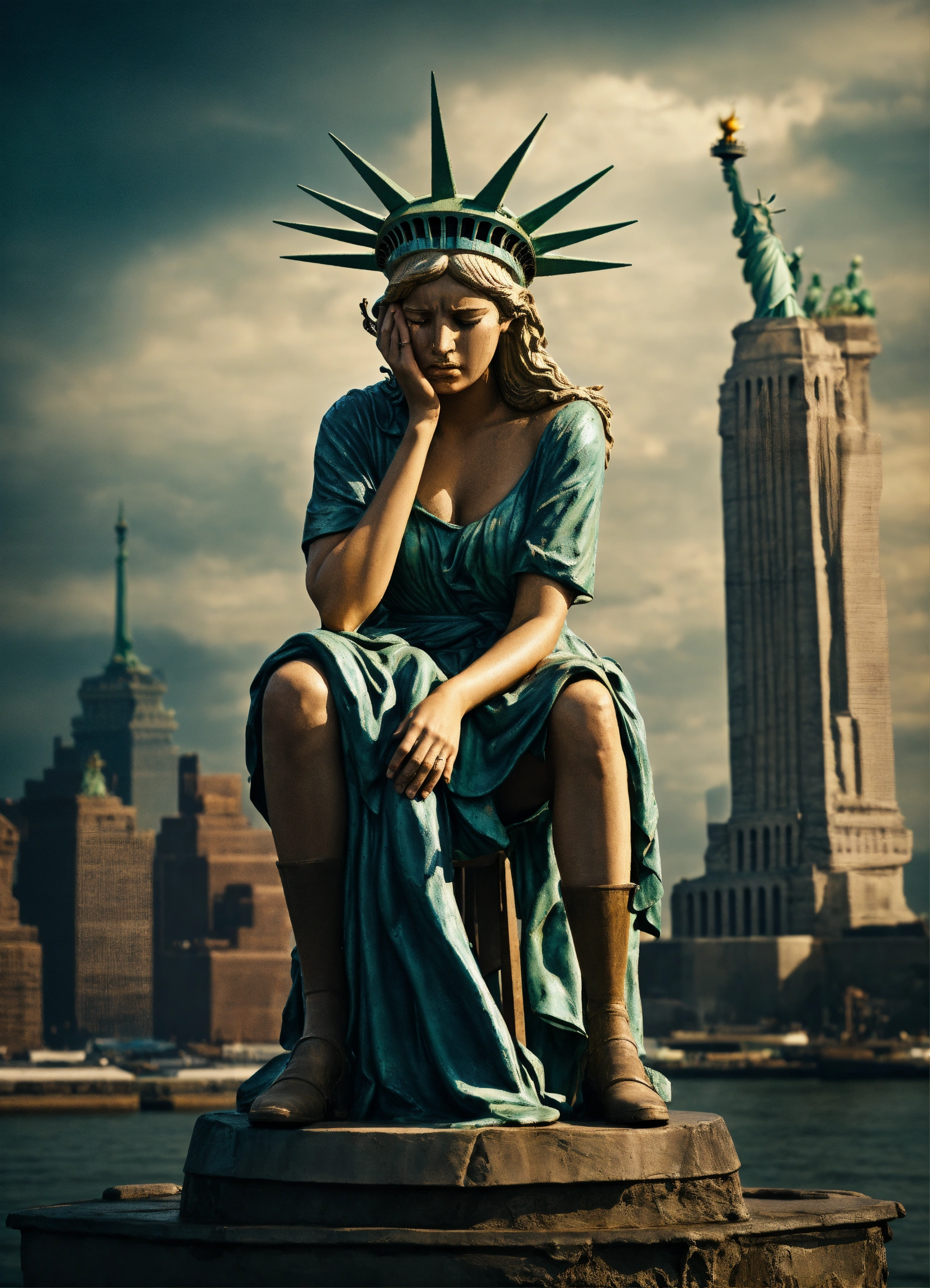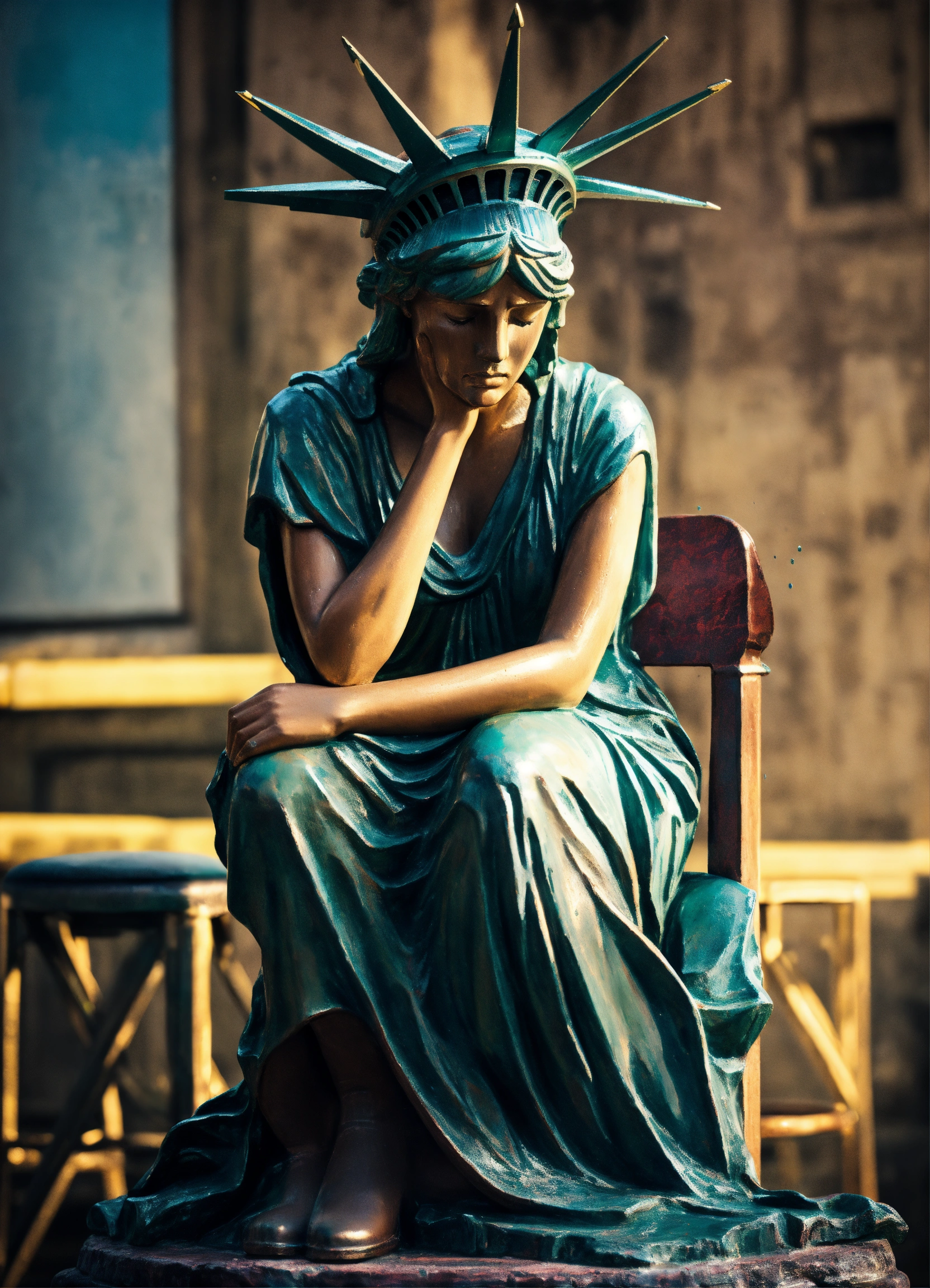 Image of the statue of liberty crying, sitting down on a stool, image from the waist up, with her hand covering her entire face, a look of disappointment, sadness, 4k render, hyperrealistic, grunge, surreal
