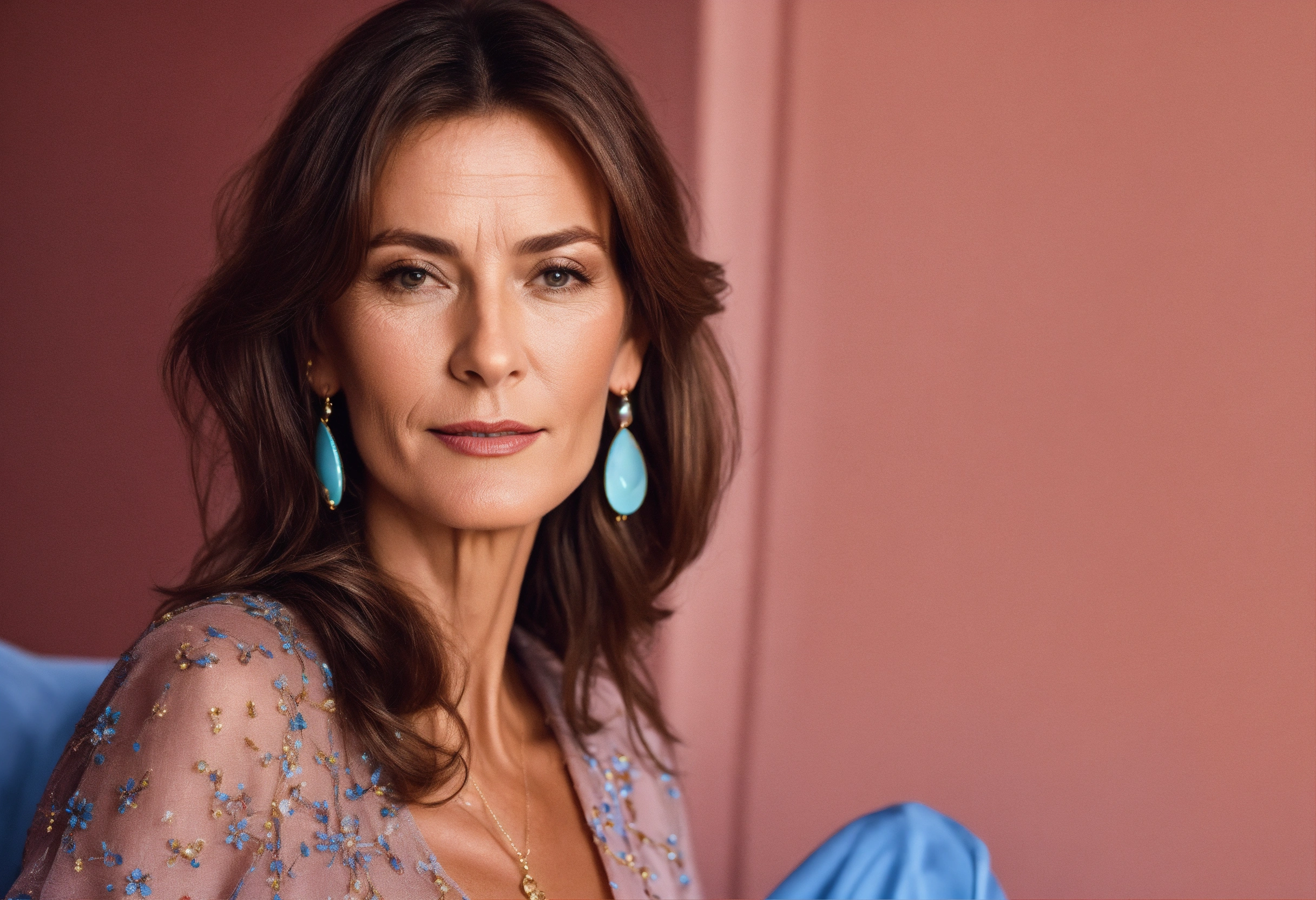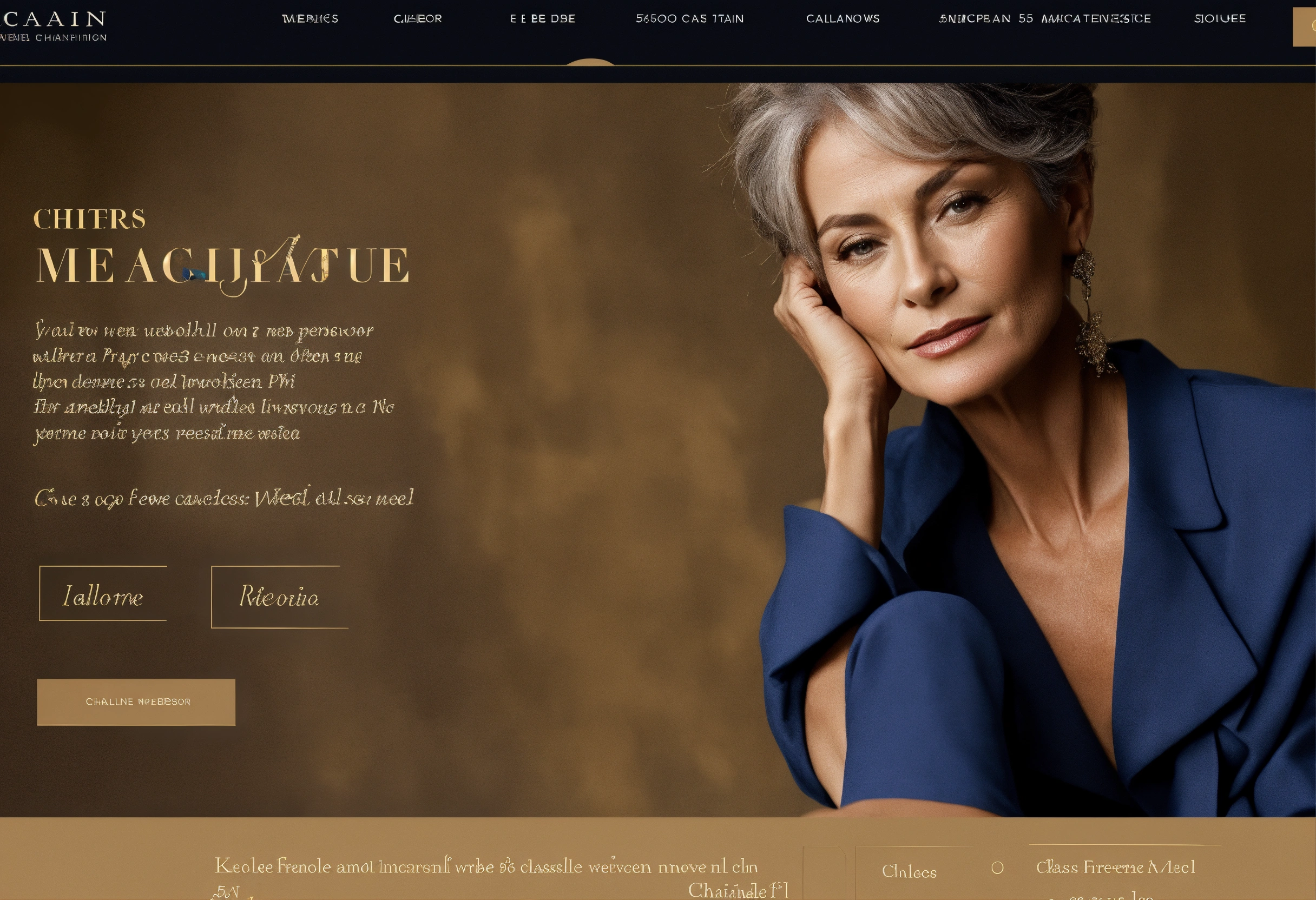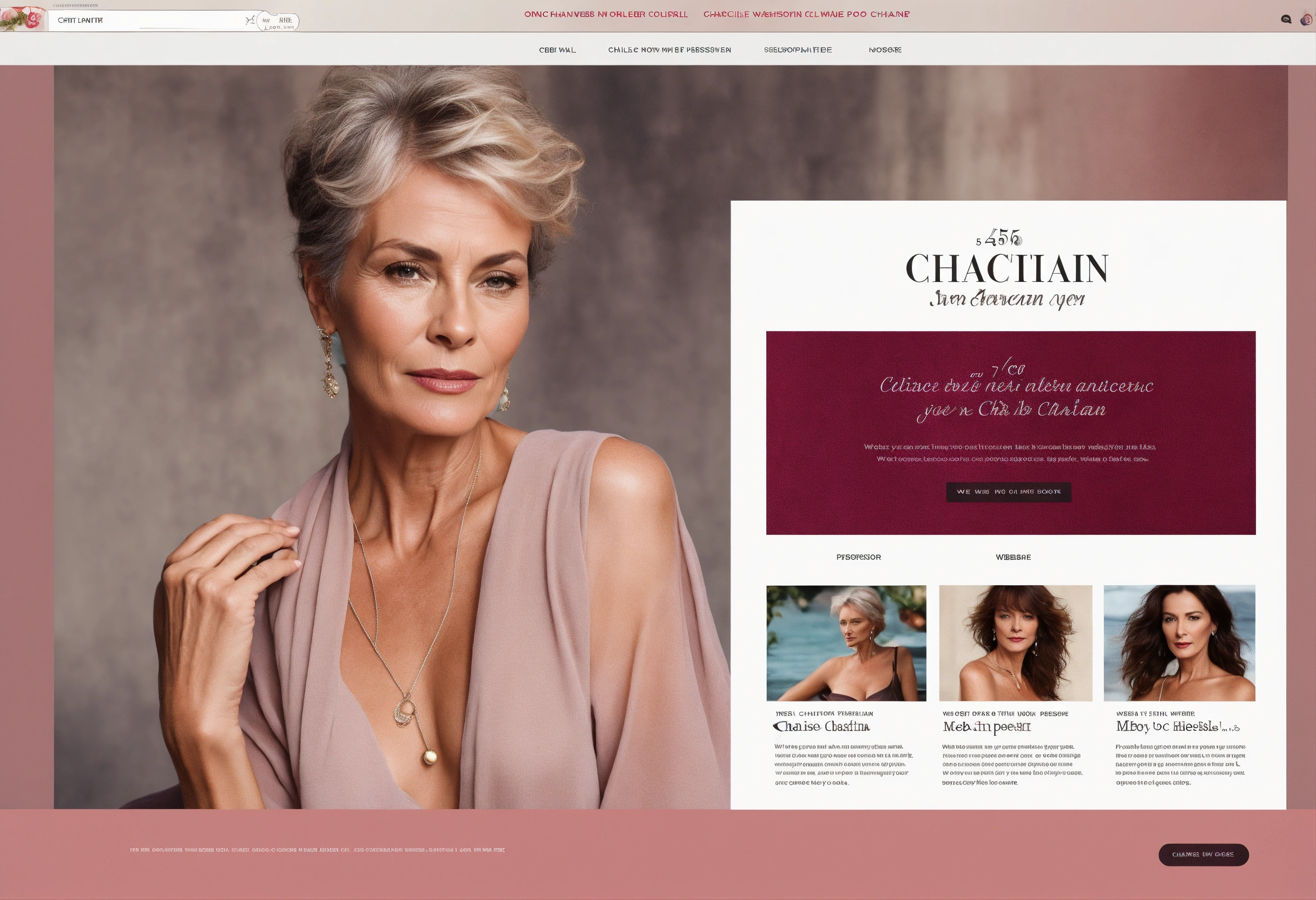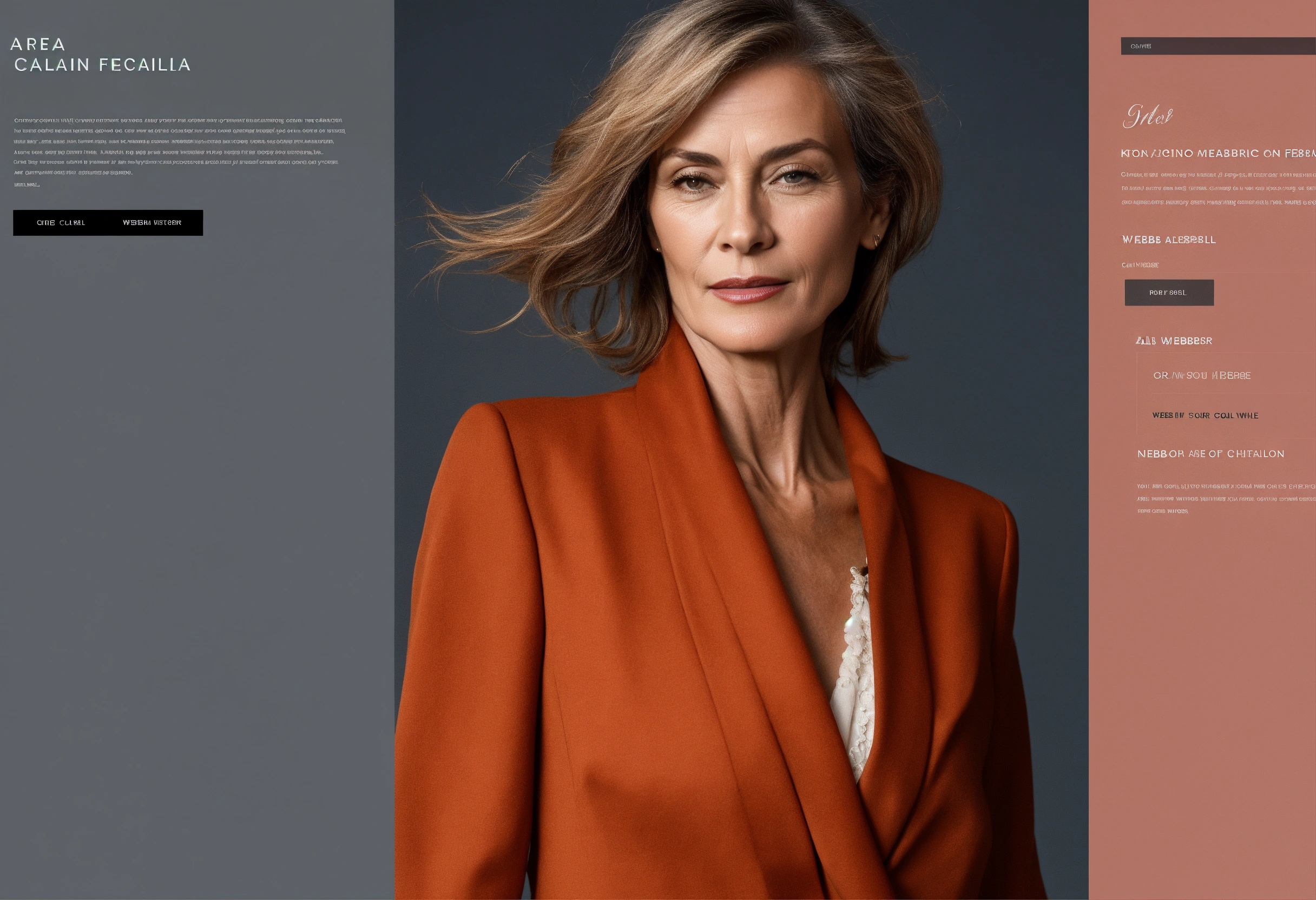 Website template, online portfolio in colors, with very classy 55 year old french actress chatain fashion model, web design model representation