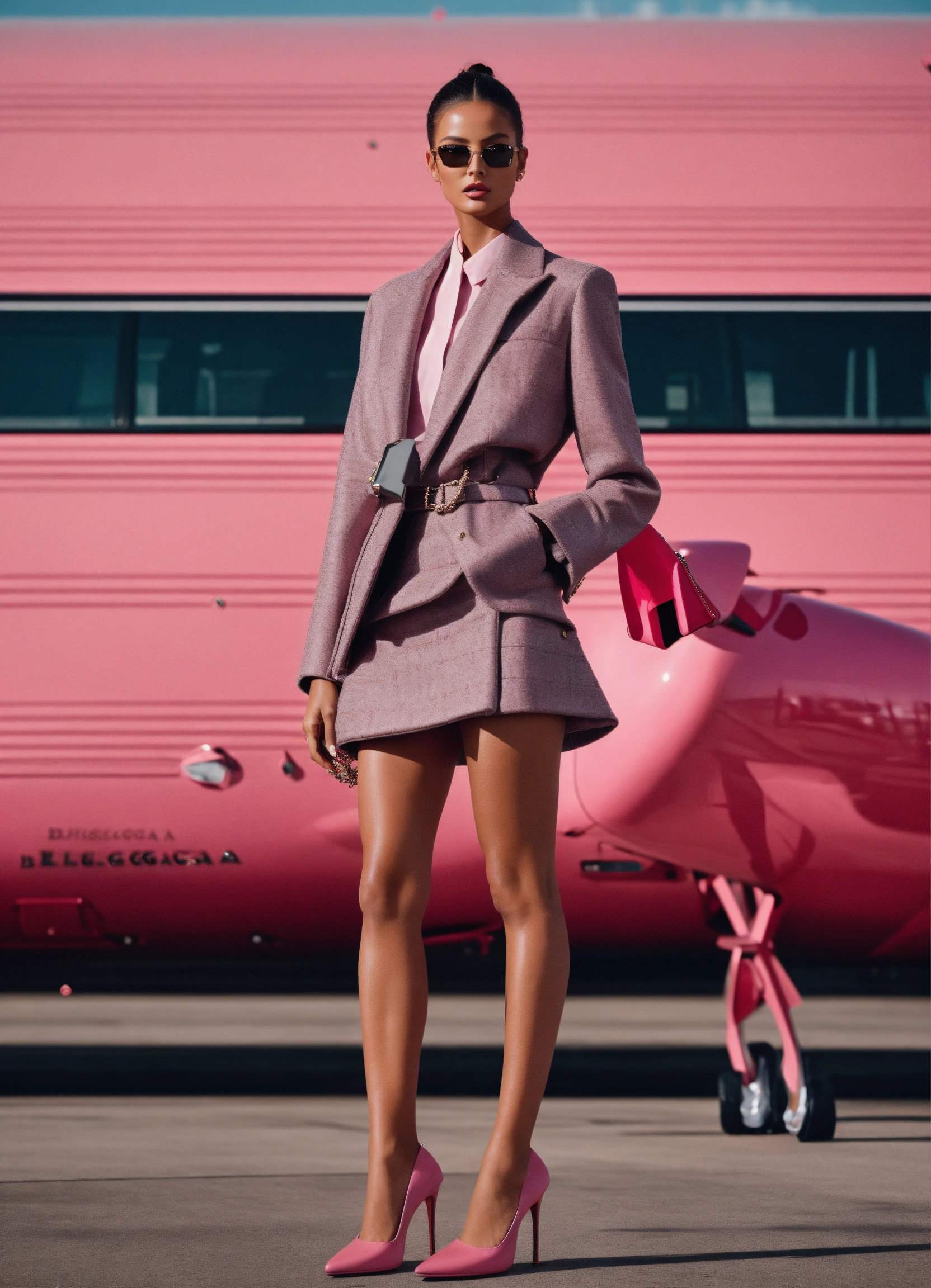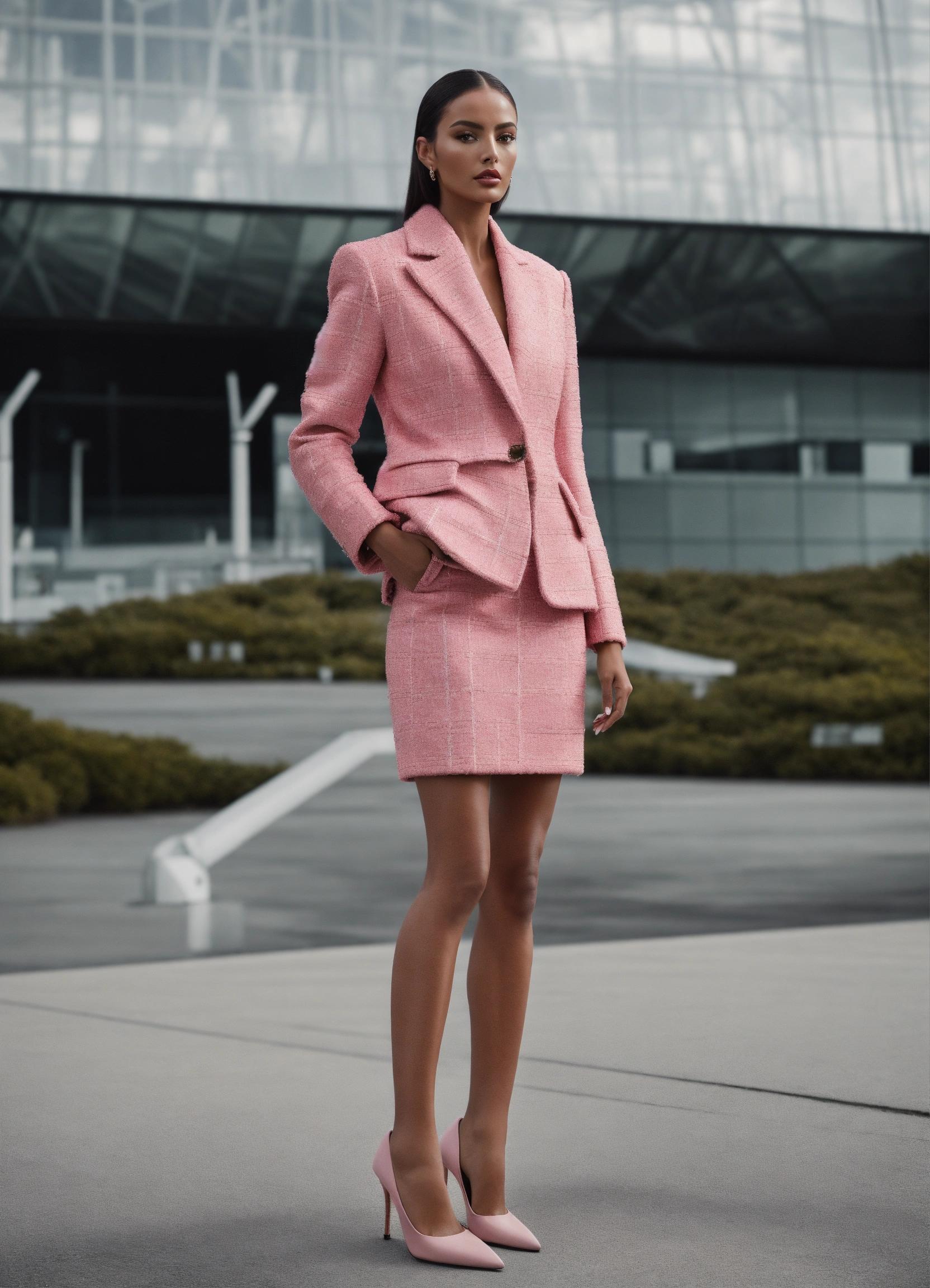 Create a visually stunning scene balenciaga inspired photoshoot featuring a tanned supermodel in structured jacket and mini skirt tweed set in colour pink, stilettos, iso 400, surrealistic, 8k, full frame, gray airport inspired background