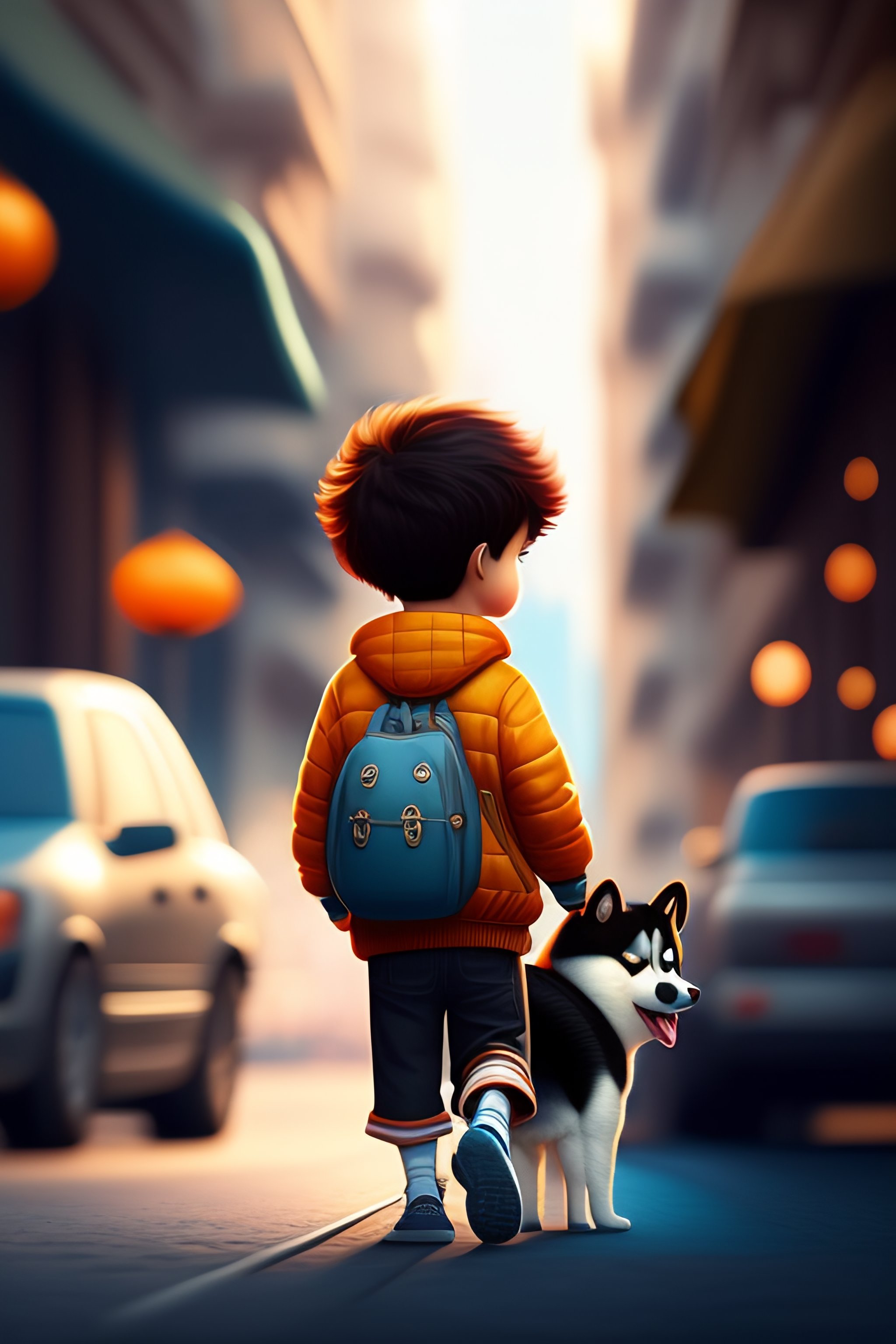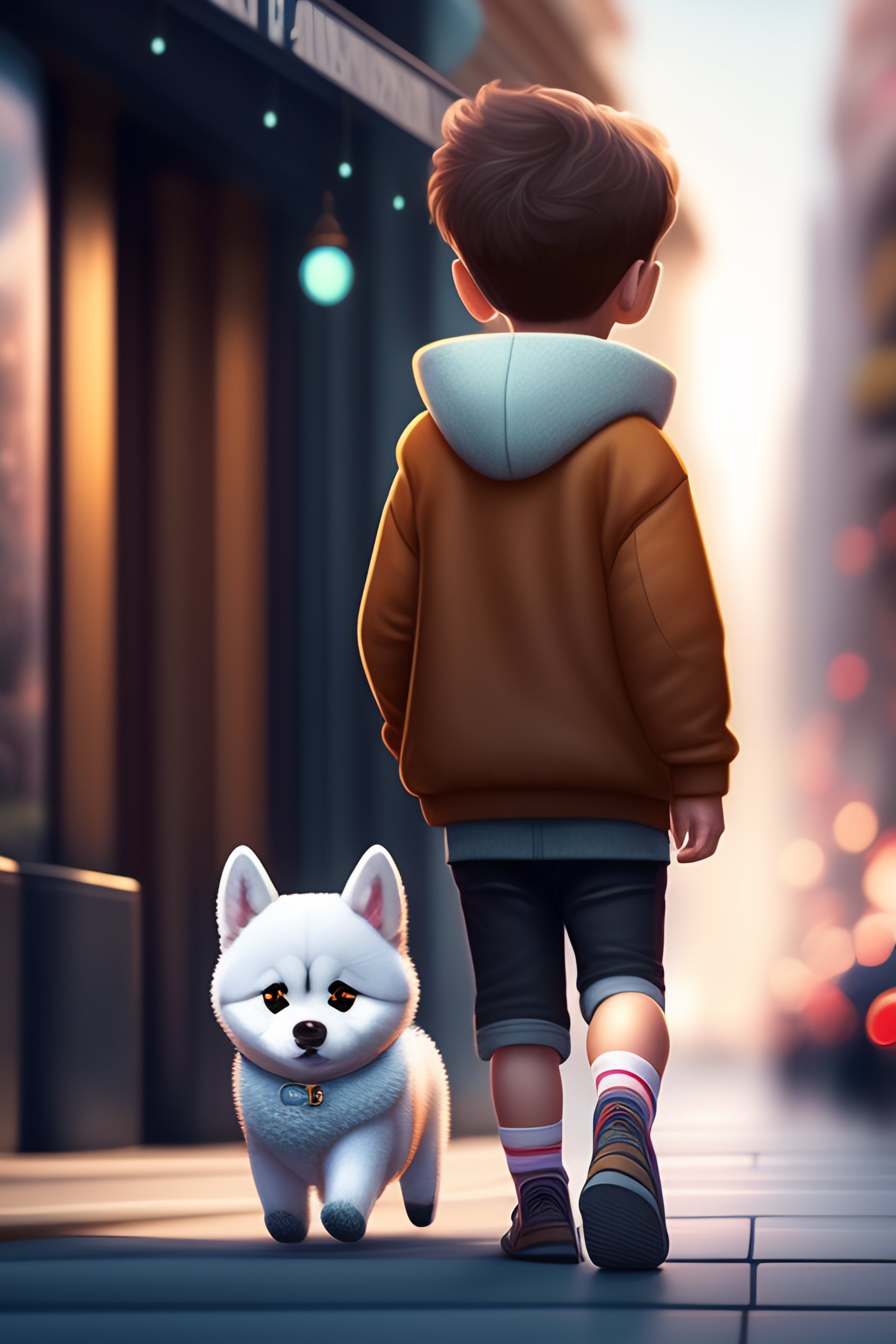 Boy in pixar style walking in the city with a cute and adorable cartoon fluffy akita inu, fantasy, dreamlike, surrealism, super cute, trending on artstation