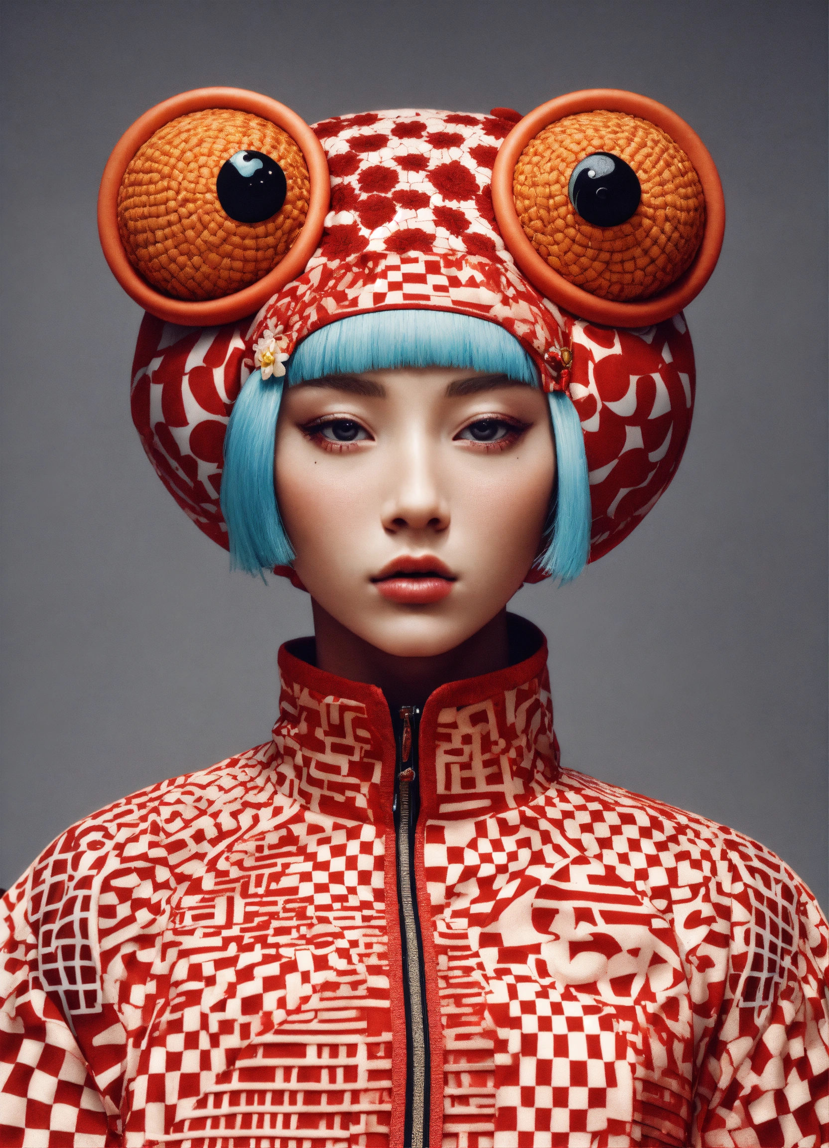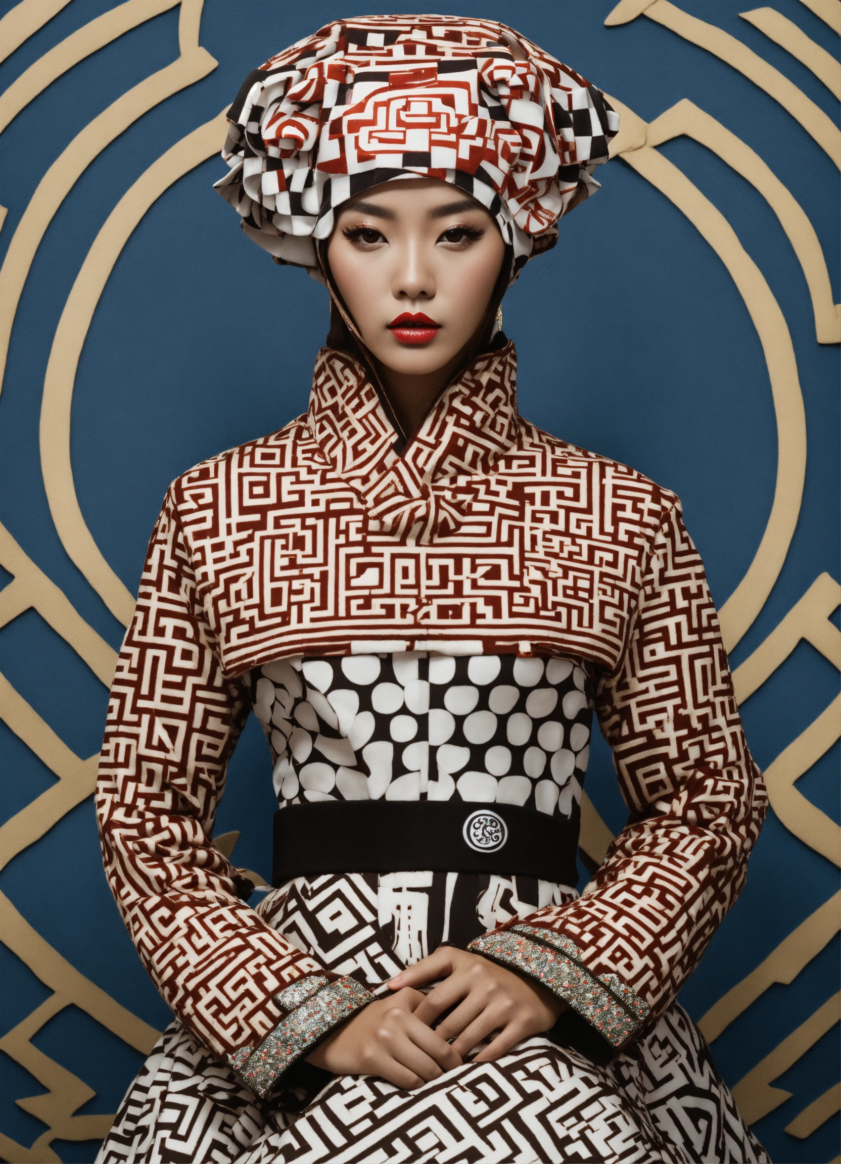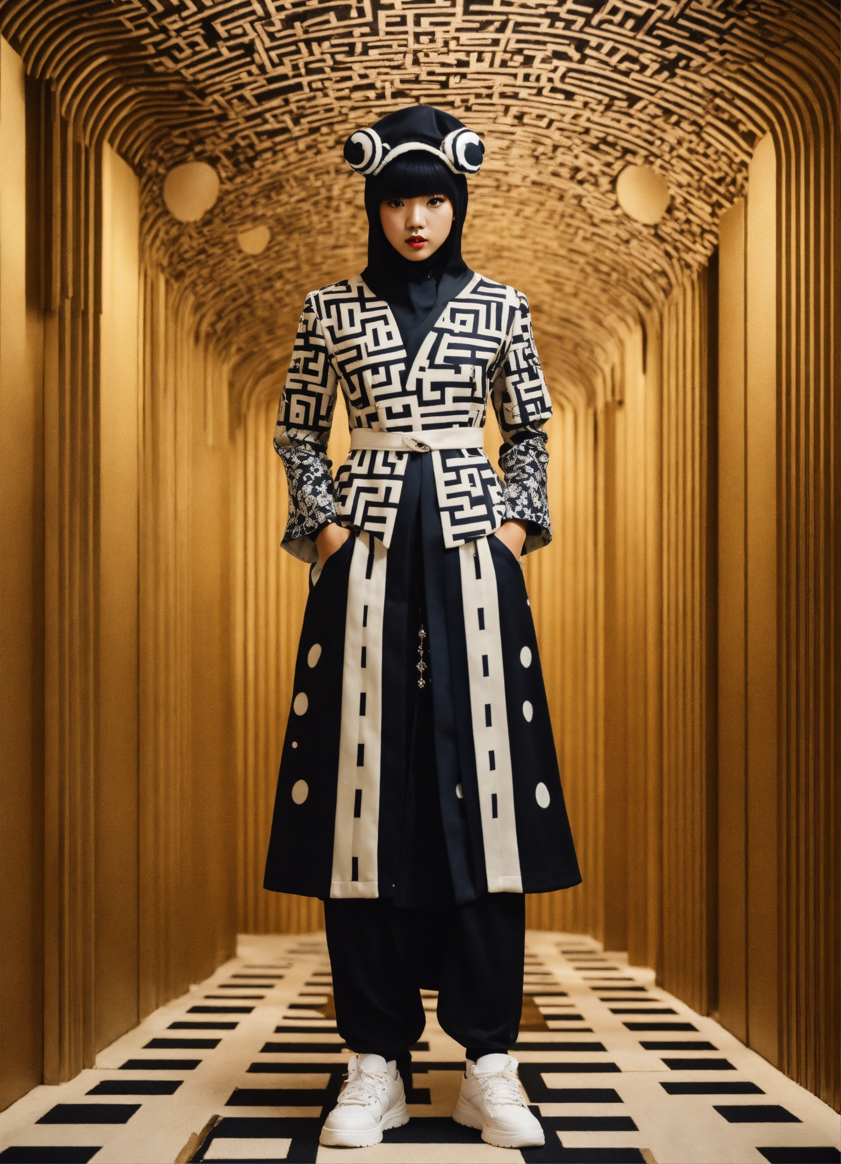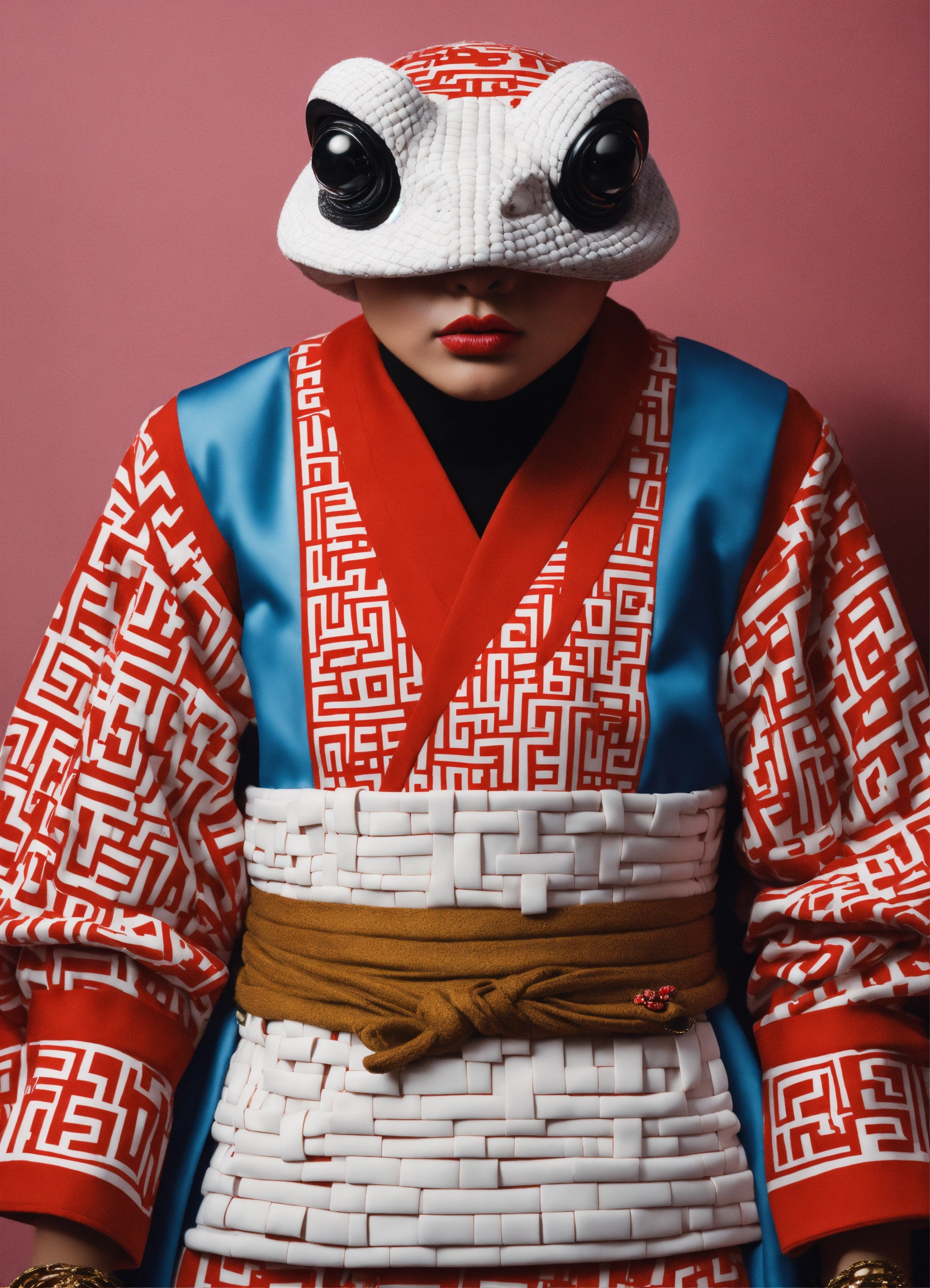 Photorealistic fashion full body portrait toad made out of 3d optical illusion ying yang maze haute couture street wear, kawaii ninja in folk costume in a fashion magazine