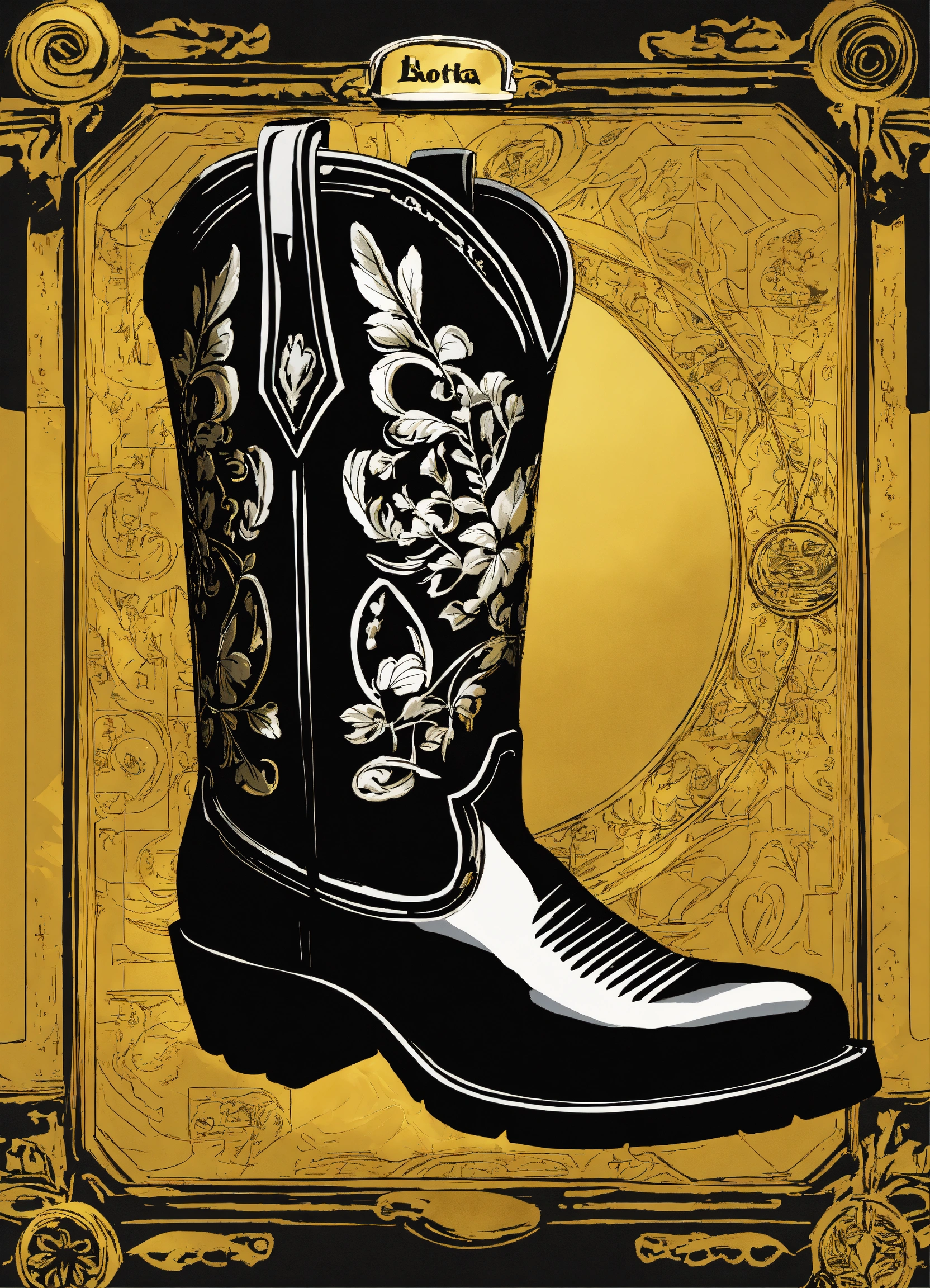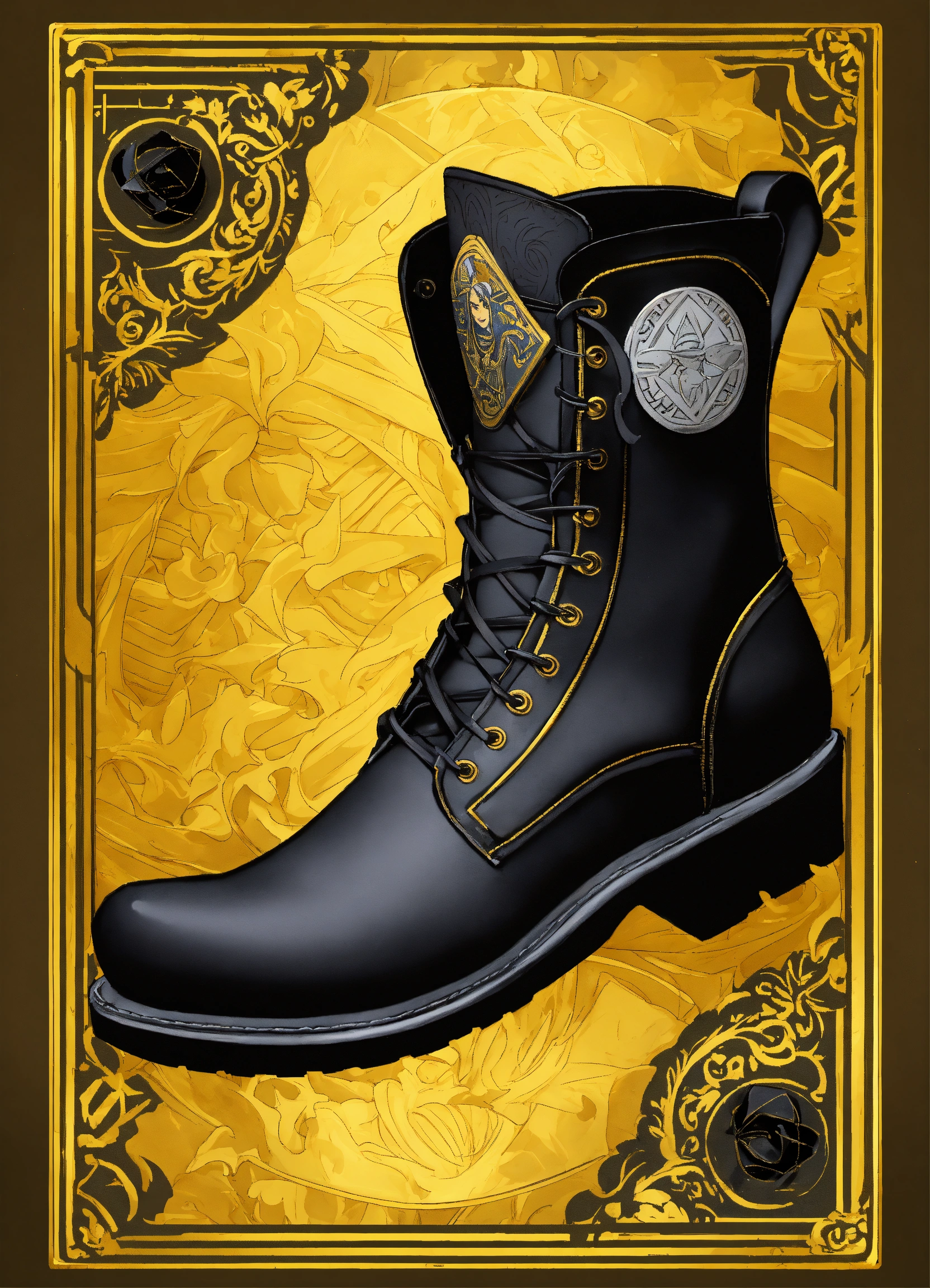A black boot, based on the card "la bota" of the mexican lottery deck in anime style. gold background card styled.