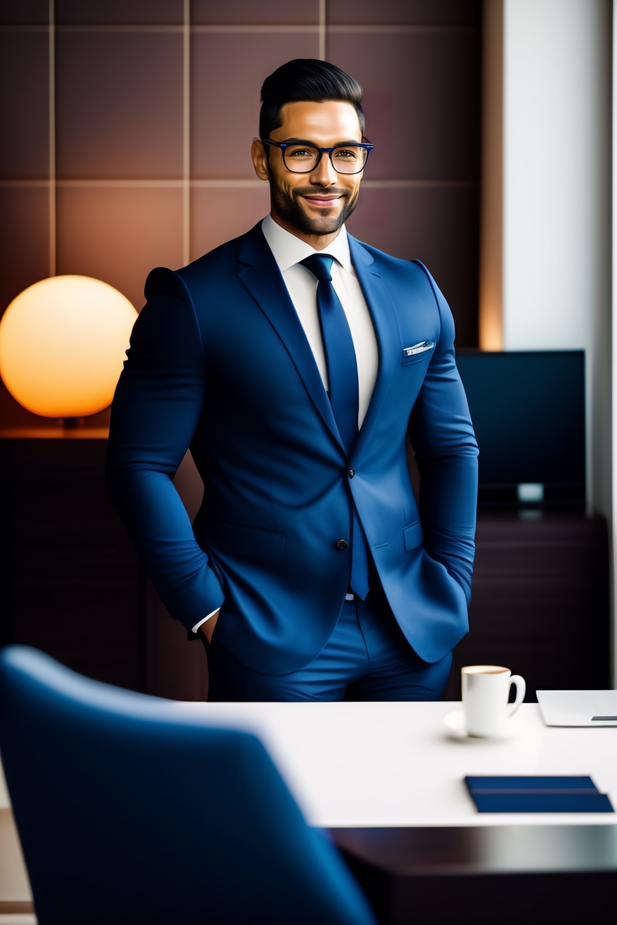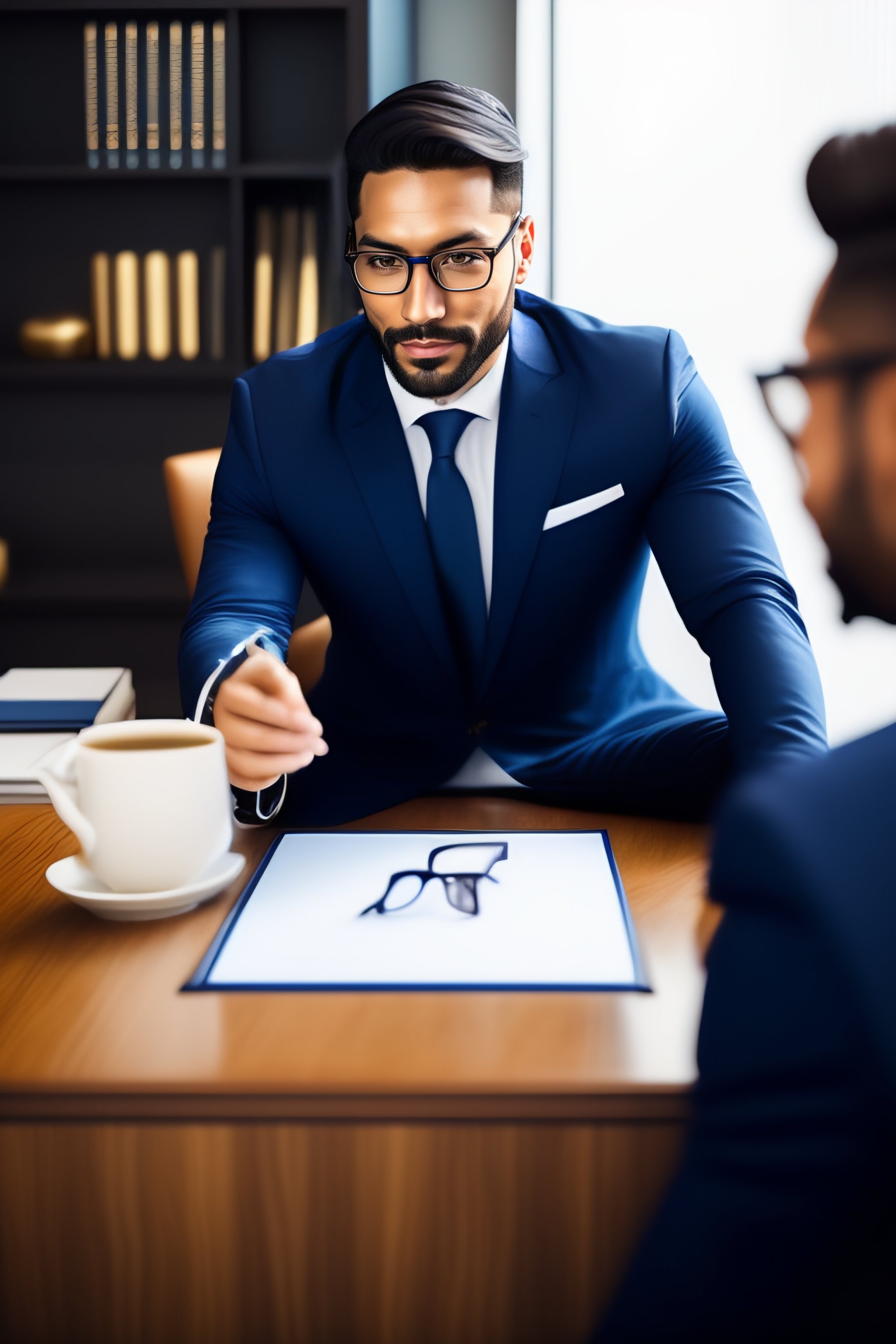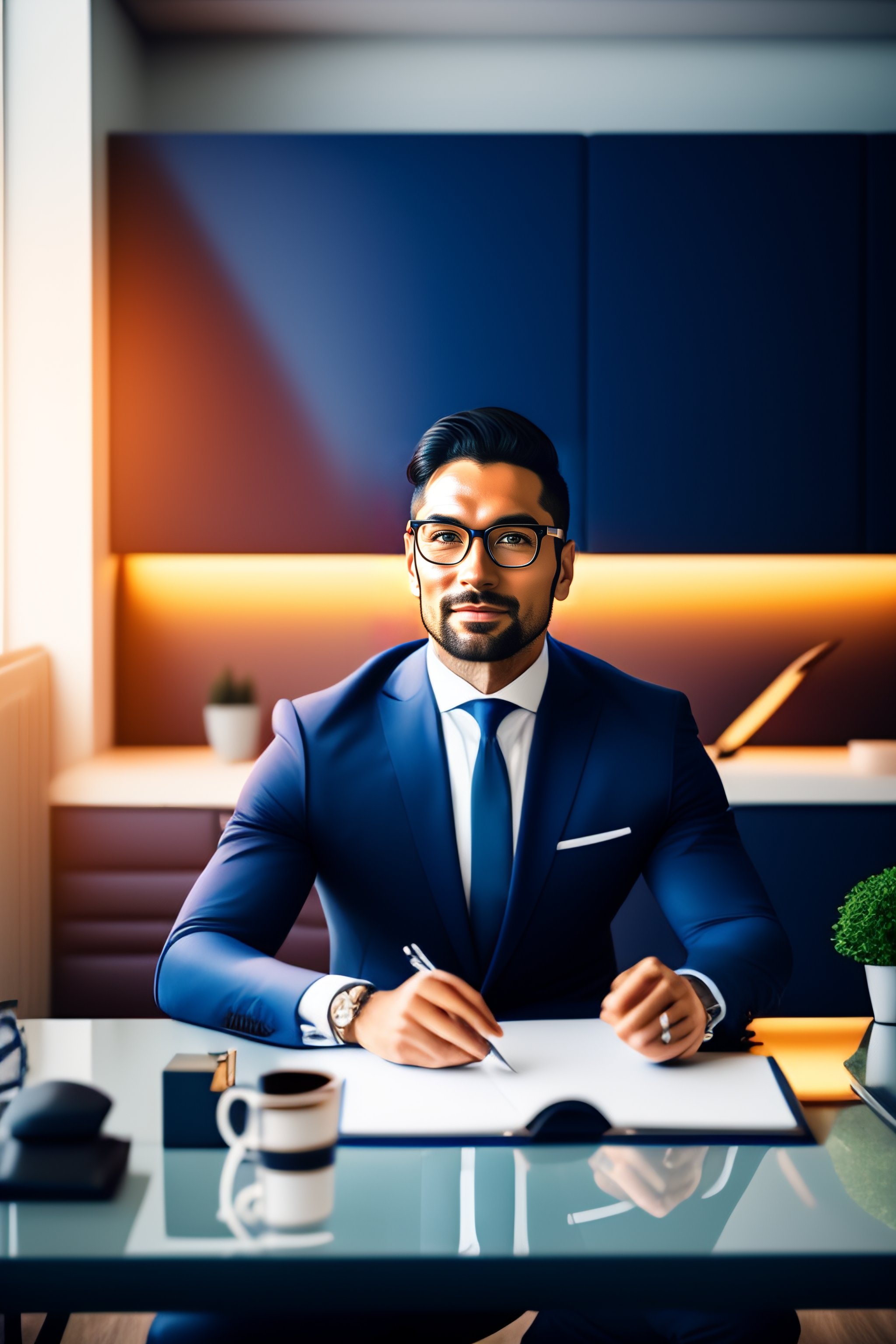 33-year-old business consultant inspiring trust while wearing a blue navy suit and glasses in his office. the consultant should be seated at a sleek wooden desk, surrounded by tasteful decorations and awards that reflect his professional accomplishments. the room should be well-lit, and the consultant's posture should be relaxed and open, inviting trust and confidence. the consultant's expression should be focused and attentive, and his demeanor should be approachable and friendly. the overall atmosphere should be one of professionalism and expertise.
