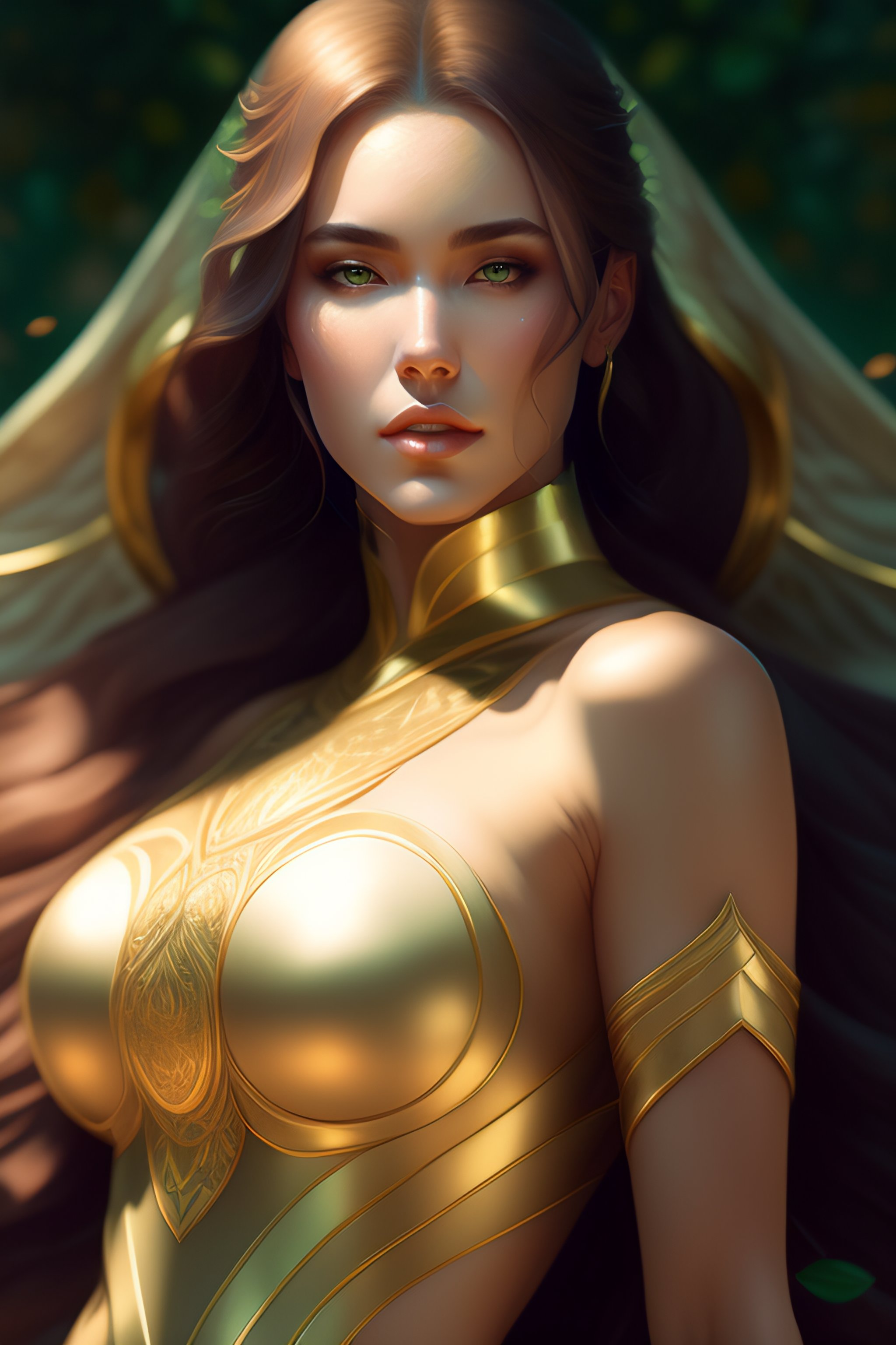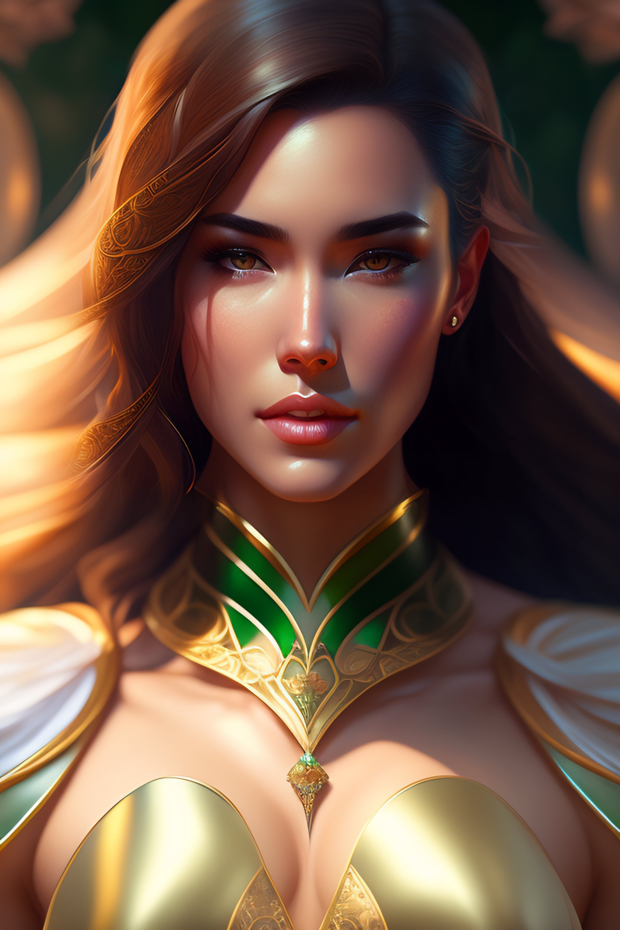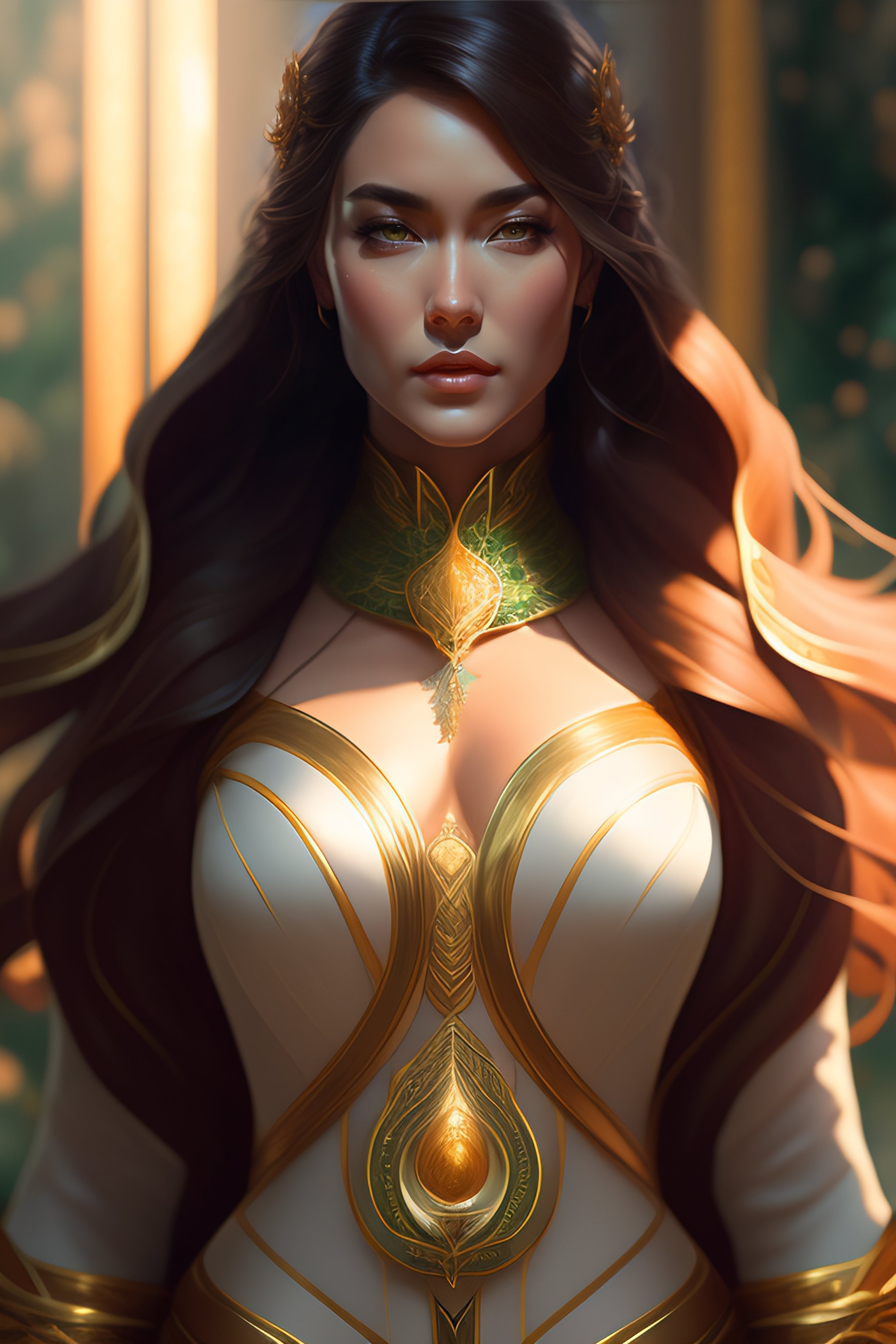 Symmetry!! full body portrait!!!! of megan boone actressl!!!! american vestal sacral priestess, goddess, queen, princess, pale glowing white skin, intricate emerald and gold jewelry, long brown hair, dressed in emerald green, long highlighted chestnut brown hair, exotic, pretty face, intricate, elegant, highly detailed, digital painting, artstation, concept art, smooth, sharp focus, illustration, art by artgerm and greg rutkowski and alphonse mucha, 8 k