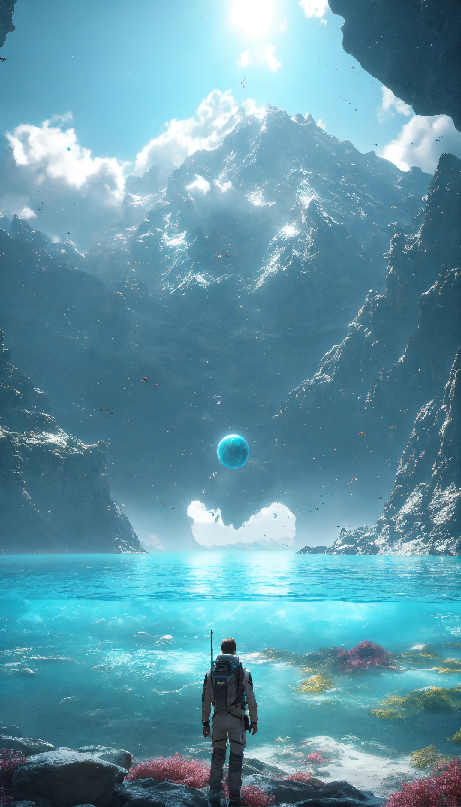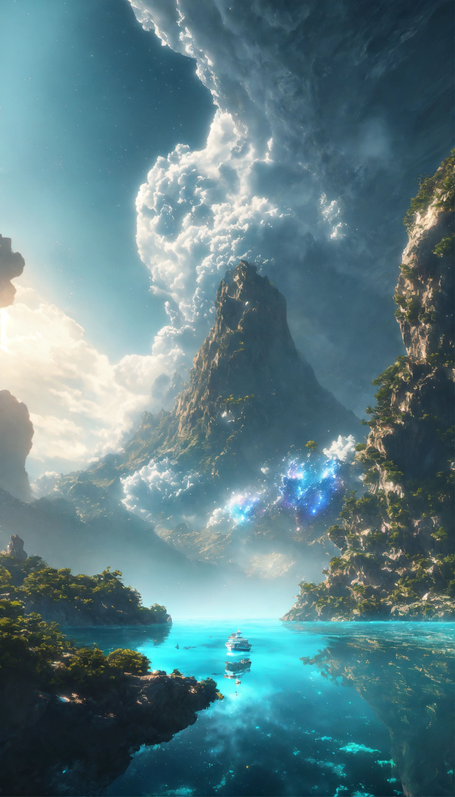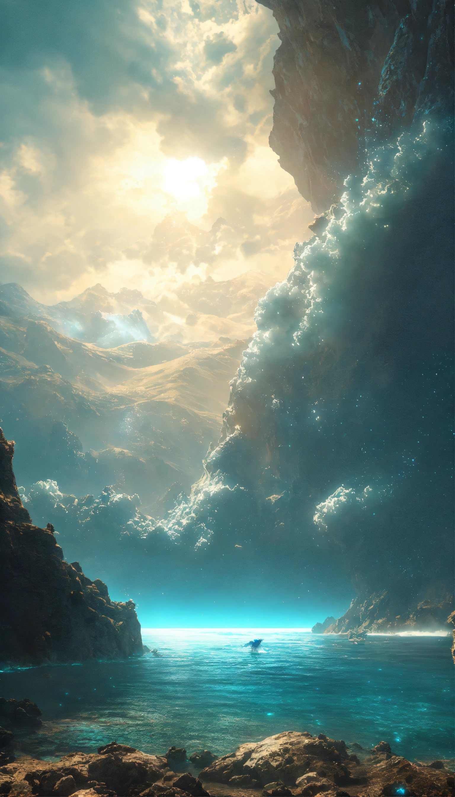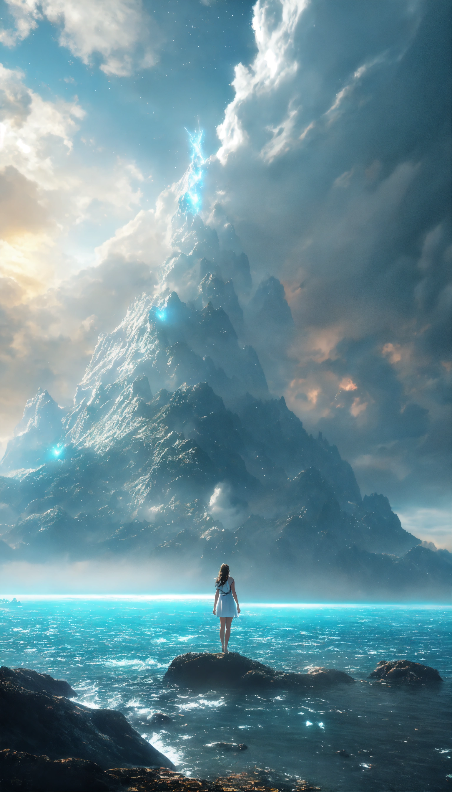 Angel white being reincarnated into a ocean world, sky nebula, artstation scifi 3d scene of a showing mountains, maximalism, ambient occlusion, atmospheric haze, unreal engine, hyper realism, realistic shading, cinematic composition, realistic render, octane render, detailed textures, photorealistic, wide shot