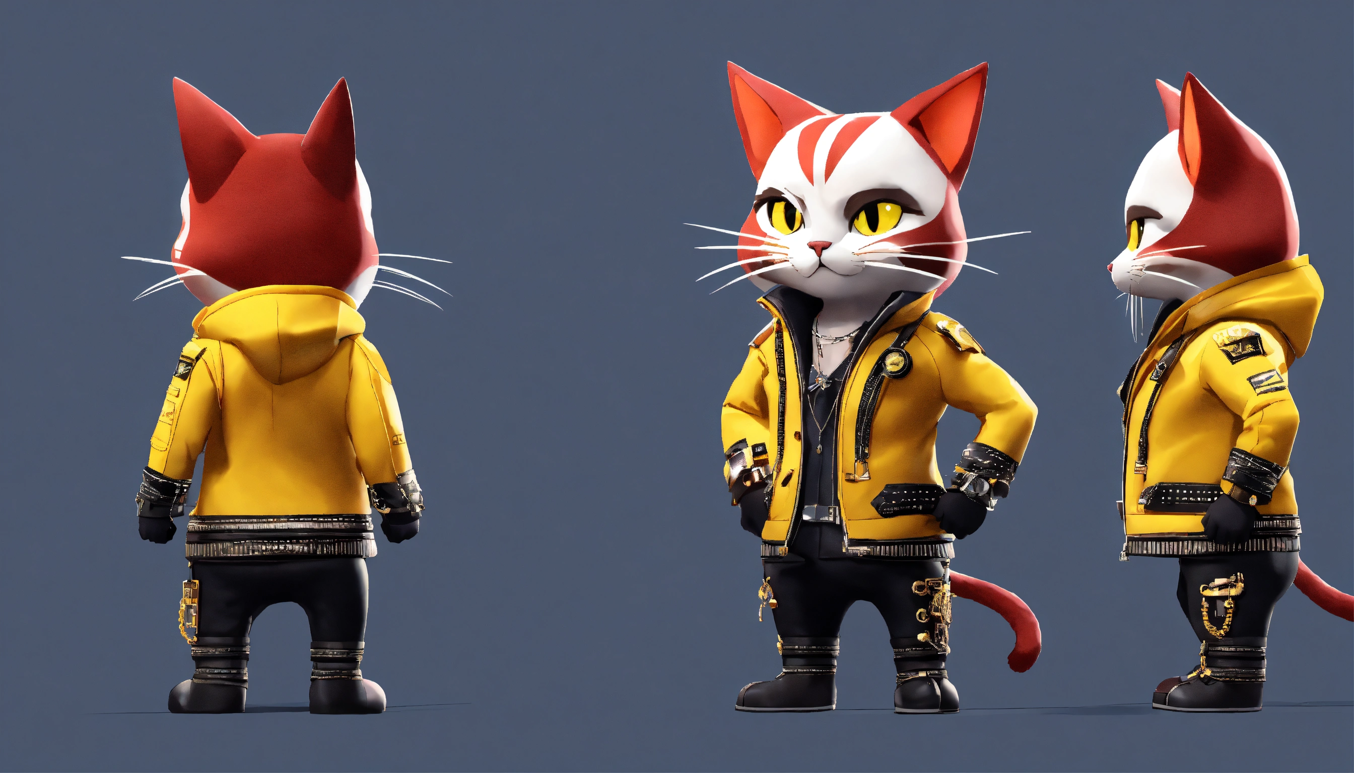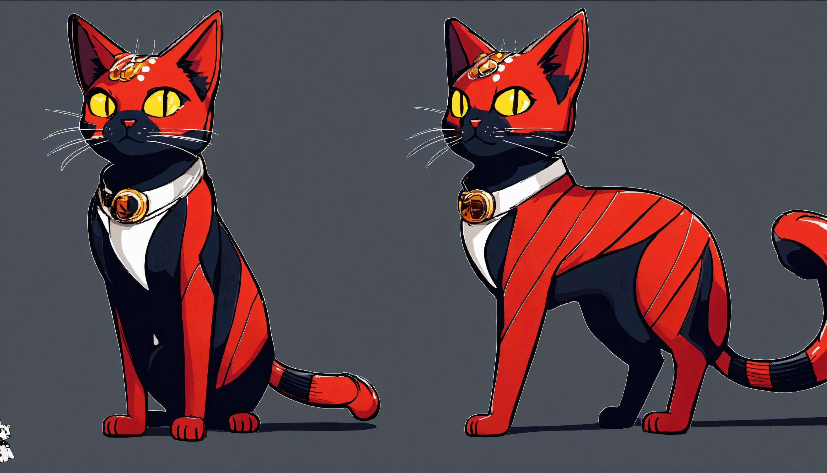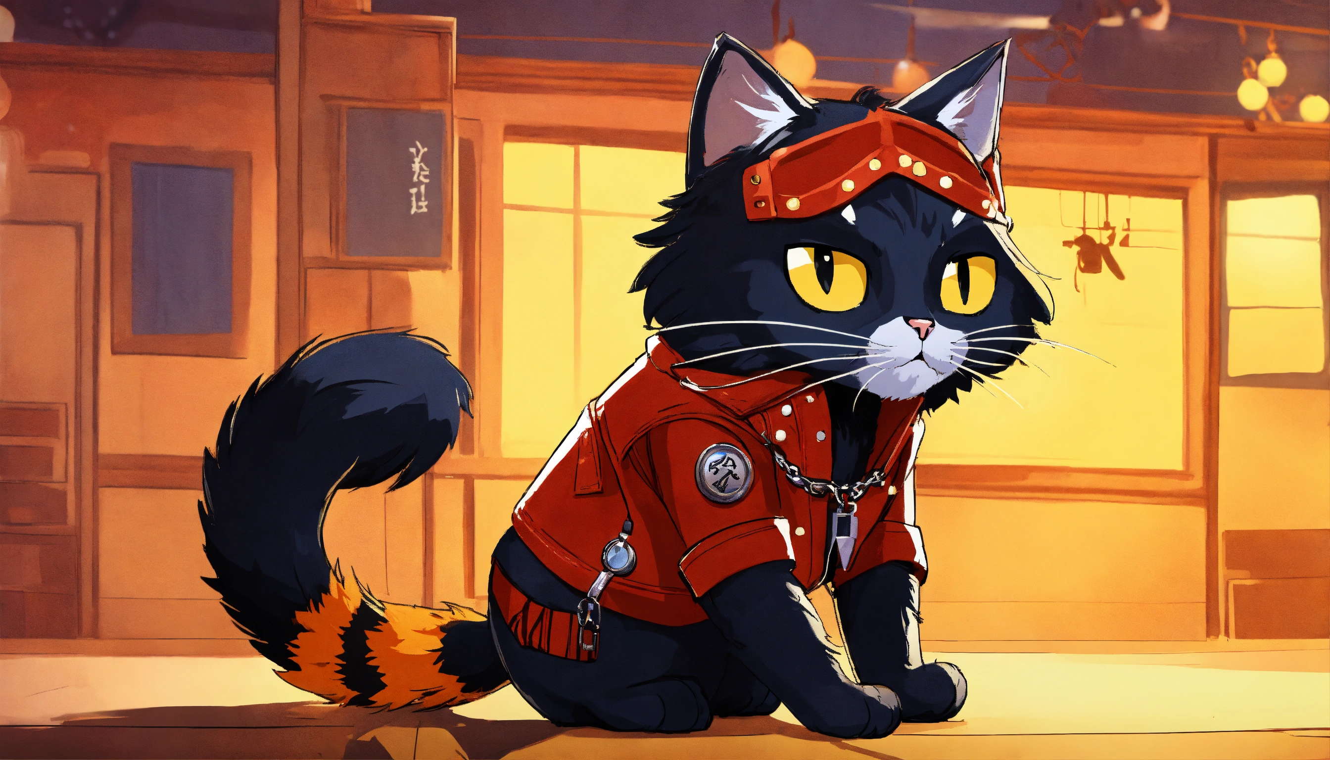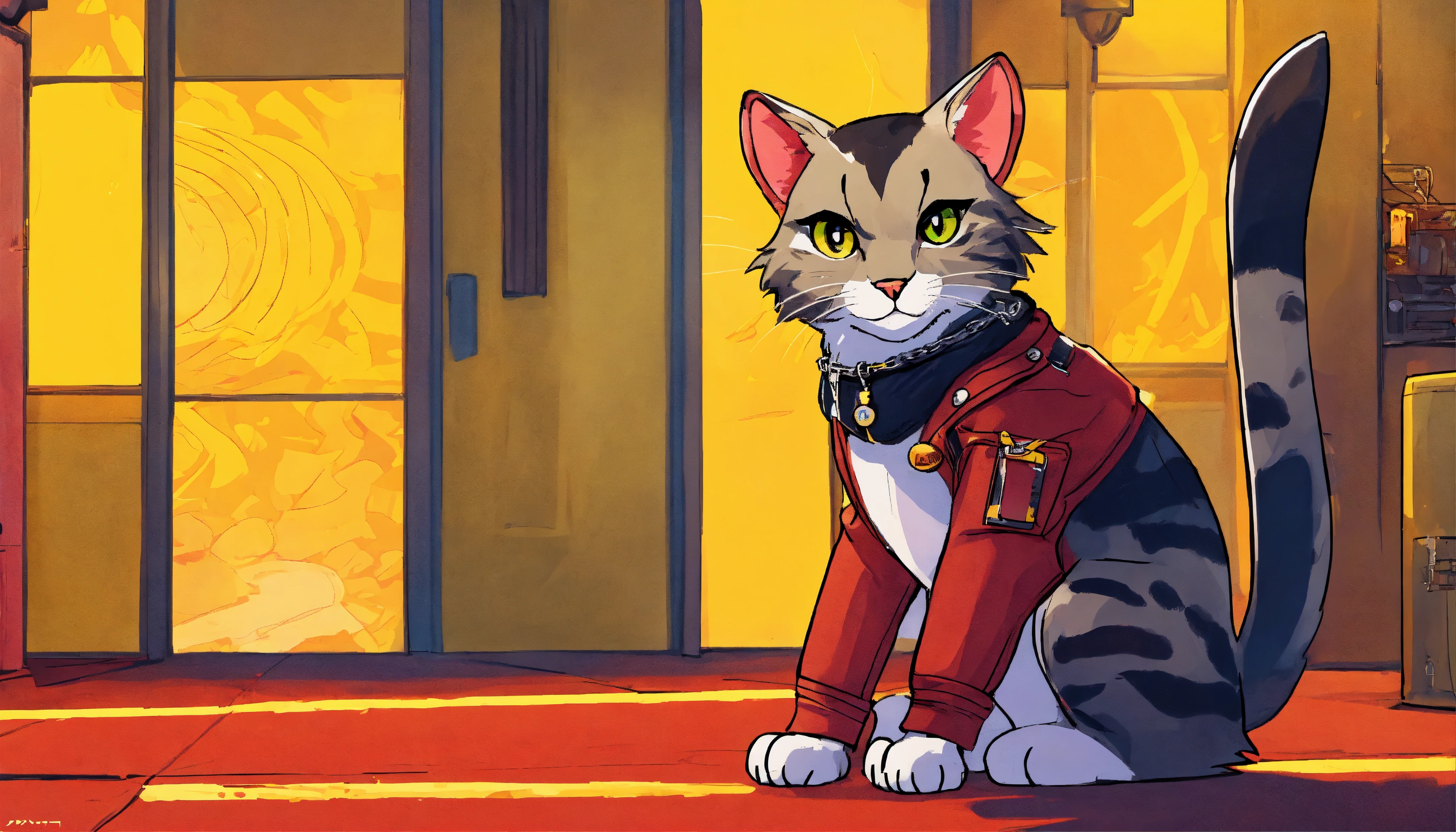 Create a full-body, humanized animated character of an urban cat in 2d style. this cat has sleek black fur with white stripes and large, bright, piercing yellow eyes. it's dressed in a striking red leather jacket adorned with metal studs. the cat also wears chains around its neck, a luxurious wristwatch on the right front limb, and sports an earring in one ear. this feline character is sly, mischievous, and irreverent. the illustration should be in an anime, ukiyo-e style, aspect ratio 32, with a flat and minimalist background. it should resemble flat vector art, akin to a character from a faux video game. referencia file///users/camilo.agaton/downloads/microsoftteams-image%20(4).png