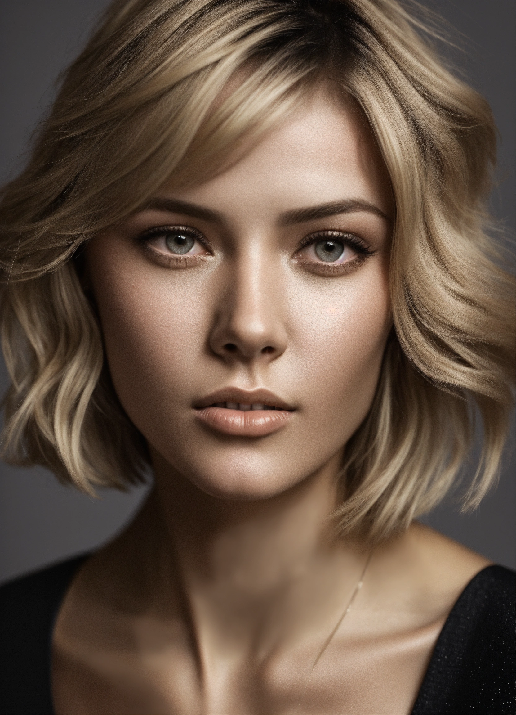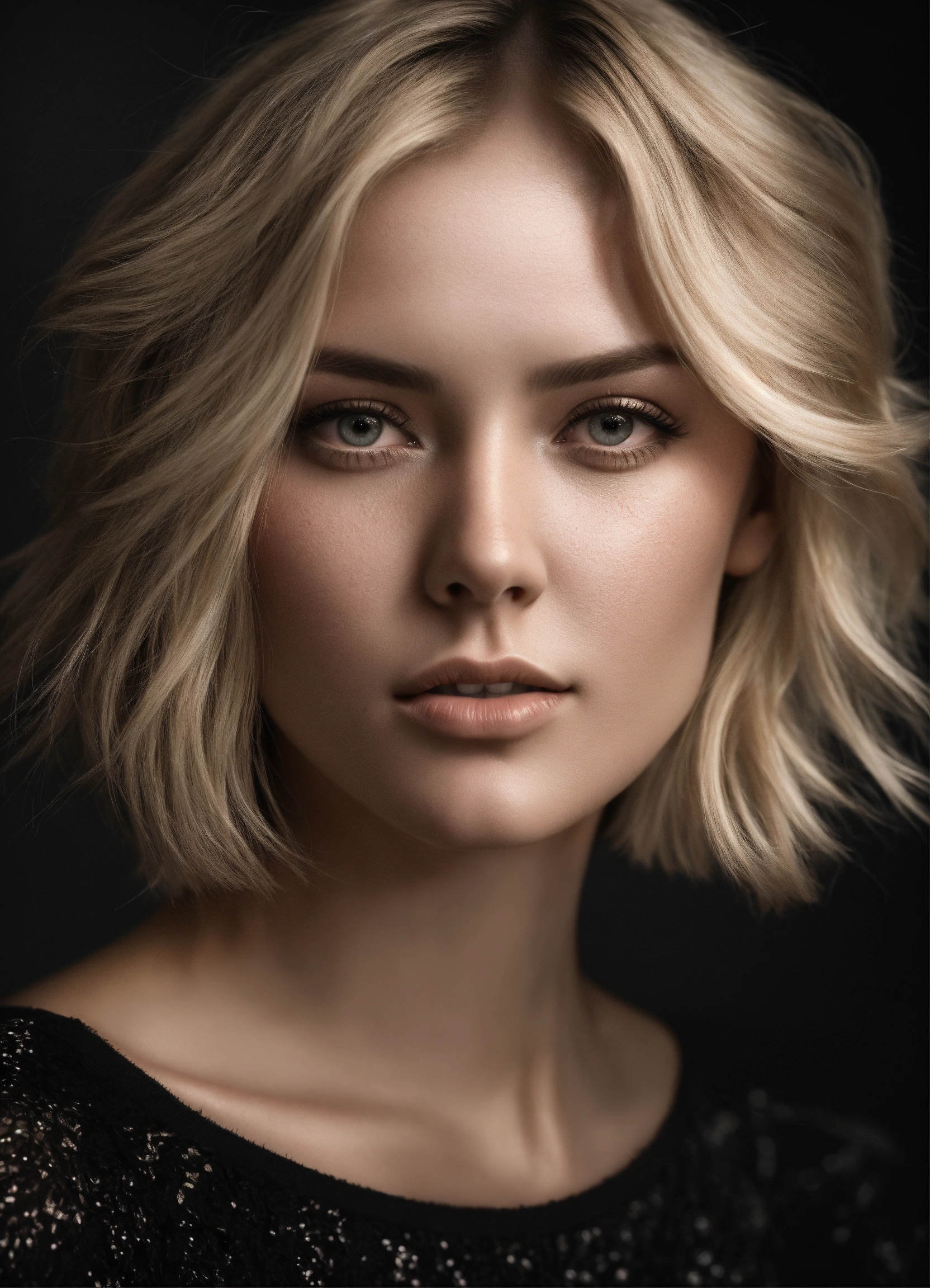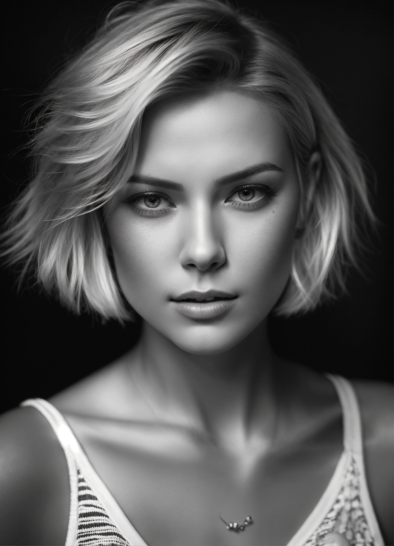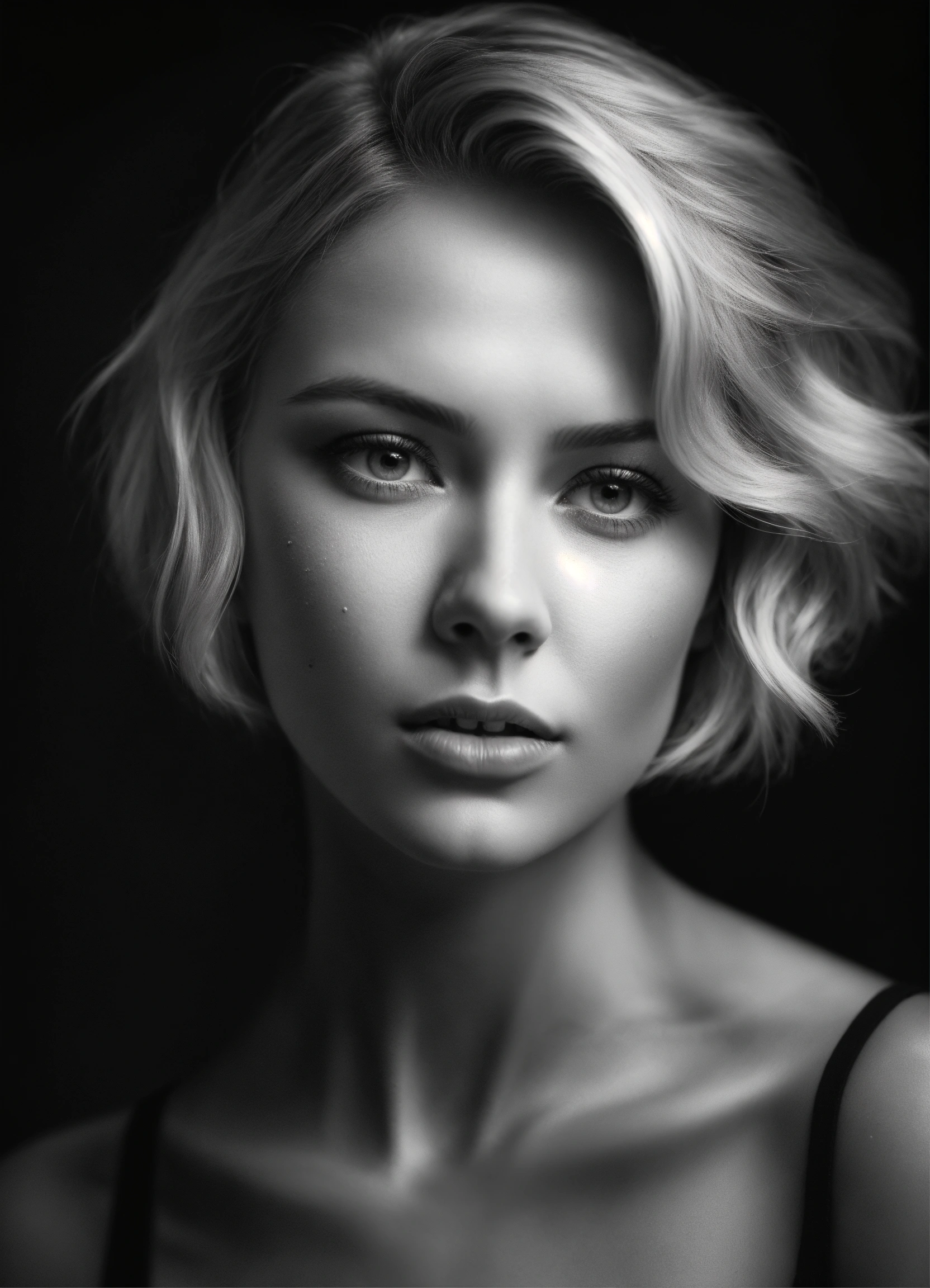 Photo portrait of a blonde woman, short hair, with light eyes, with a mole, with skin details, 16k image quality, ultra-realistic, black and white, professional photo studio, high definition, harcourt studio style, with a shadow on the face, black background