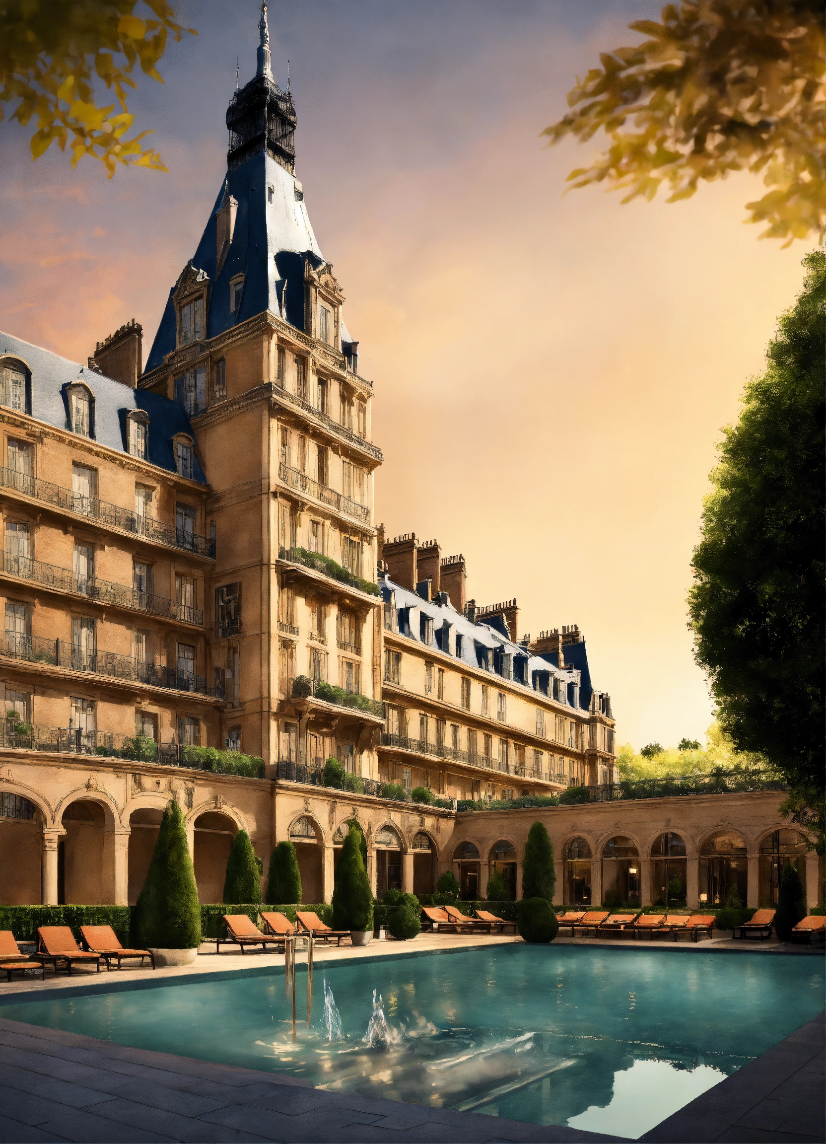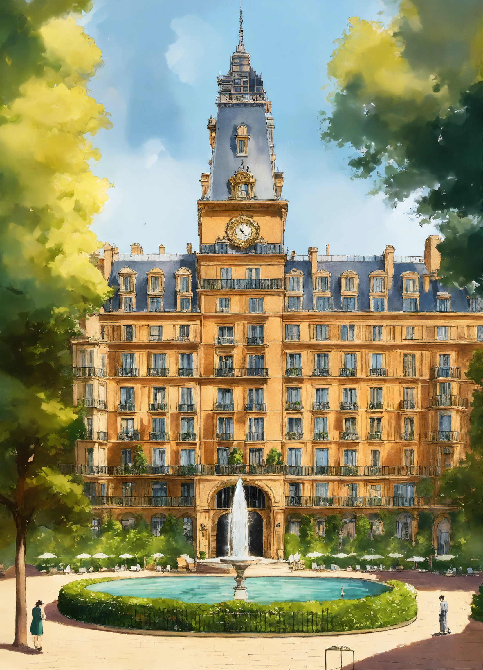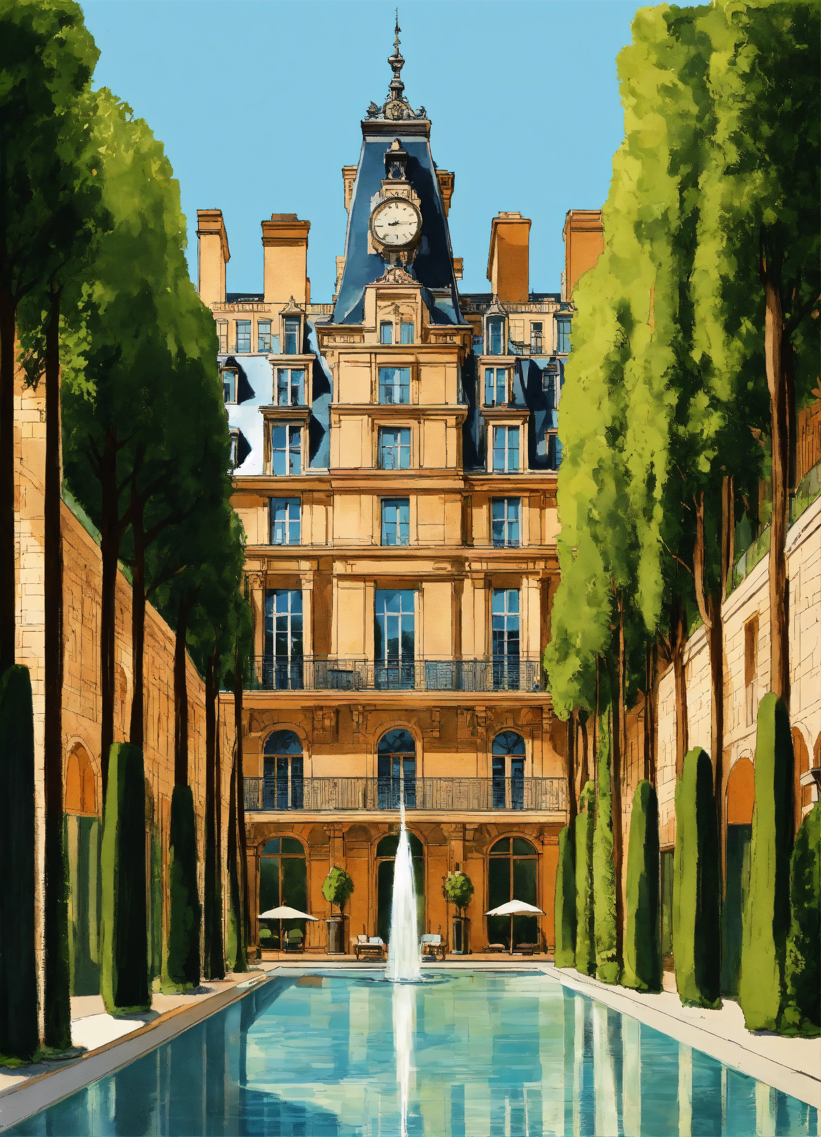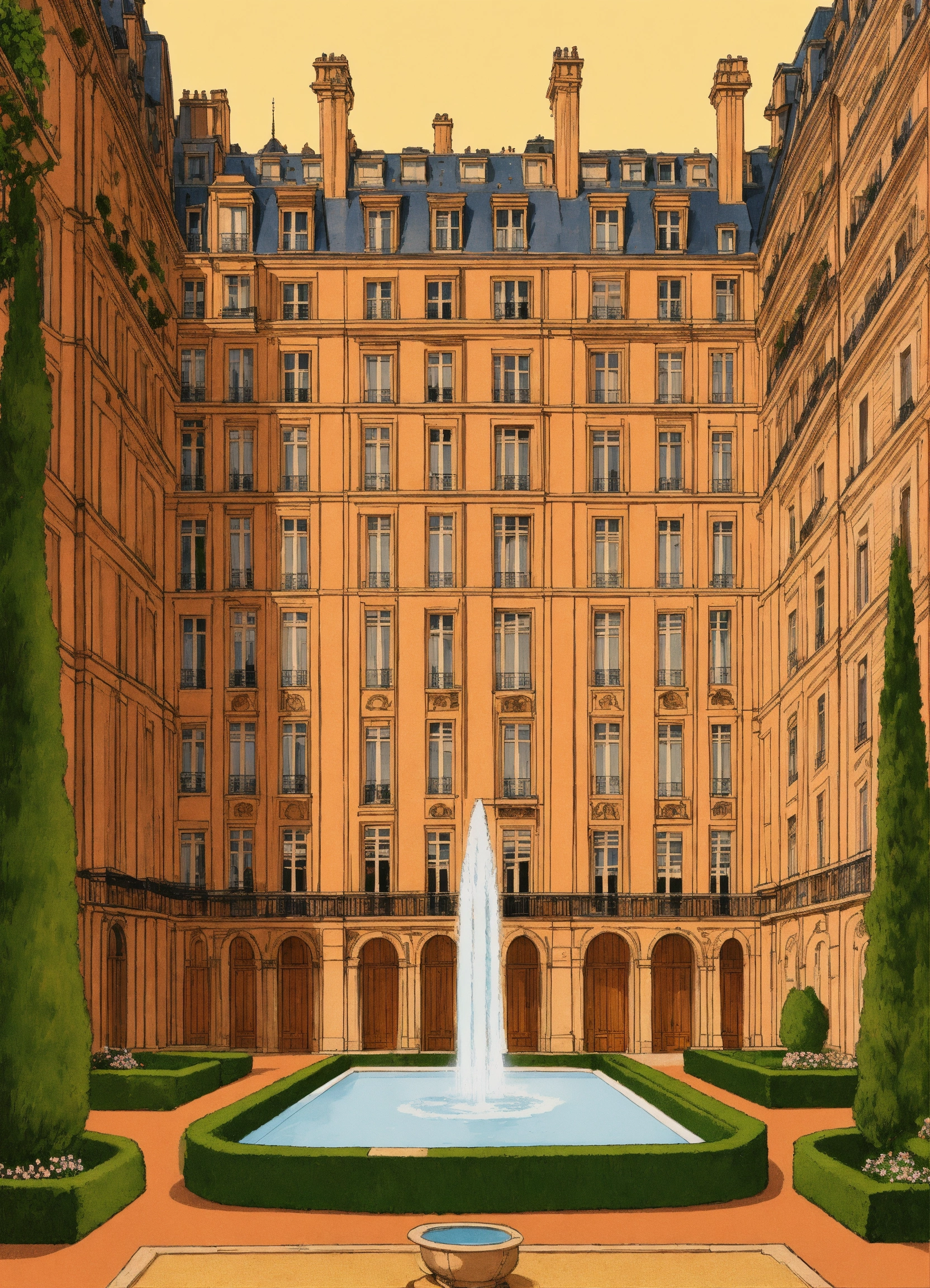 Tall, high, multistory, 200 floors, grand hotel budapset, place de vosges, jardin denpalaia royale, extremely high empire state building haussmannian parisian style, with french garden and fountain swimming pool and cypress trees maze, herge illustration