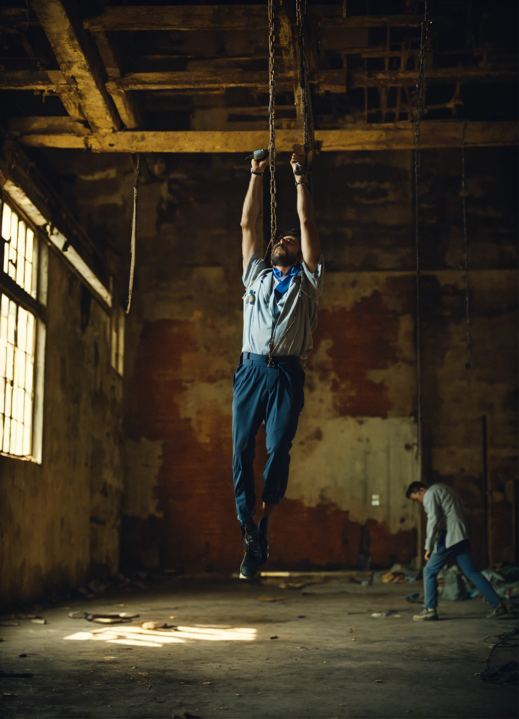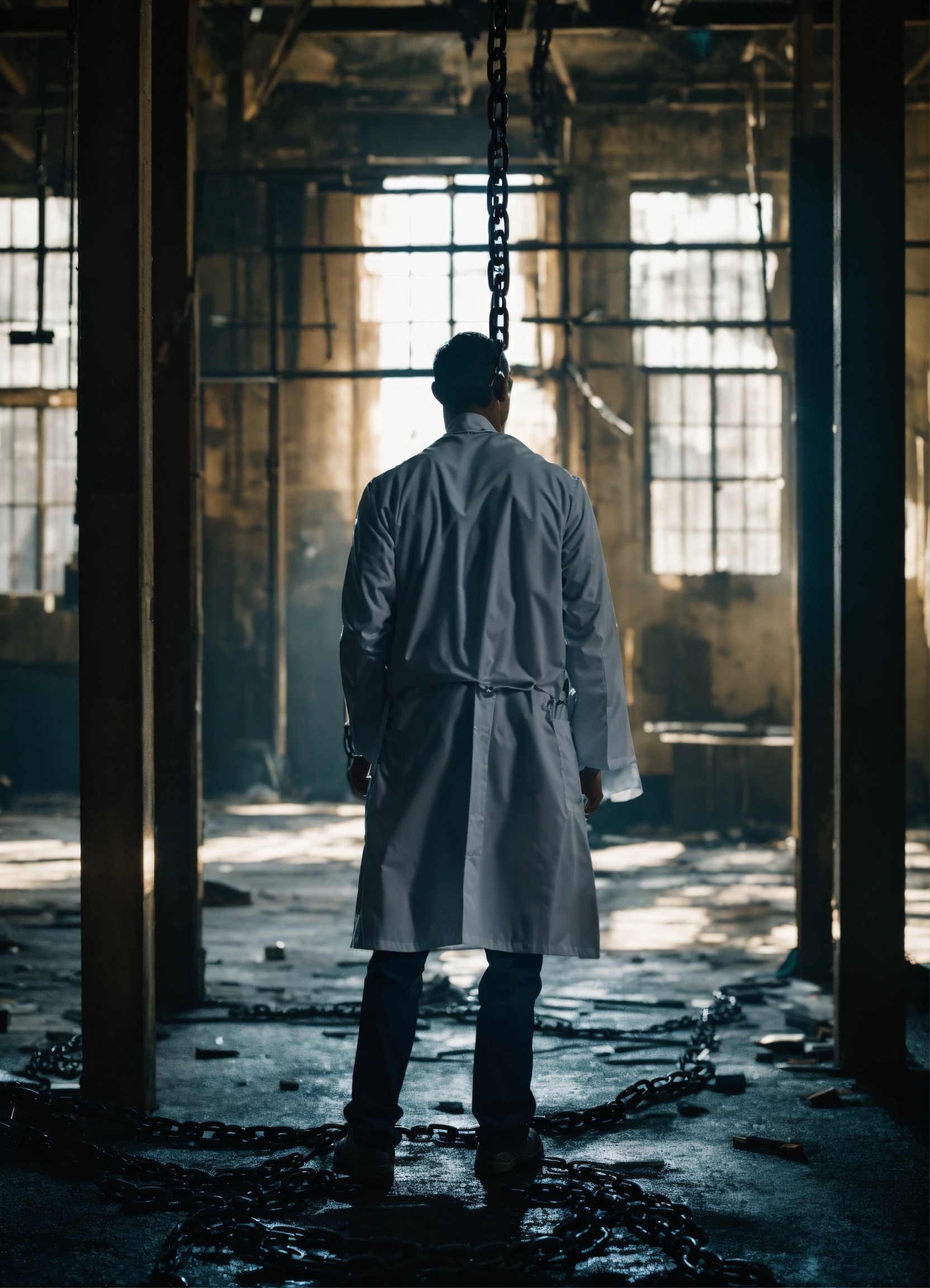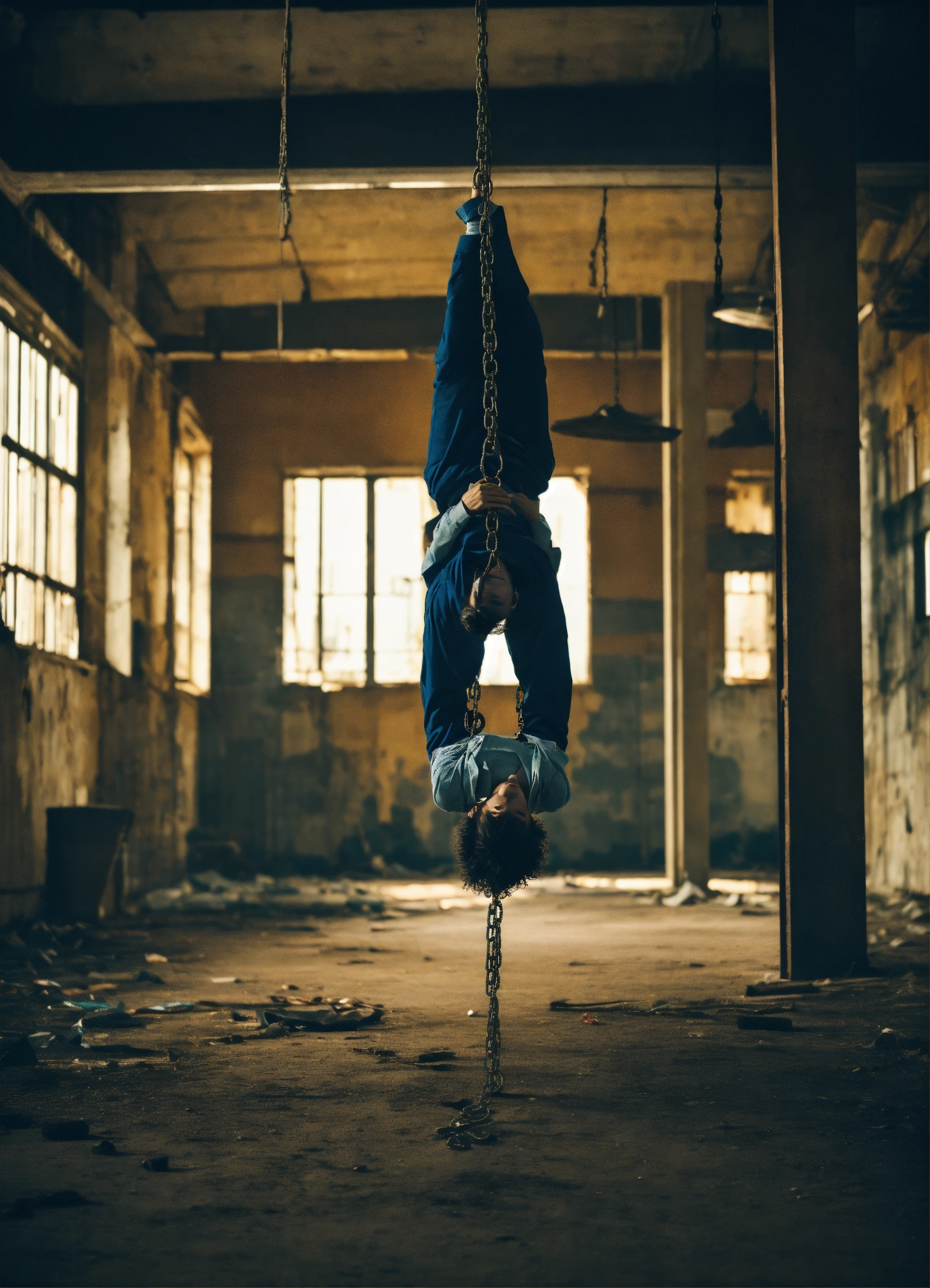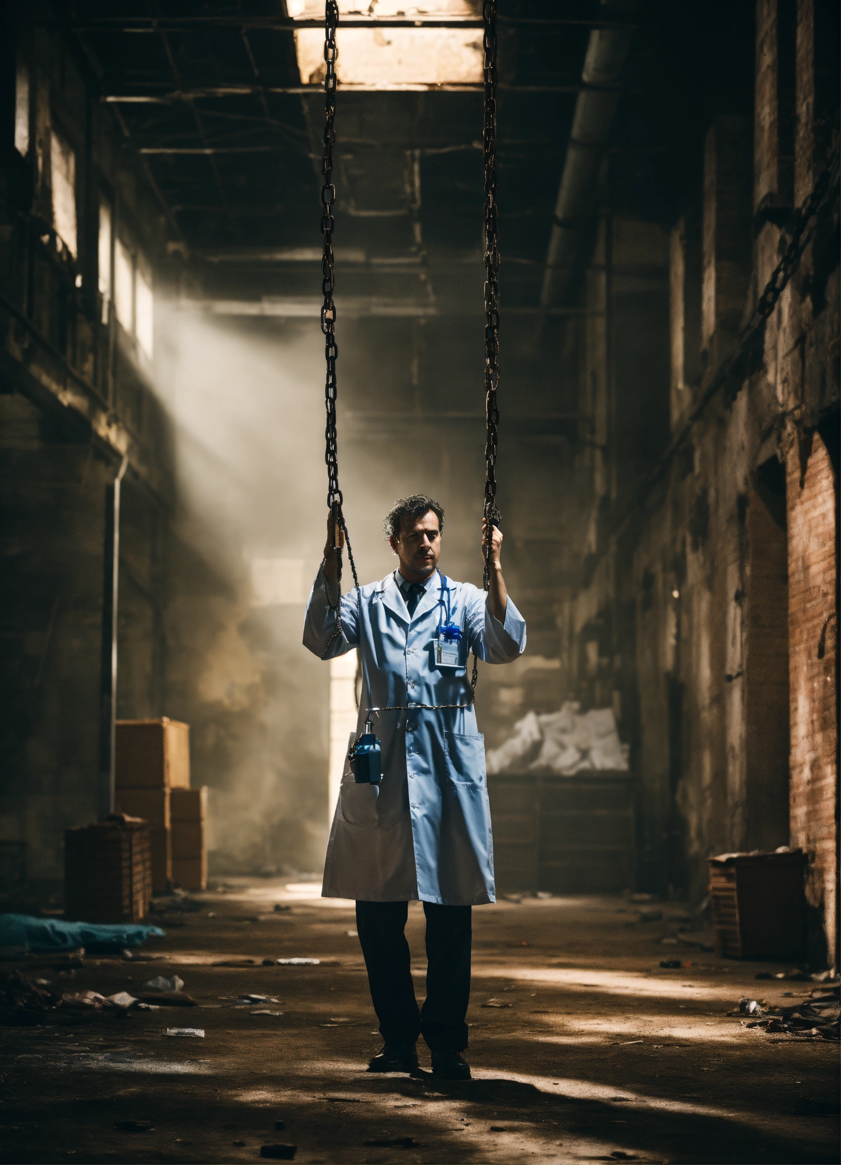A tired doctor on his back hanging from a chain, in an abandoned warehouse. suspense film, mysterious scene, cinematographic