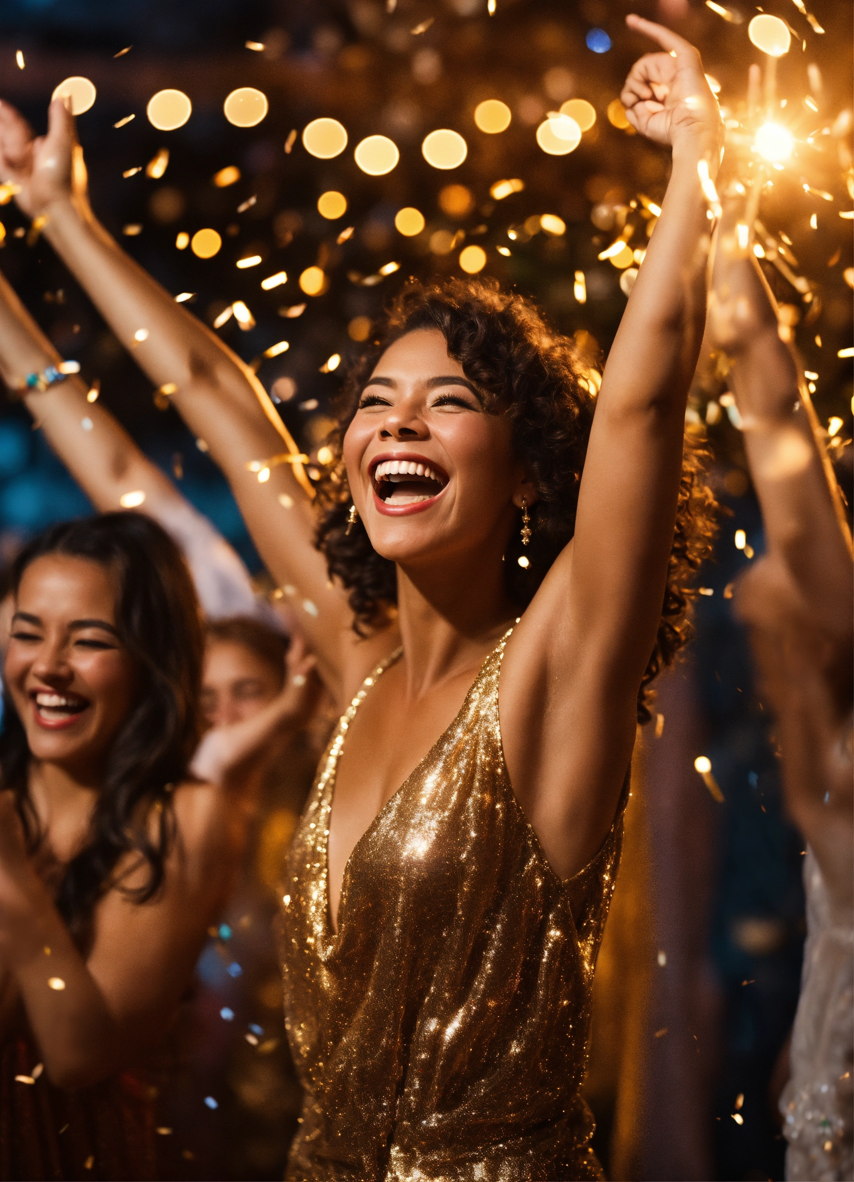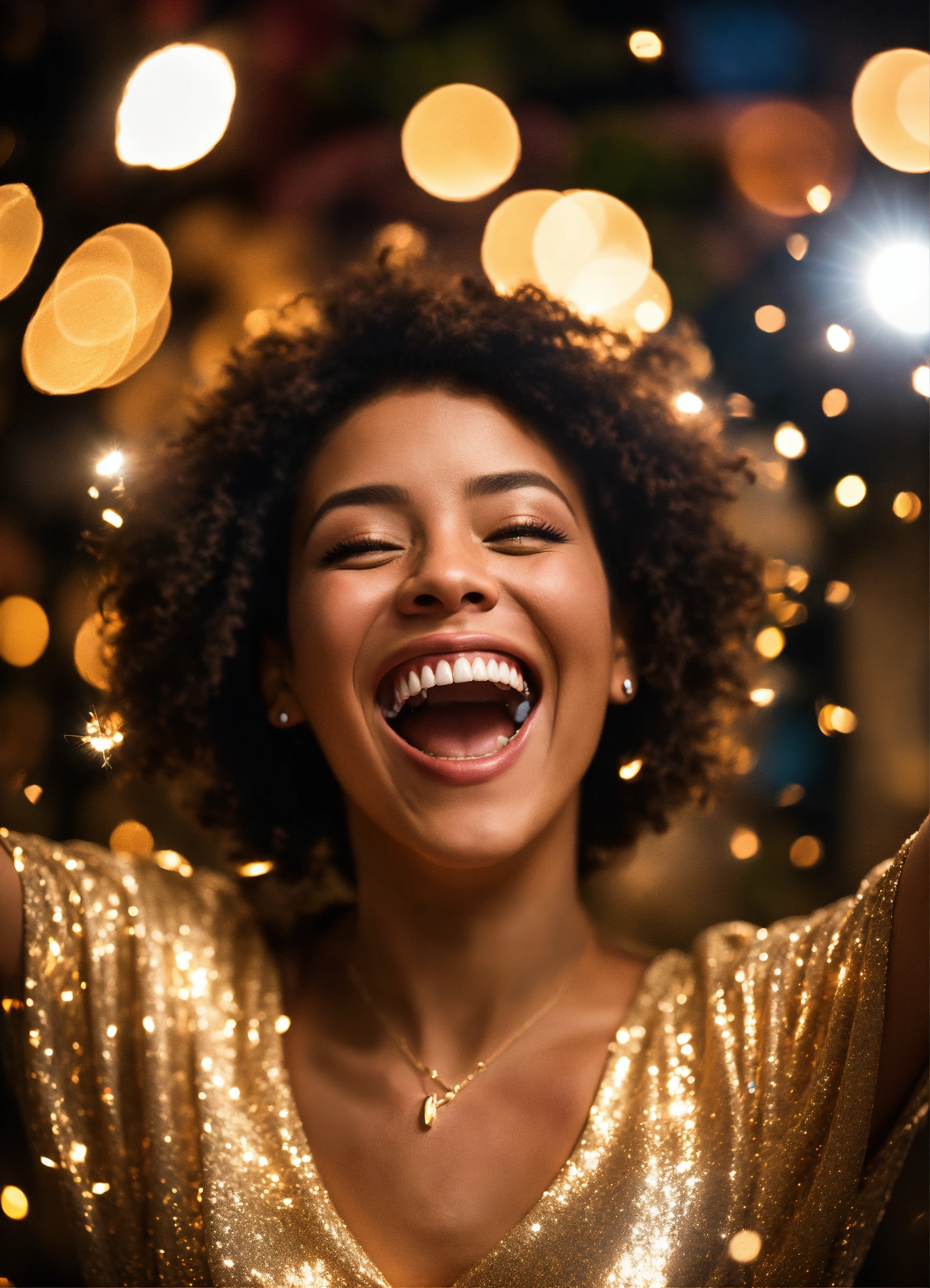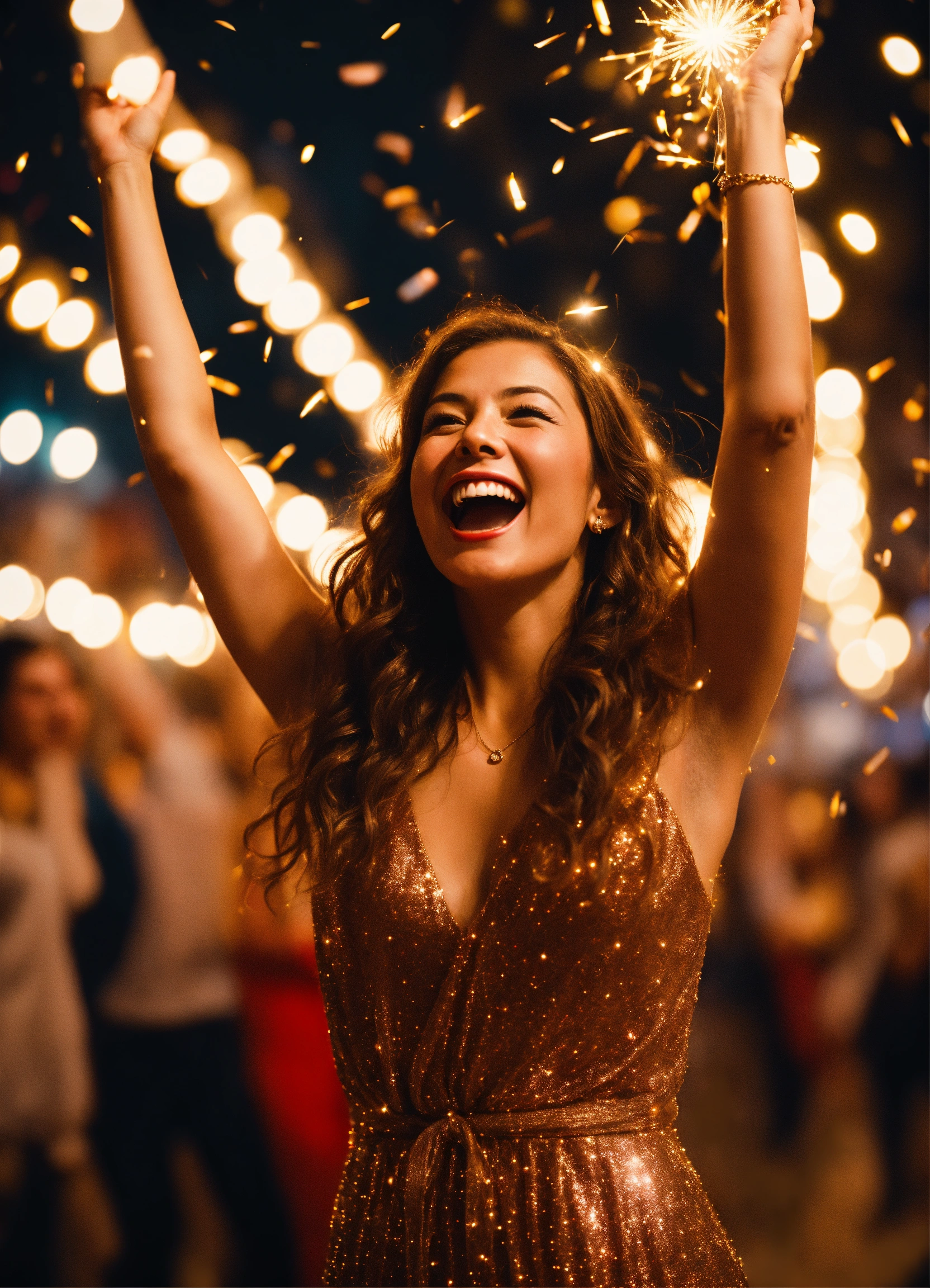 "joyous elevation woman celebrating her triumphant moment", jubilant expression, raised arms, nikon z9, sparkling festive lighting, photorealistic capture of pure elation.