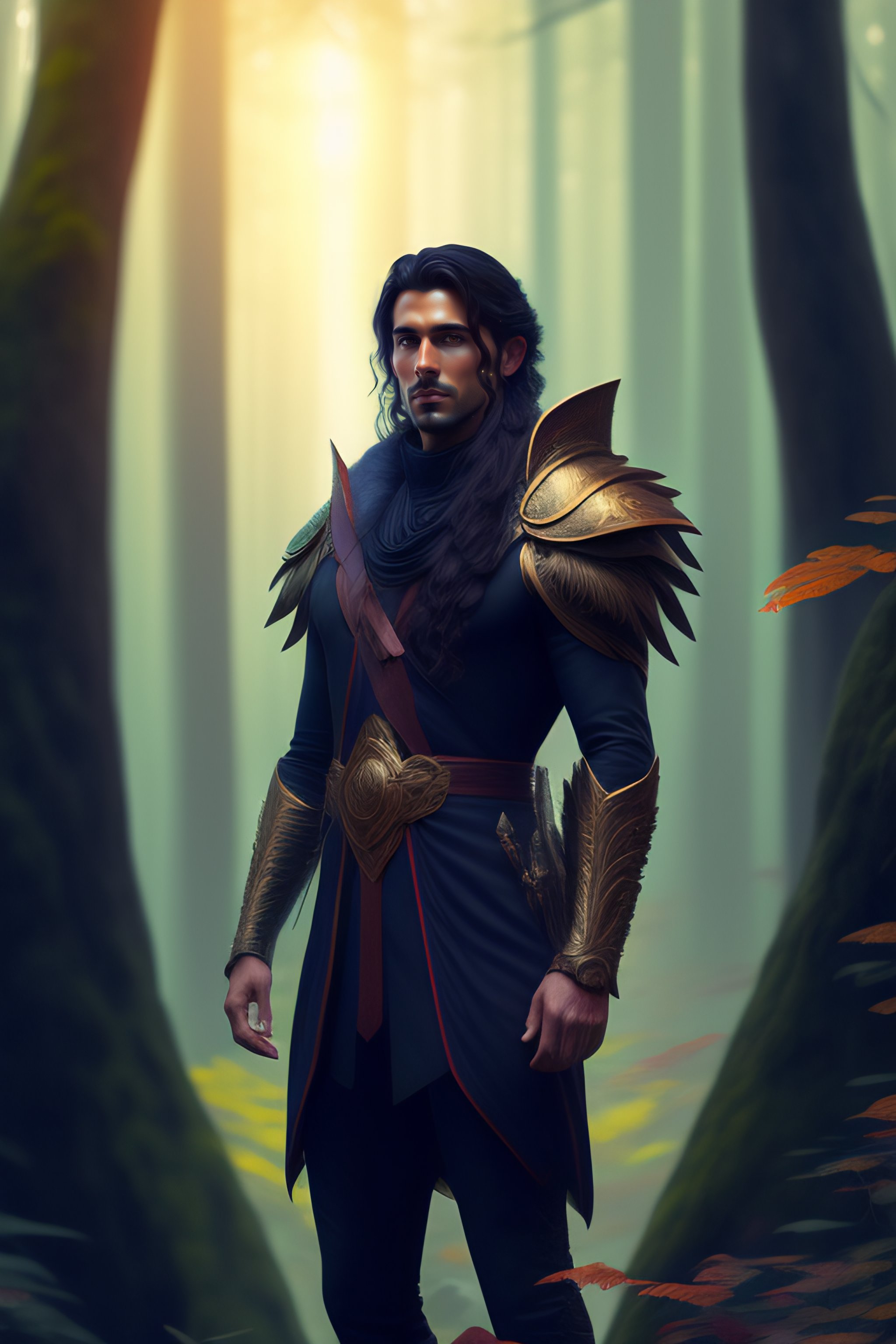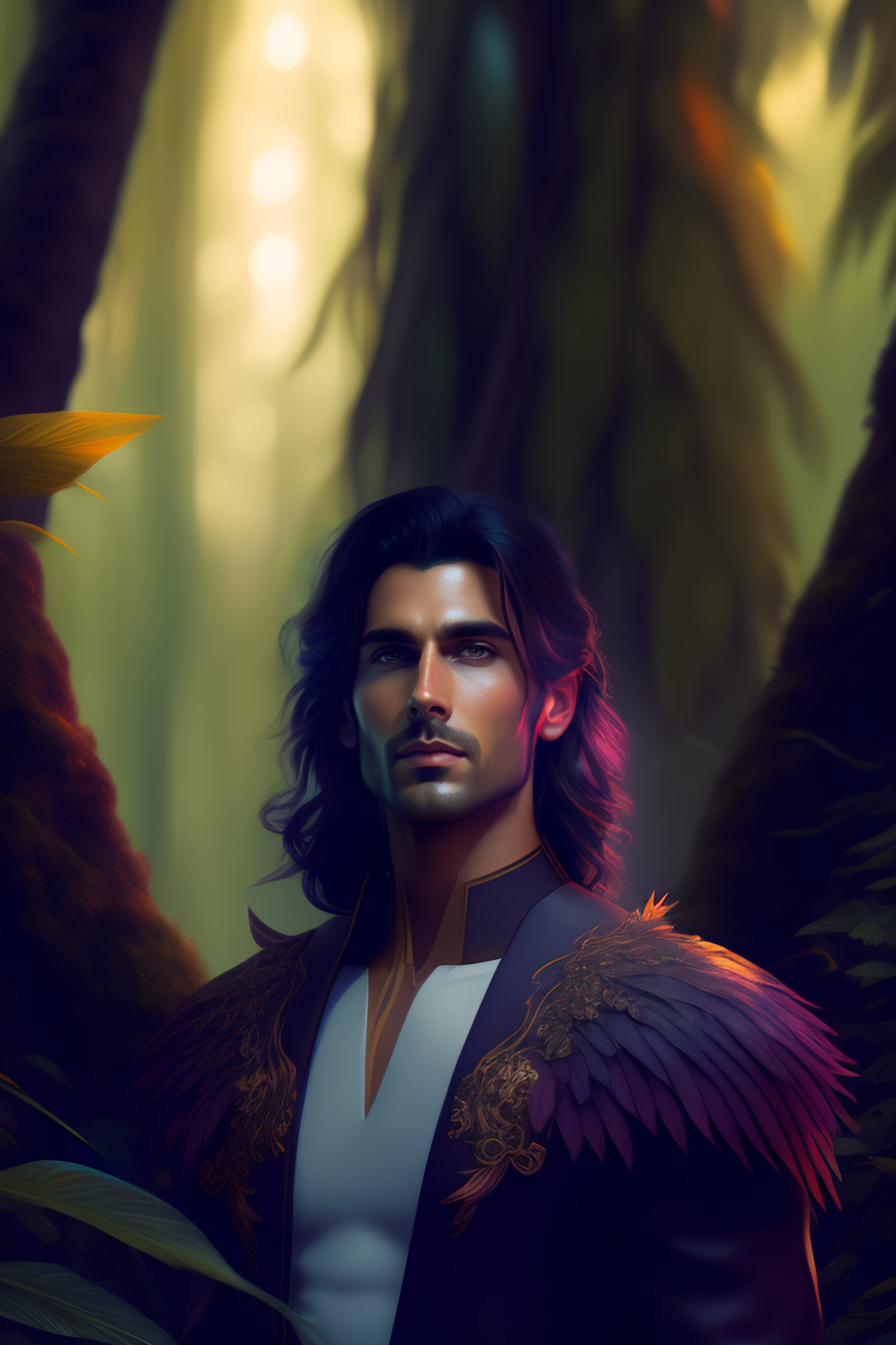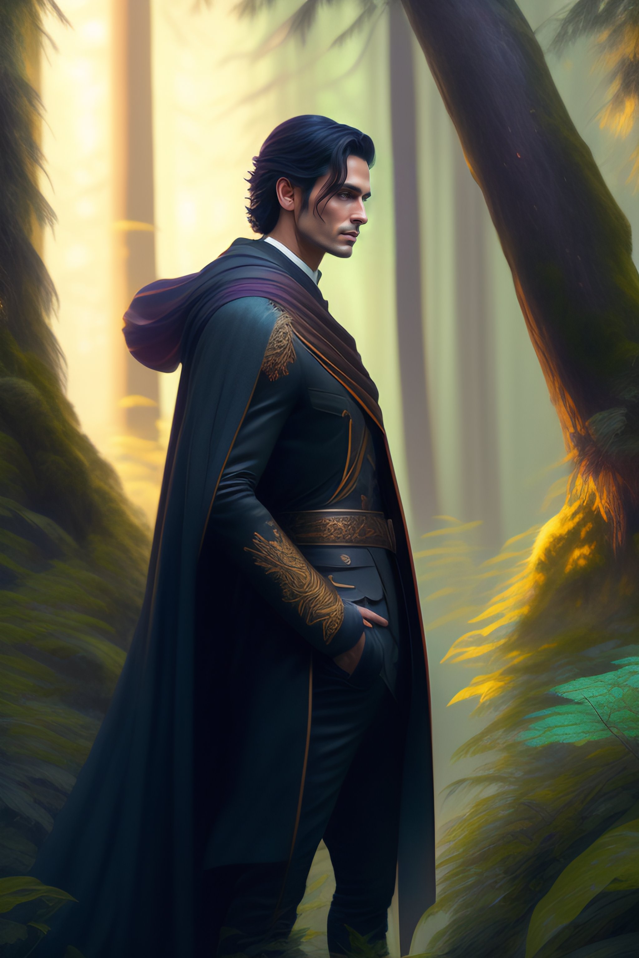 Full length shot of handsome dark haired male standing in alien colorful forest, highly detailed, digital painting, deviantart, artstation, concept art, matte, sharp focus, photo realistic, detailed face, photorealistic pale skin, greg rutkowski and alphonse mucha