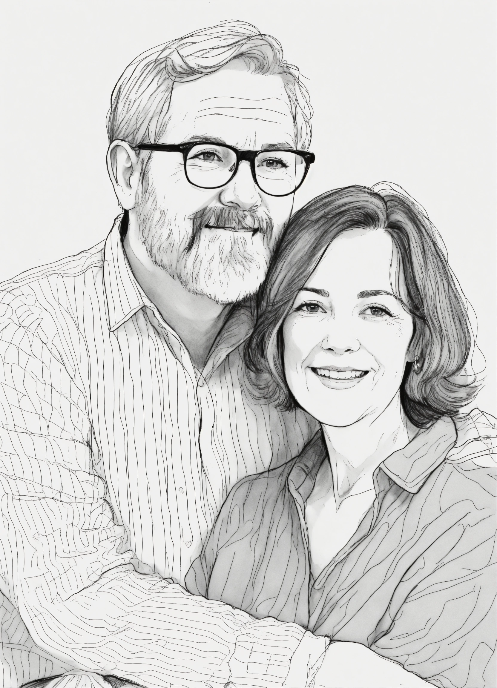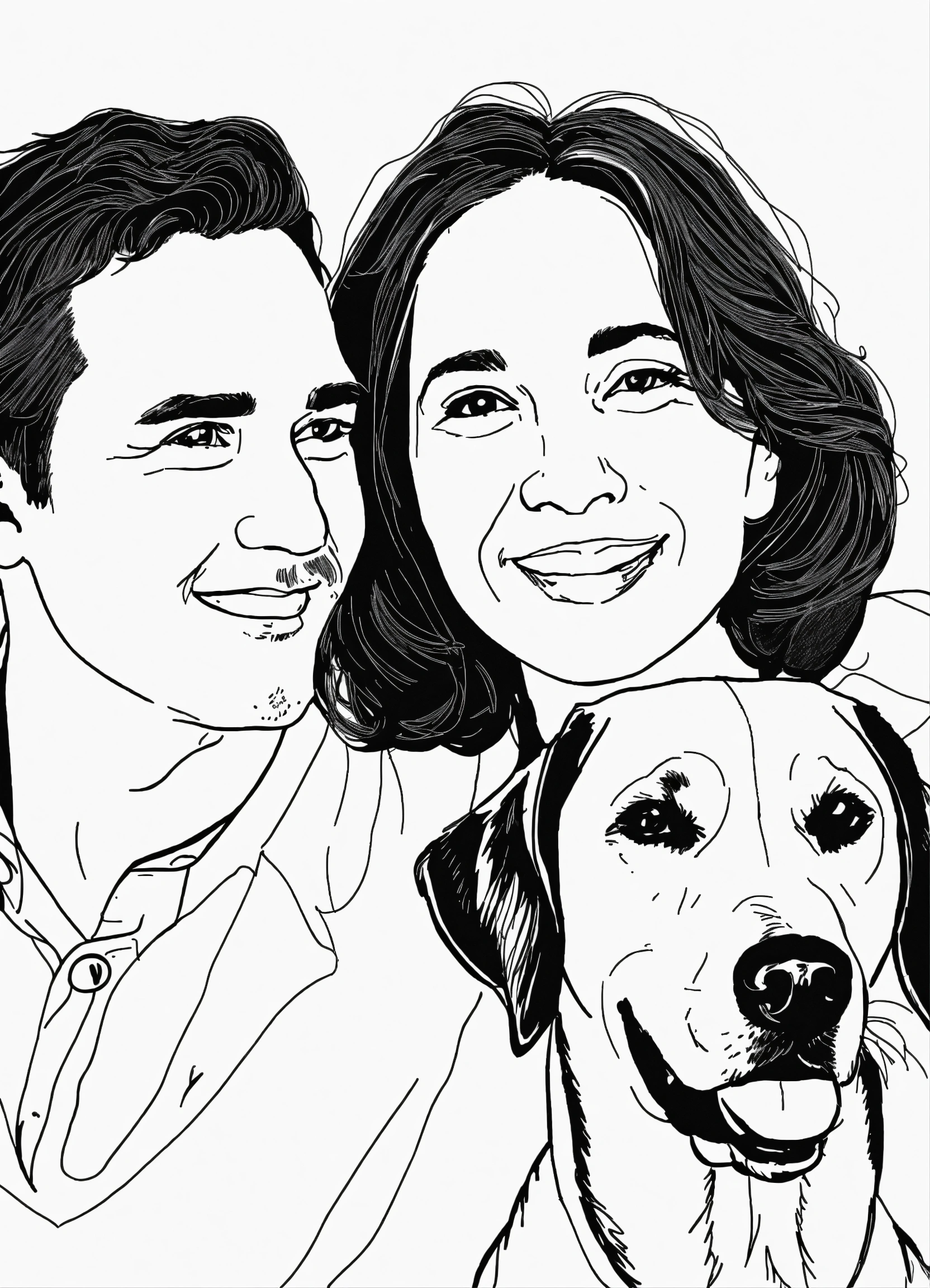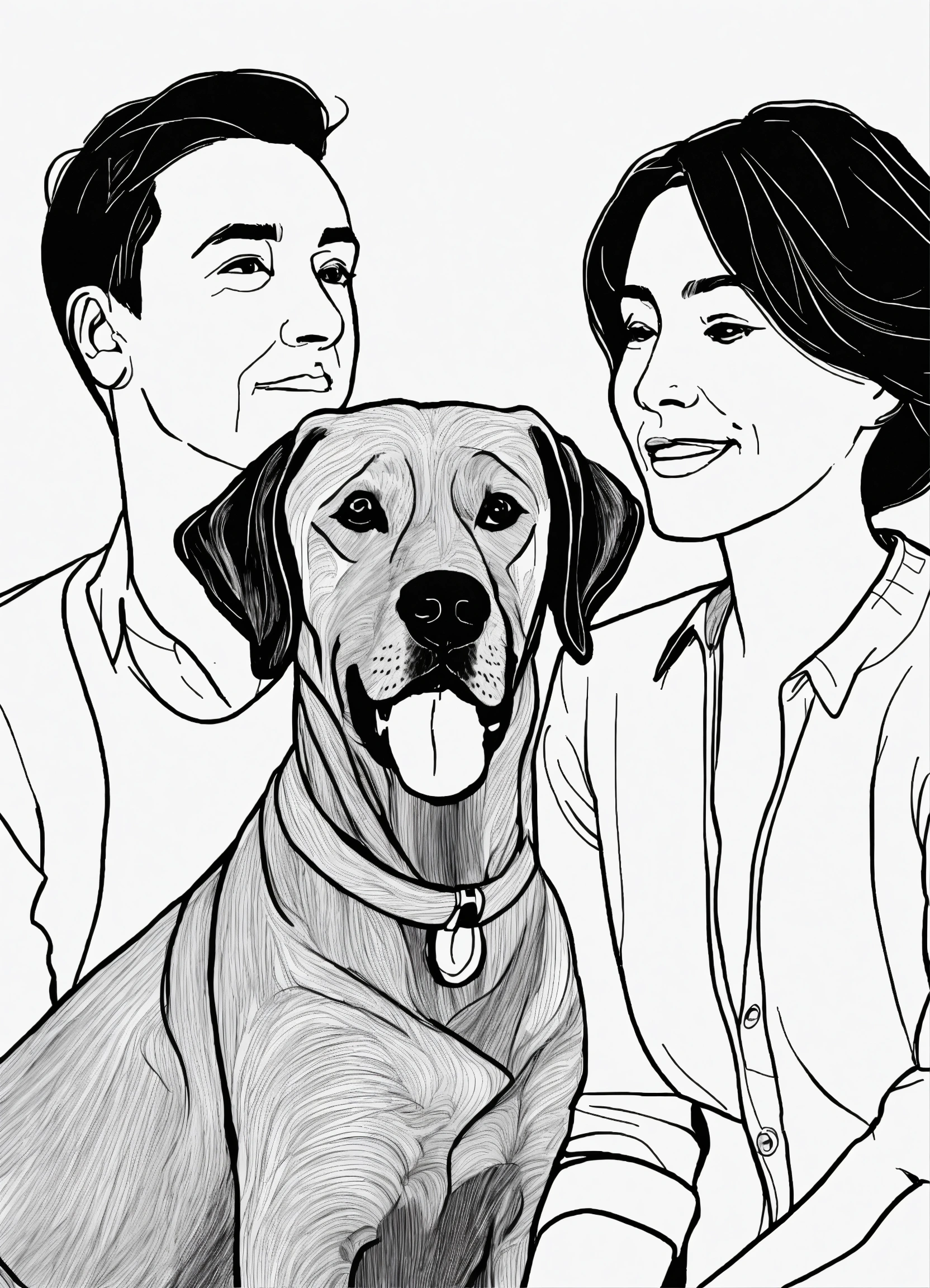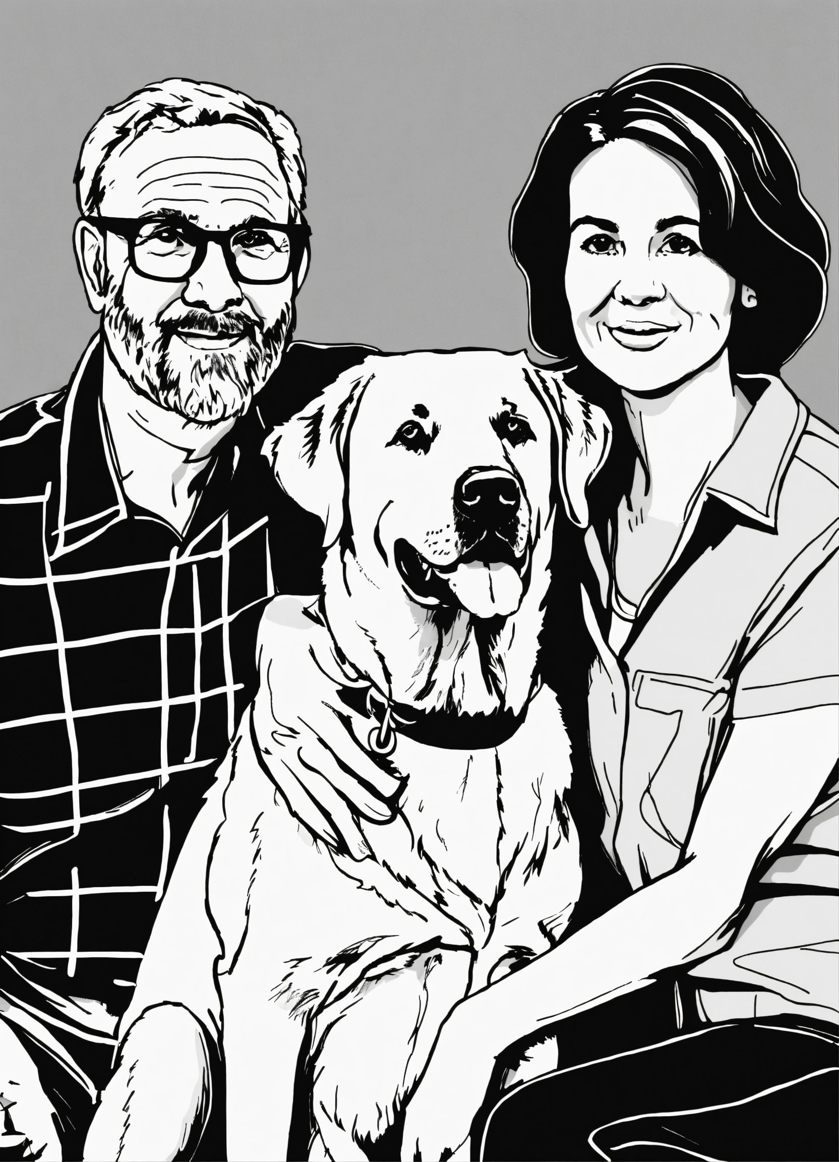 Black and white bold line drawing, middle aged woman and man, with labrador retriever, upper body, lines, shoulders, white background, family portrait with dog