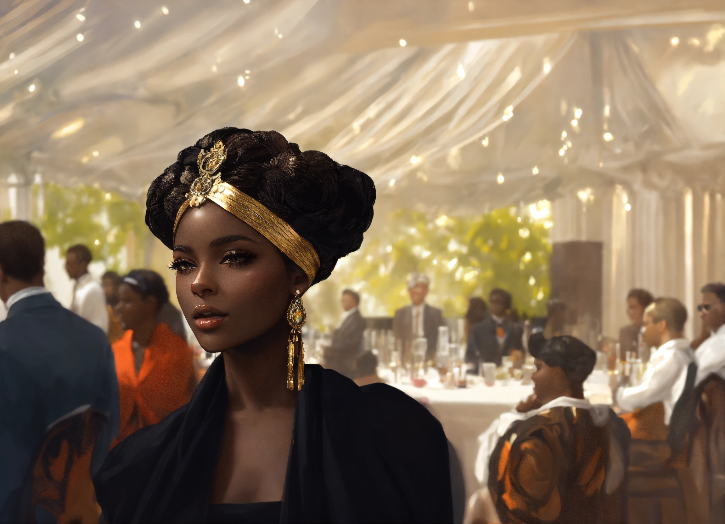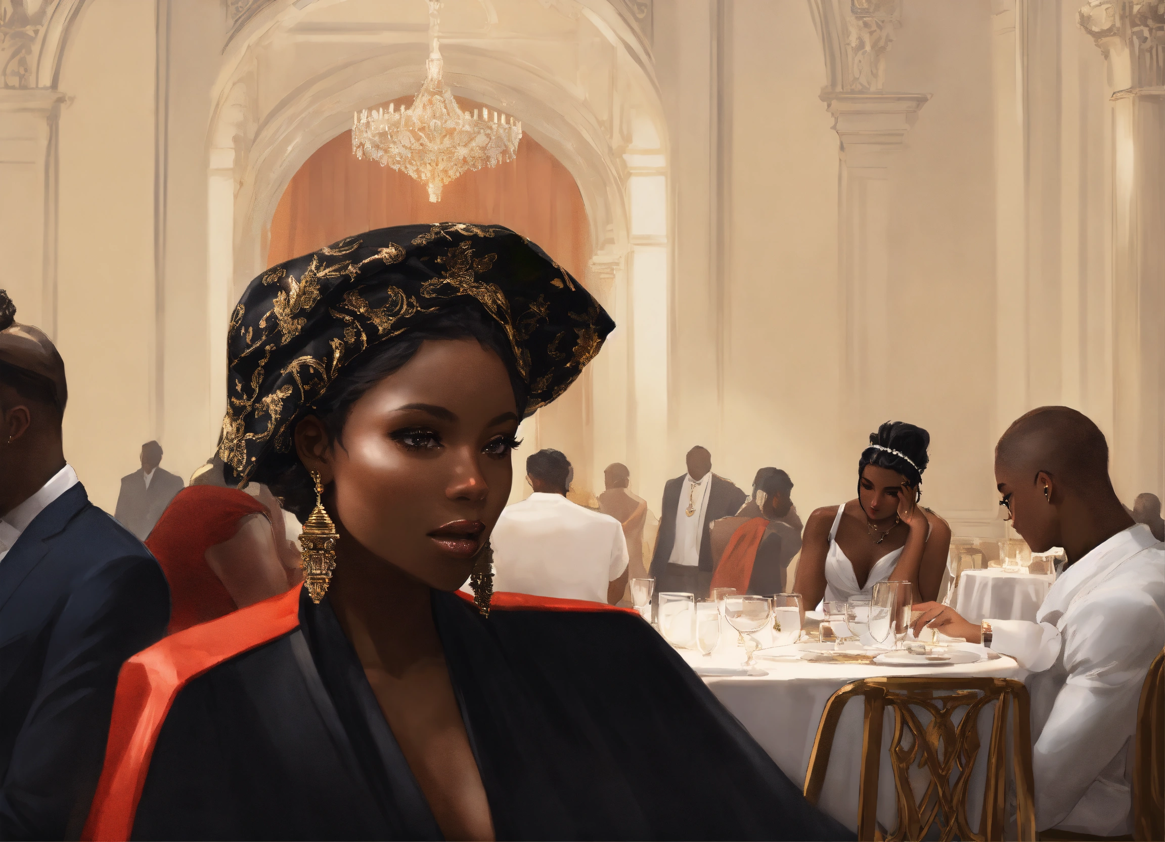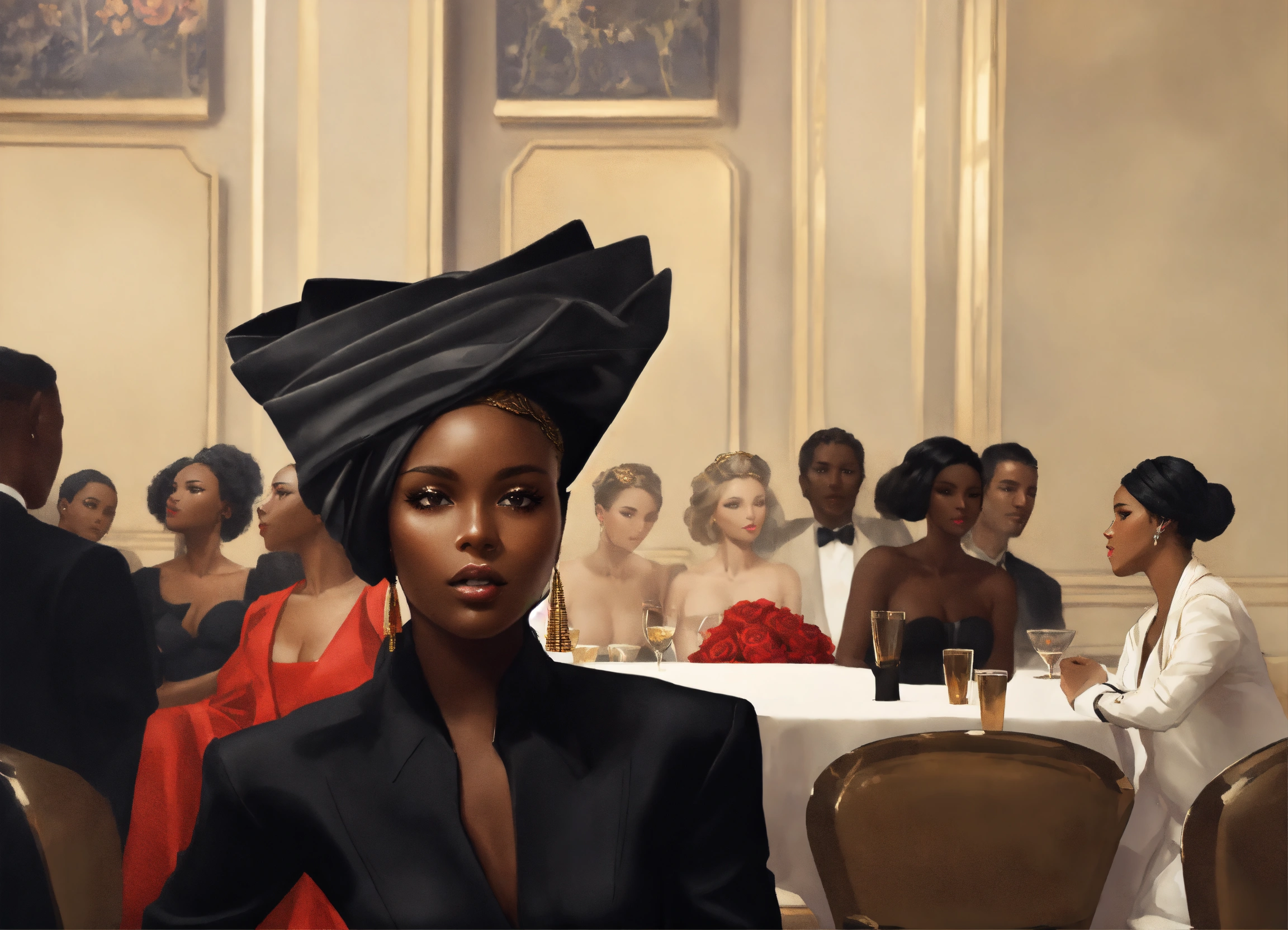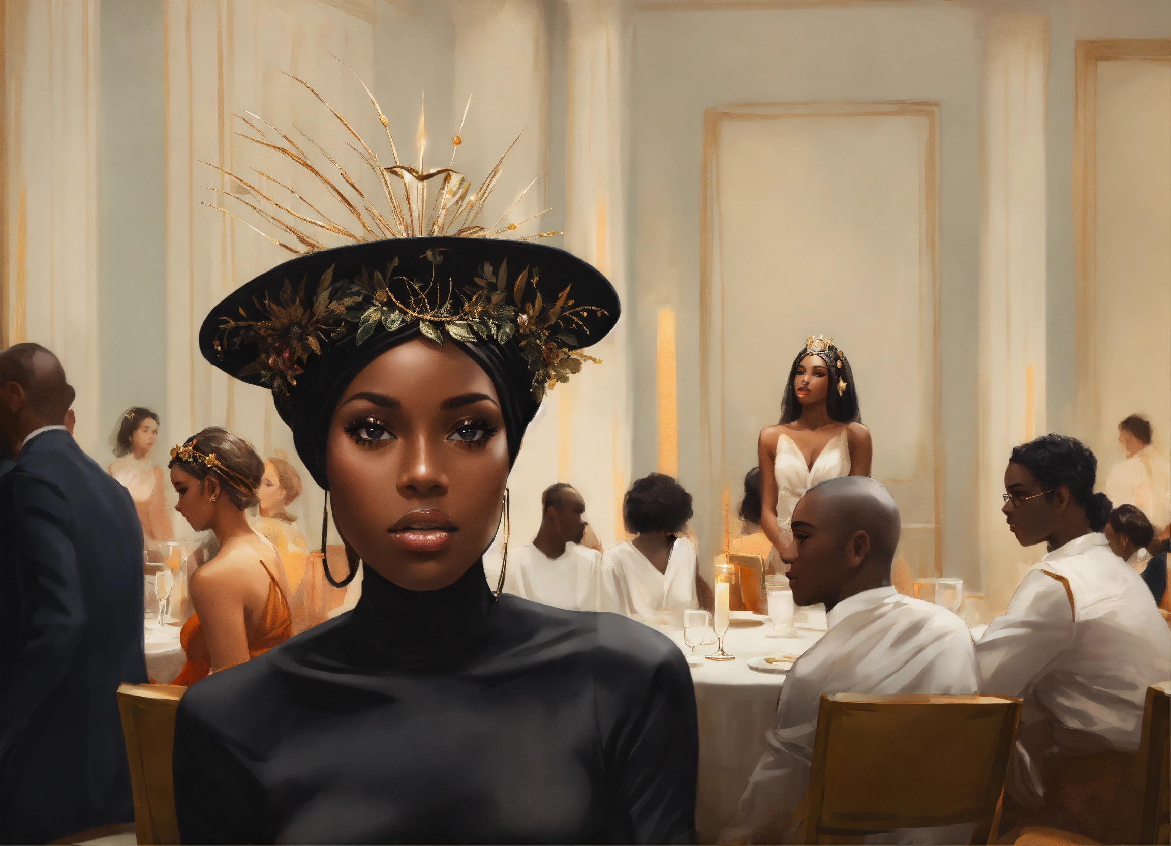 Dark skinned black woman, in centerpiece headpiece, regal and edgy attire, photorealistic, minimalist