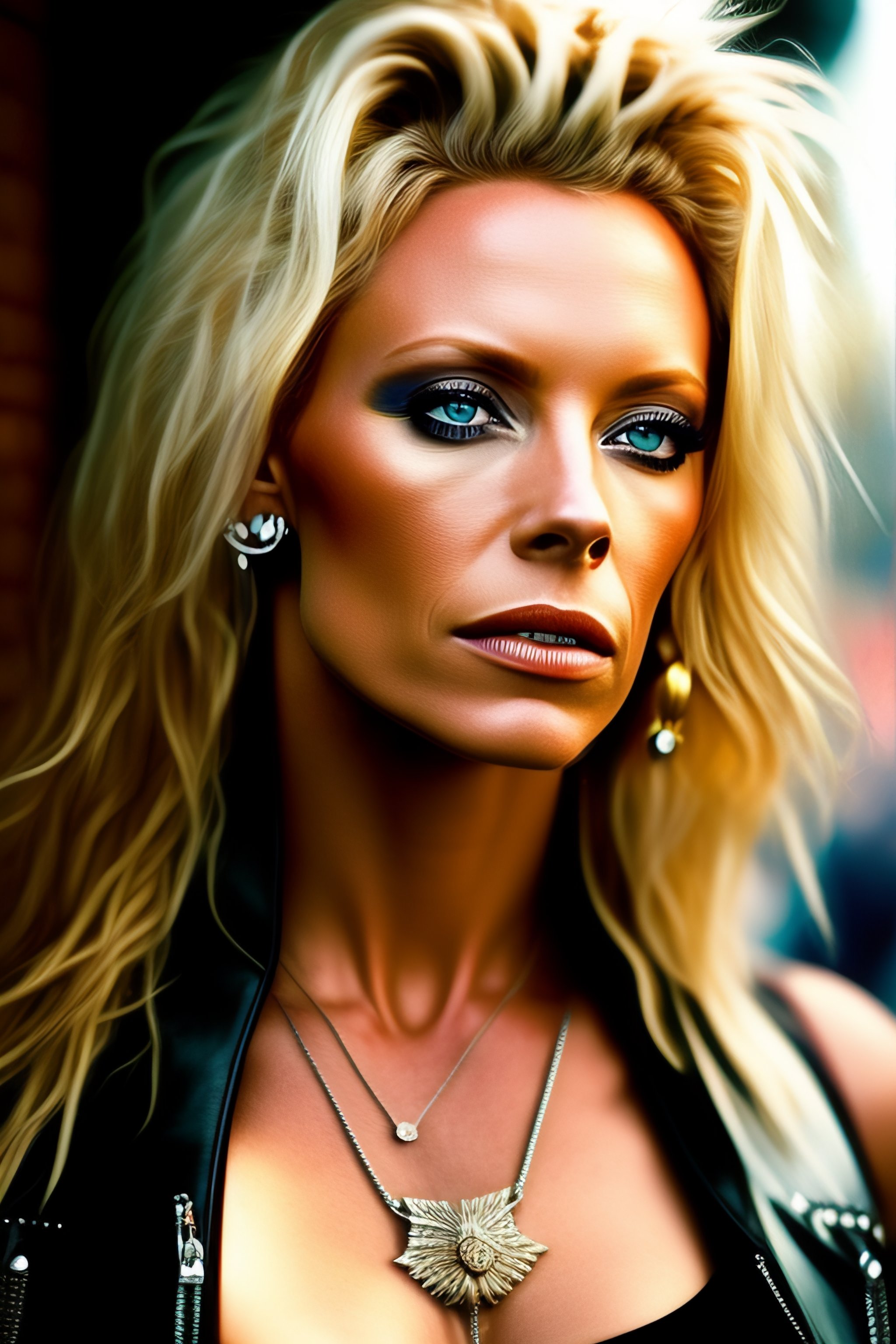 Angela gossow, realistic detailed, beautiful gorgeous, rockstar clothing, proportional body, street photo, film, vogue