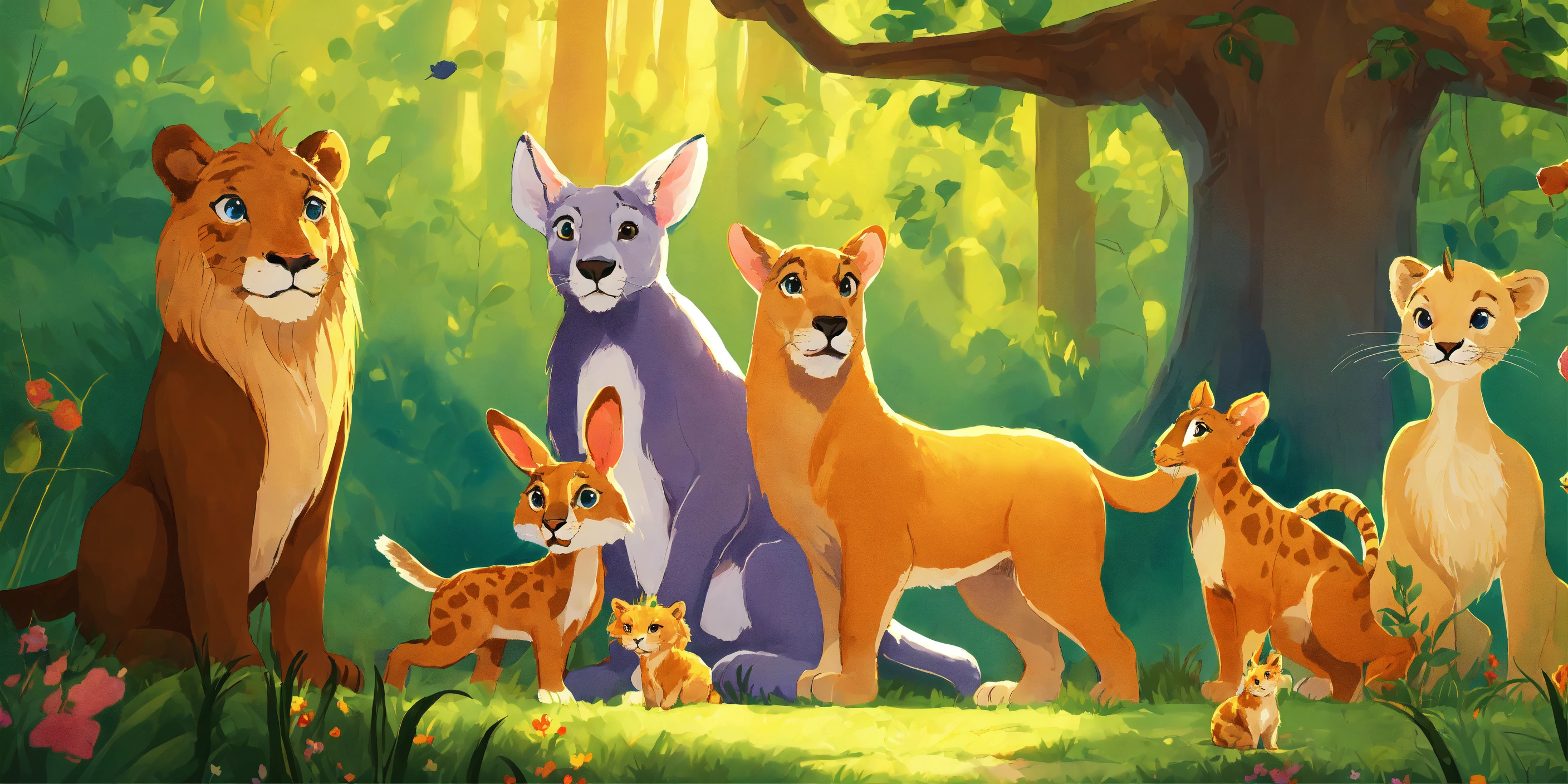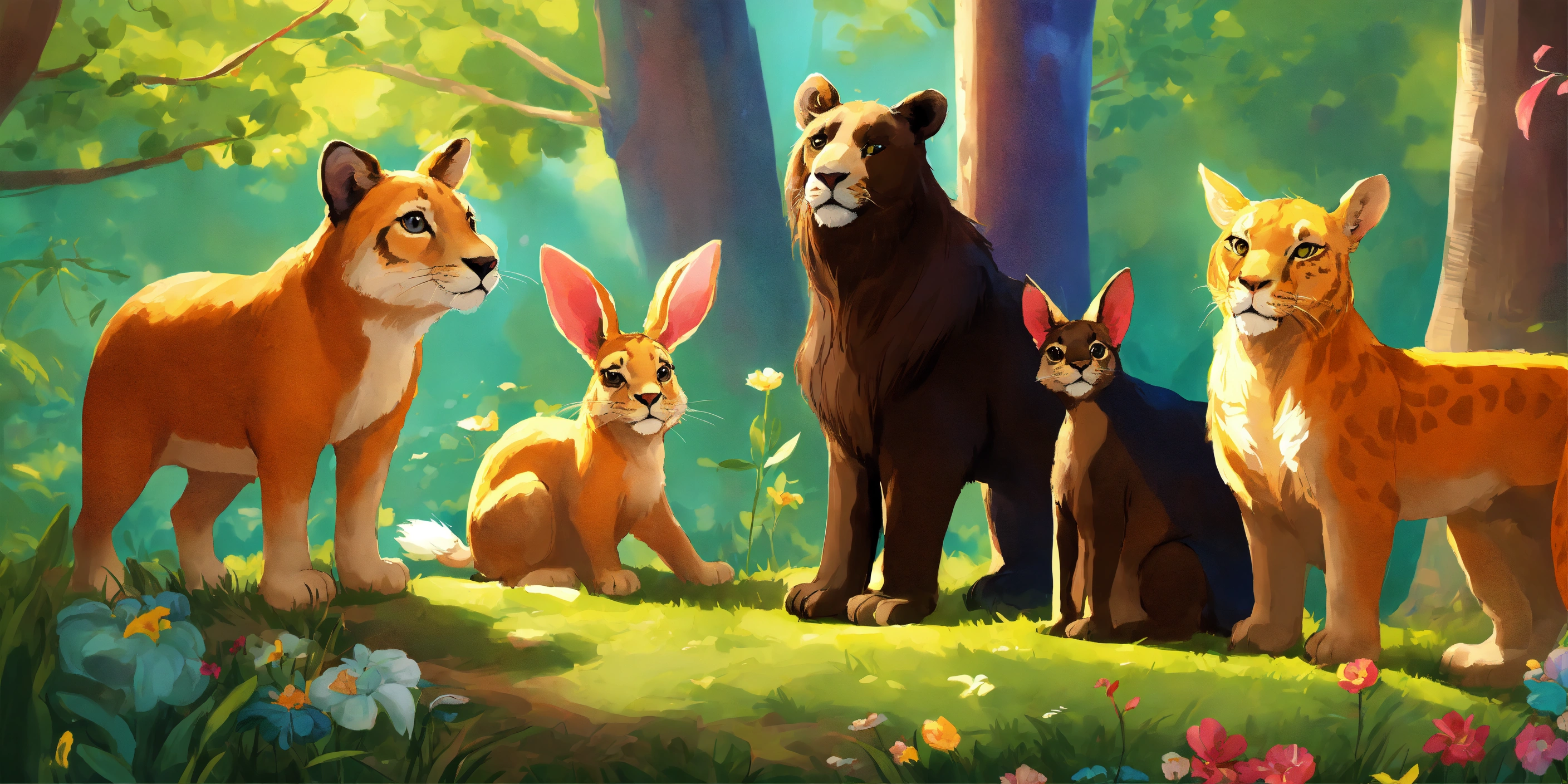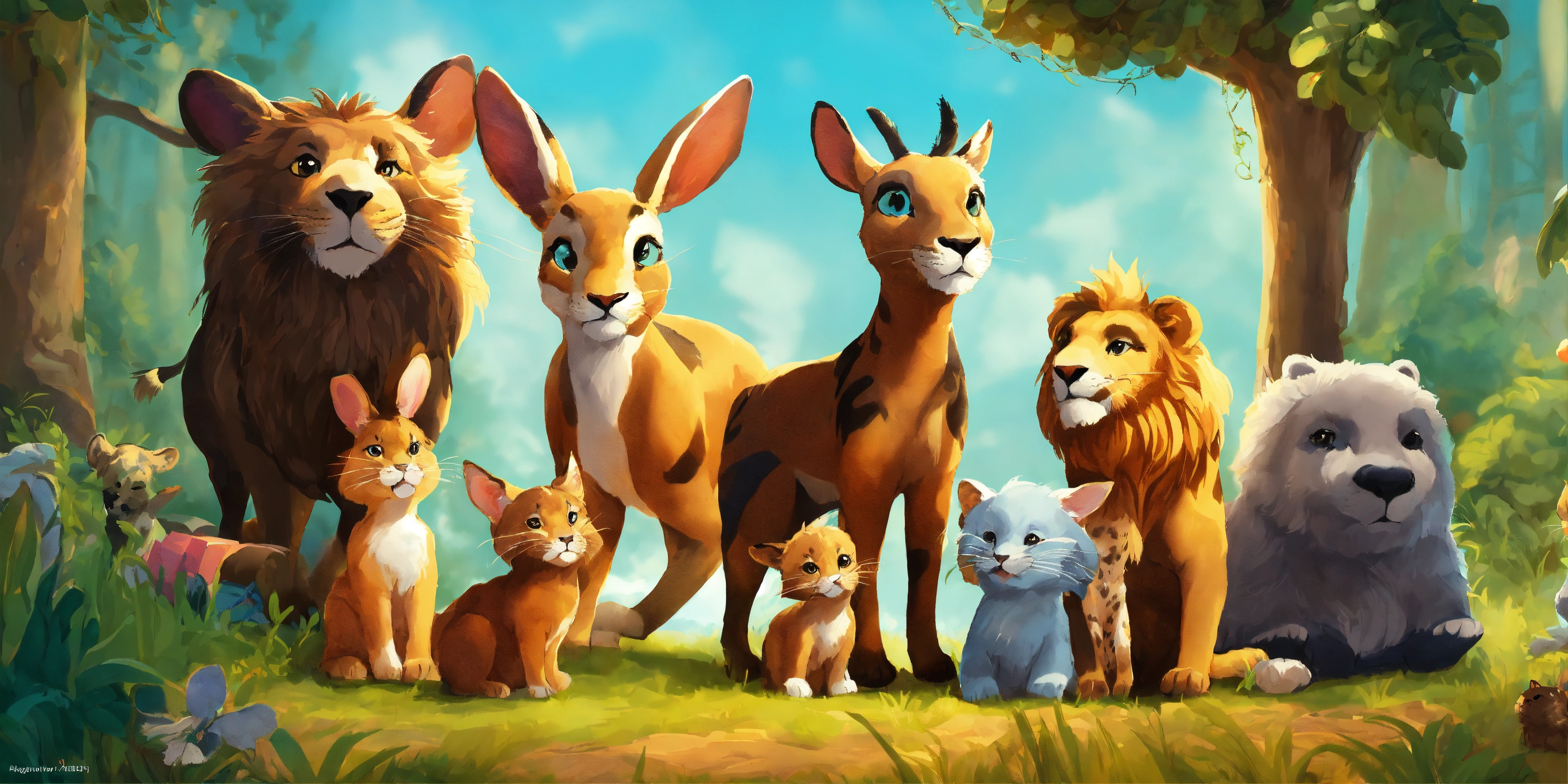 Medium digital art subject a group of realistic animals, including bunnies, a black cat, a lab dog, lions, giraffes, and bears, all standing together in a dynamic and friendly formation. pose the animals are all looking forward with friendly and engaging expressions. smiling and having fun. viewing angle slightly tilted from a low-angle perspective, capturing the animals' approachability. background a vibrant and enchanting forest with hints of educational symbols and playful elements like books and puzzles. environment outdoor colors playful and vivid colors. lighting soft, warm sunlight filtering through the trees, casting gentle, inviting shadows. style traits a blend of realism with a touch of whimsy and friendliness, inspired by children's book illustrations. influences inspired by the art style of classic children's book illustrators. technique digital art with a focus on creating expressive animal characters.