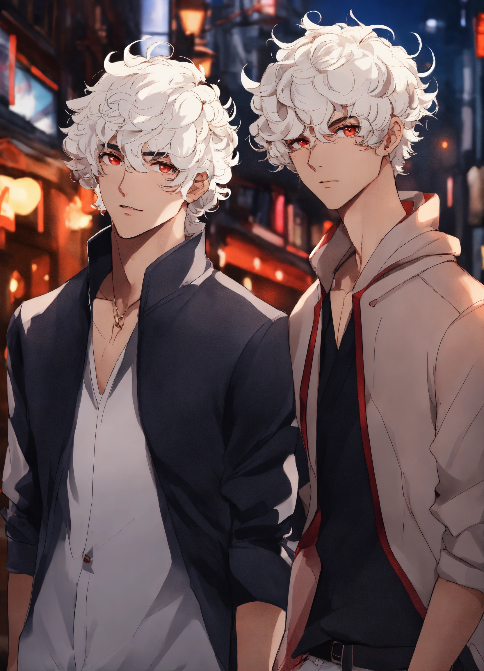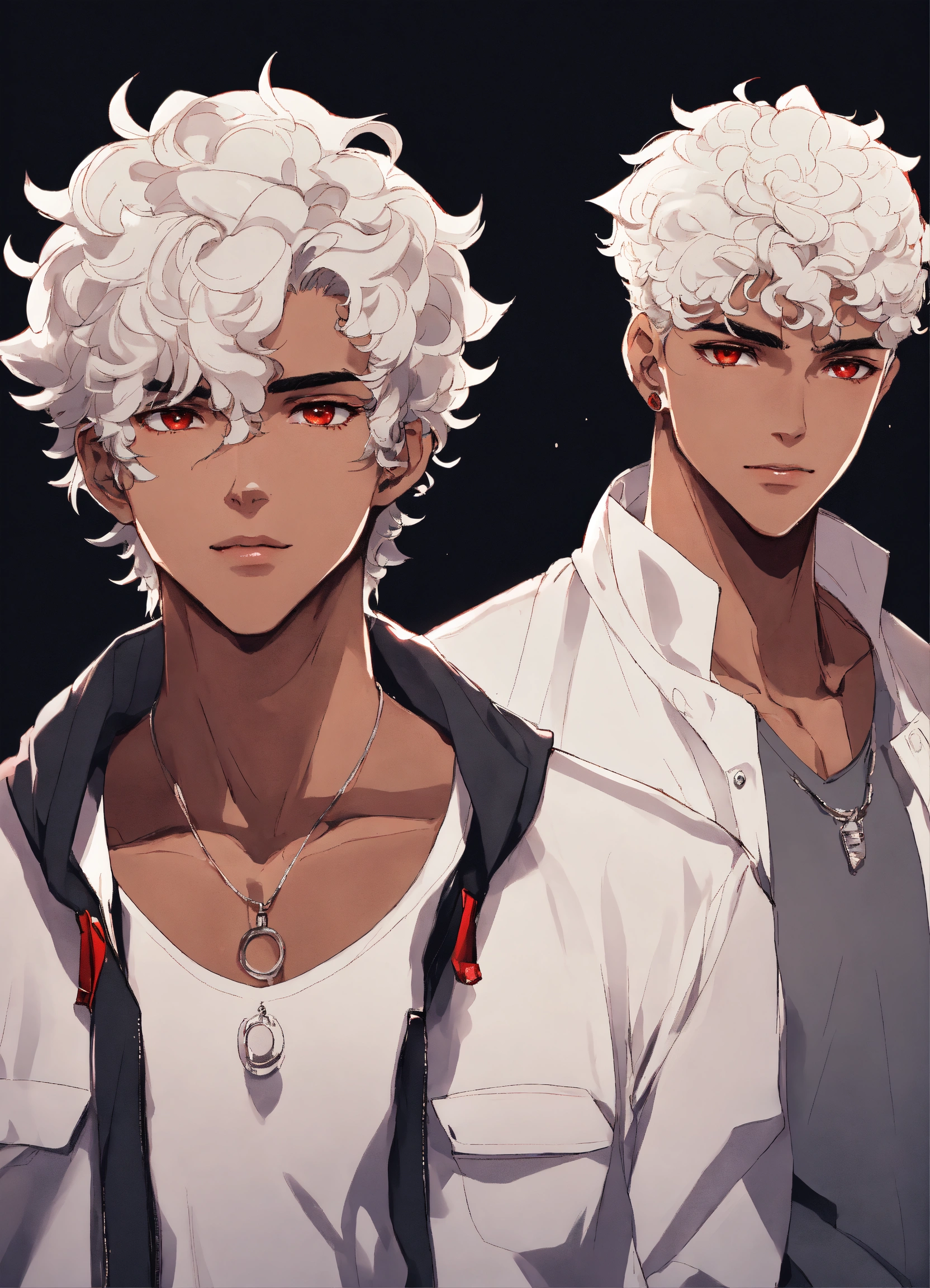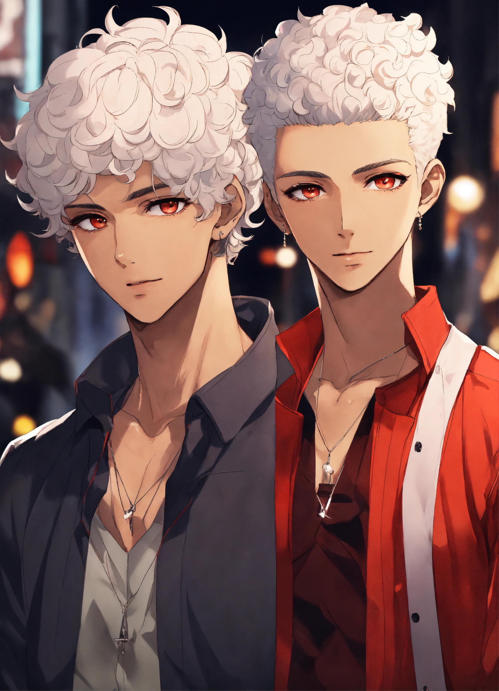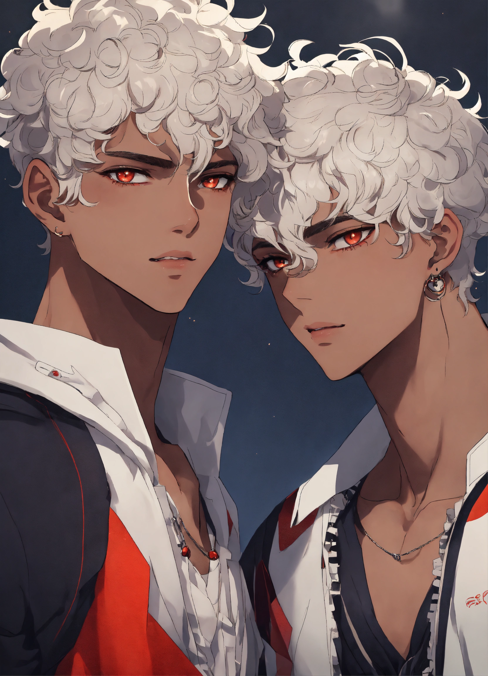 2 men 20 years old, twins, white short curly hair, medium dark skin, sharp facial features, scarlet eyes, height 180 cm, athletic build, anime reskin style