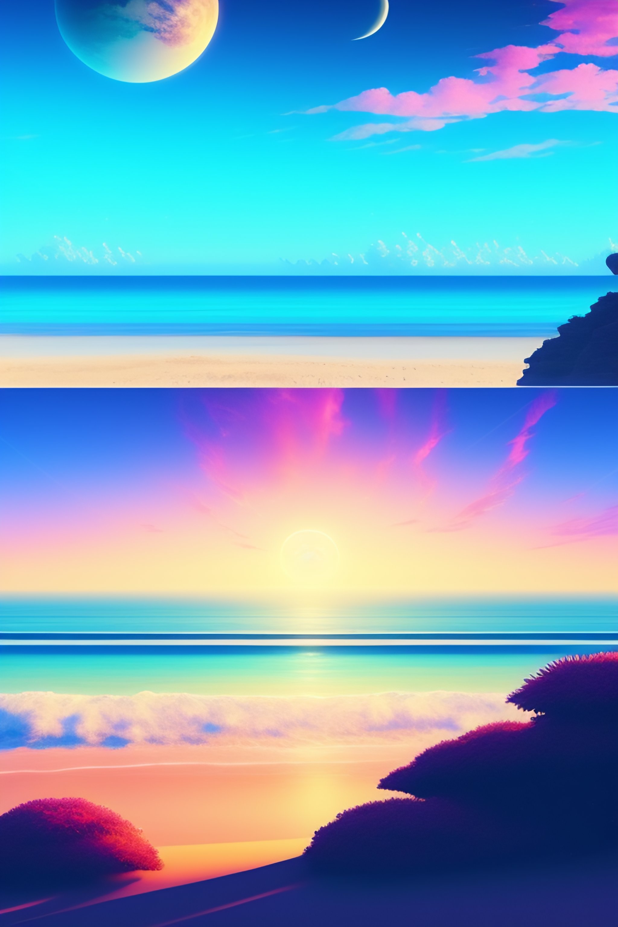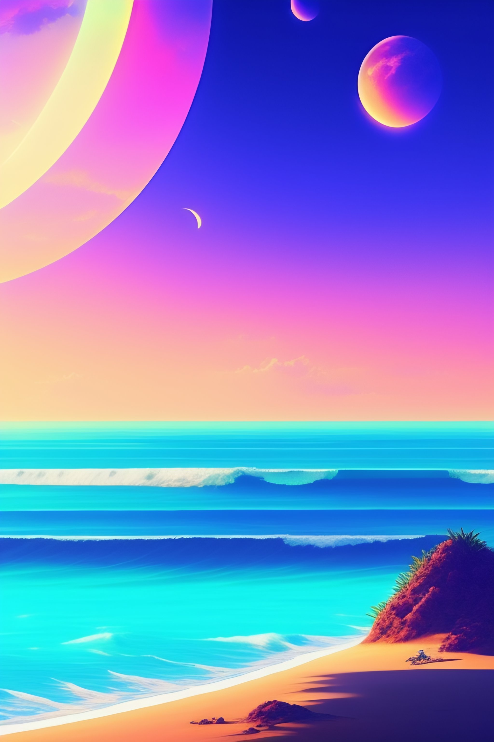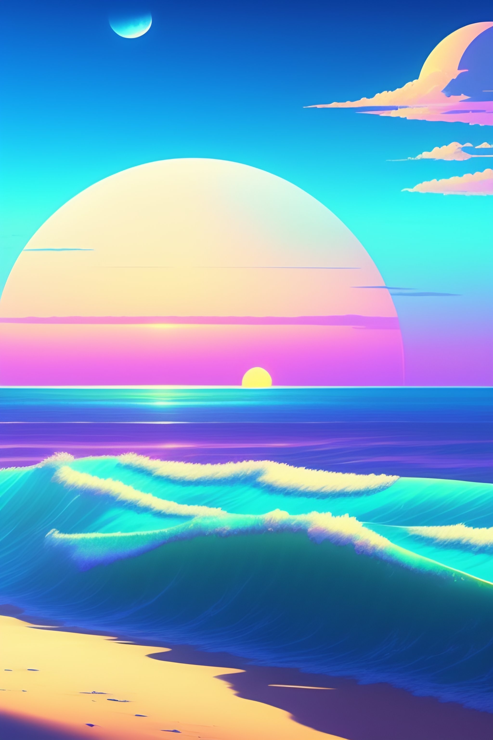 Beautiful beach horizon view of the tropical ocean on an alien planet, vaporwave ocean, clear sky, planet in space over the horizon, trending on artstation, digital art by hayao miyazaki, studio ghibli style