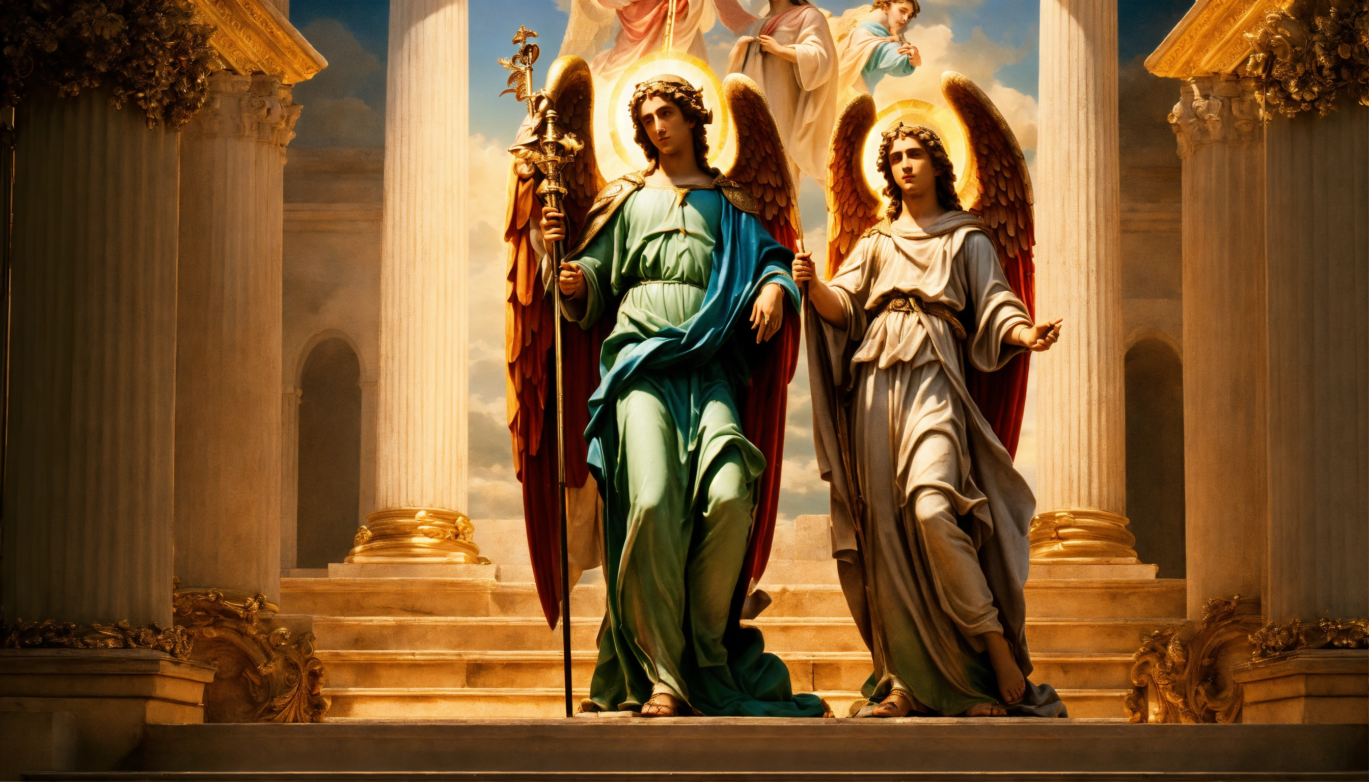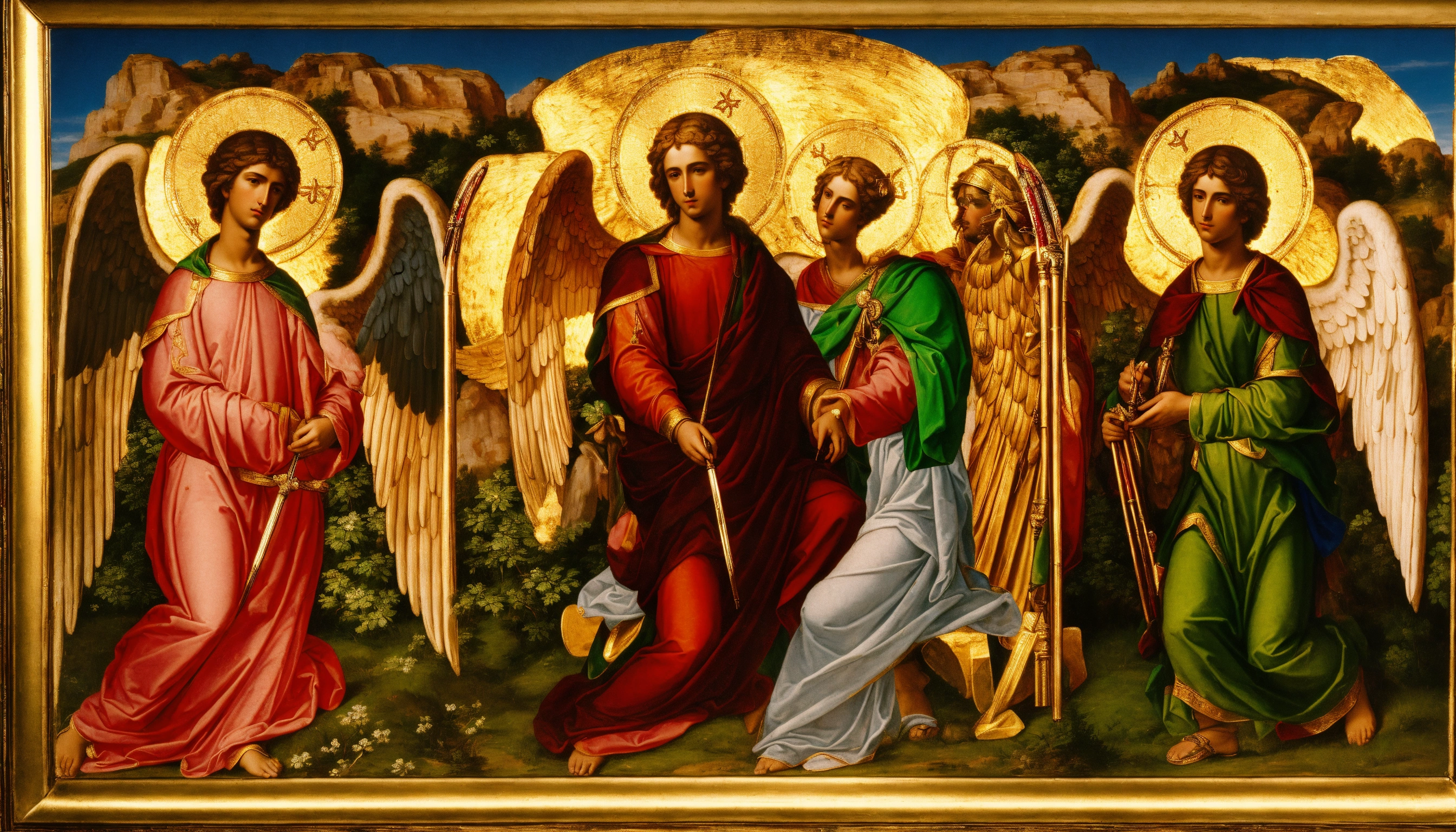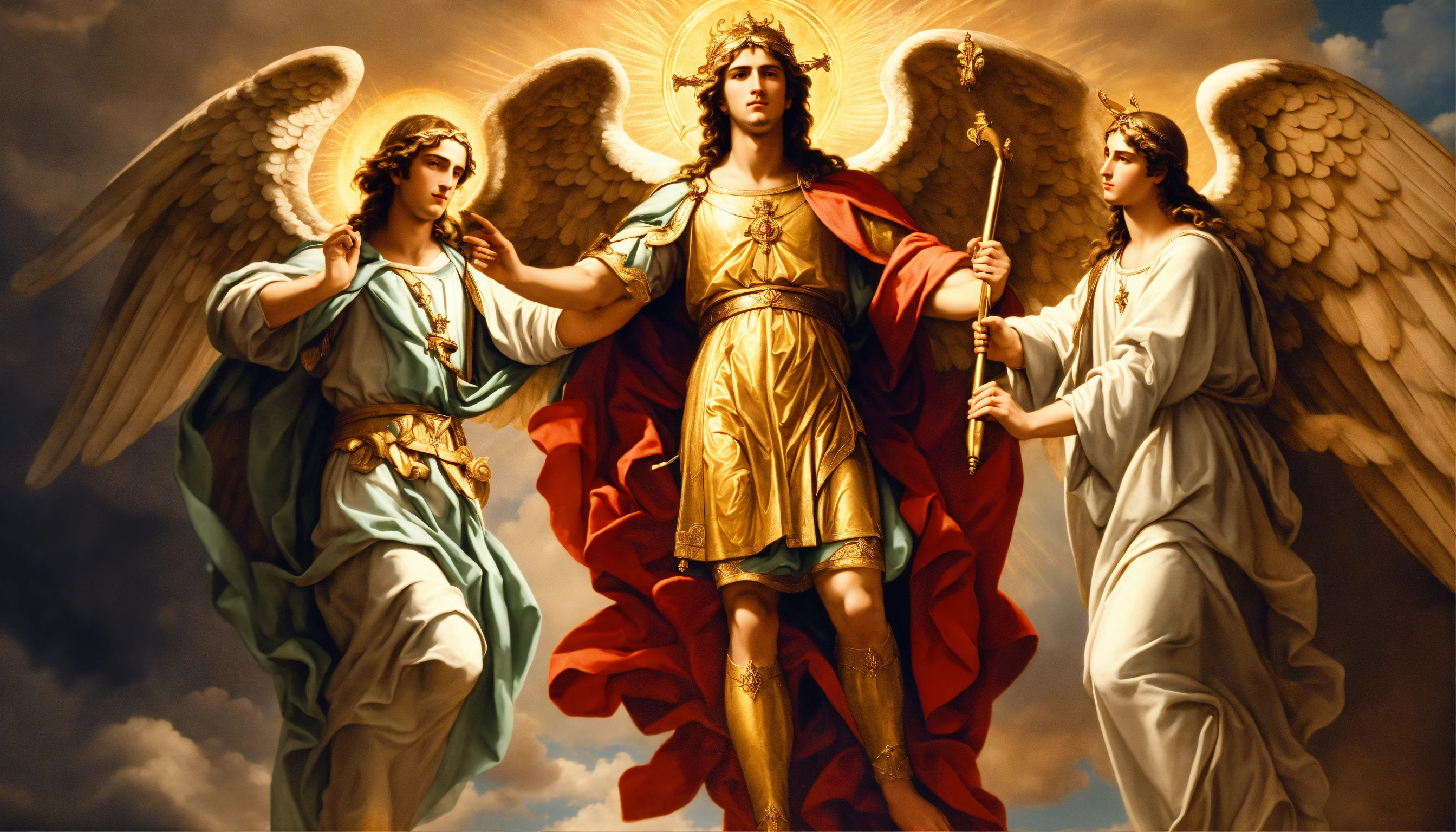 High resolution image, 8k, of the three angels of god, saint michael, saint raphael, and saint gabriel.
