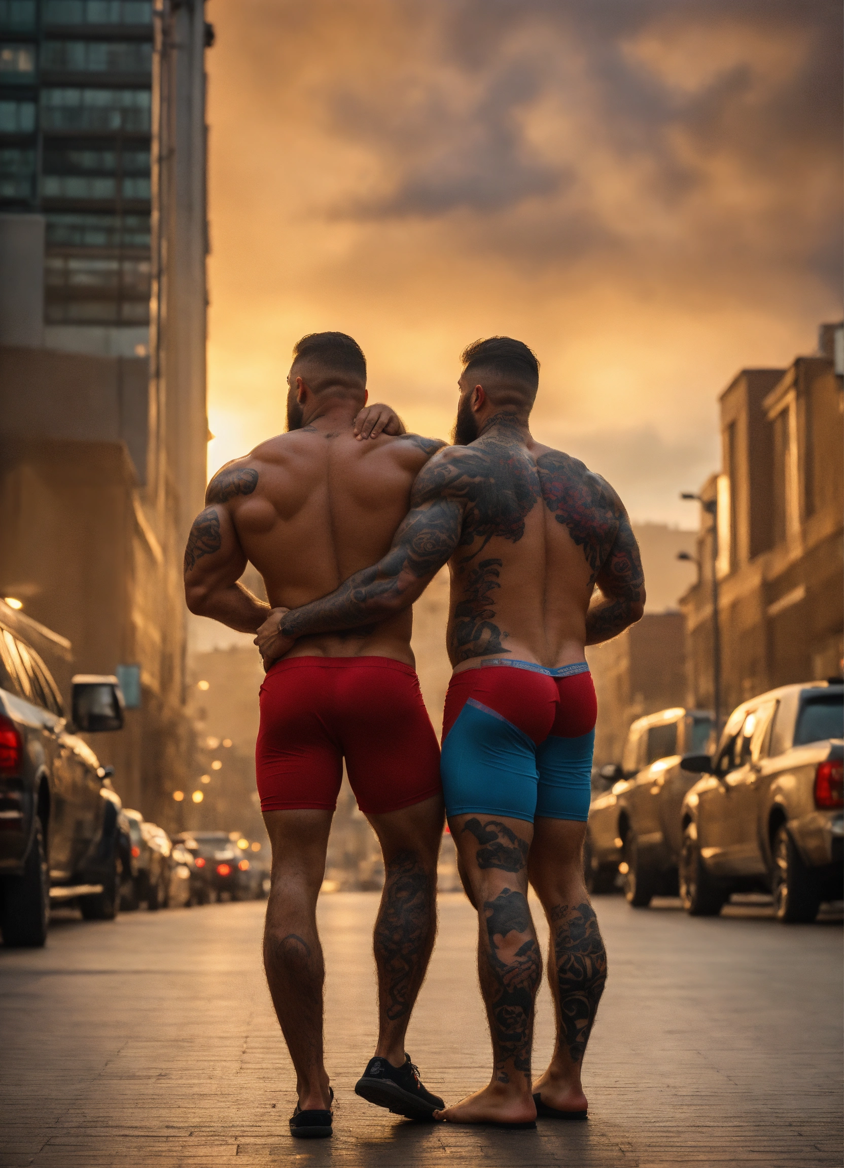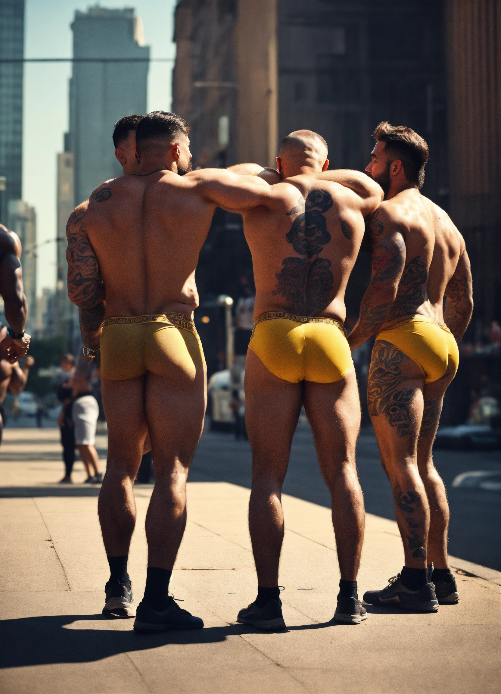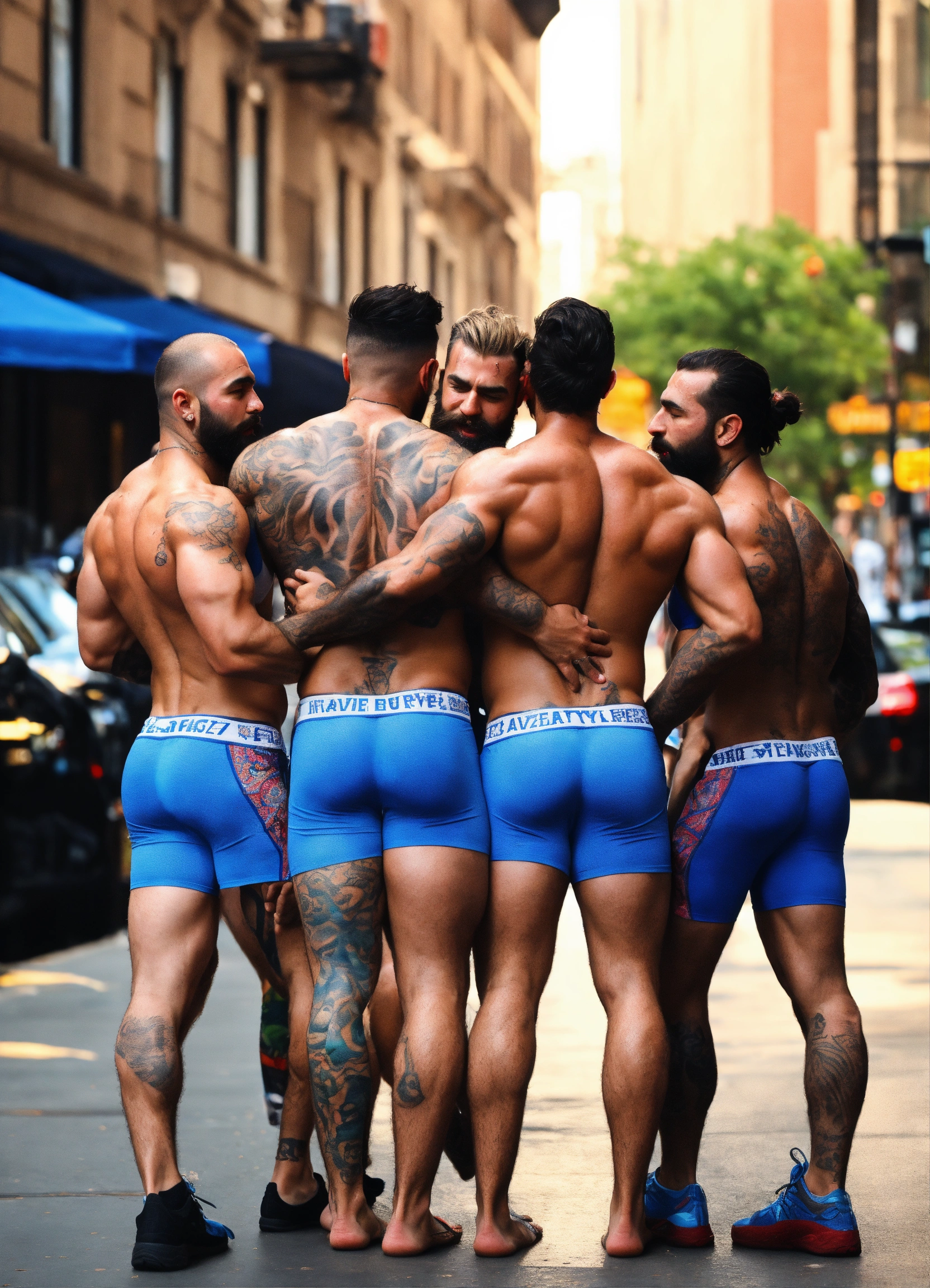 From the rear, a quartet of hugging bodybuilders oiled hairy sweaty tattooed bearded handsome ethnic yogis in briefs with hairy legs in the city, in the style of social media portraiture, david michael bowers, environmental awareness, scared facial expression, zigzags, wealthy portraiture, language-based in 4k